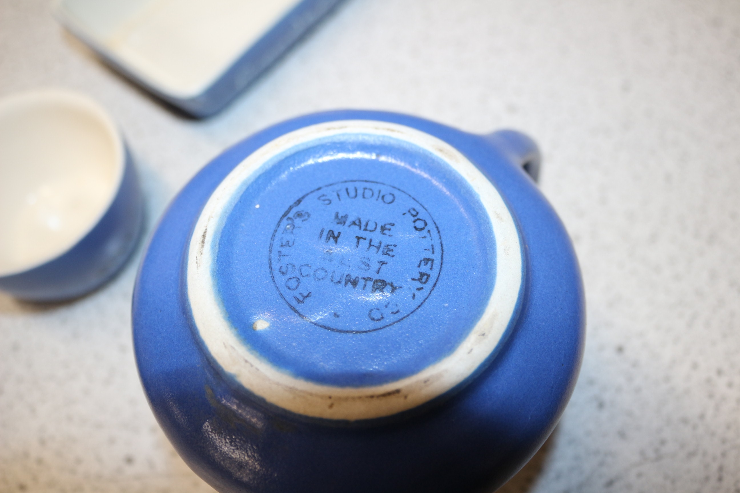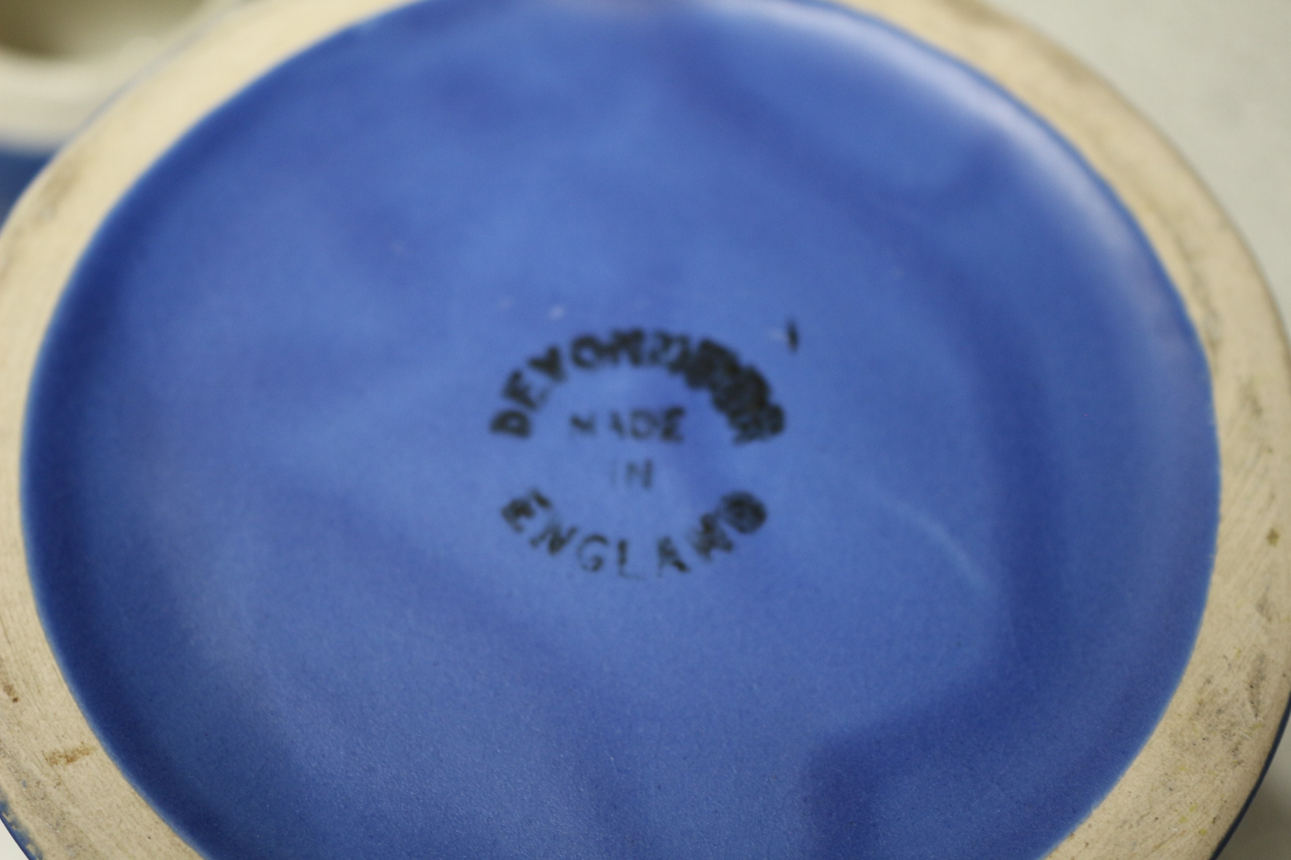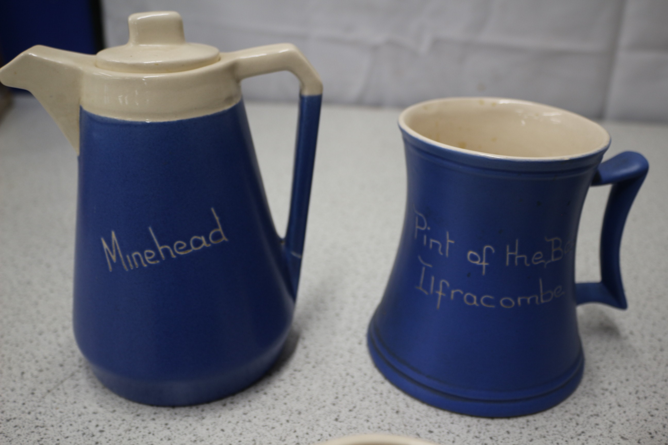A collection of twelve blue and cream pottery items, including jugs, pitchers, and dishes, many inscribed with English place names, some marked ‘New Devon Pottery’ or ‘Devonmoor’.