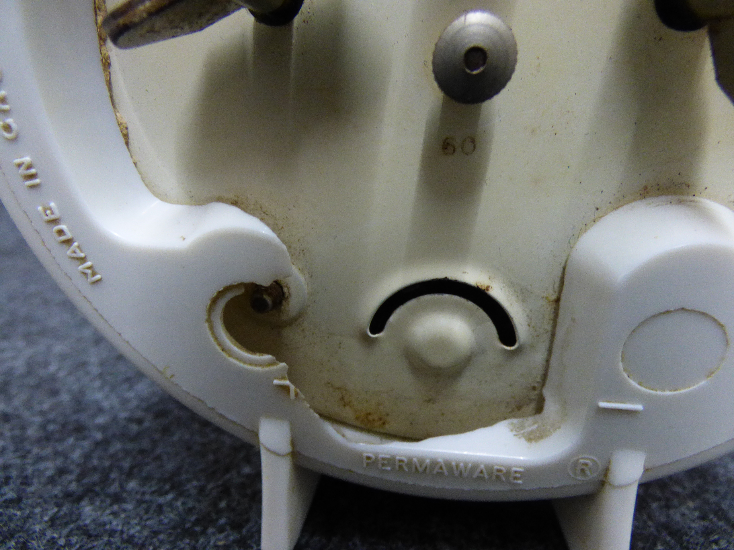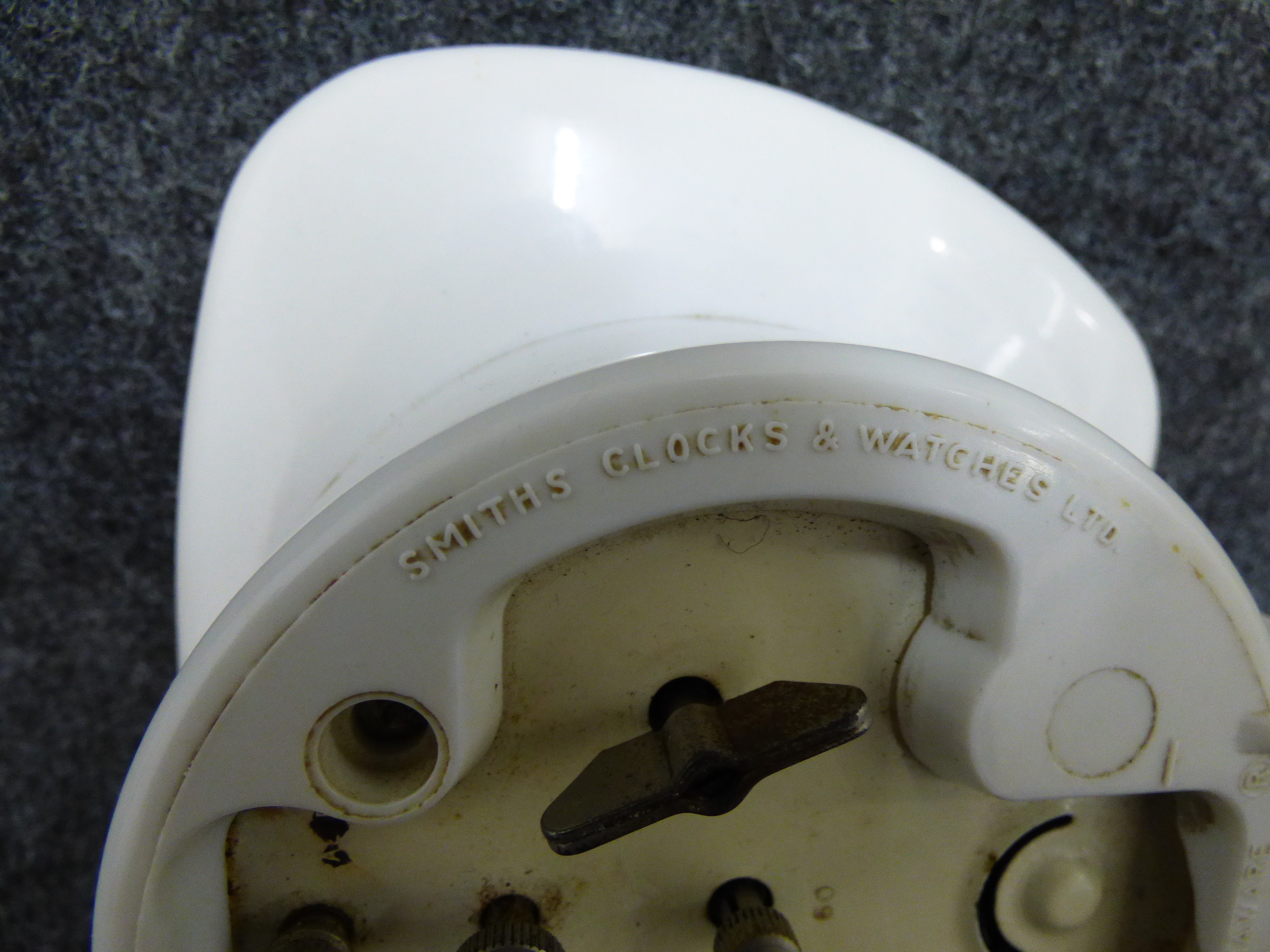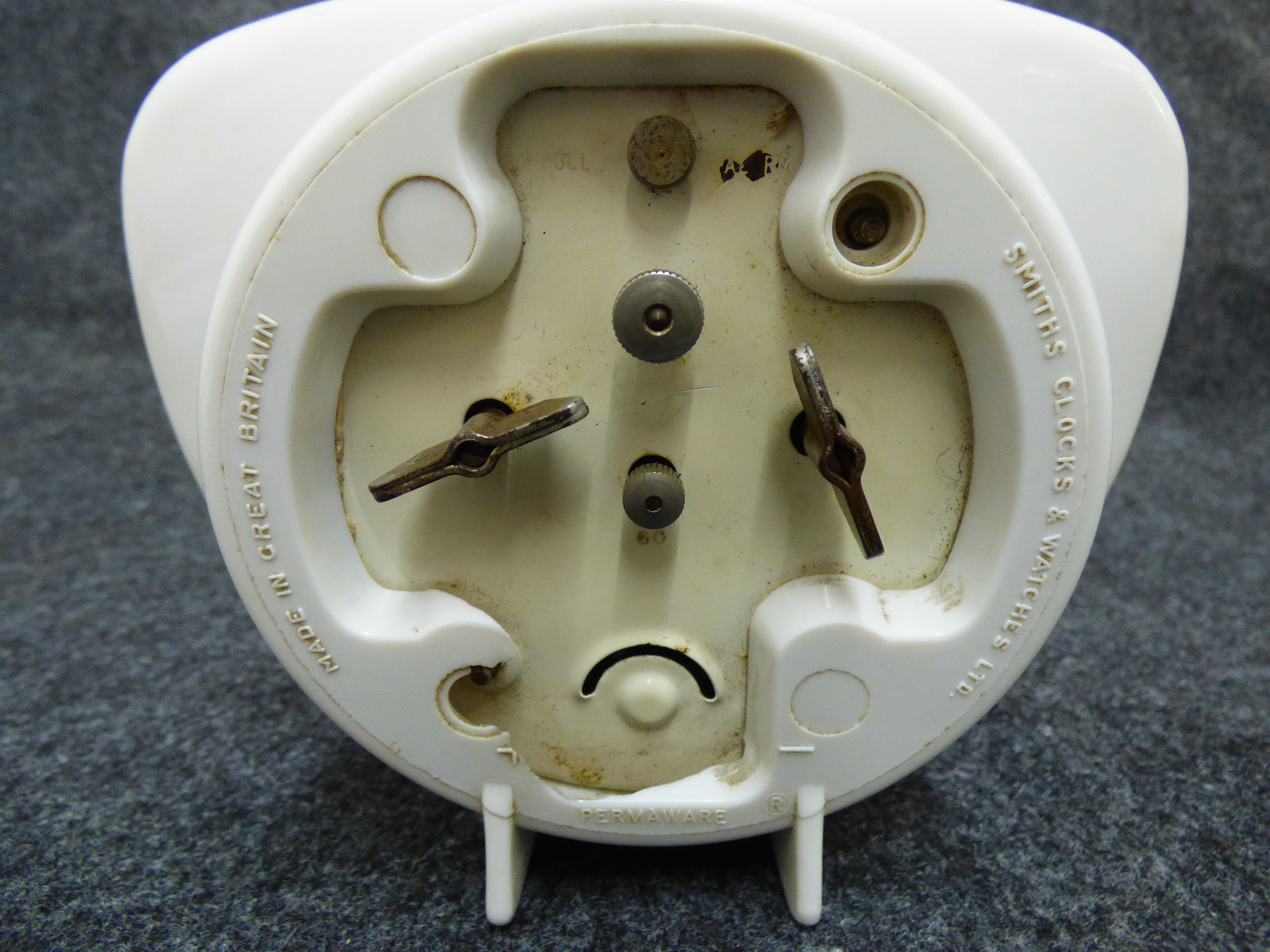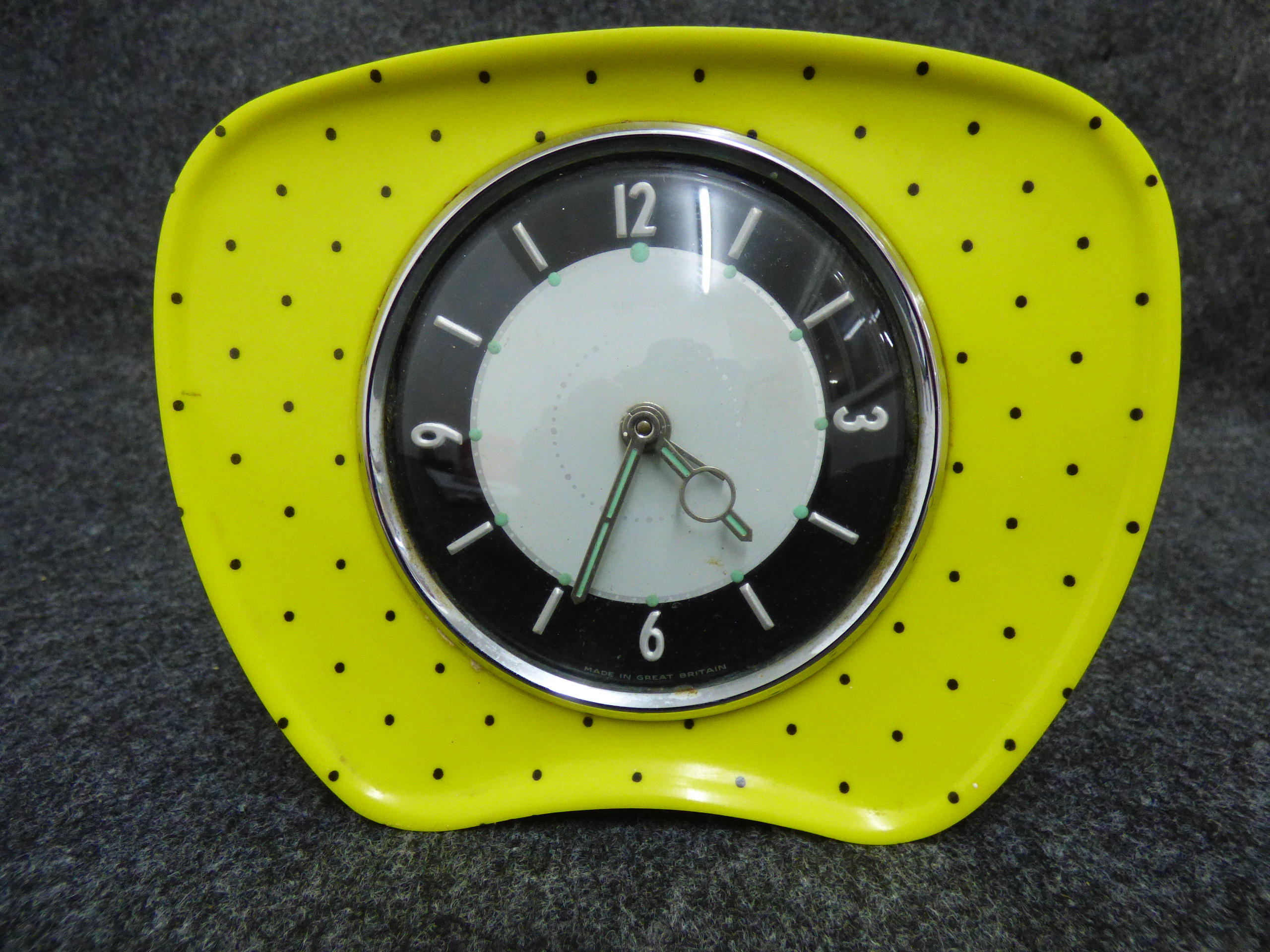 A vintage yellow and white alarm clock by Smiths Clocks and Watches Ltd featuring a polka-dot face surround and Permaware casing made in Great Britain.