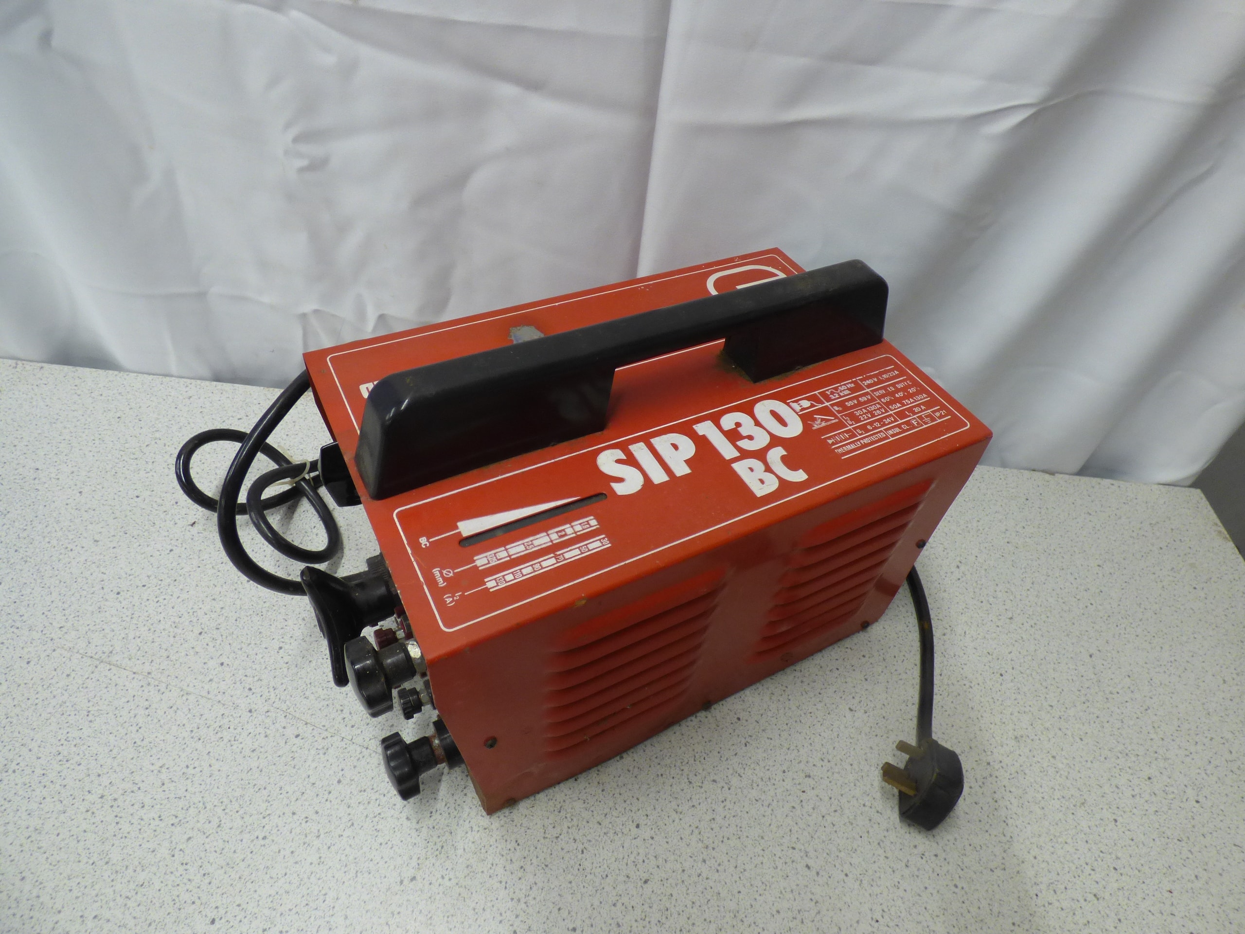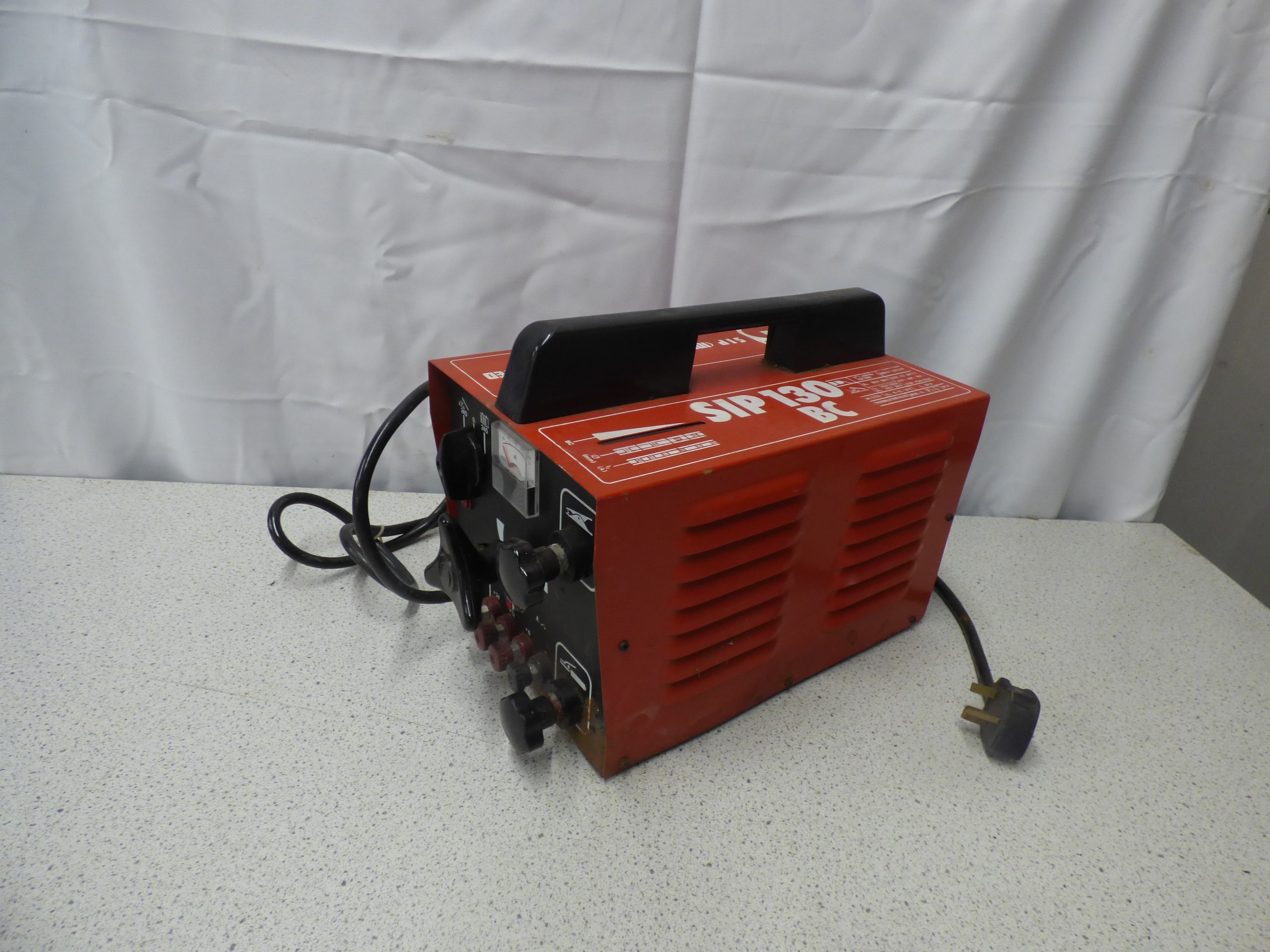 A red and black SIP 130 BC ARC welding machine, weighing 13.5KG, with an input voltage of 230V 50Hz single phase and an output current of 25-130A. Untested