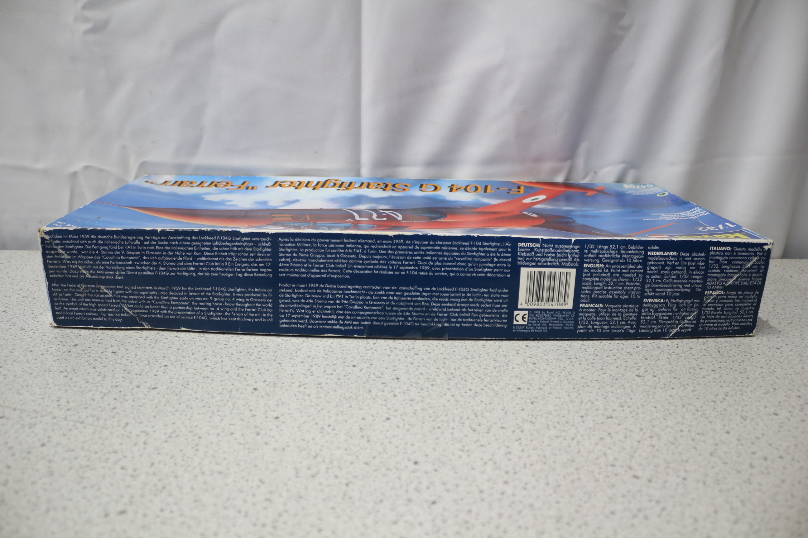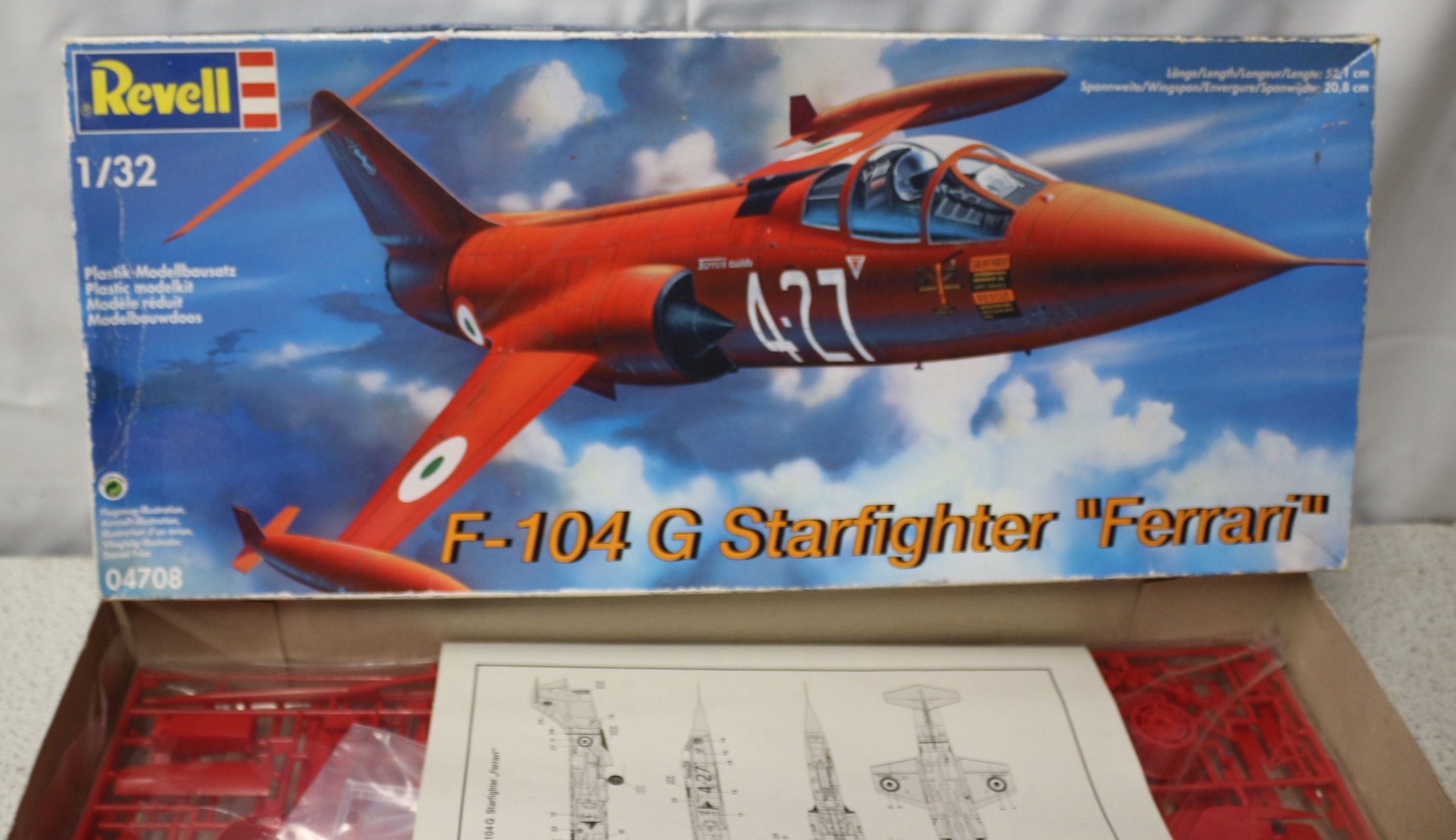 A Revell F-104 G Starfighter ‘Ferrari’ plastic model kit, model number 04708, 1/32 scale. The kit is presented in its original cardboard box, featuring an illustration of the red jet fighter by Daniel Zaka on the lid. It is identified as a "Plastik-Modellbausatz" (plastic model kit) and rated at skill level 3. Inside, the box contains unbuilt model components on sprues, molded in red plastic, along with a printed instruction manual featuring detailed diagrams.