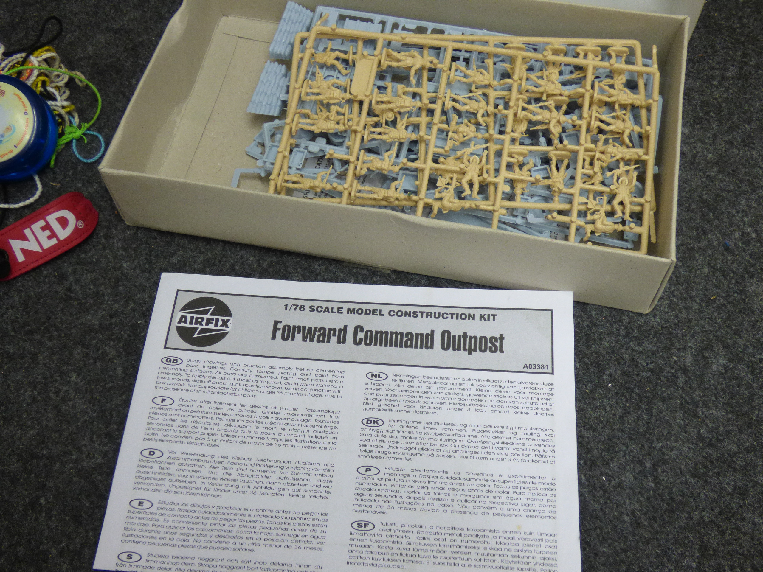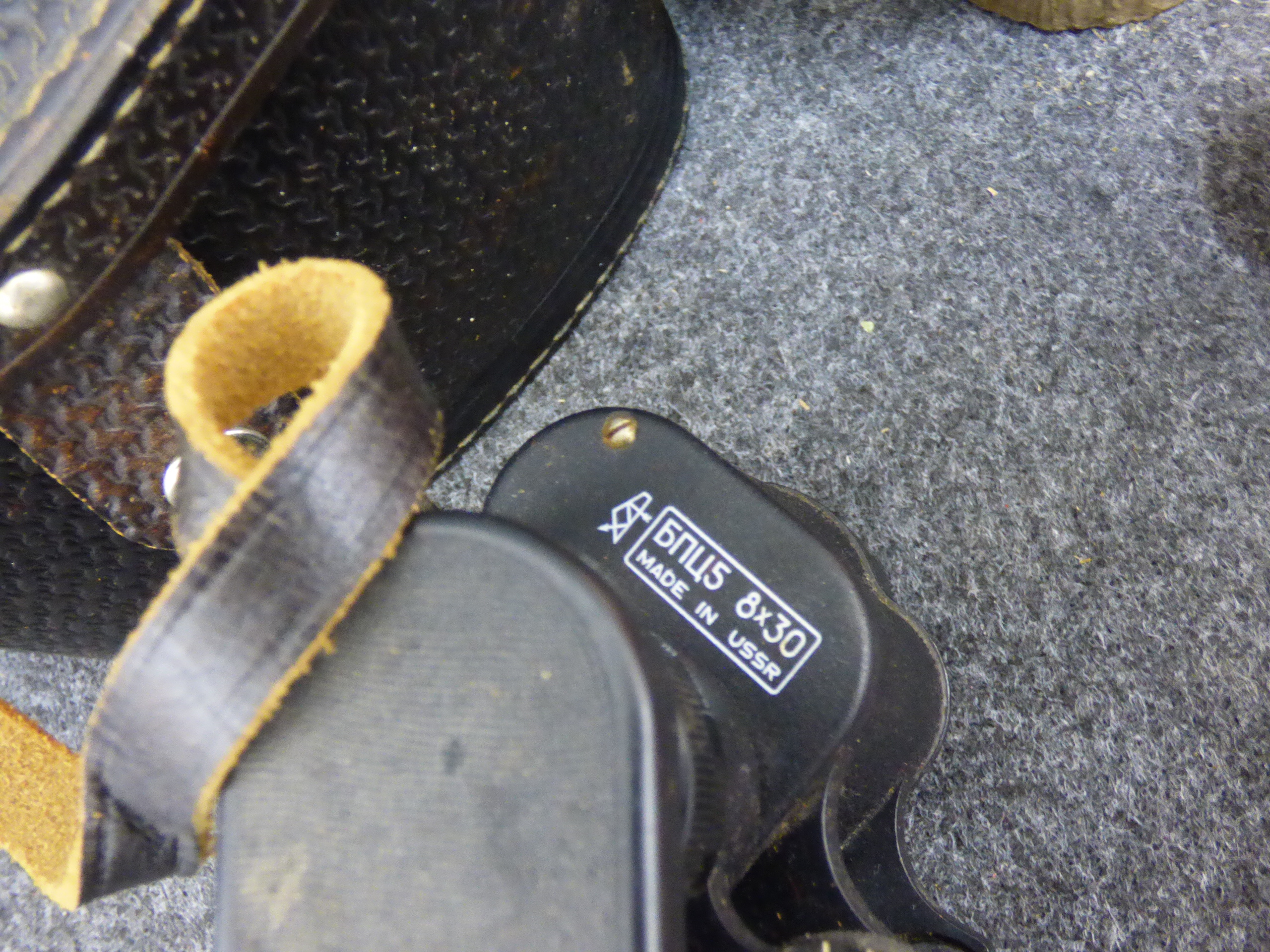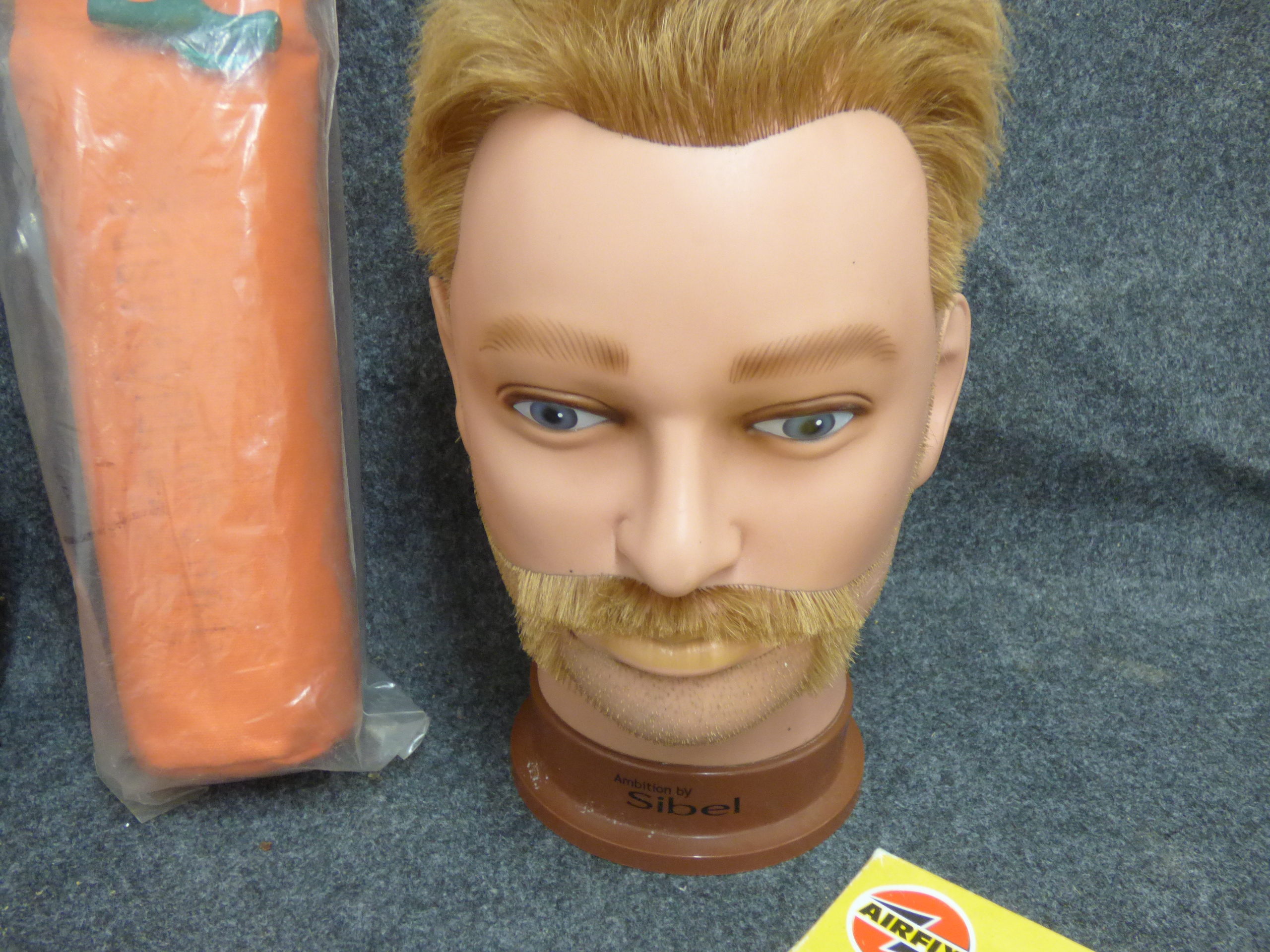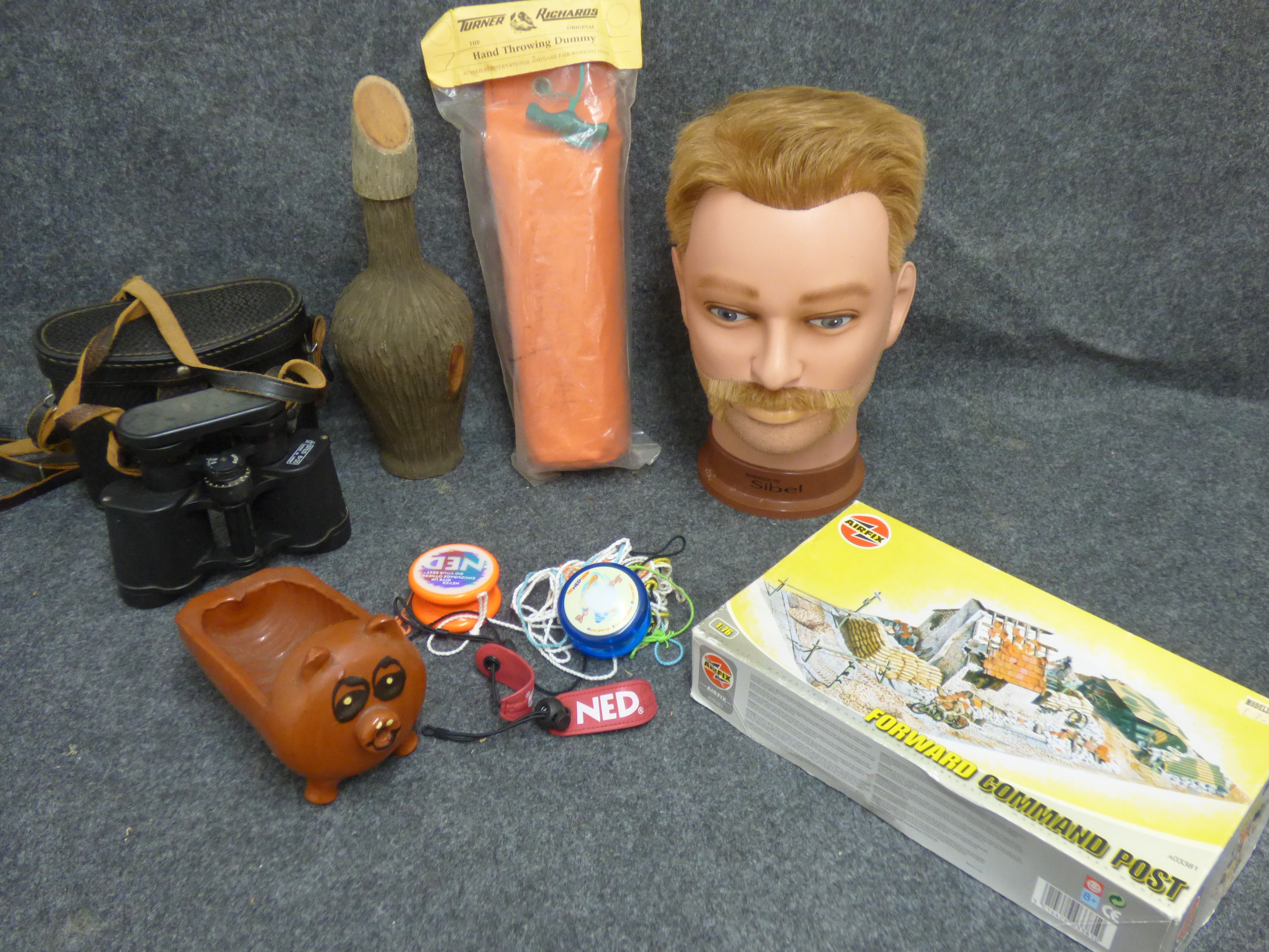 A collection of items including black USSR binoculars with a leather case, a Chorizo al Infierno pig dish, a Turner Richards hand throwing dummy, a Sibel mannequin head, NED yoyos, a textured bottle, and an Airfix Forward Command Post model kit.