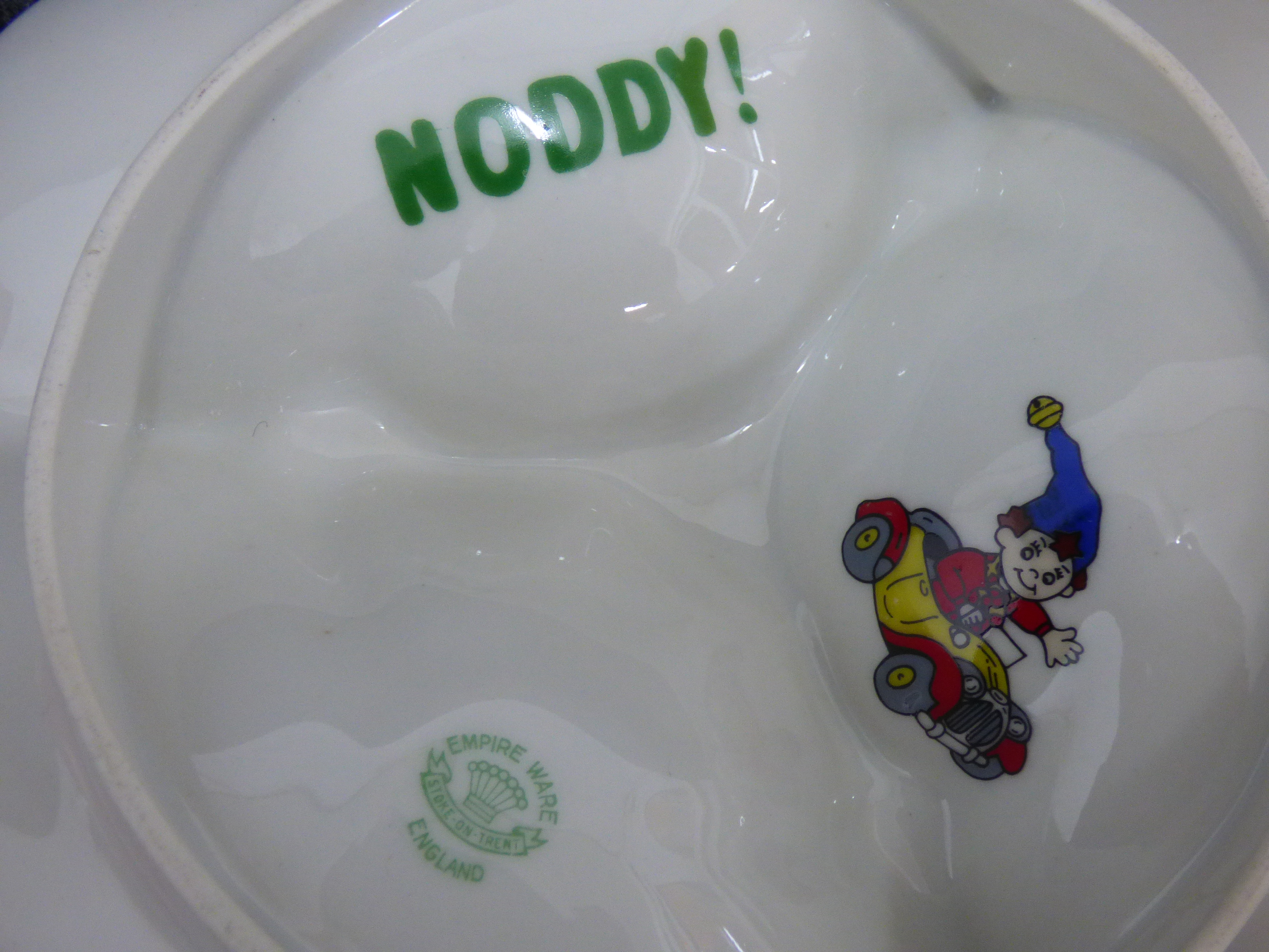 Two Noddy themed items consisting of a red and blue fabric hand puppet and a white divided ceramic dish featuring Enid Blyton illustrations and an Empire Ware Stoke-on-Trent England maker’s mark.