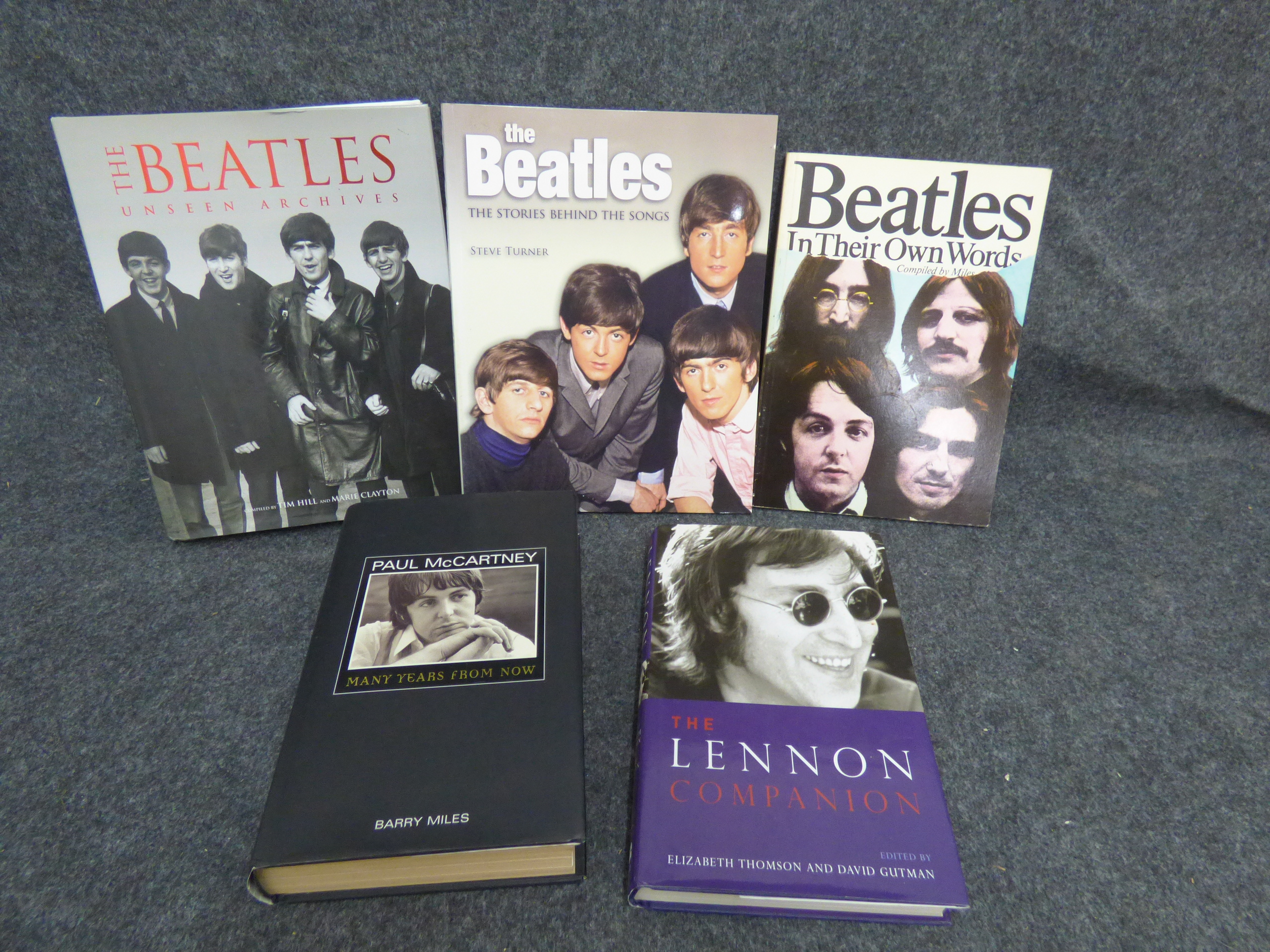 A collection of five books including The Beatles Unseen Archives, The Stories Behind The Songs, Beatles In Their Own Words, Paul McCartney Many Years From Now, and The Lennon Companion.