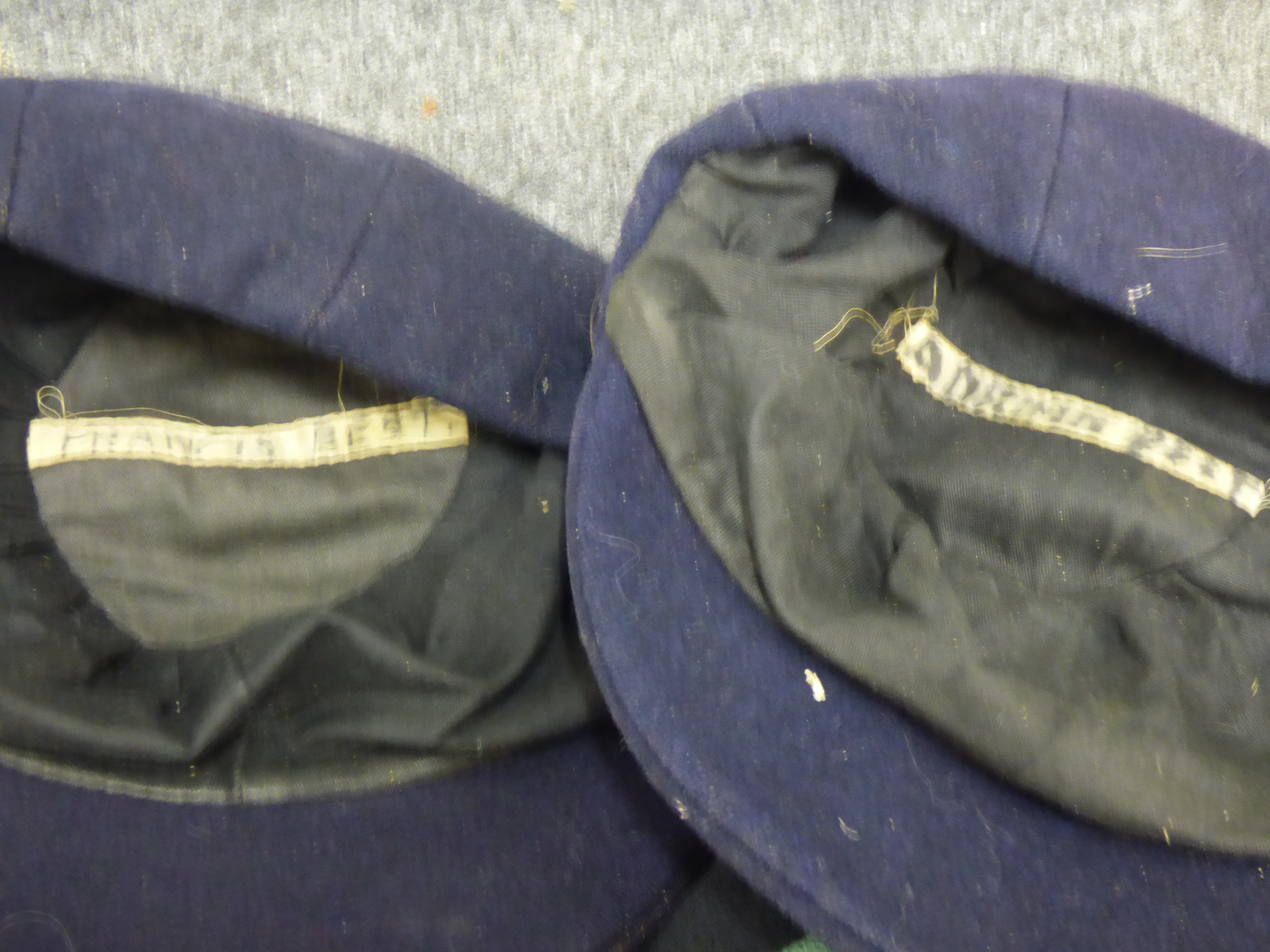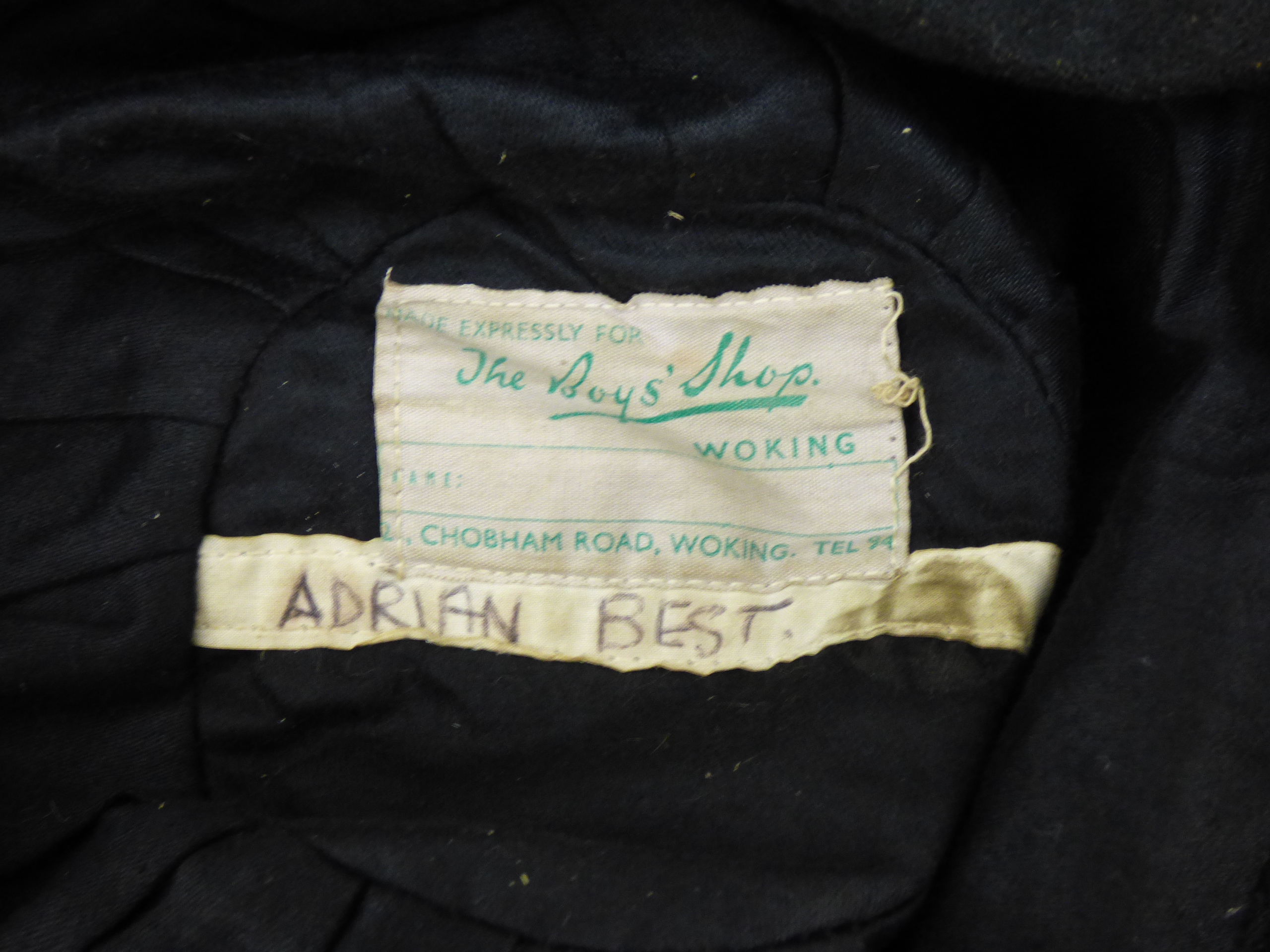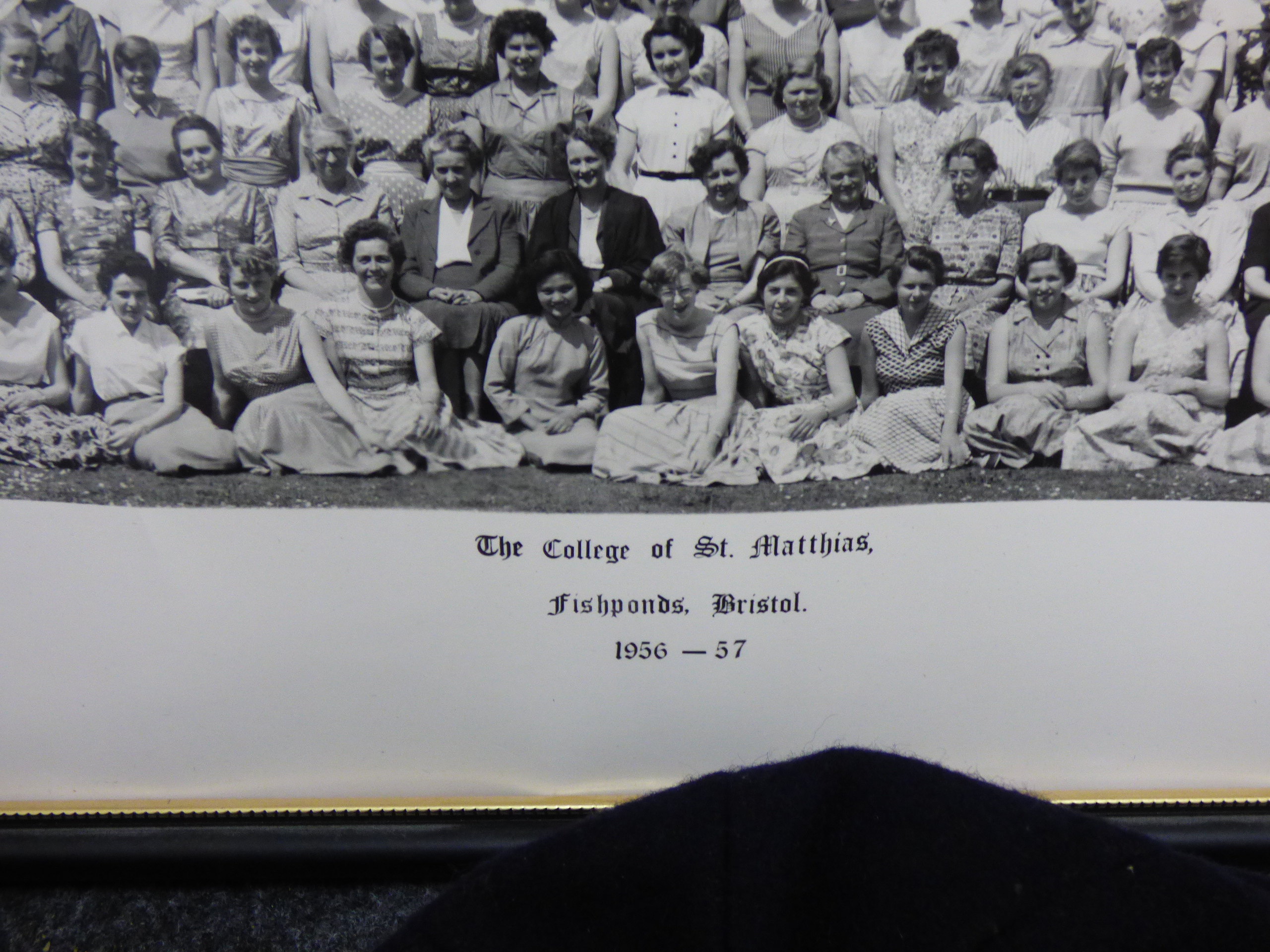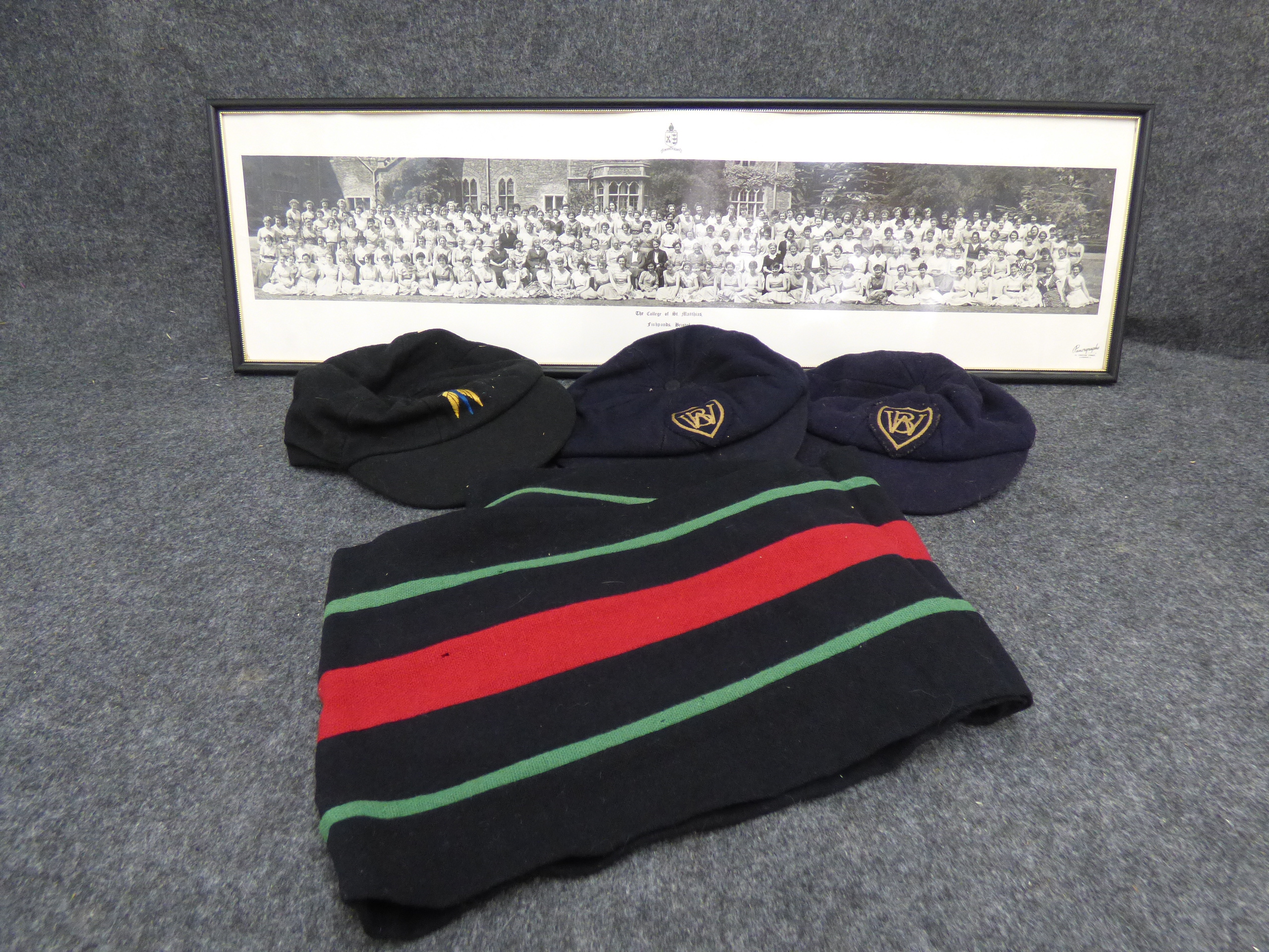 A collection featuring a framed 1956-57 College of St. Matthias photograph, three embroidered school caps labeled for Adrian and Francis Best, and a striped knitted scarf. Picture 86x25cm