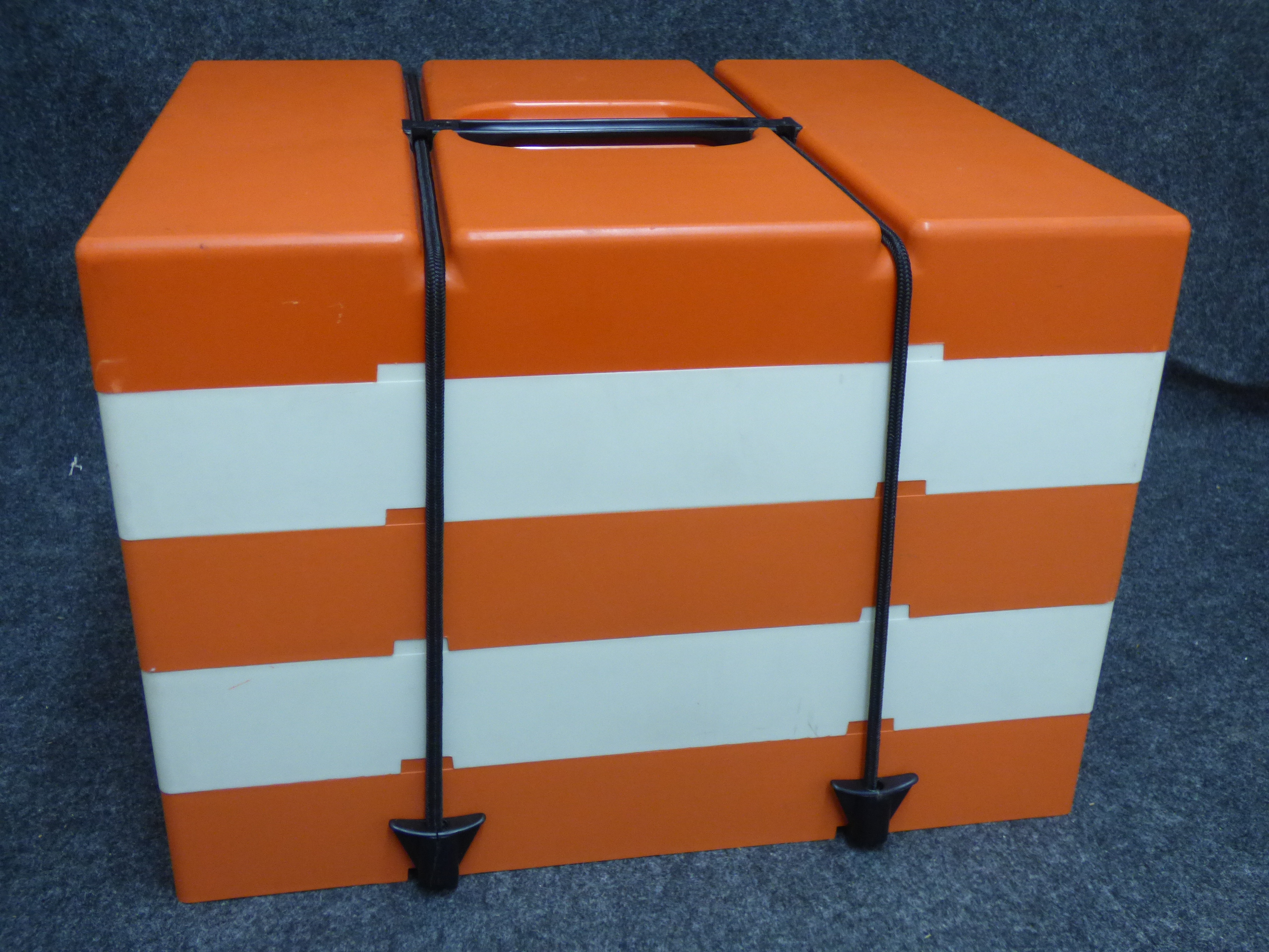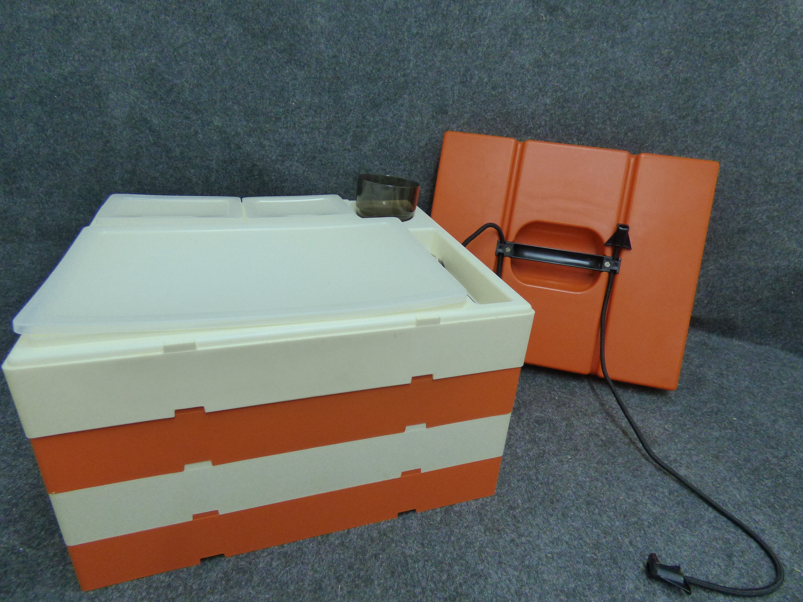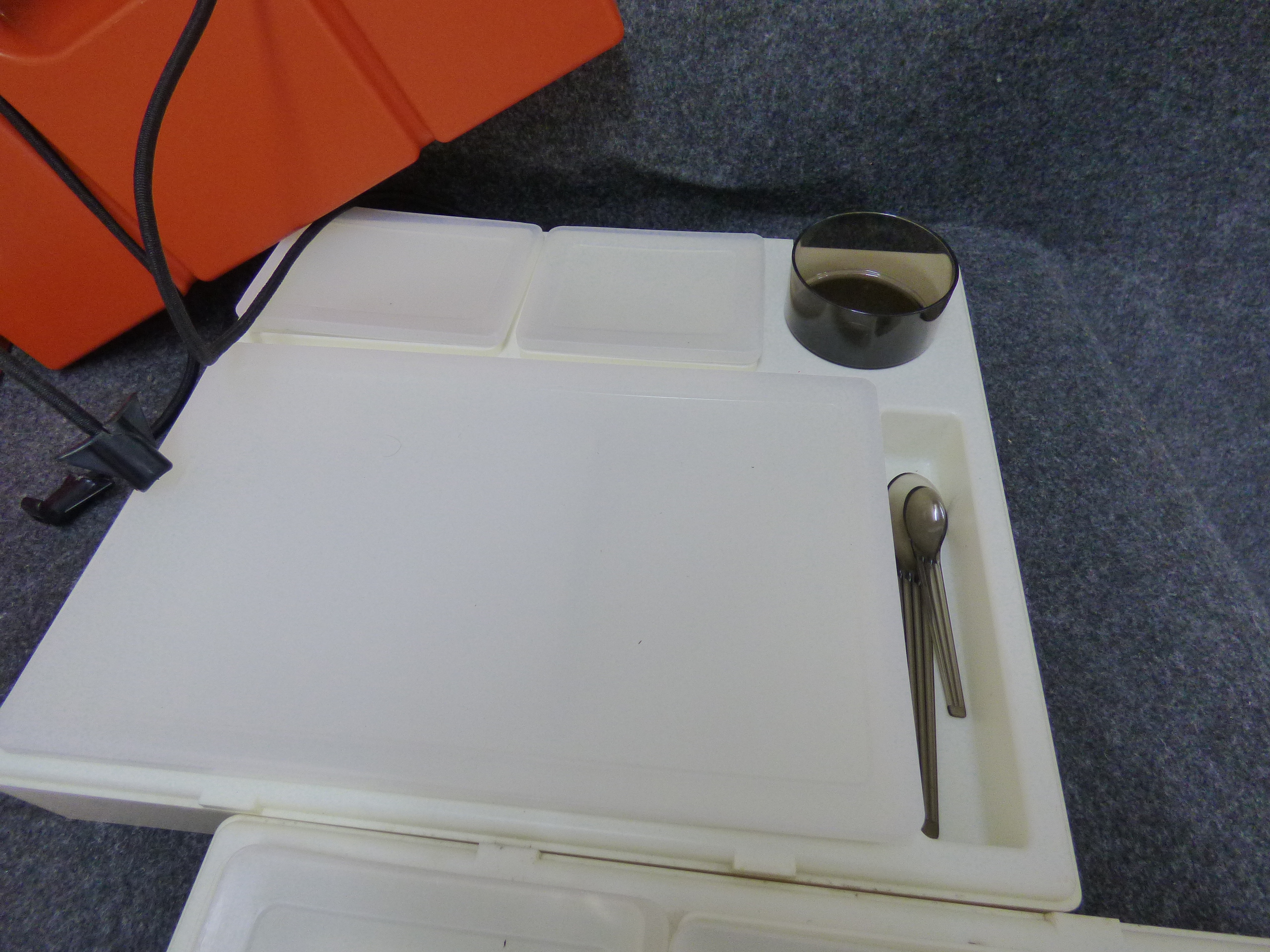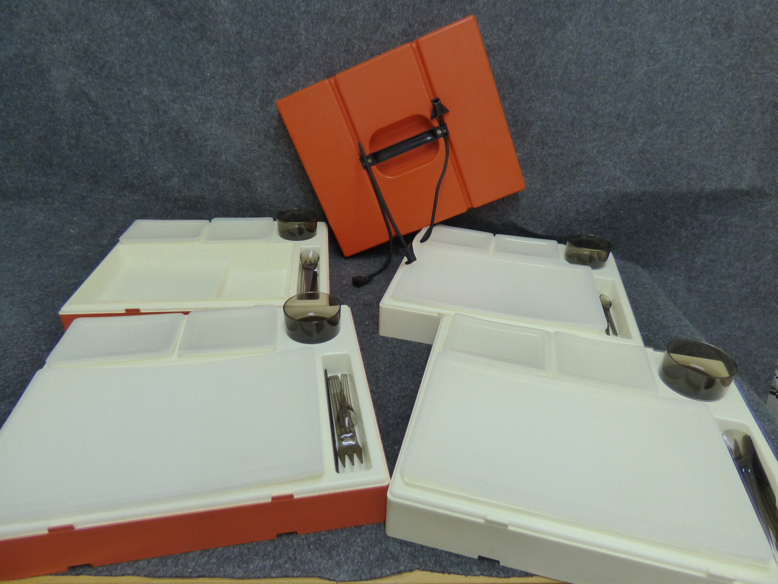 A collection of vintage orange and off-white stackable plastic picnic trays featuring integrated lids, small containers, tumblers, and smoky-coloured utensils secured by a carrying handle.