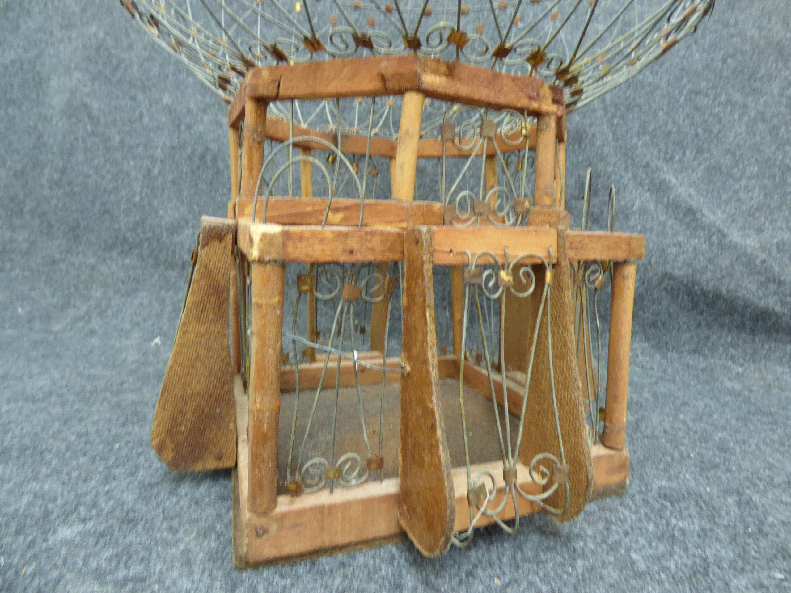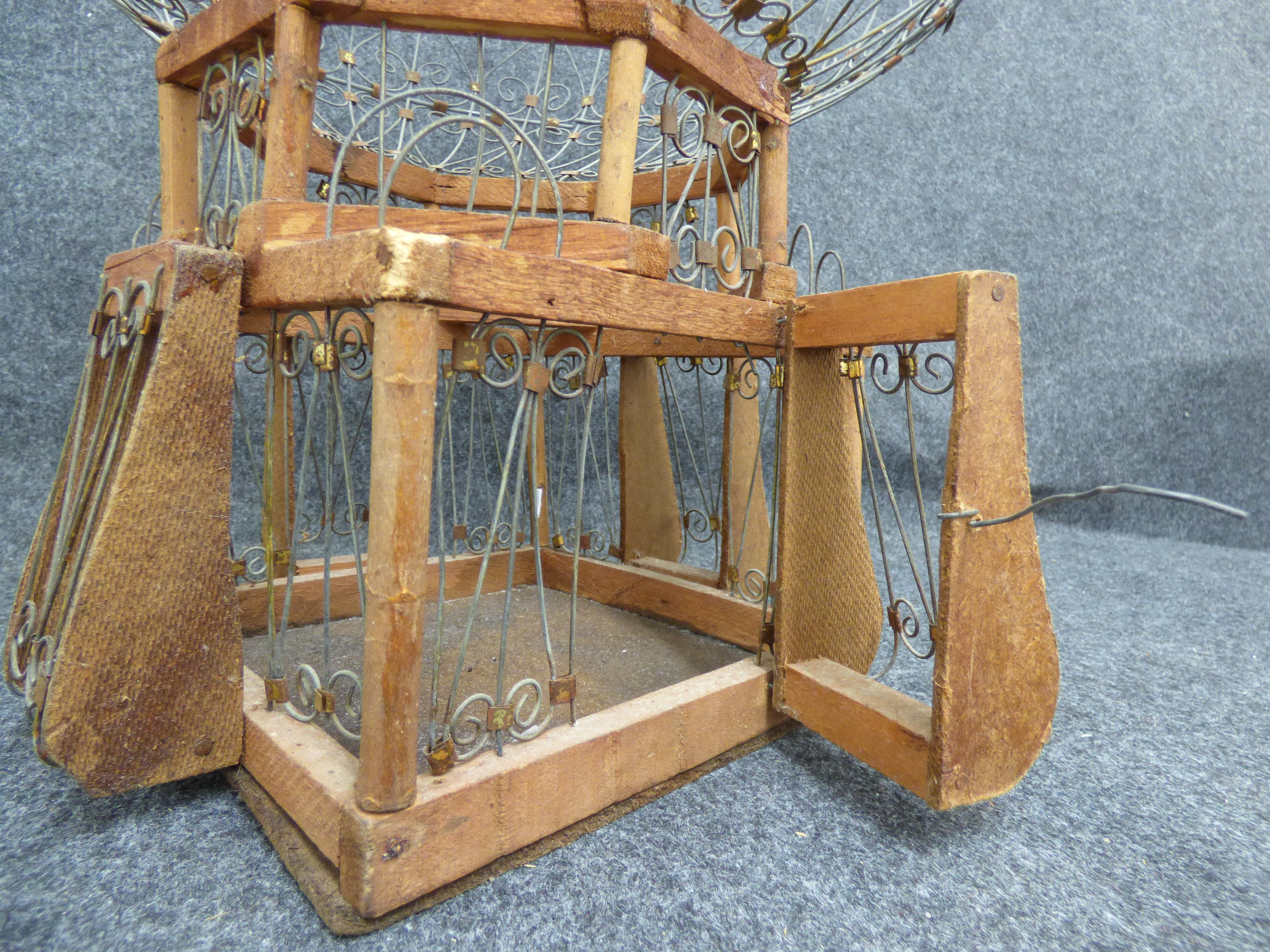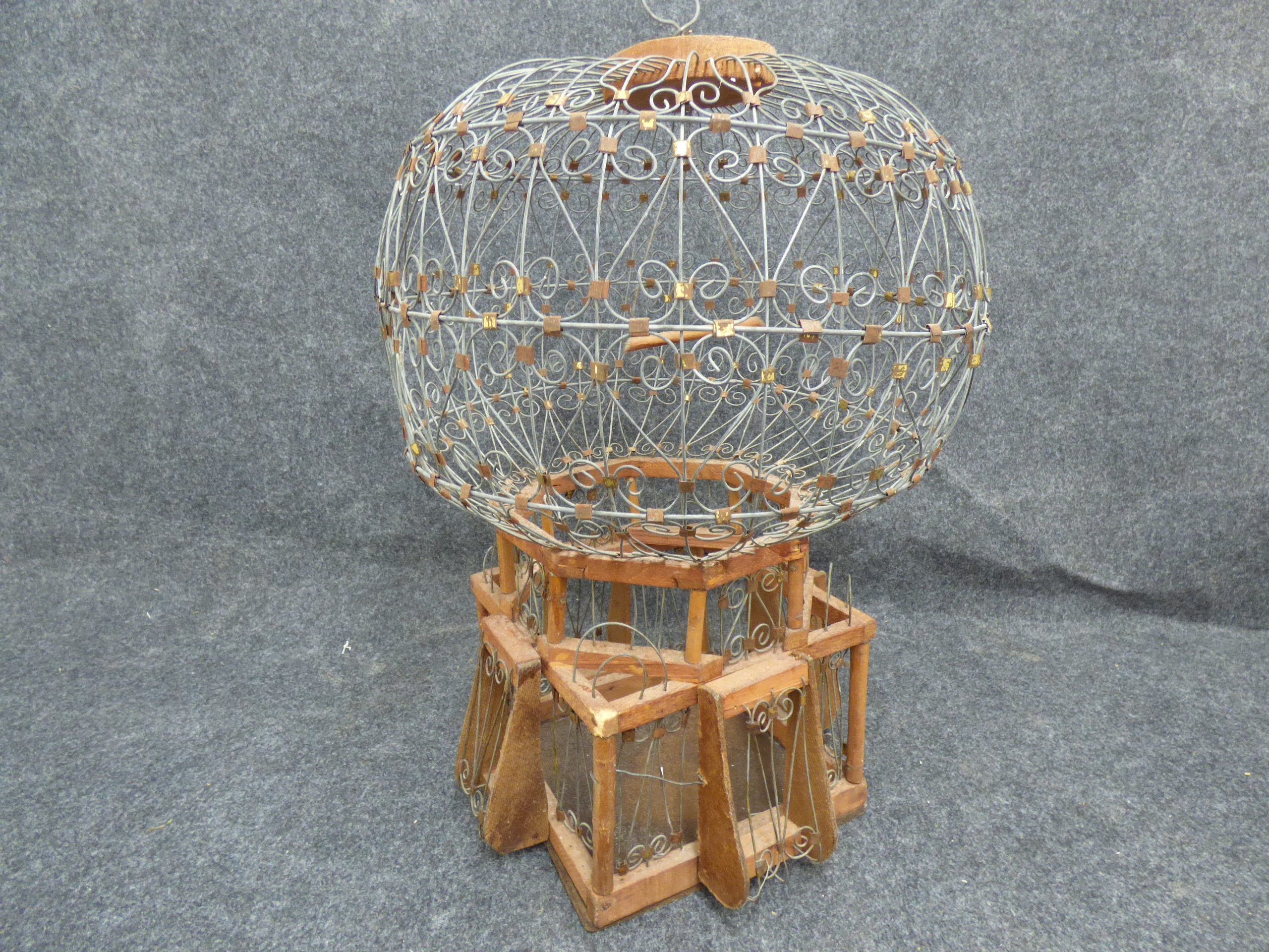 A decorative handmade birdcage shaped like a hot air balloon featuring a grey wire scrollwork globe atop a multi-tiered brown wooden base with gold-tone metallic accents. 50cm tall, 38cm wide