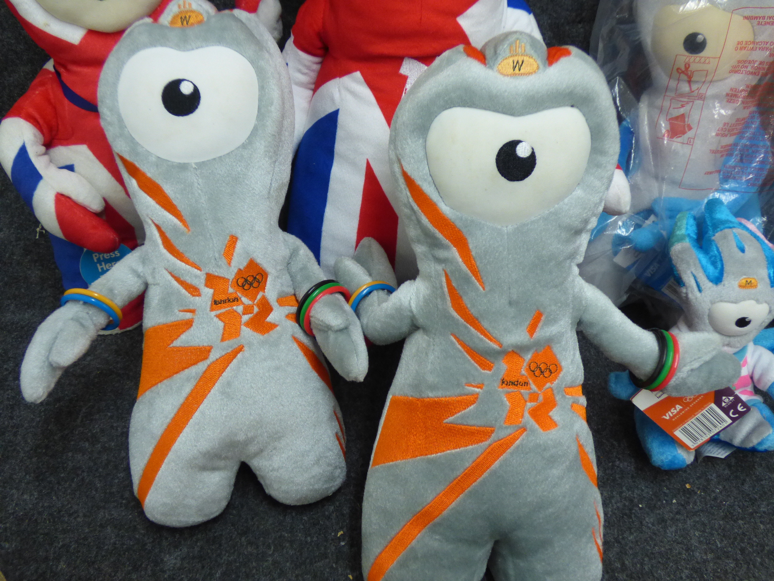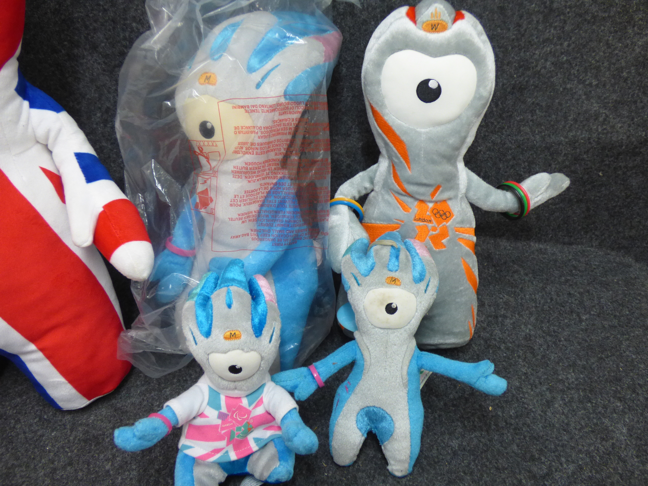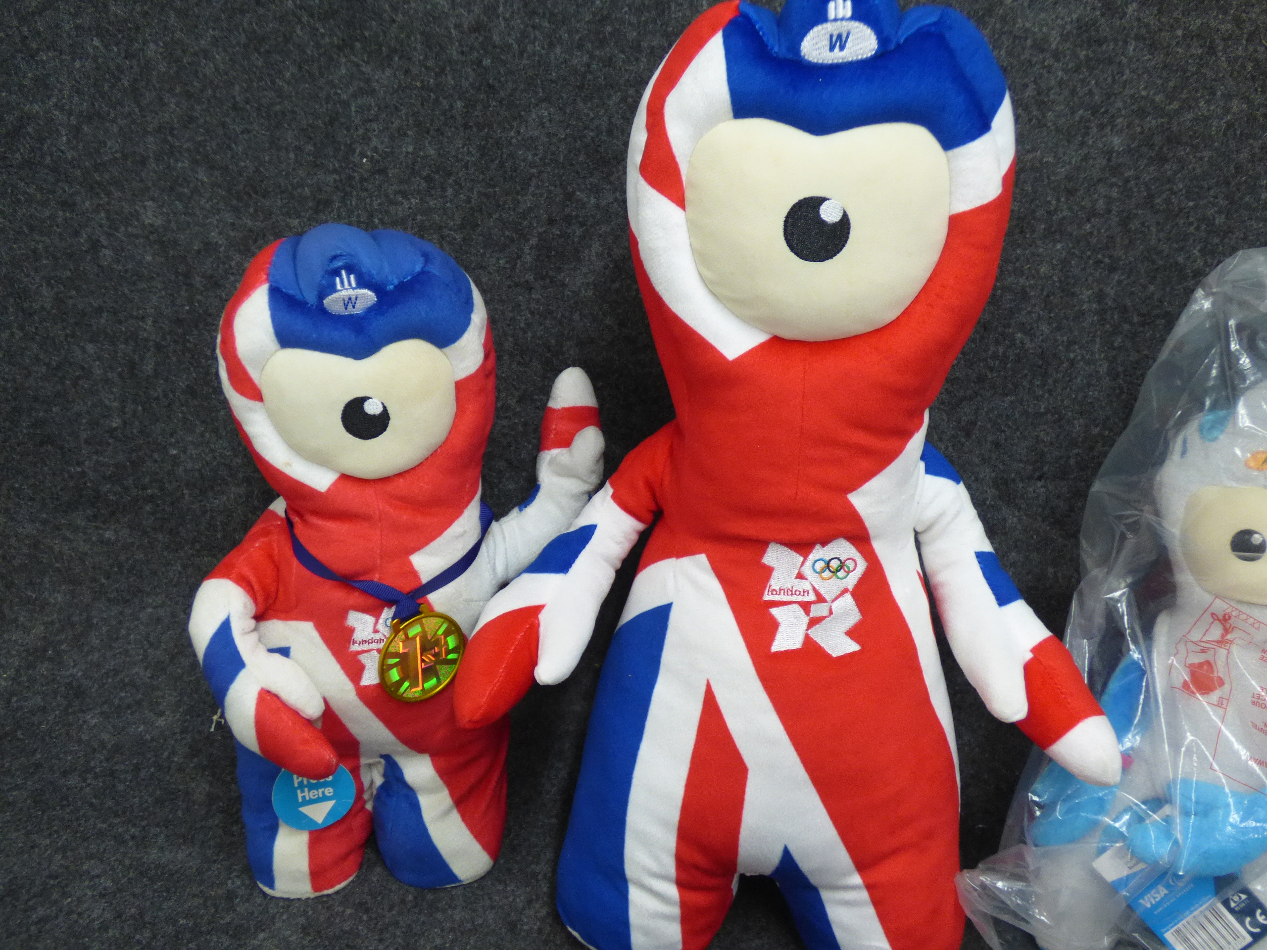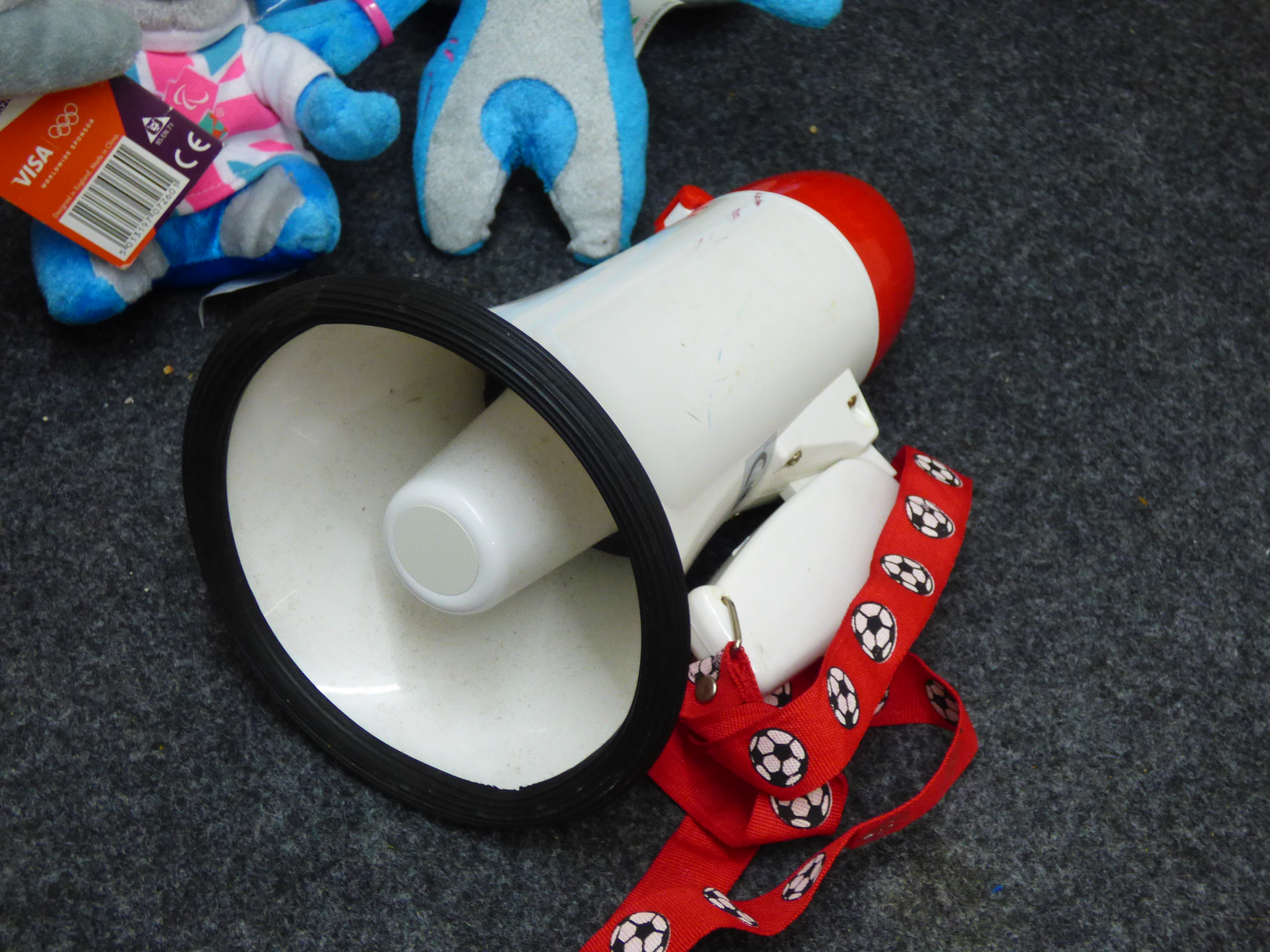 A collection of Wenlock and Mandeville plush mascot toys in various sizes and designs including Union Jack and metallic finishes, accompanied by a red and white megaphone. Tallest 45cm
