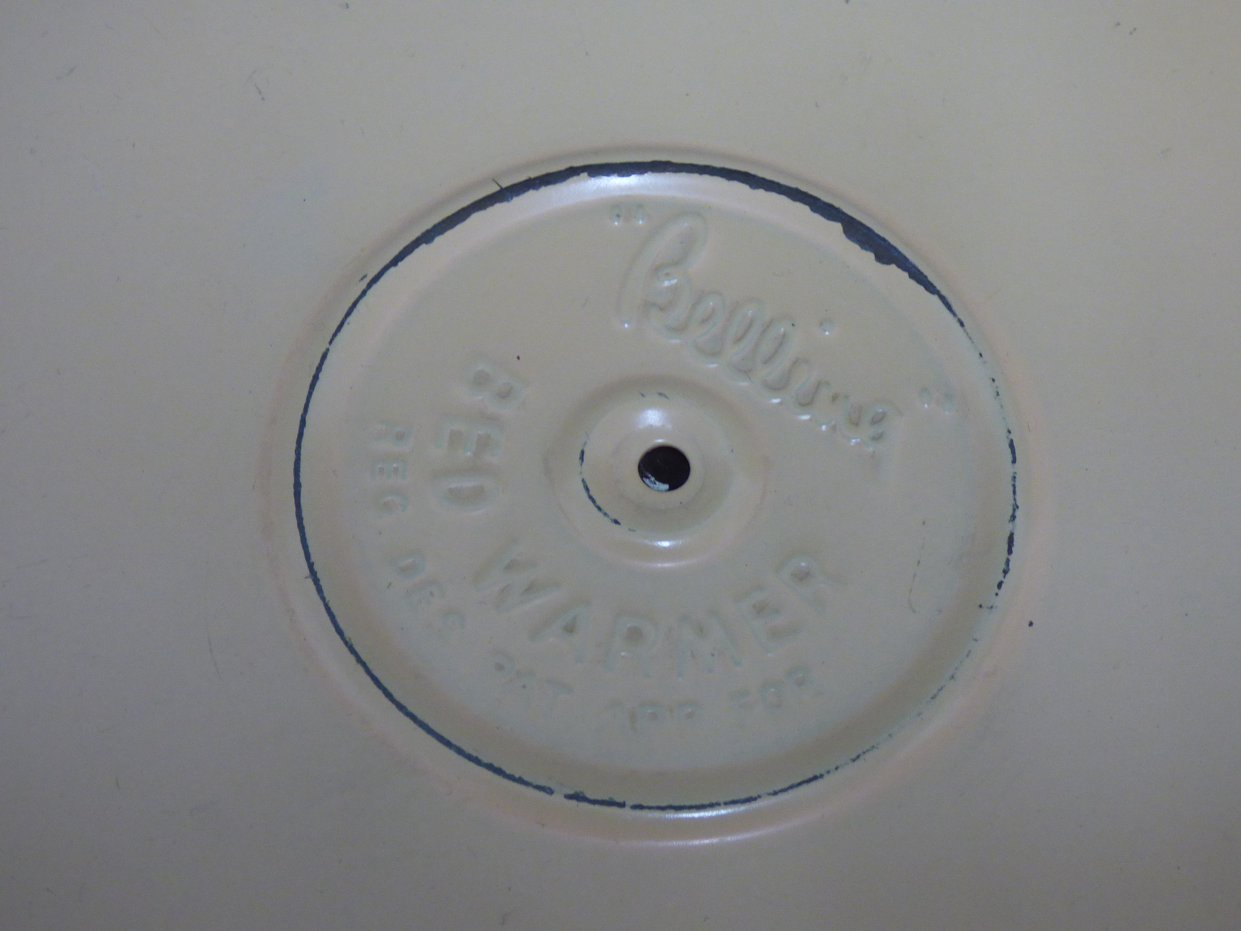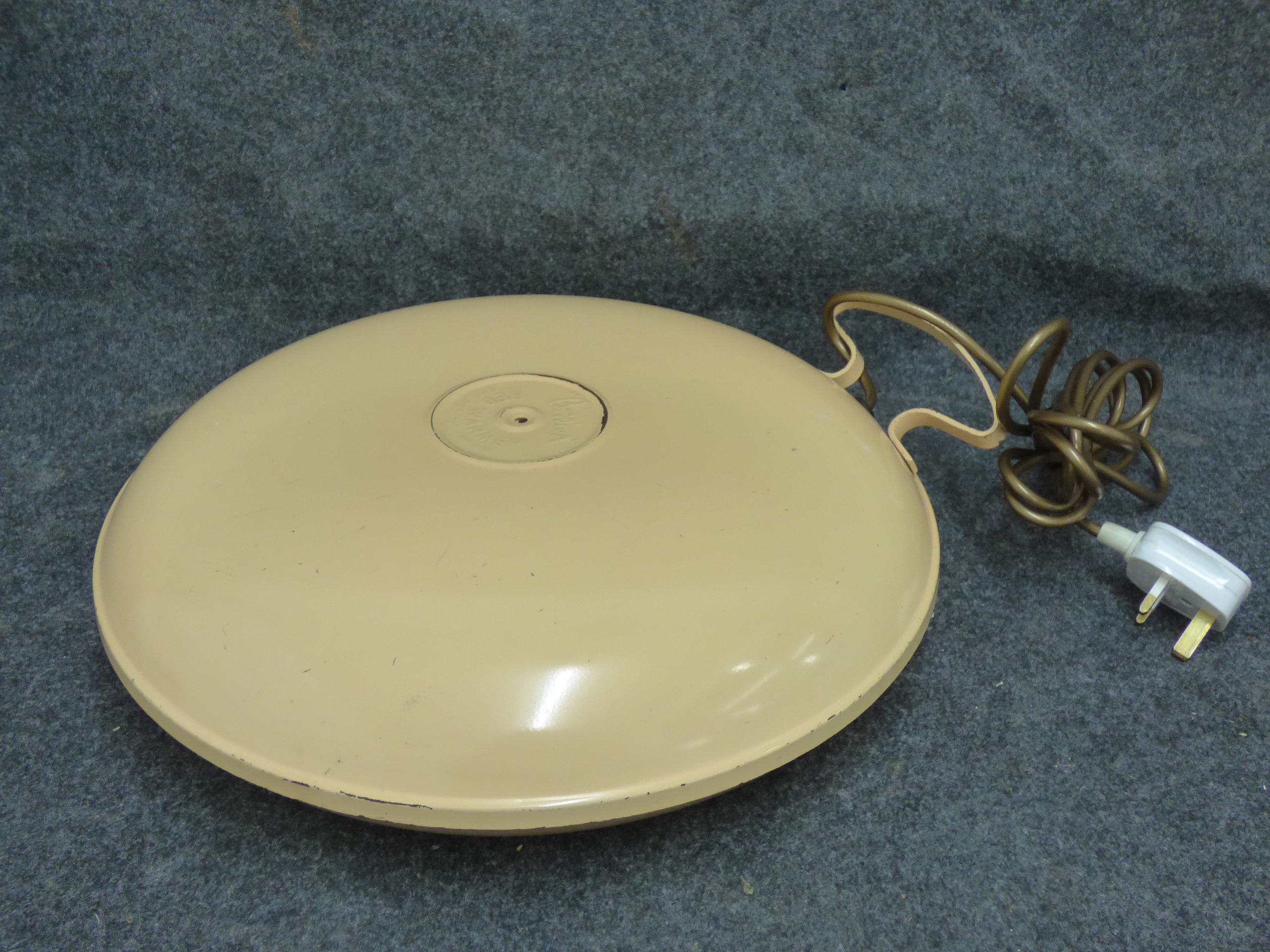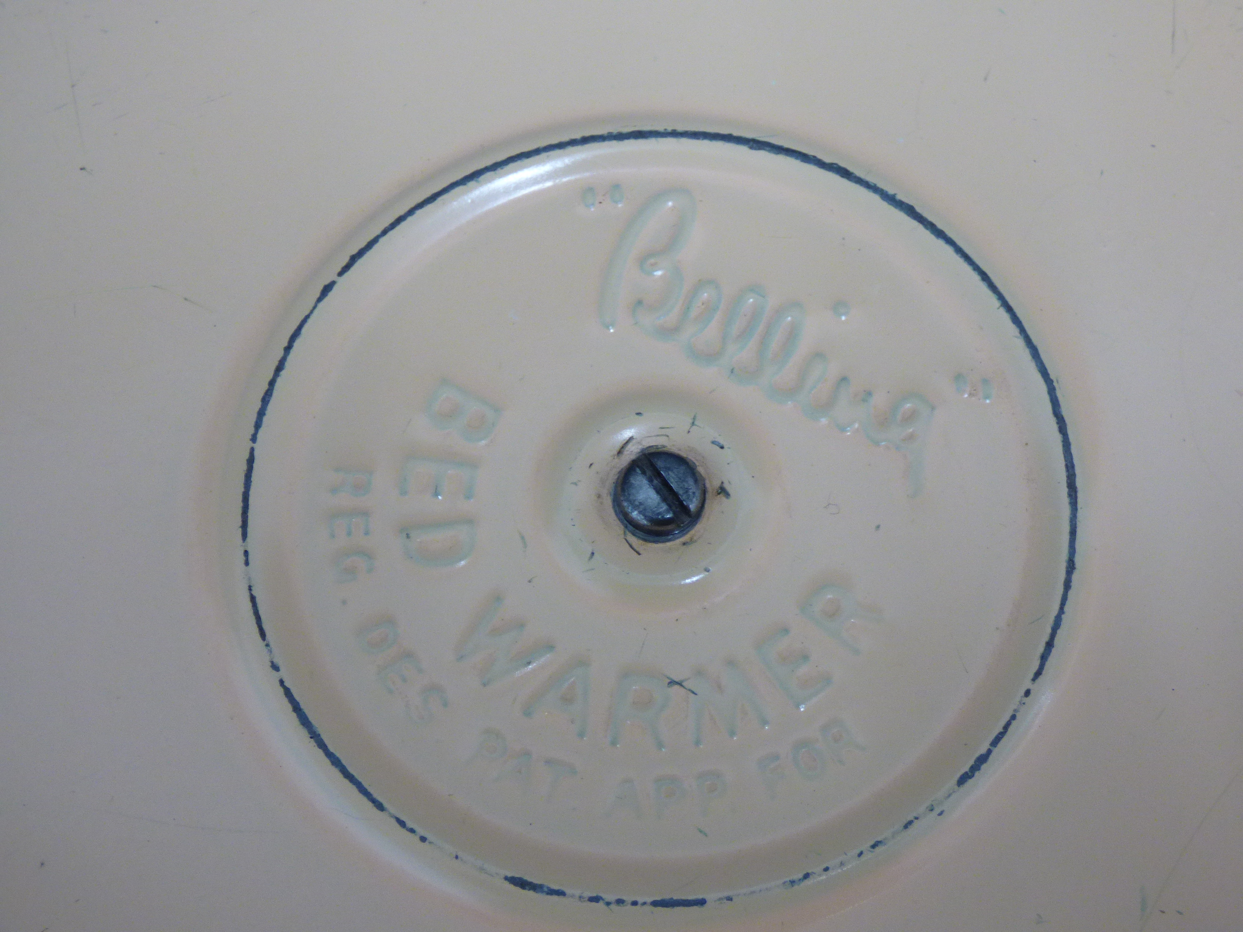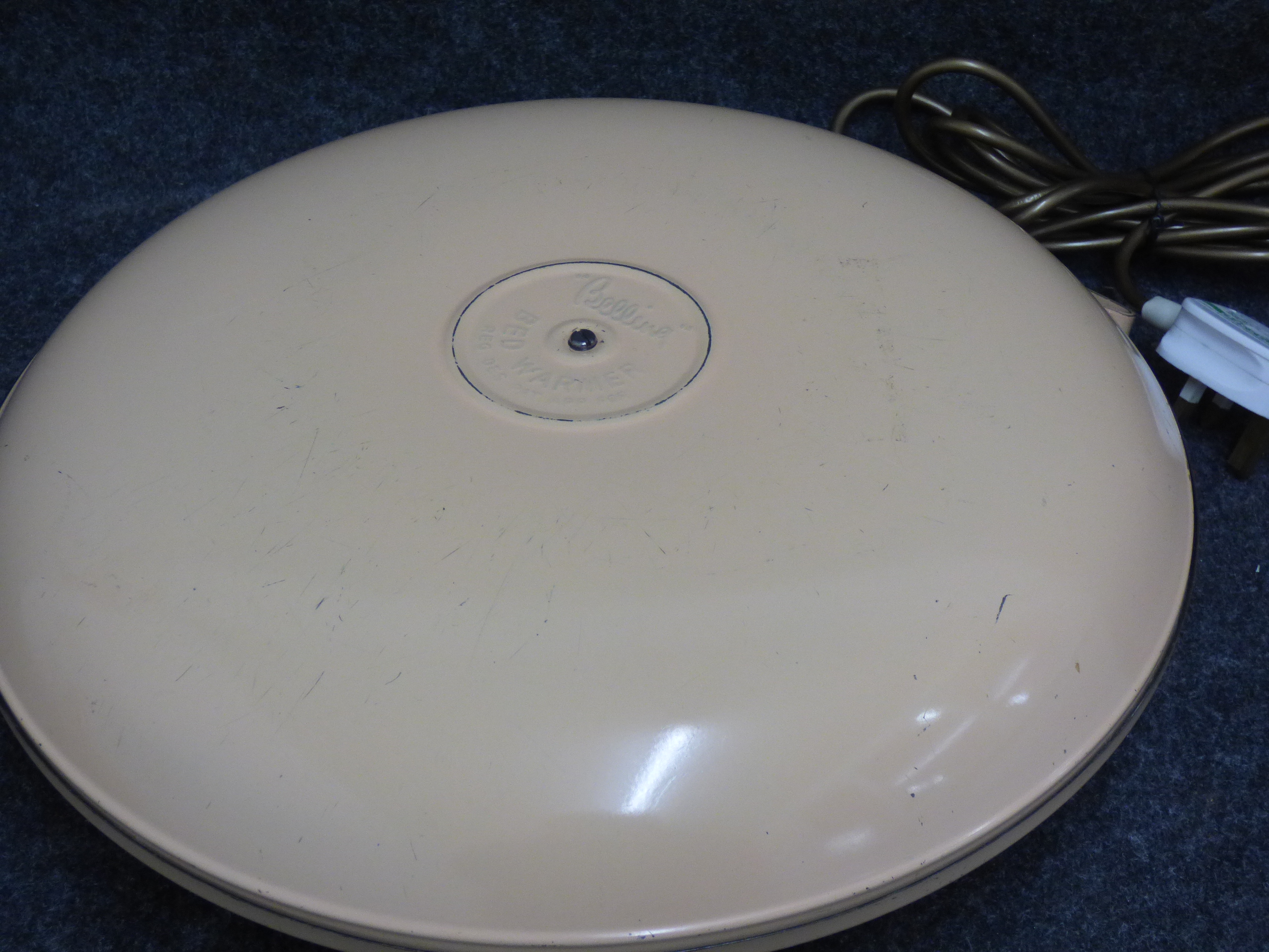 A cream-coloured Belling electric bed warmer of disc-shaped form featuring an electrical cord with a UK plug and embossed manufacturer markings. Untested
