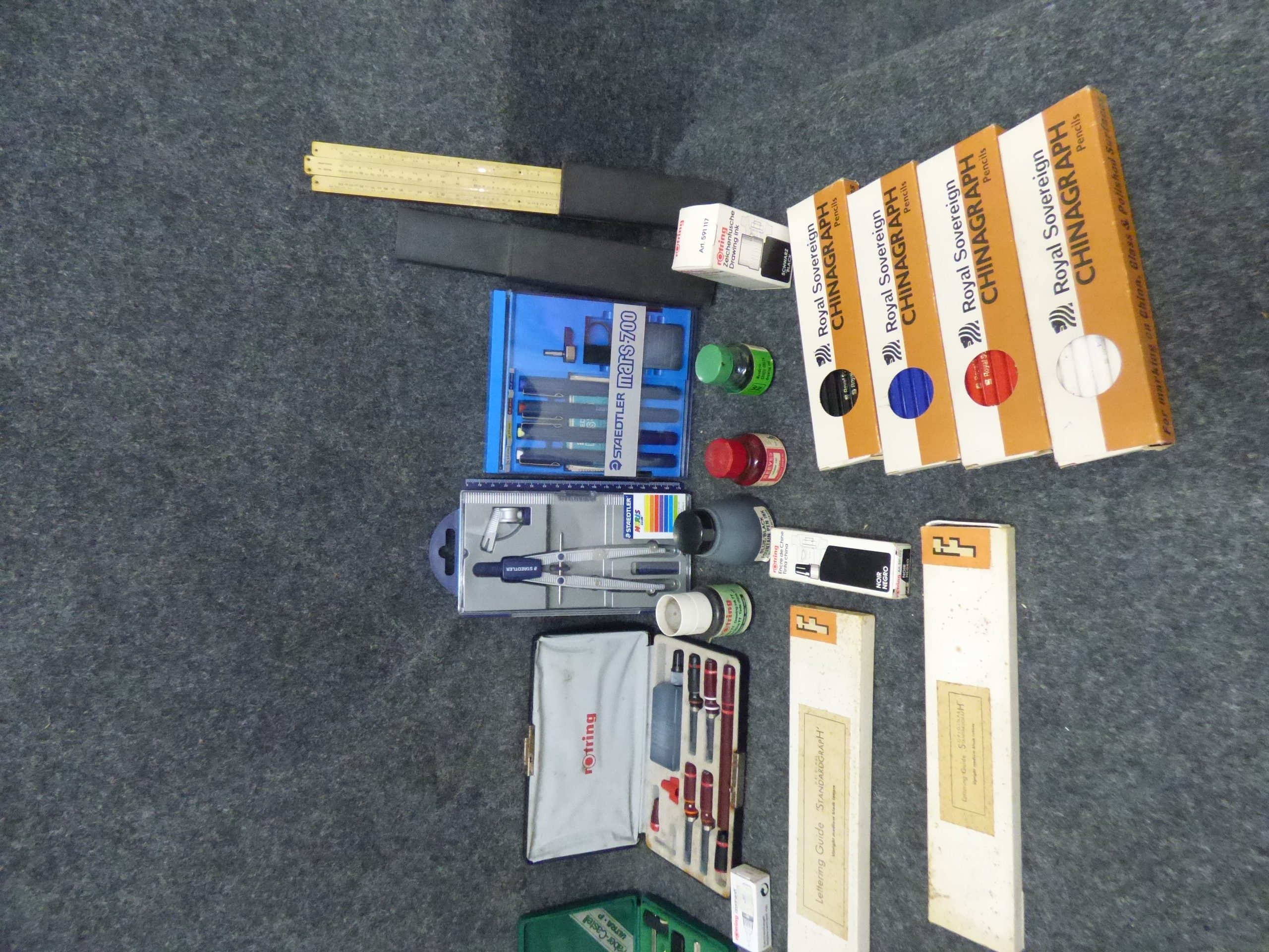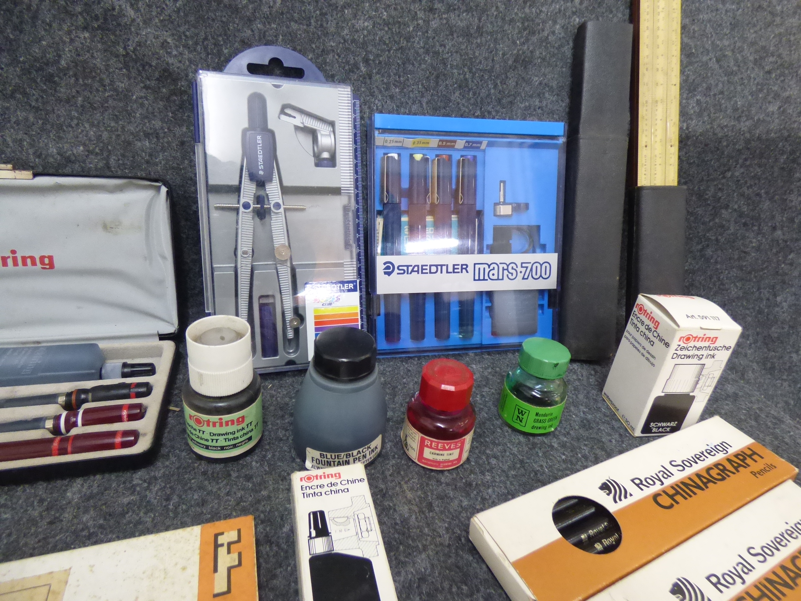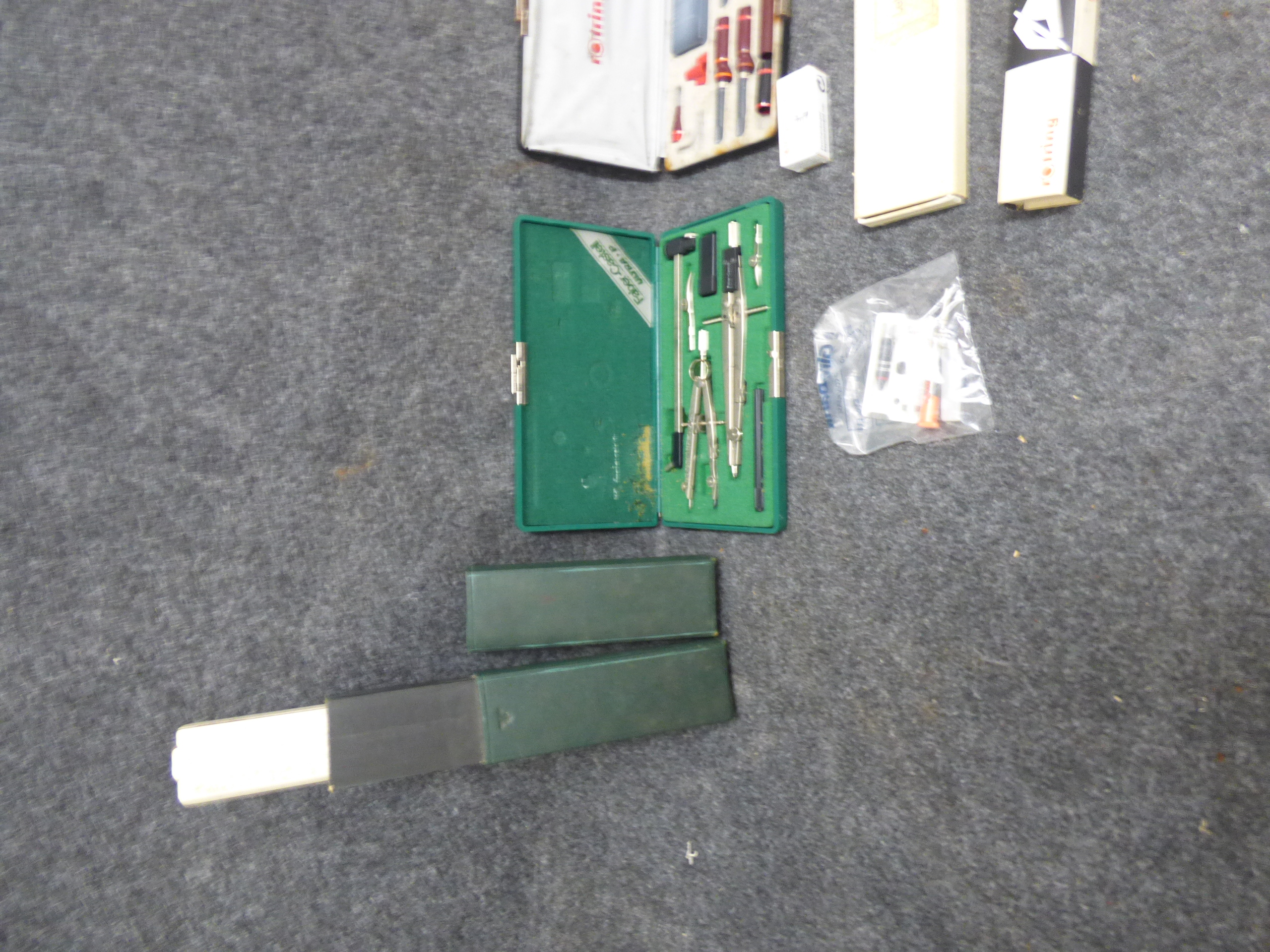 A collection of multicoloured drafting and technical drawing supplies including compass sets, technical pens, lettering guides, and drawing inks from brands such as Rotring, Staedtler, and Faber-Castell.