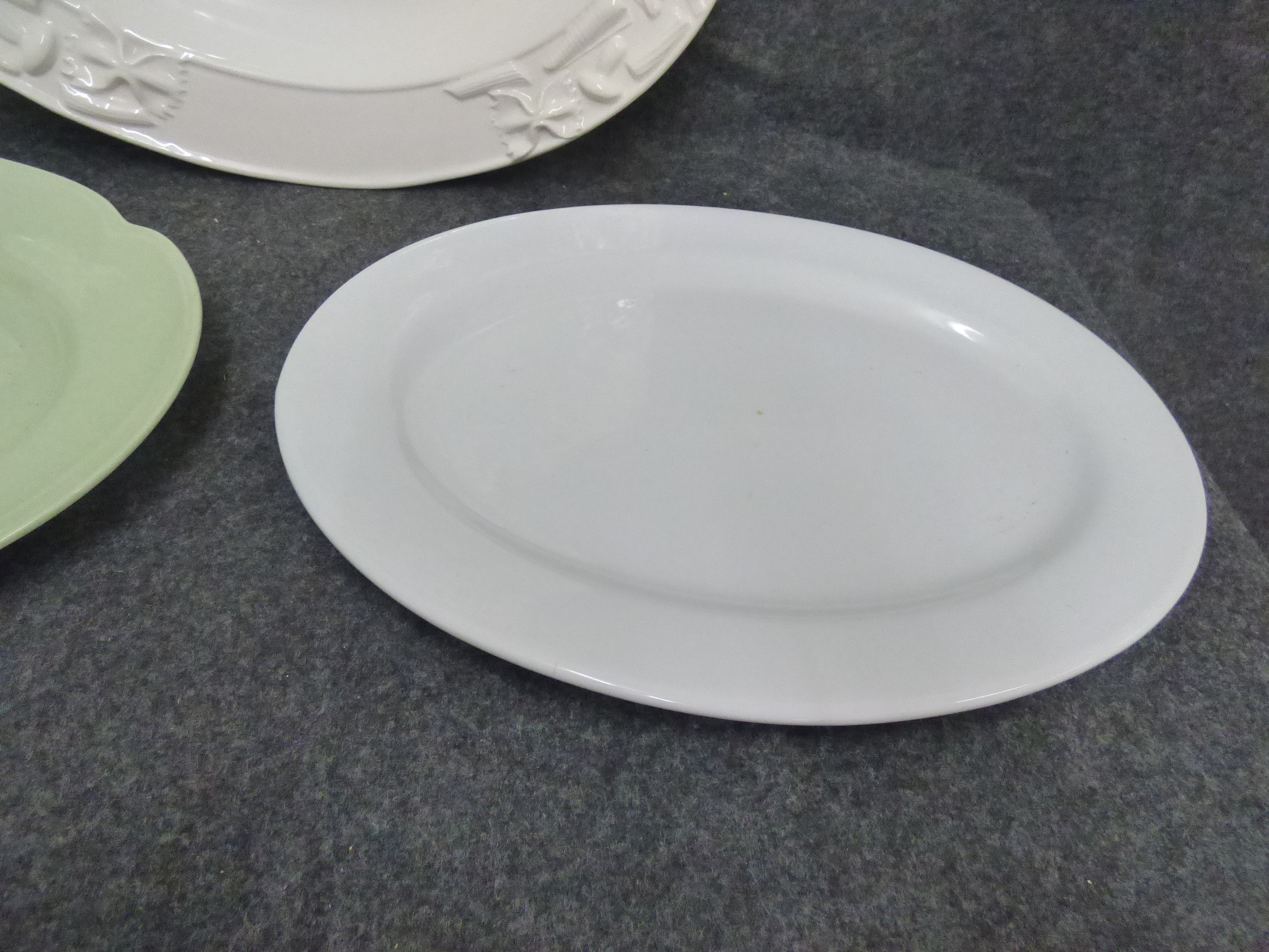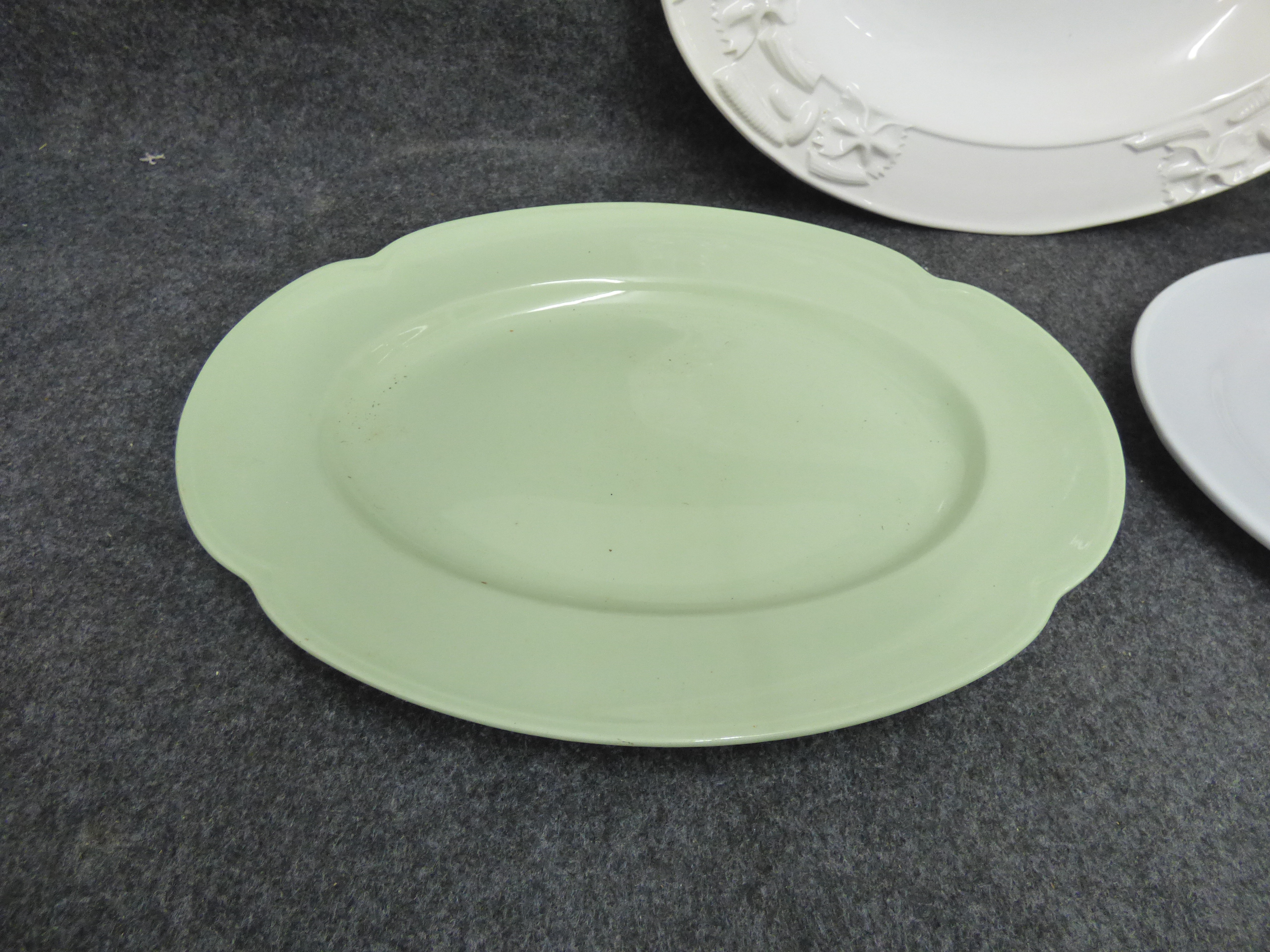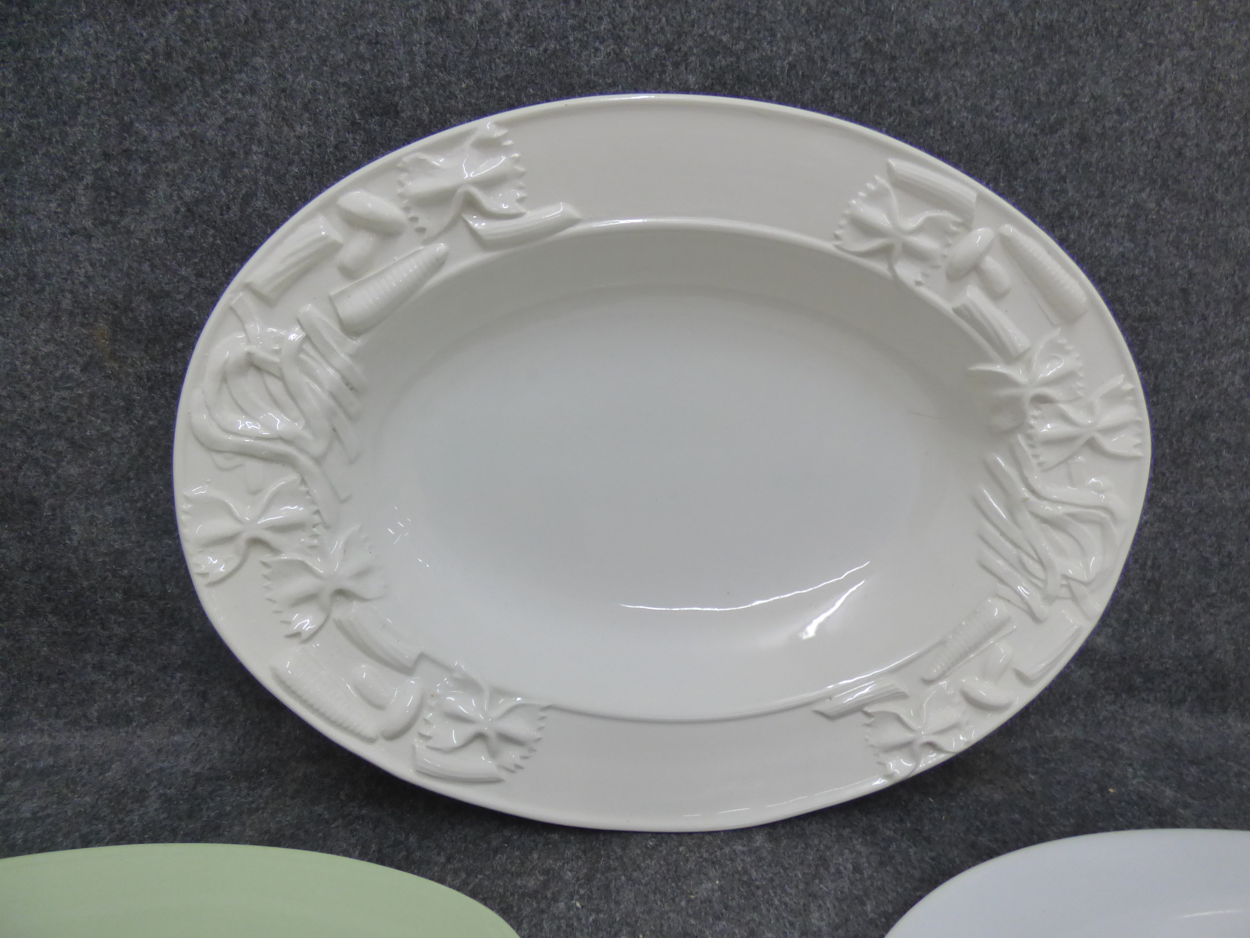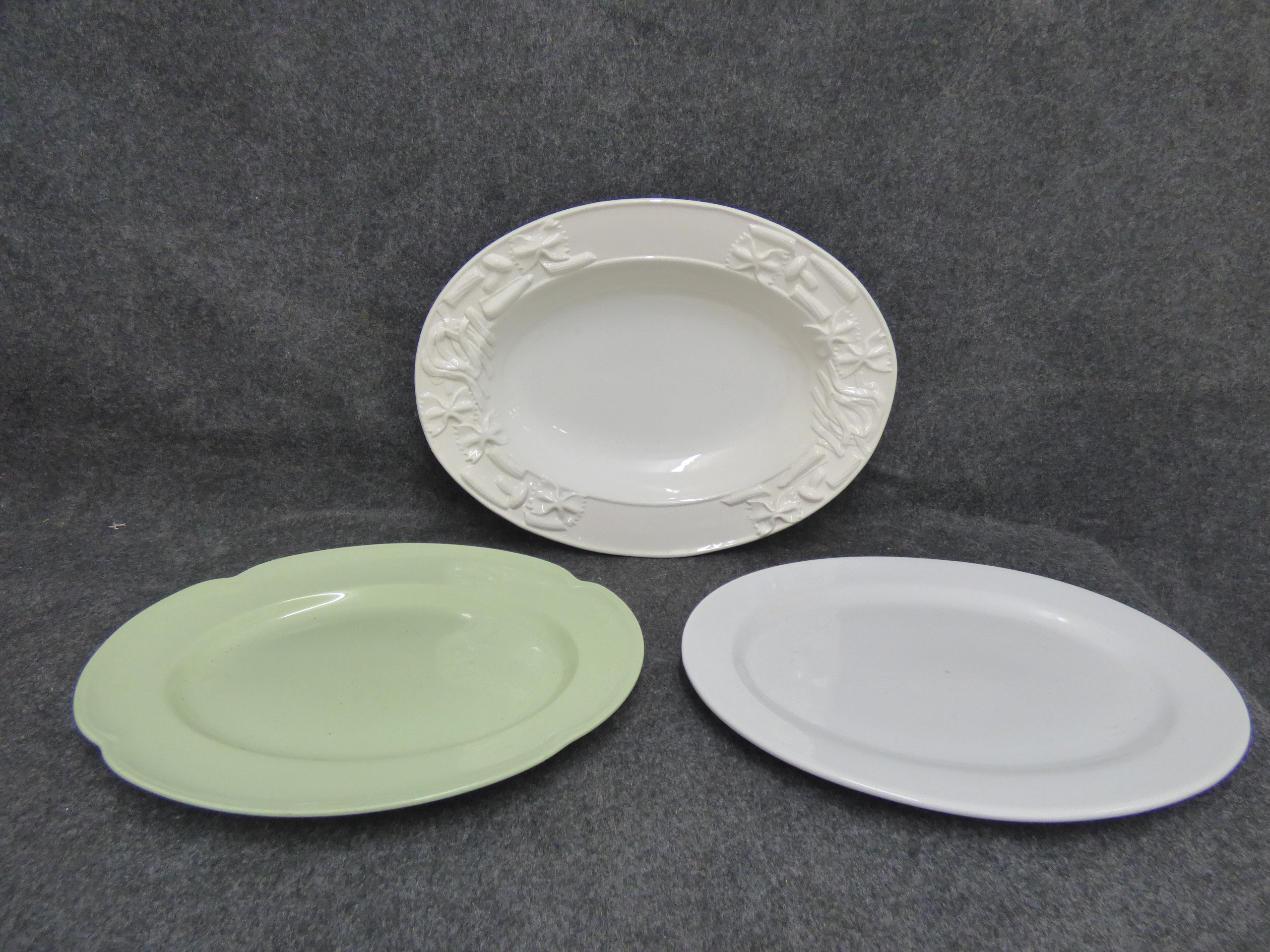 A collection of three ceramic serving pieces including a white pasta platter with embossed rim details marked Stovit Made in Italy and two additional oval platters in white and pale green. Largest 46cm wide