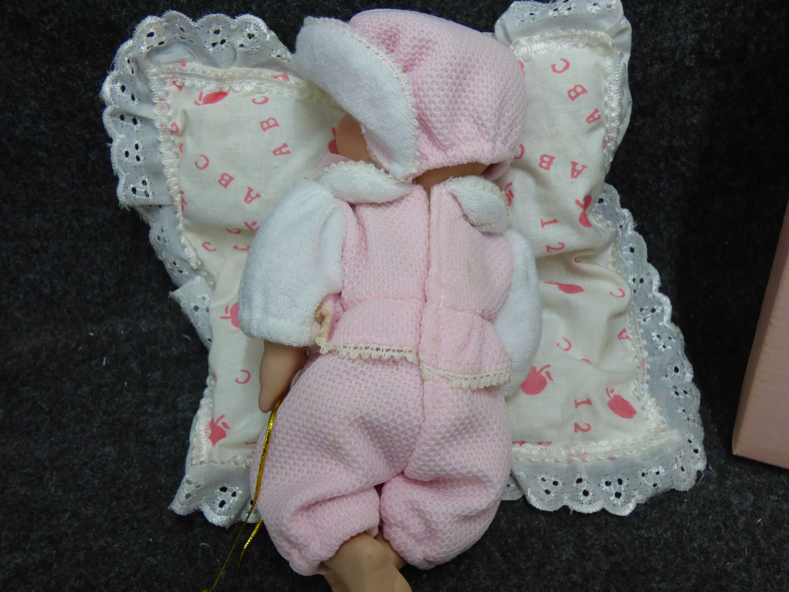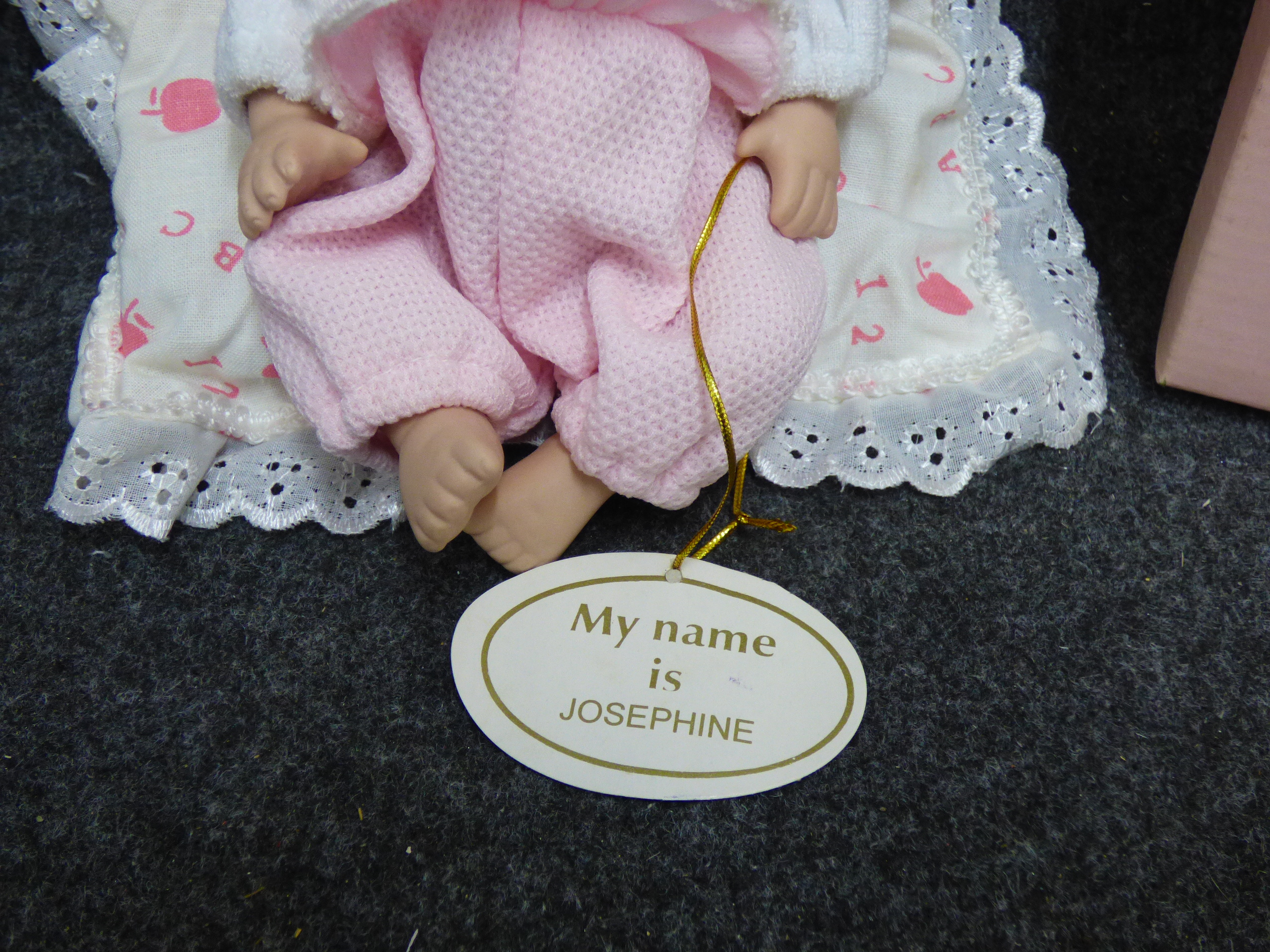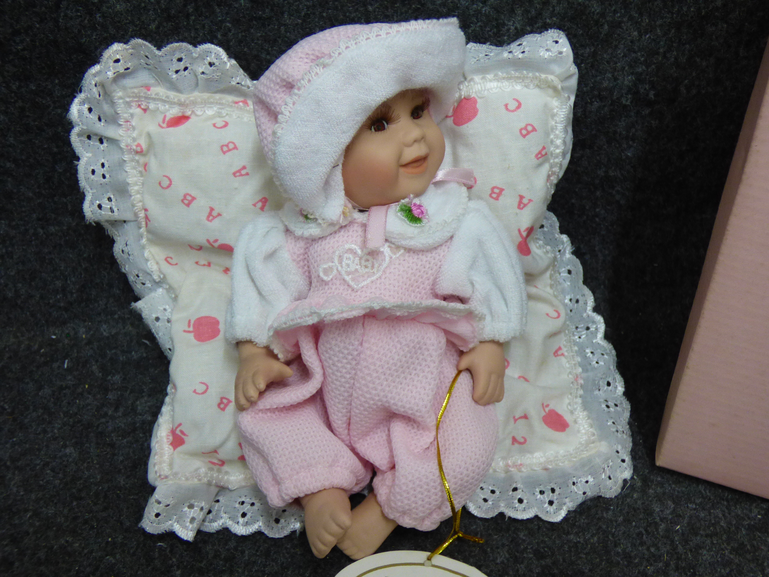 A Regency Fine Arts baby doll named Josephine wearing a pink and white outfit, accompanied by a lace-trimmed ABC cushion and the original presentation box. 20cm tall
