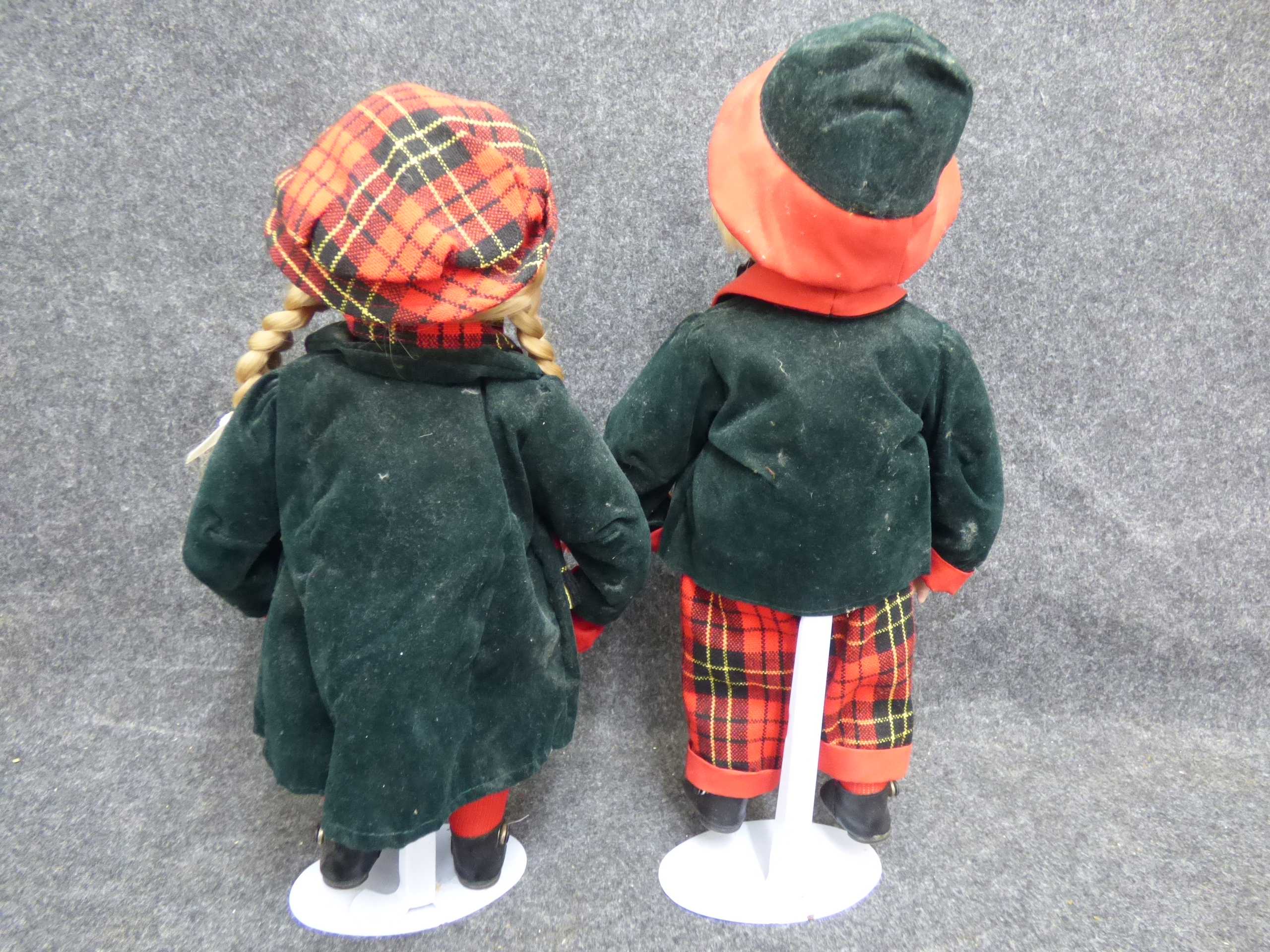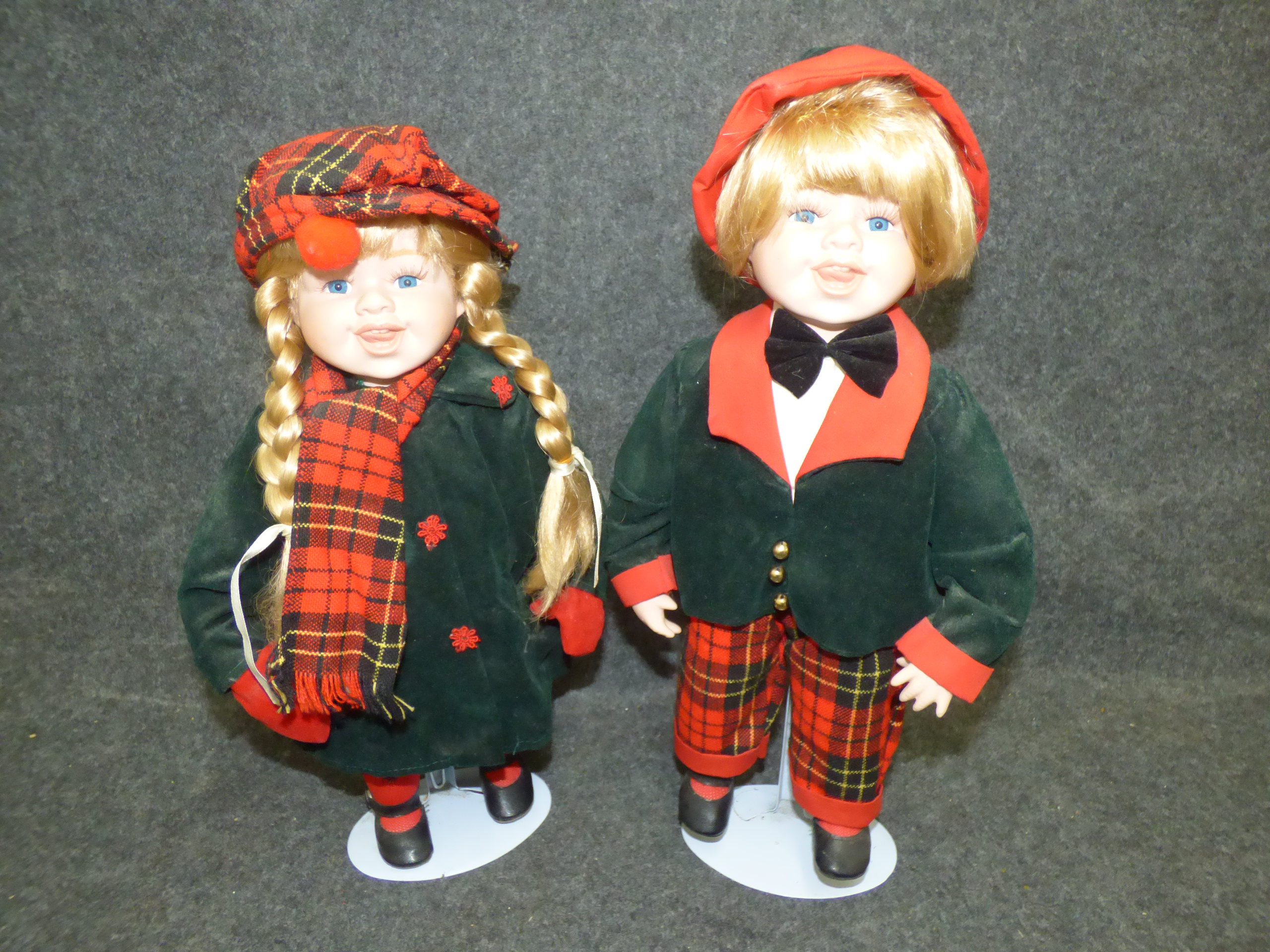 A pair of porcelain dolls featuring a boy and girl dressed in dark green velvet jackets with red and yellow plaid accents, mounted on white circular display stands. 42cm tall