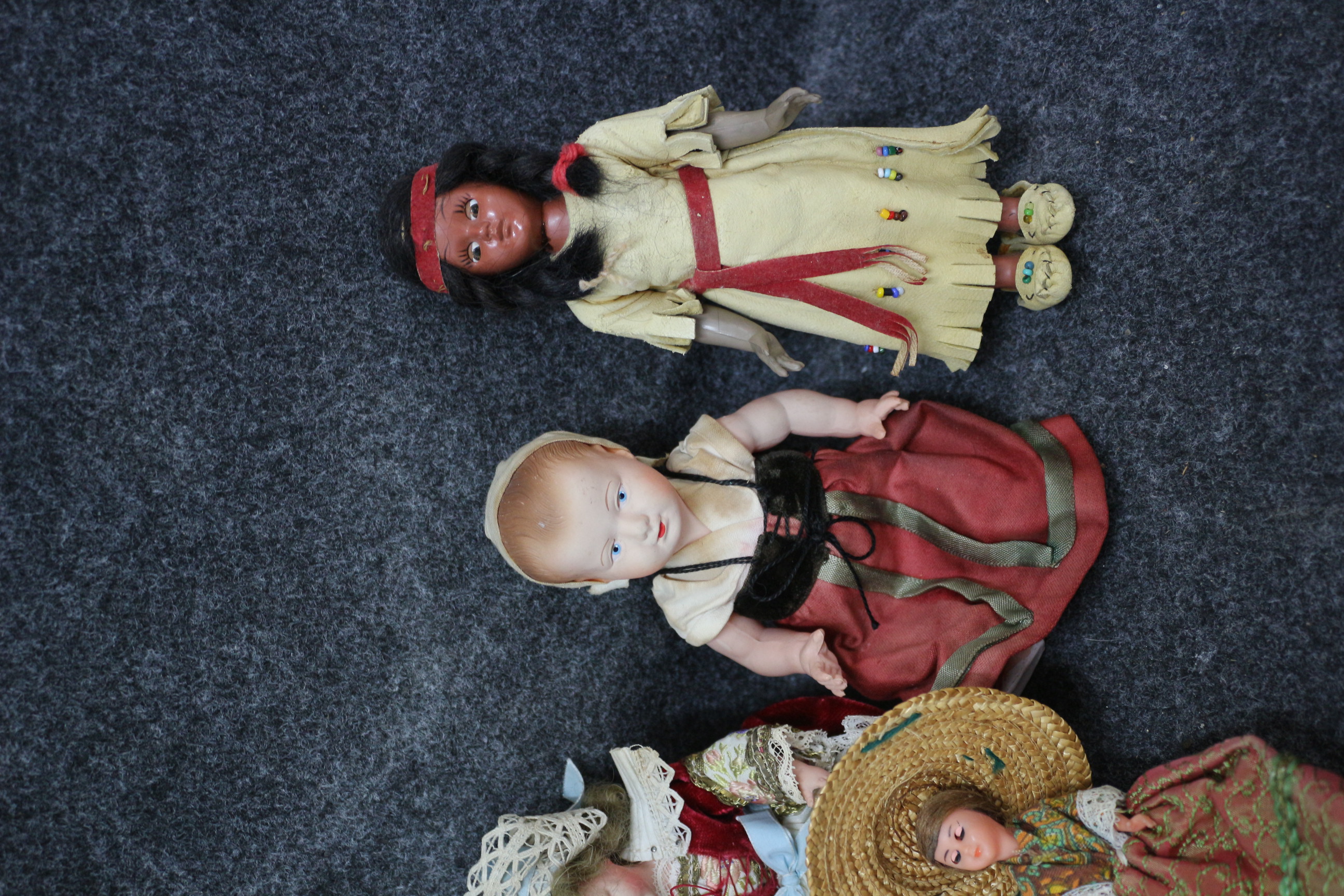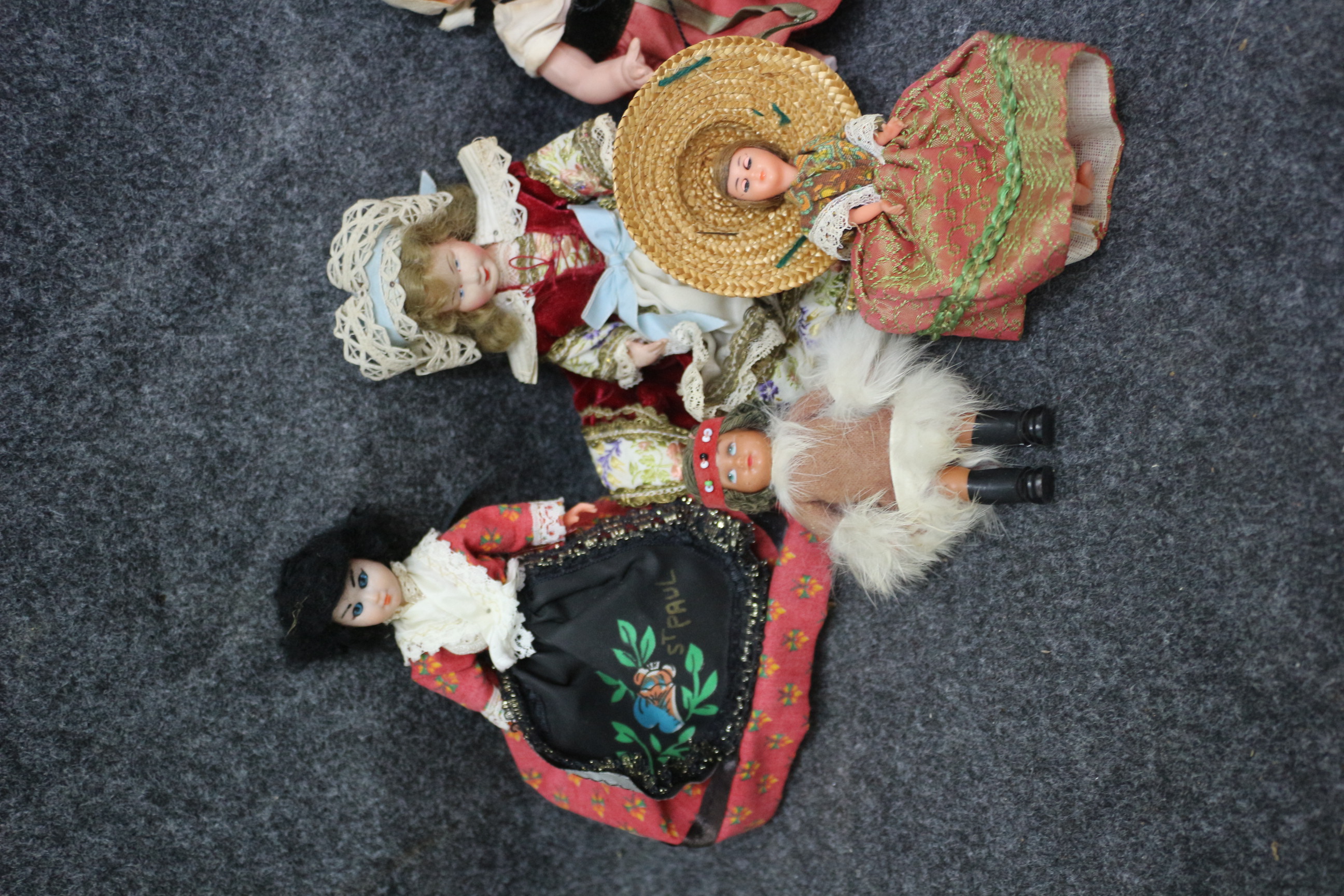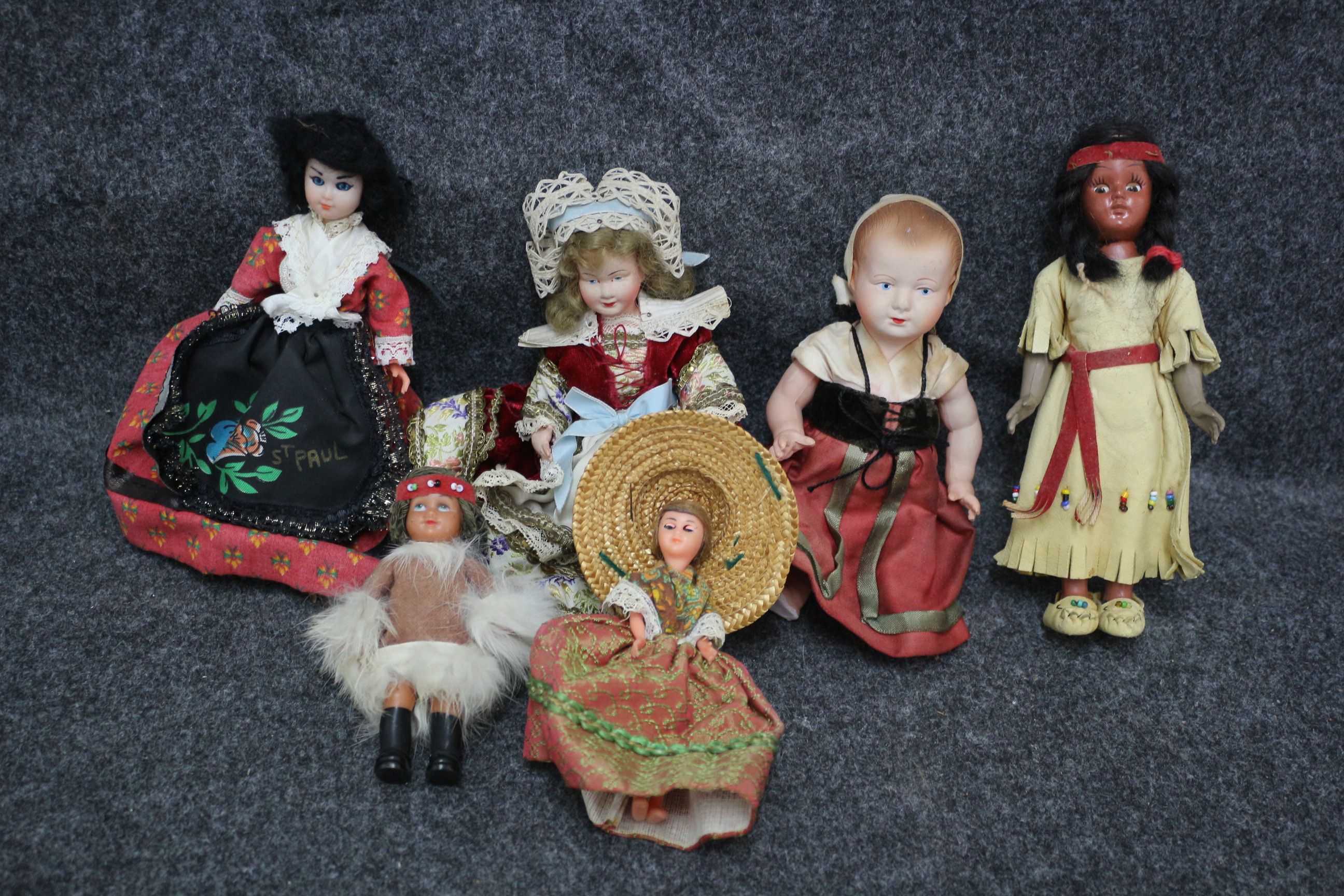A collection of vintage hard plastic dolls dressed in various traditional costumes including a doll with an apron inscribed St Paul and another in Indigenous style attire.