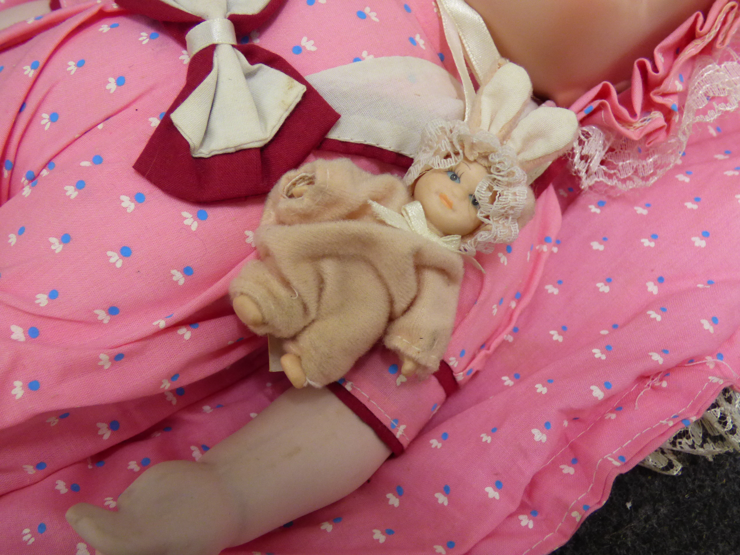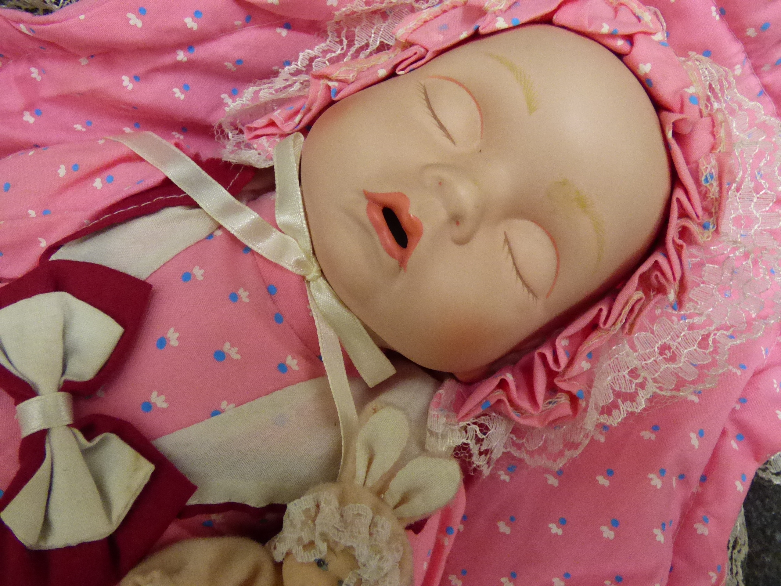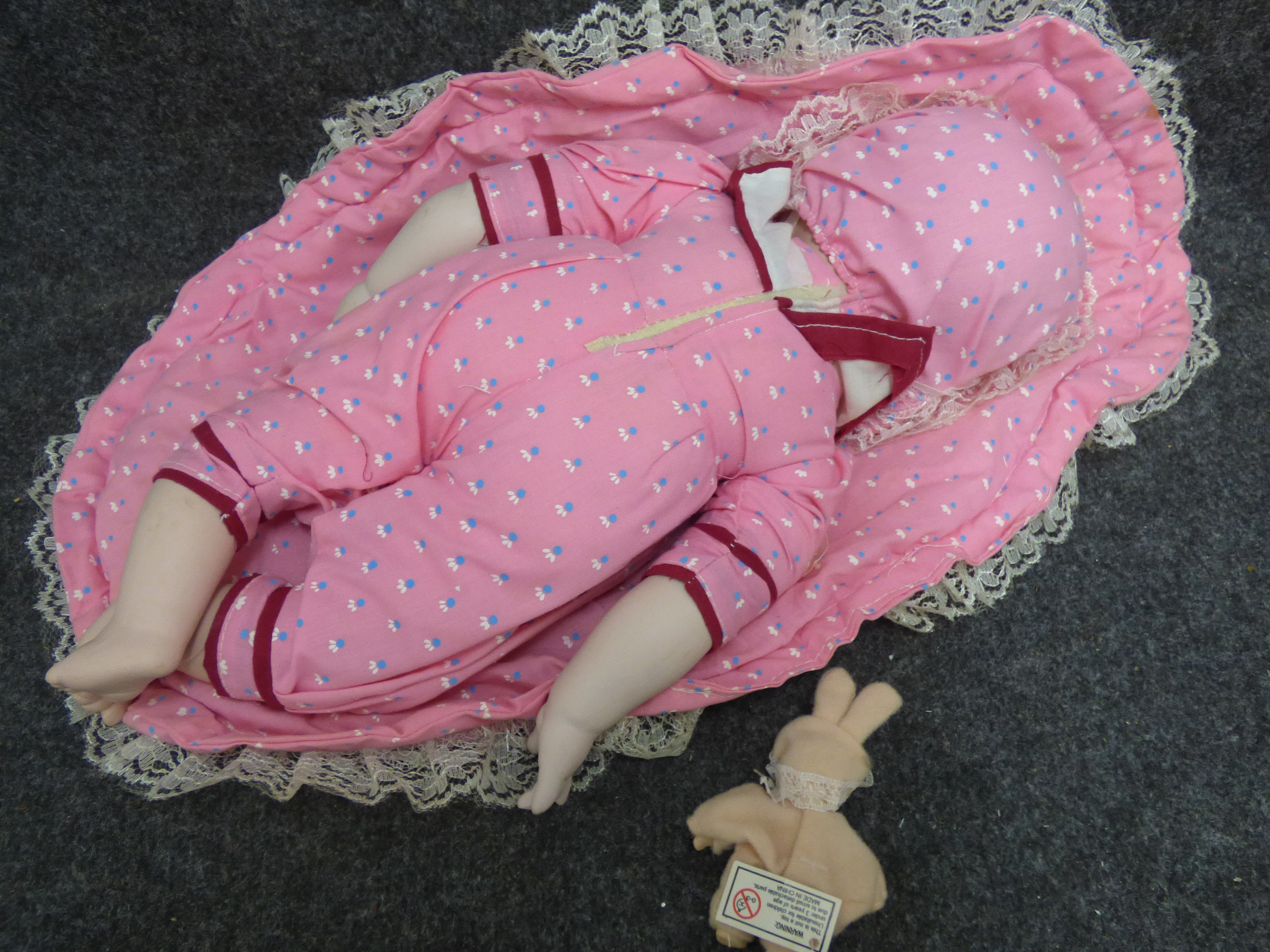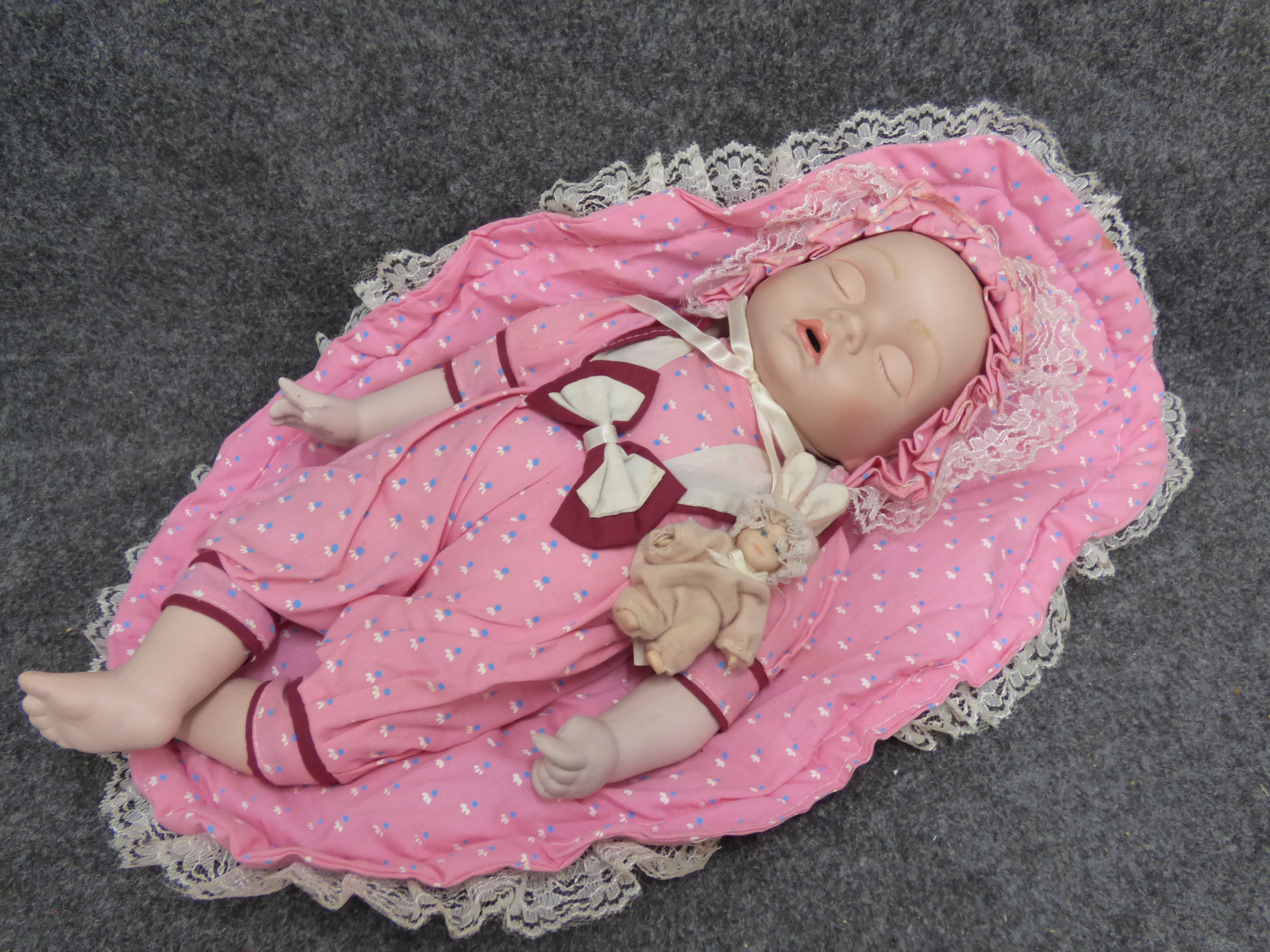 A porcelain sleeping baby doll dressed in a pink floral outfit with a matching bonnet and lace-trimmed mat, accompanied by a smaller companion doll in a bunny suit. 38cm tall