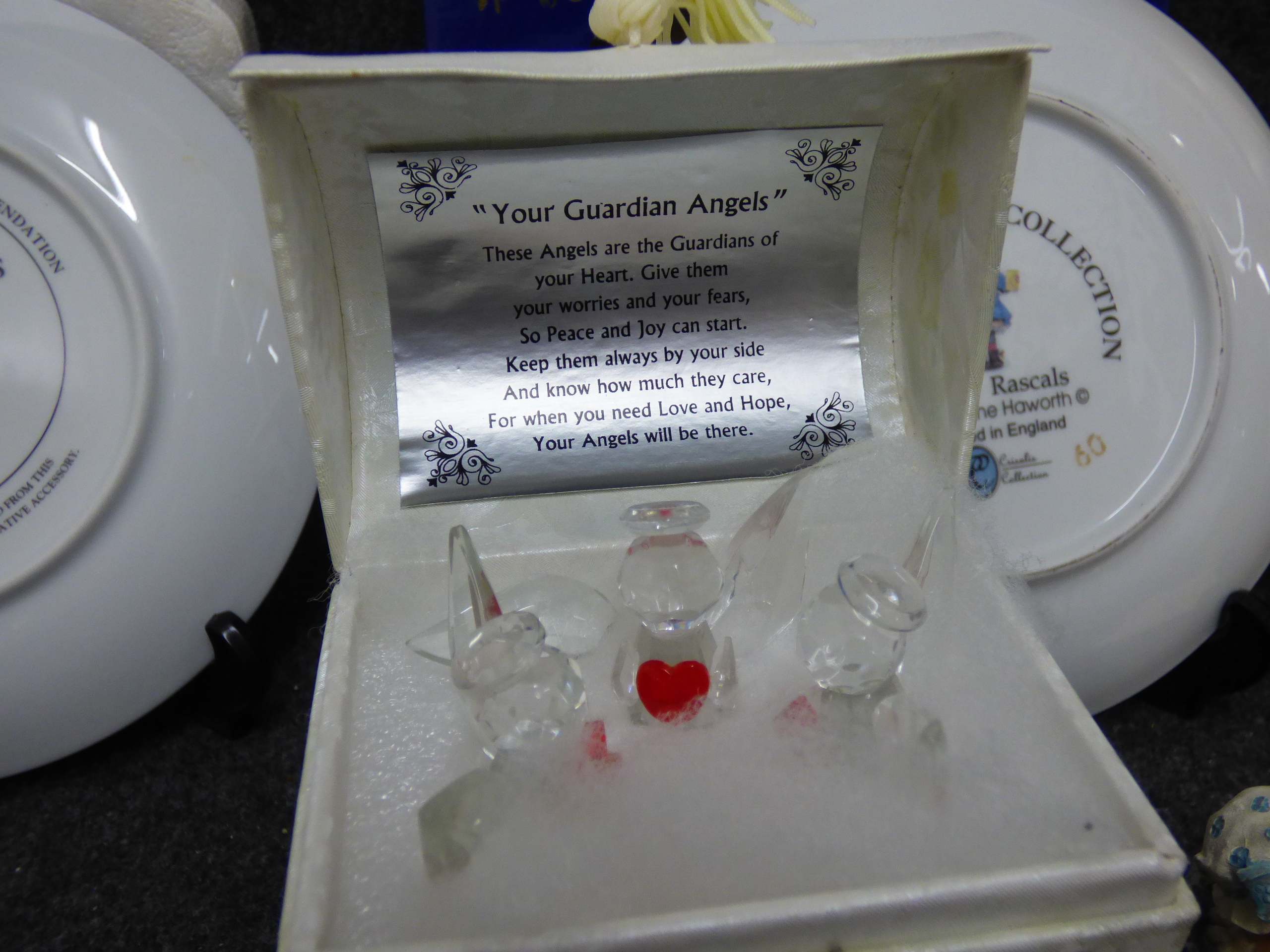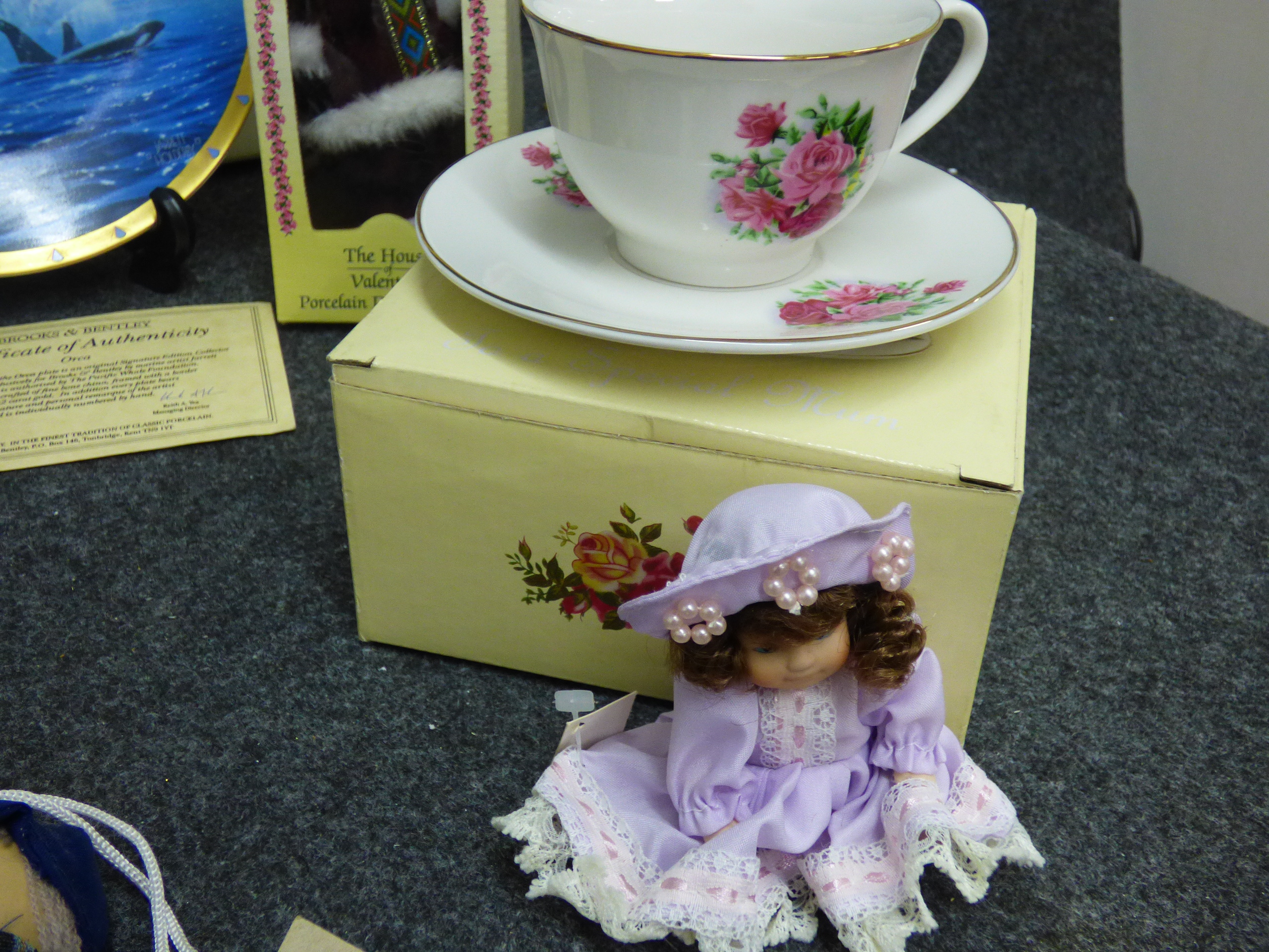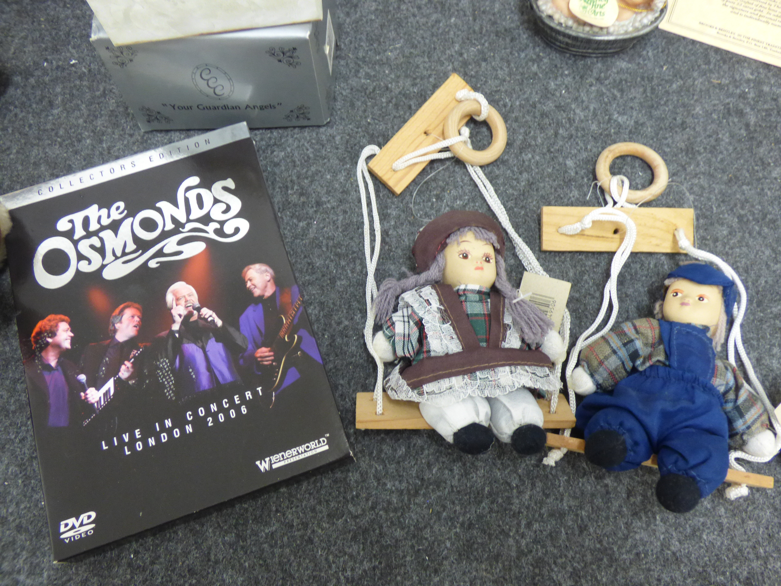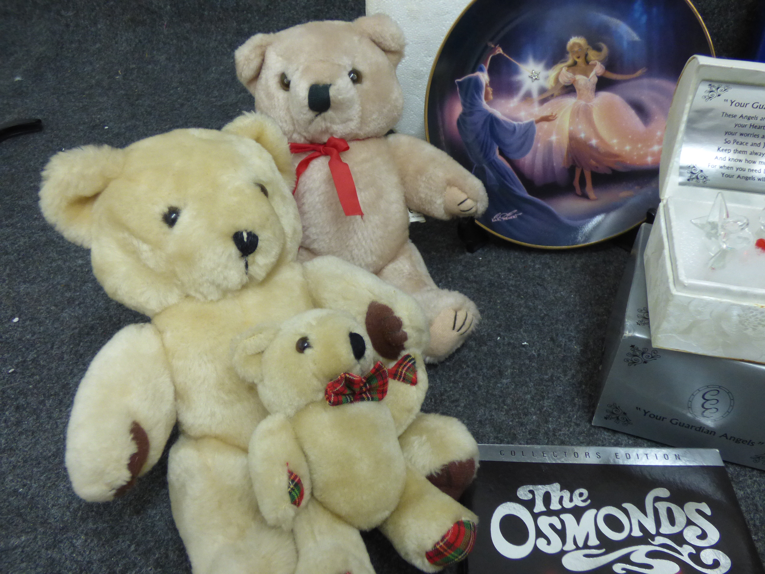 A collection of collectibles including plush teddy bears, decorative porcelain plates by Franklin Mint and Brooks & Bentley, a The Osmonds concert DVD, crystal figurines, and various dolls from Regency Fine Arts, The Leonardo Collection, and The House of Valentina.