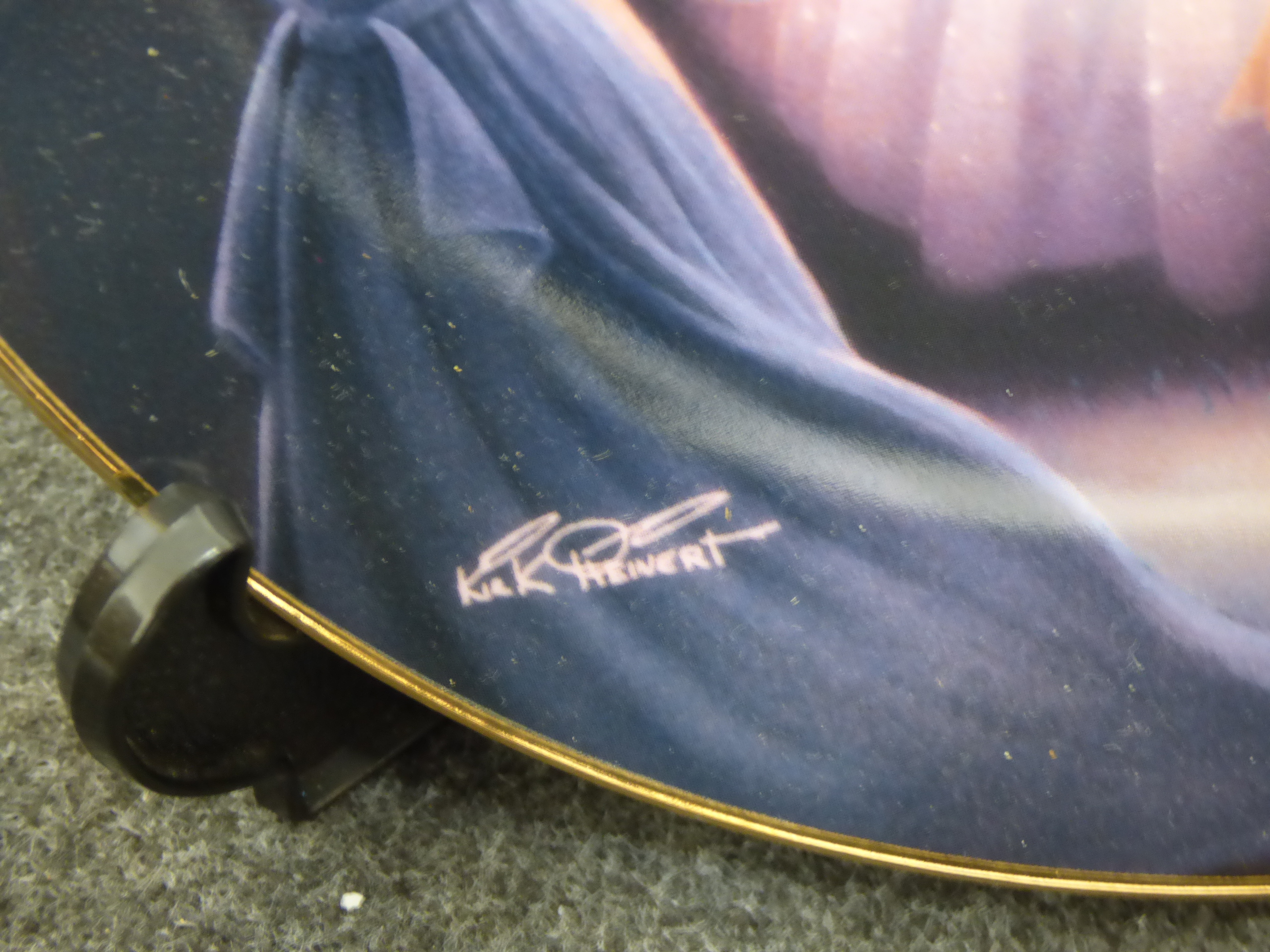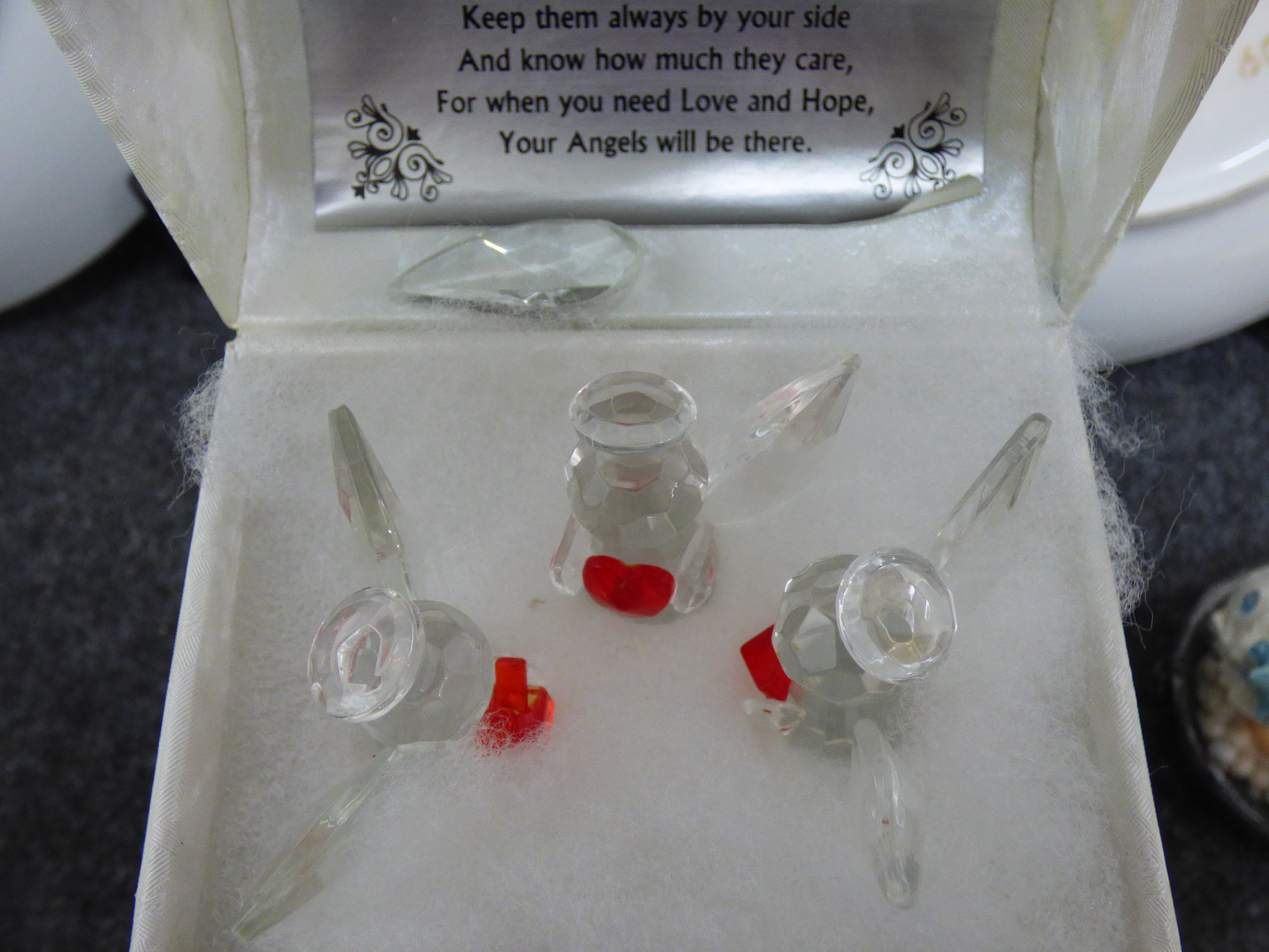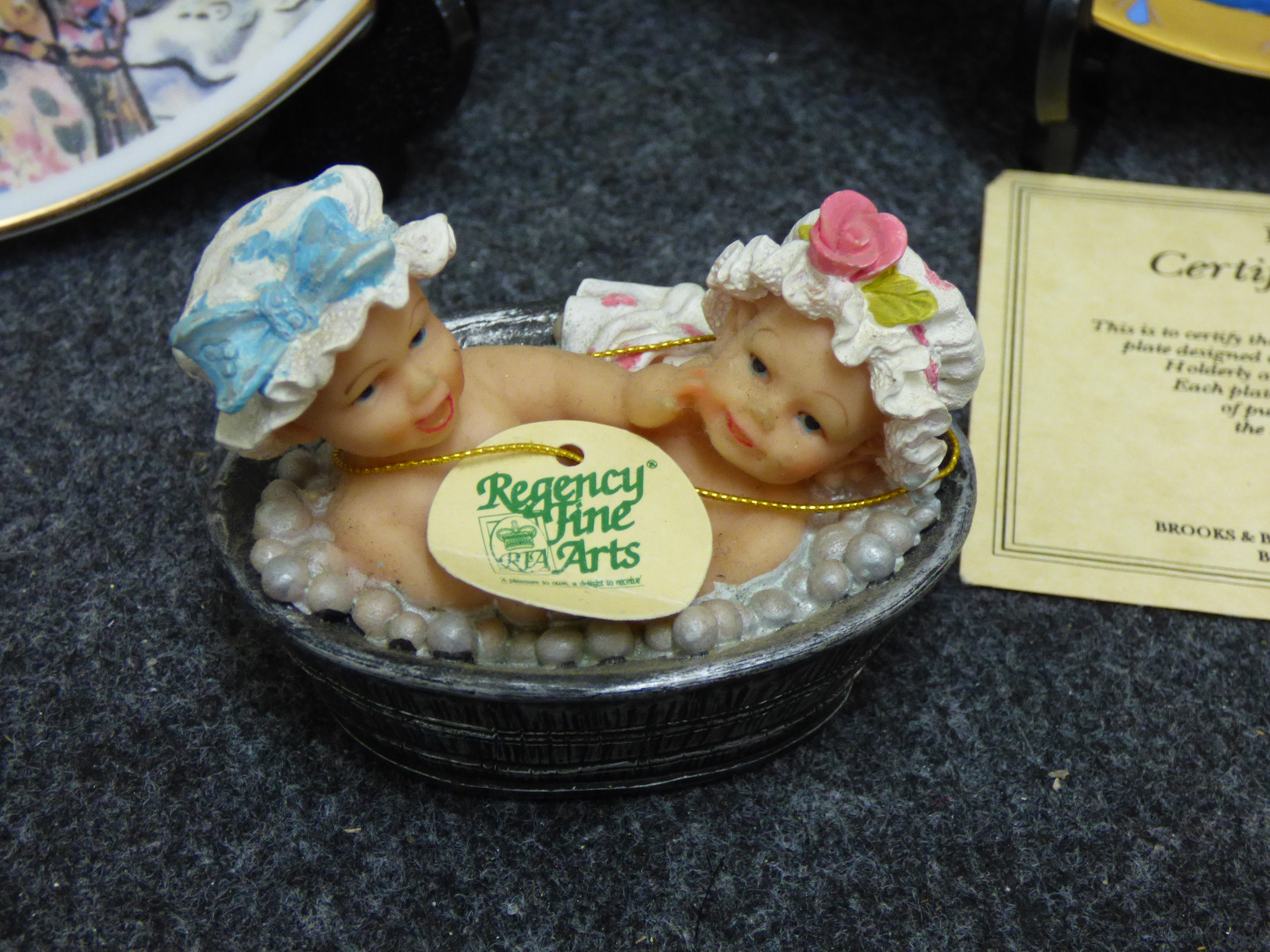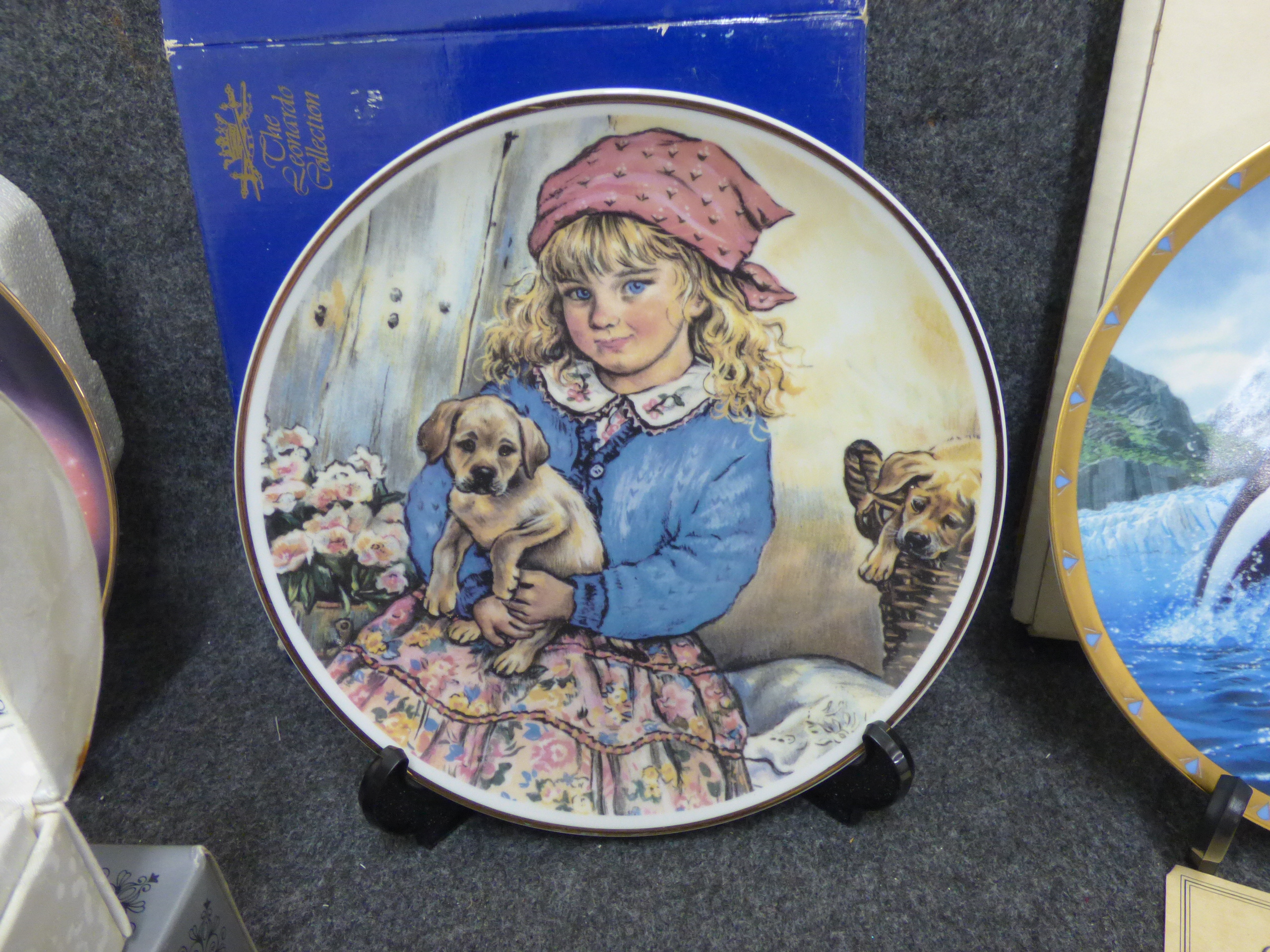 A collection of collectibles including plush teddy bears, decorative porcelain plates by Franklin Mint and Brooks & Bentley, a The Osmonds concert DVD, crystal figurines, and various dolls from Regency Fine Arts, The Leonardo Collection, and The House of Valentina.