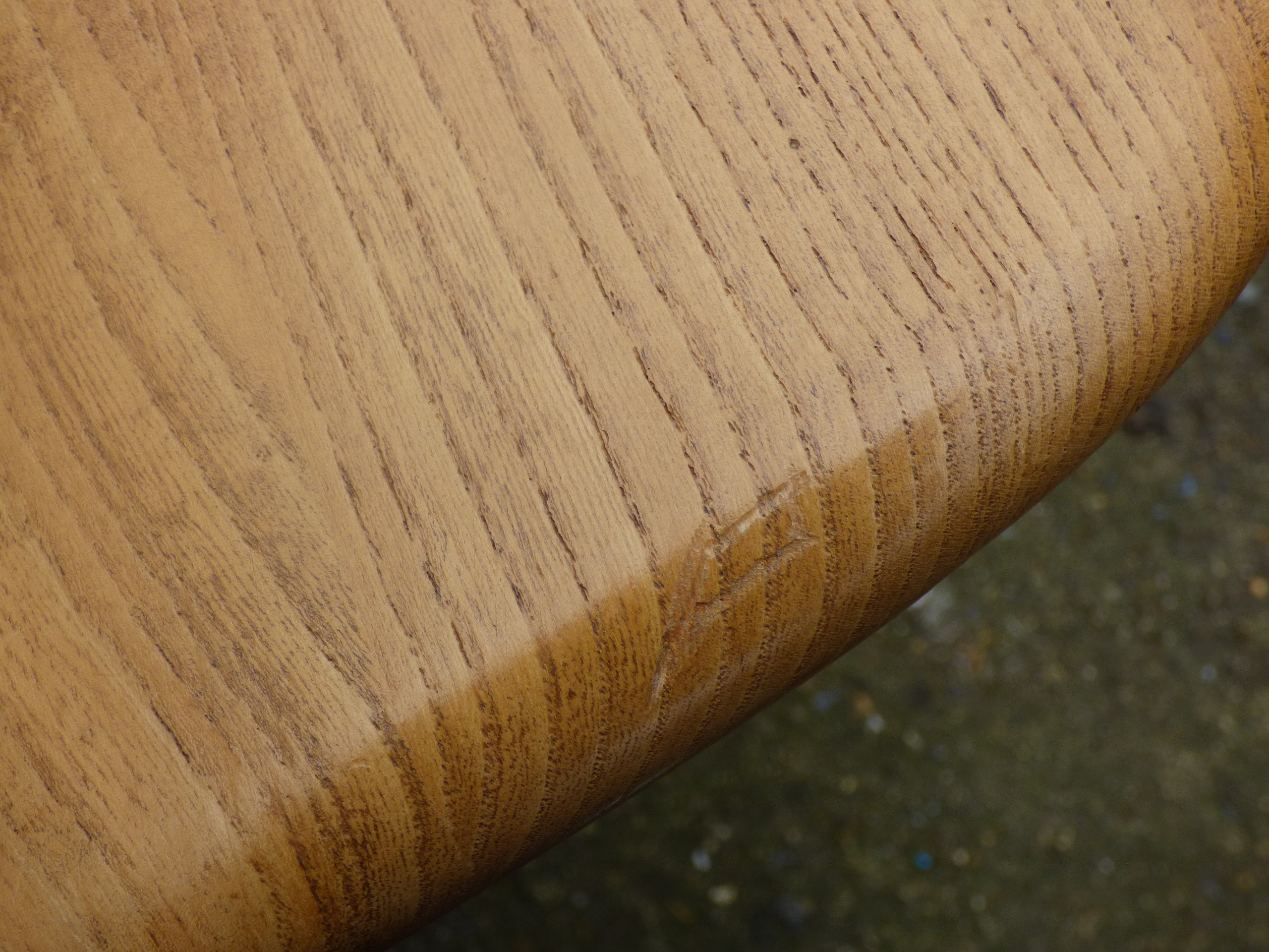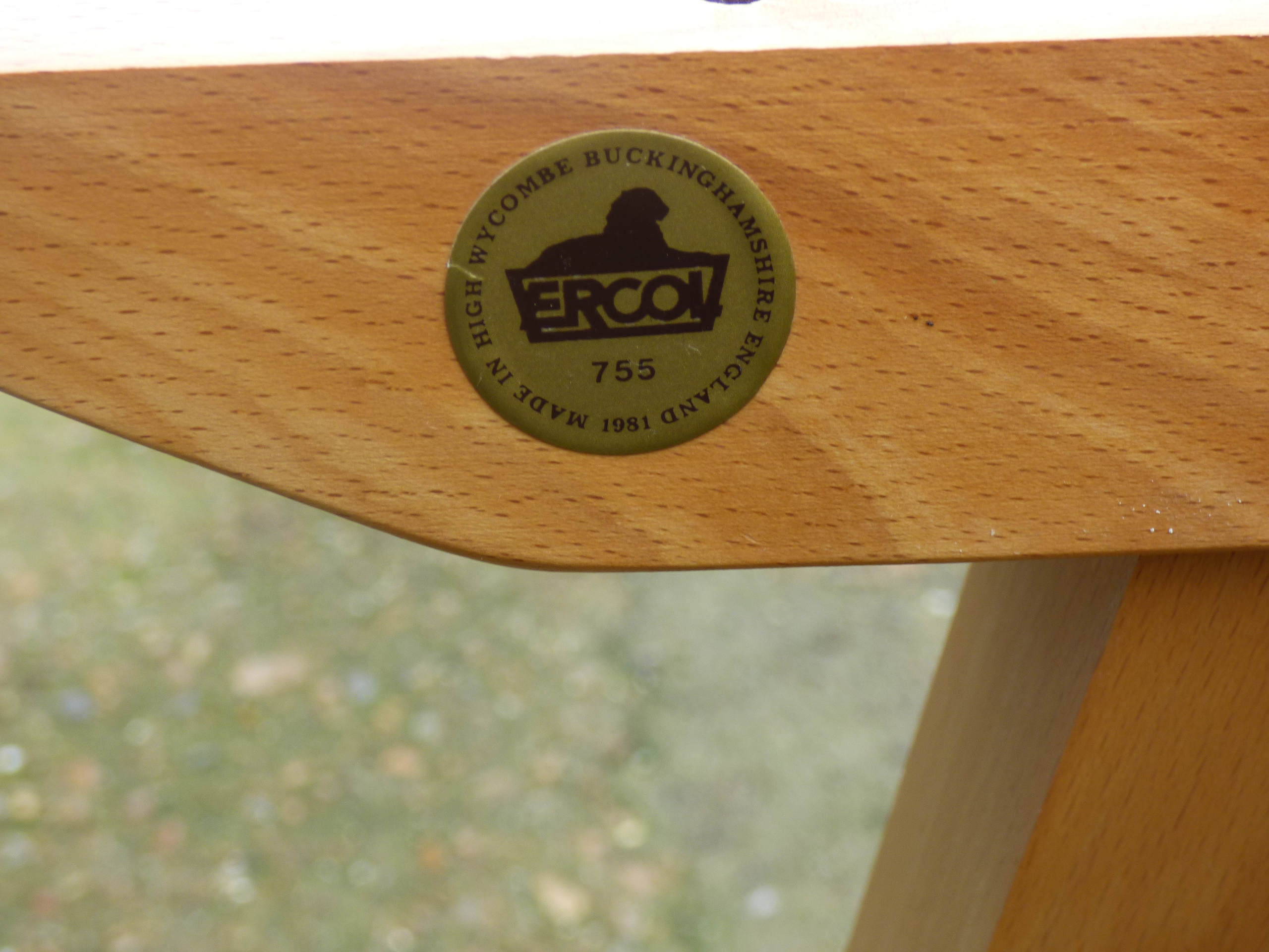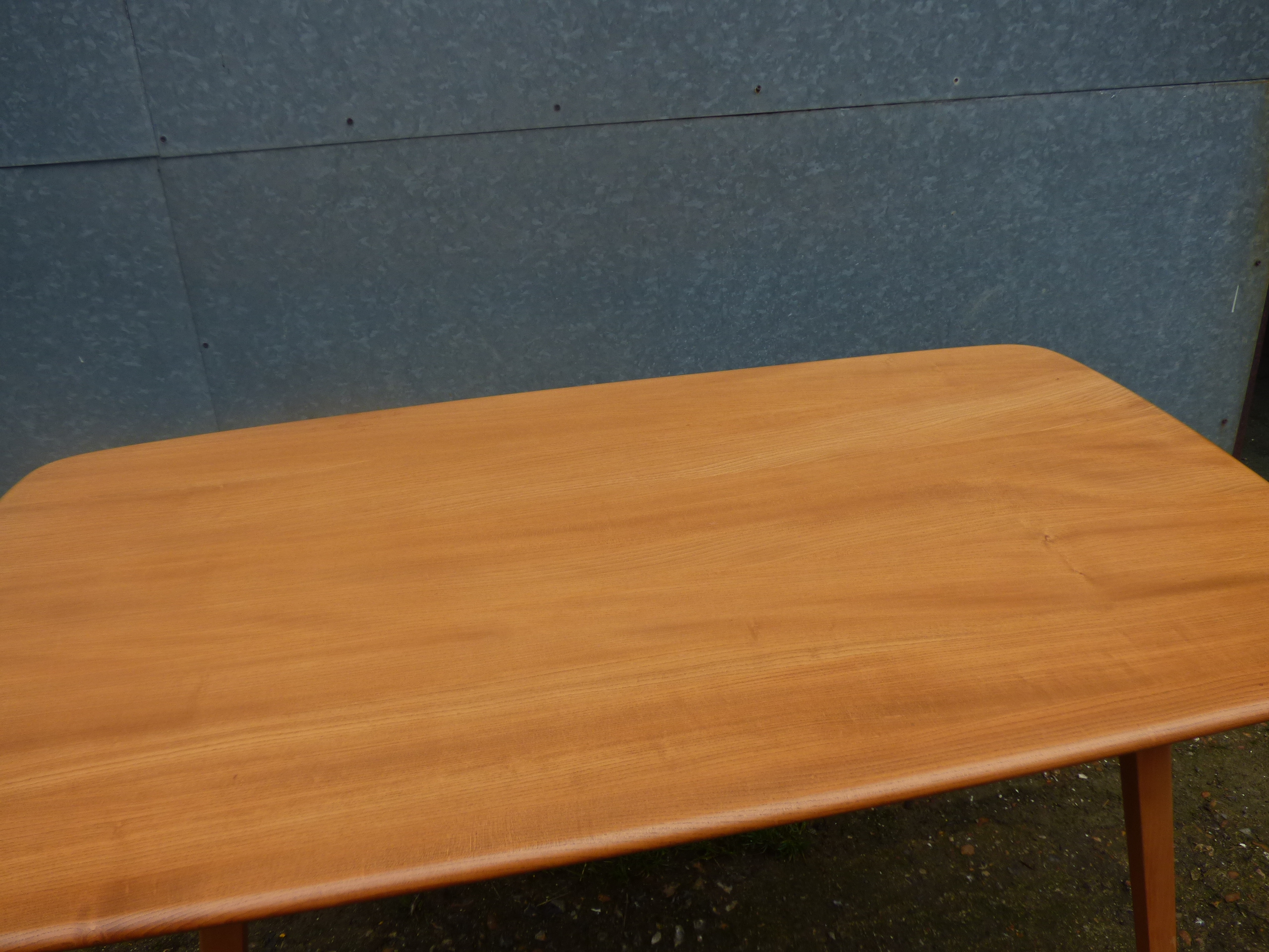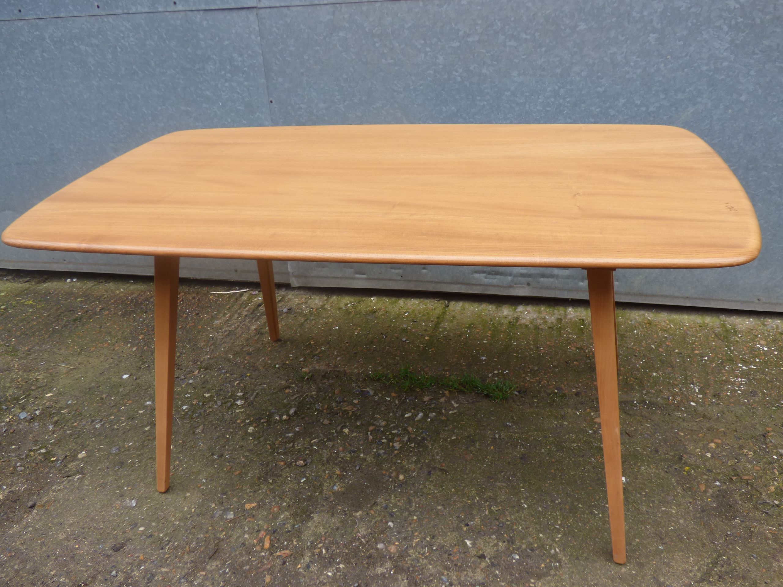 A blonde dining table featuring a rectangular top with rounded corners and tapered legs, bearing an Ercol maker’s label dated 1981. 153x84cm 72cm tall