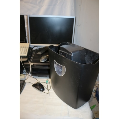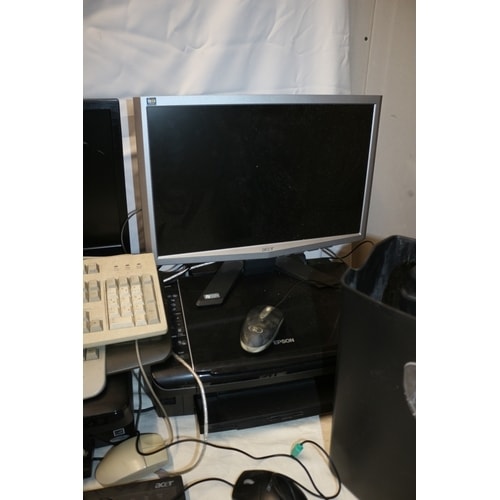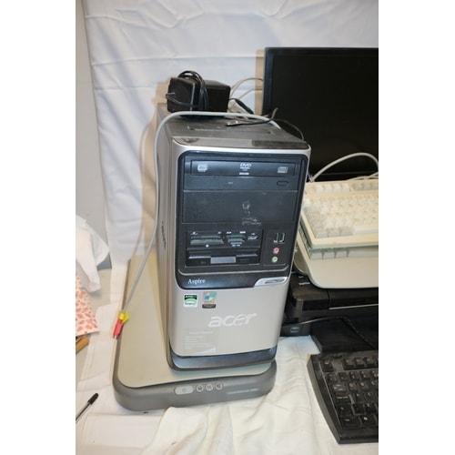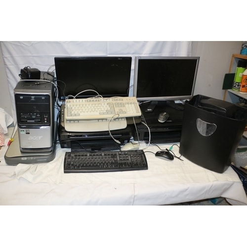 A silver and black Acer Aspire desktop computer tower (with Intel Inside, NVIDIA, and Windows XP logos) atop a grey flatbed scanner, two black monitors (one Acer branded), three keyboards (two beige, one black), multiple mice, a black Epson printer, and a black paper shredder. All Untested