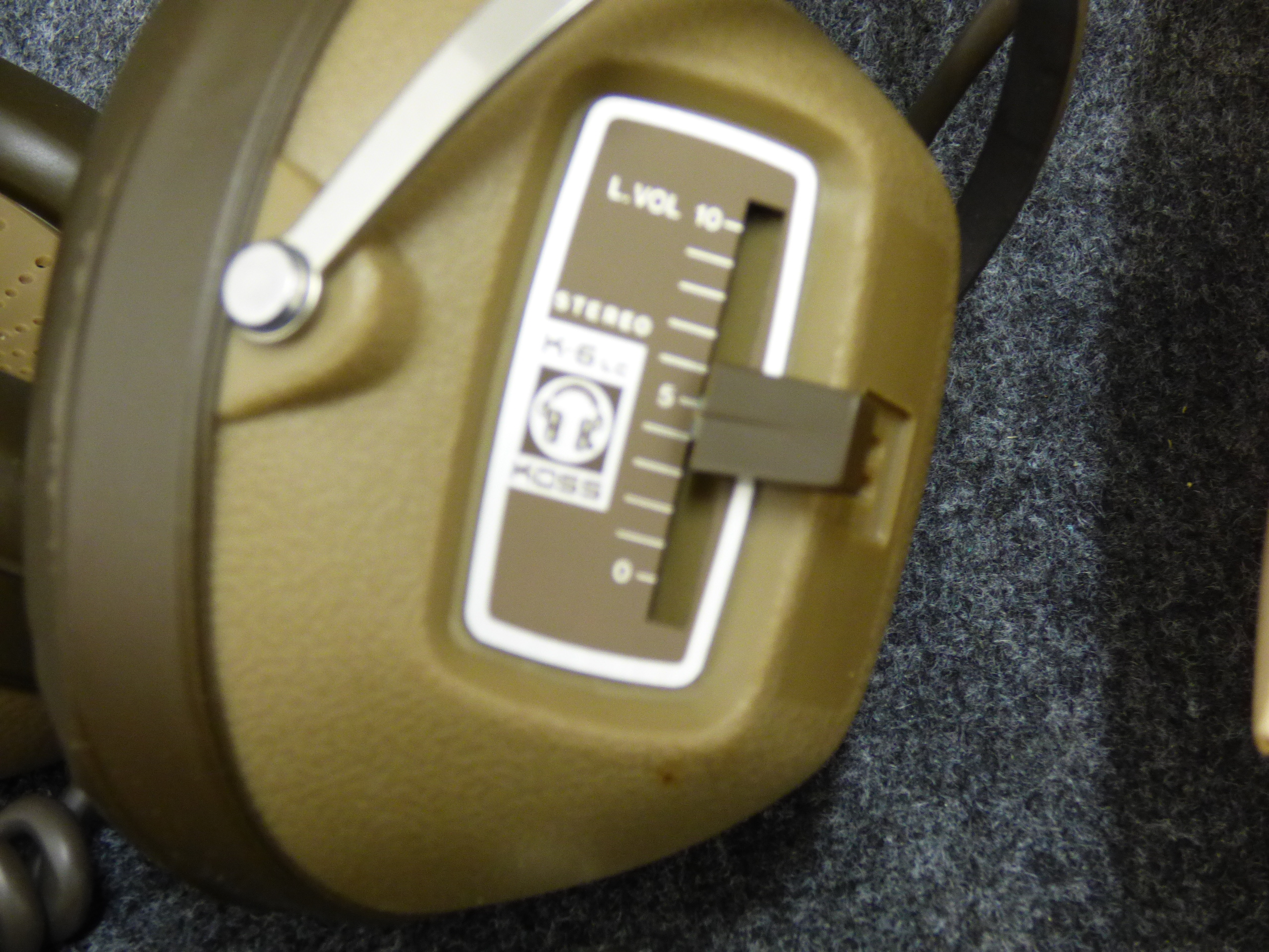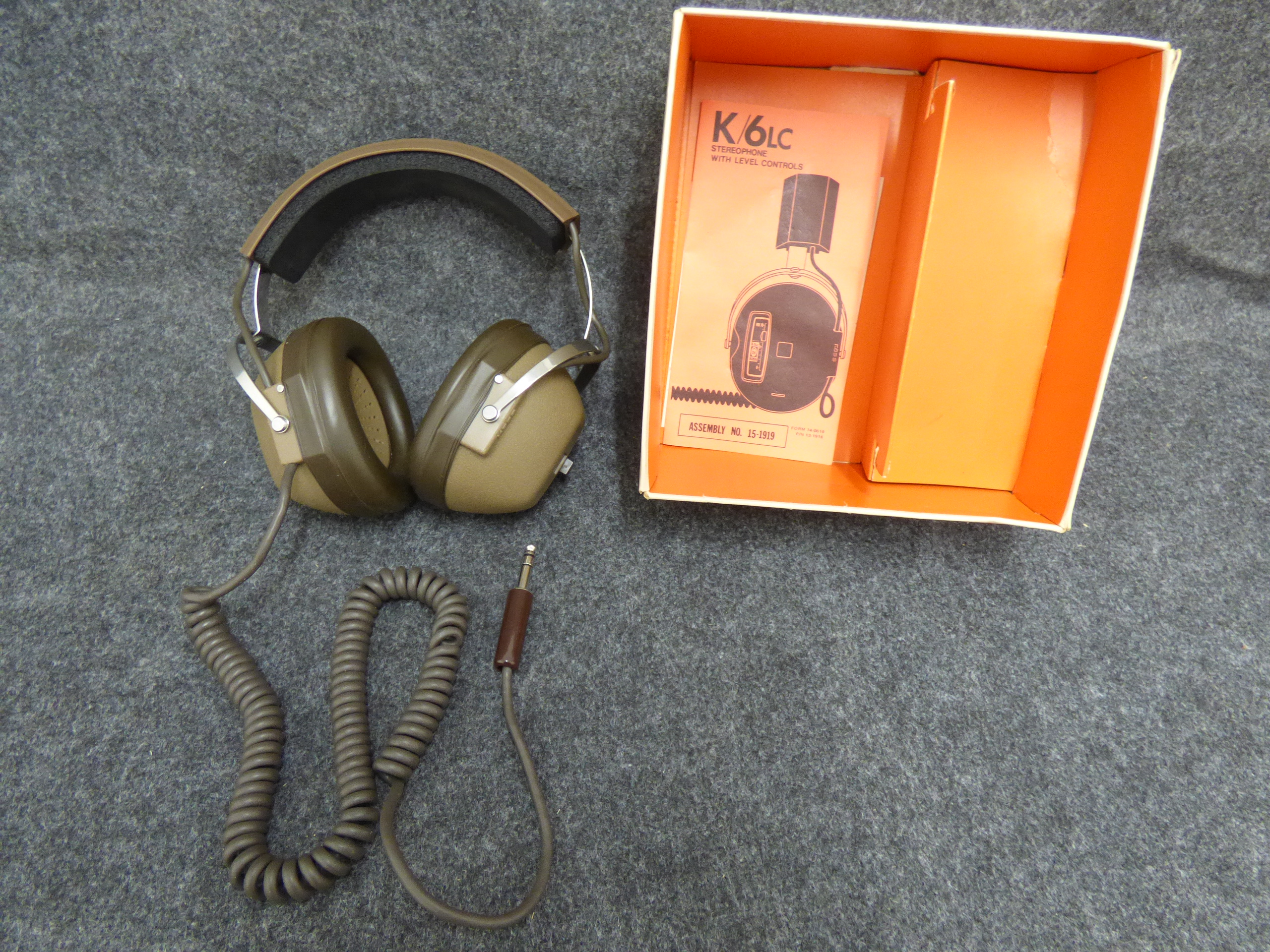 A pair of brown Koss K/6LC stereophone headphones featuring individual level controls, accompanied by the original orange and white box and instruction manual.