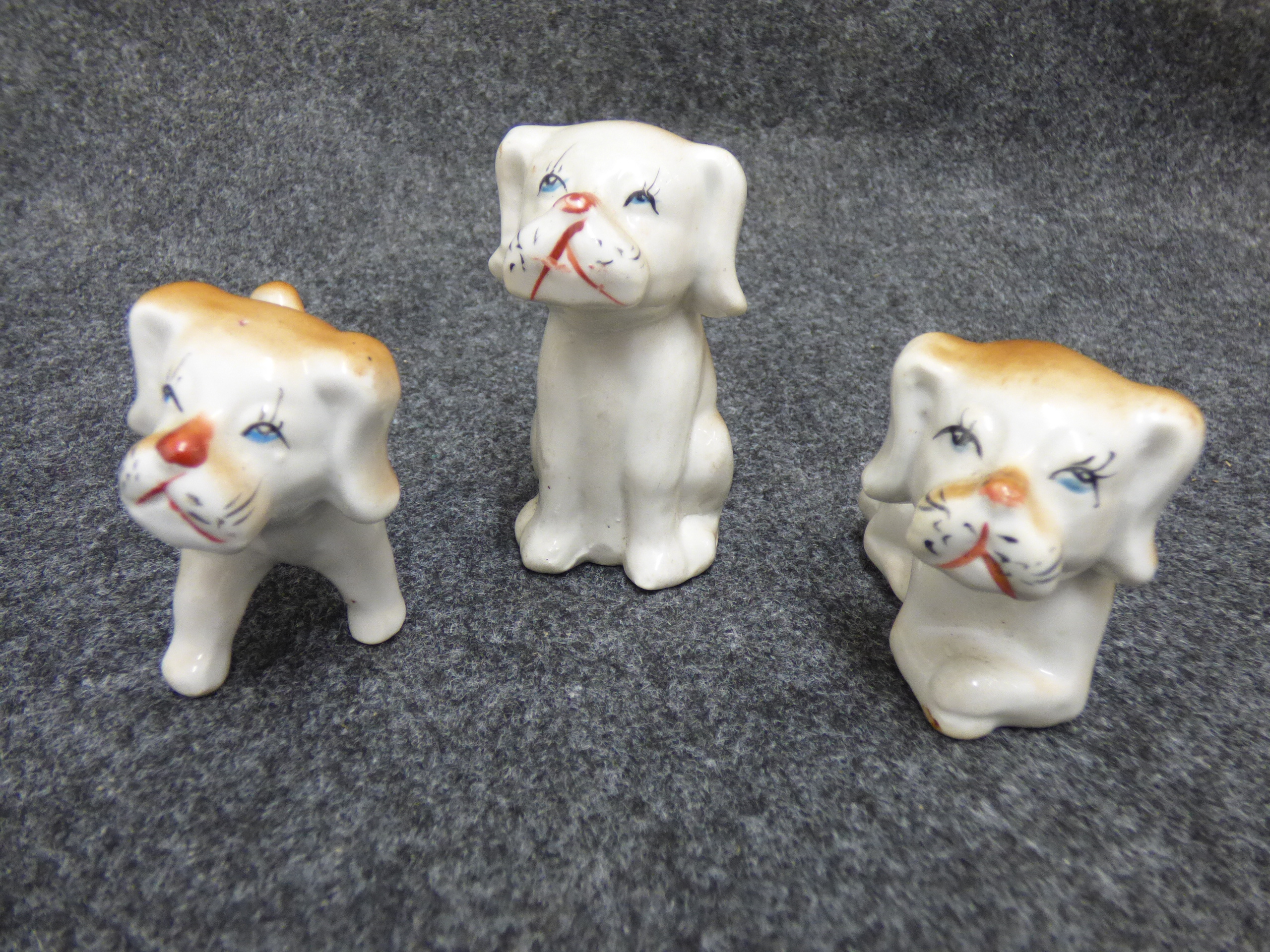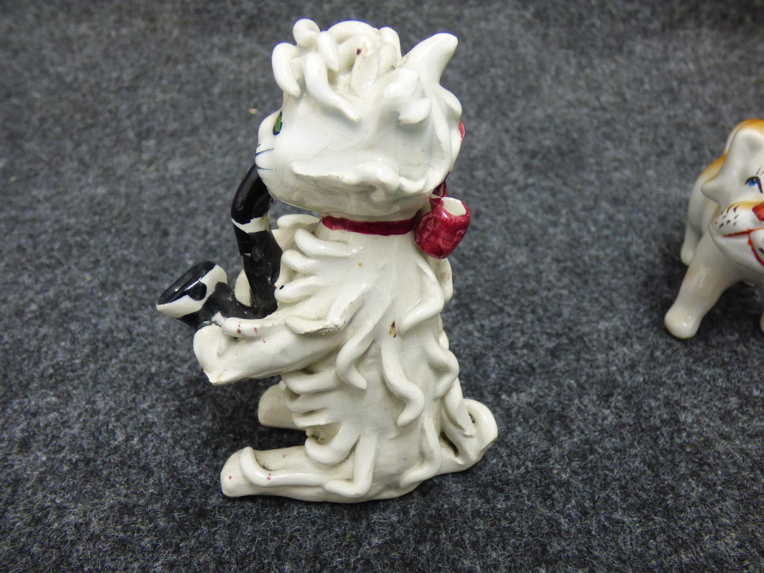 A collection of ceramic figurines including a white spaghetti cat playing a black instrument and three white and tan Japanese porcelain dogs.