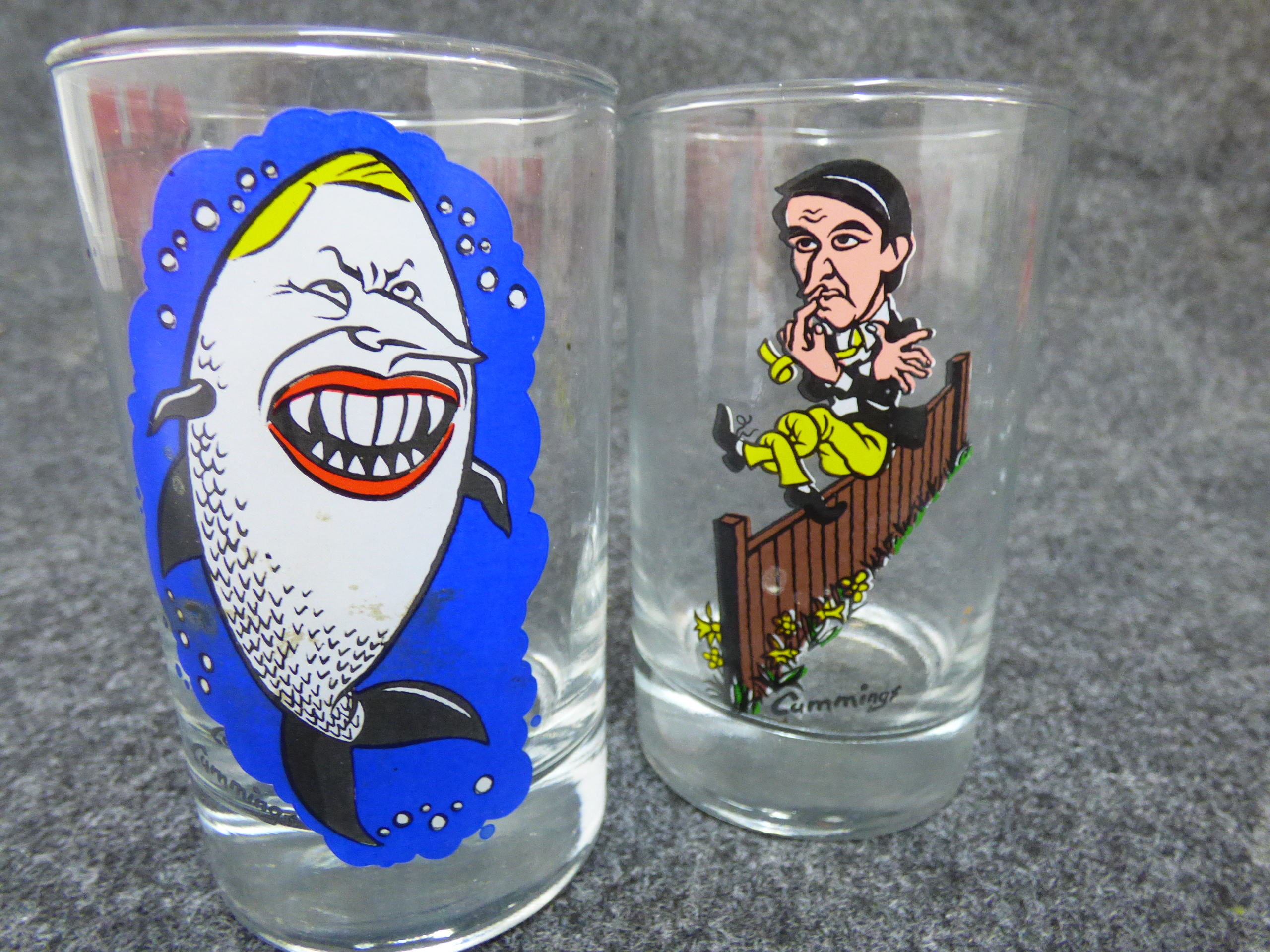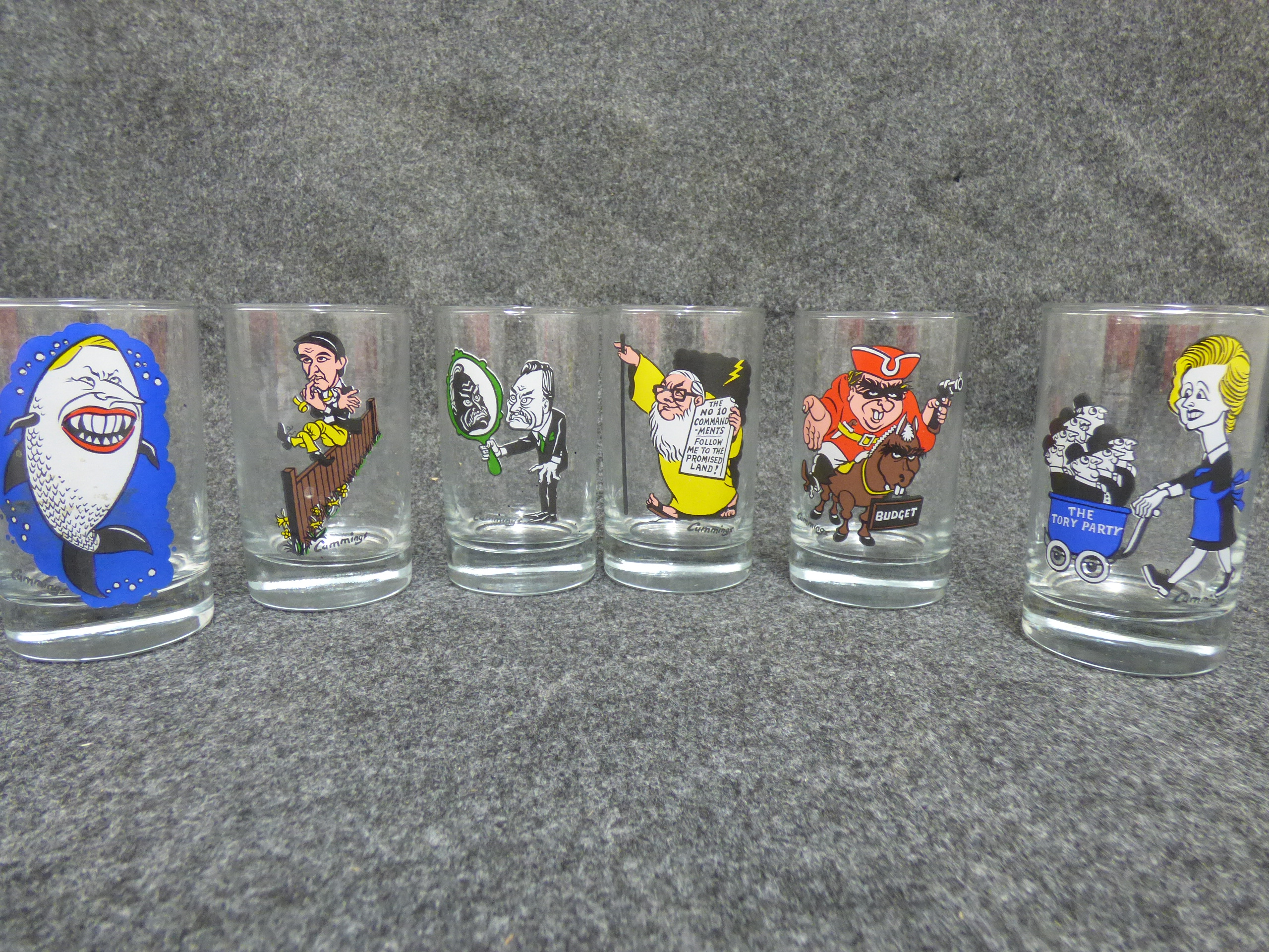 A collection of clear glass tumblers featuring various multi-coloured political caricatures signed Cummings with text including The Tory Party and Budget. 11cm tall