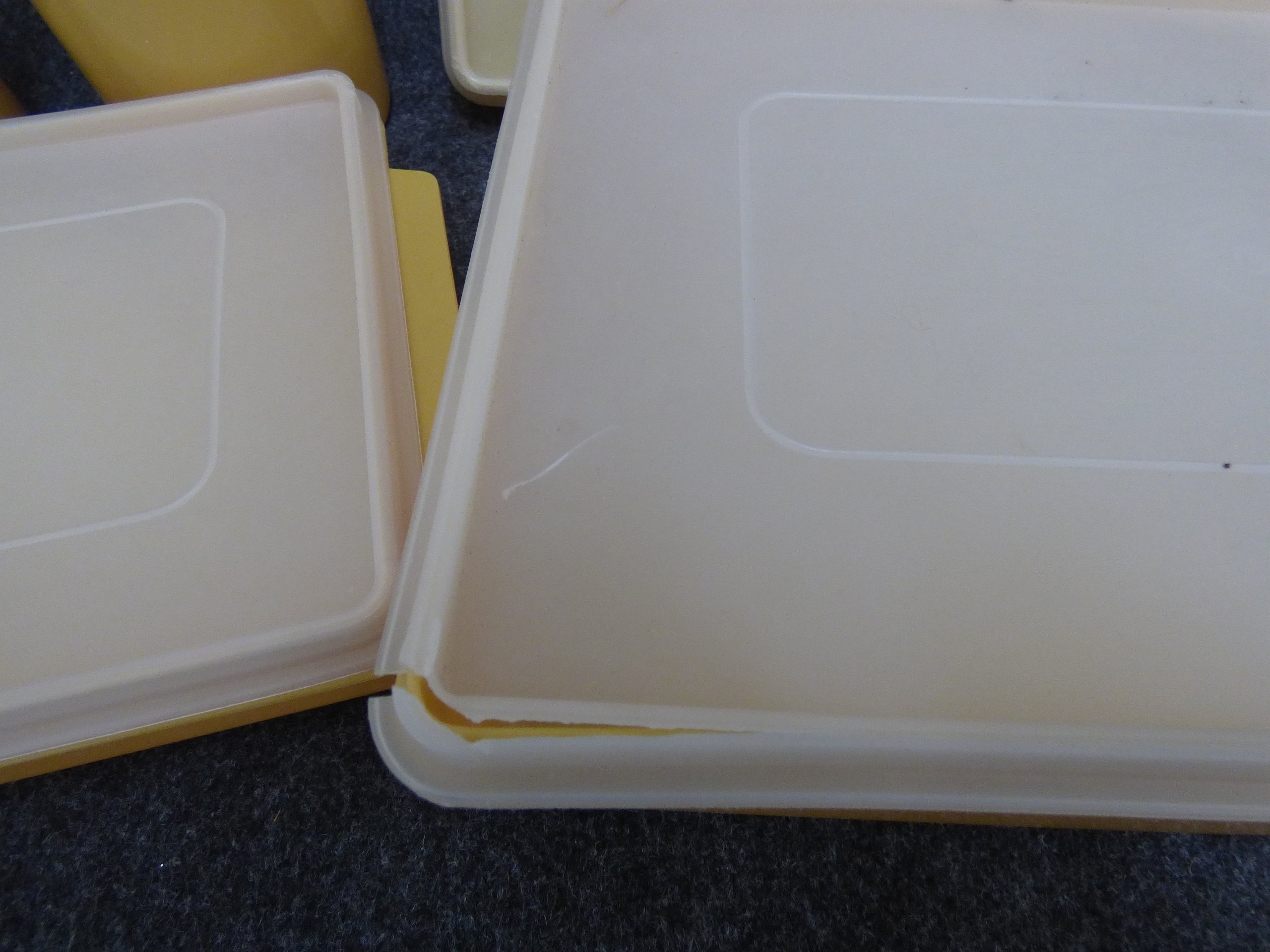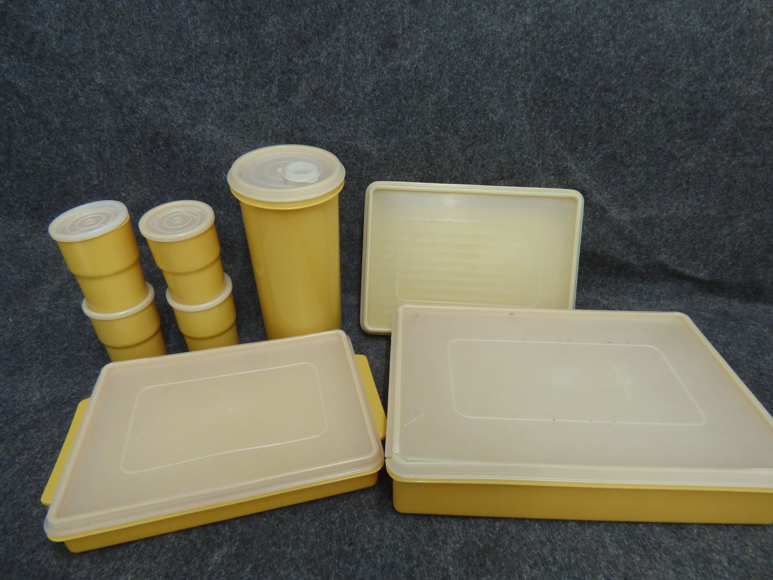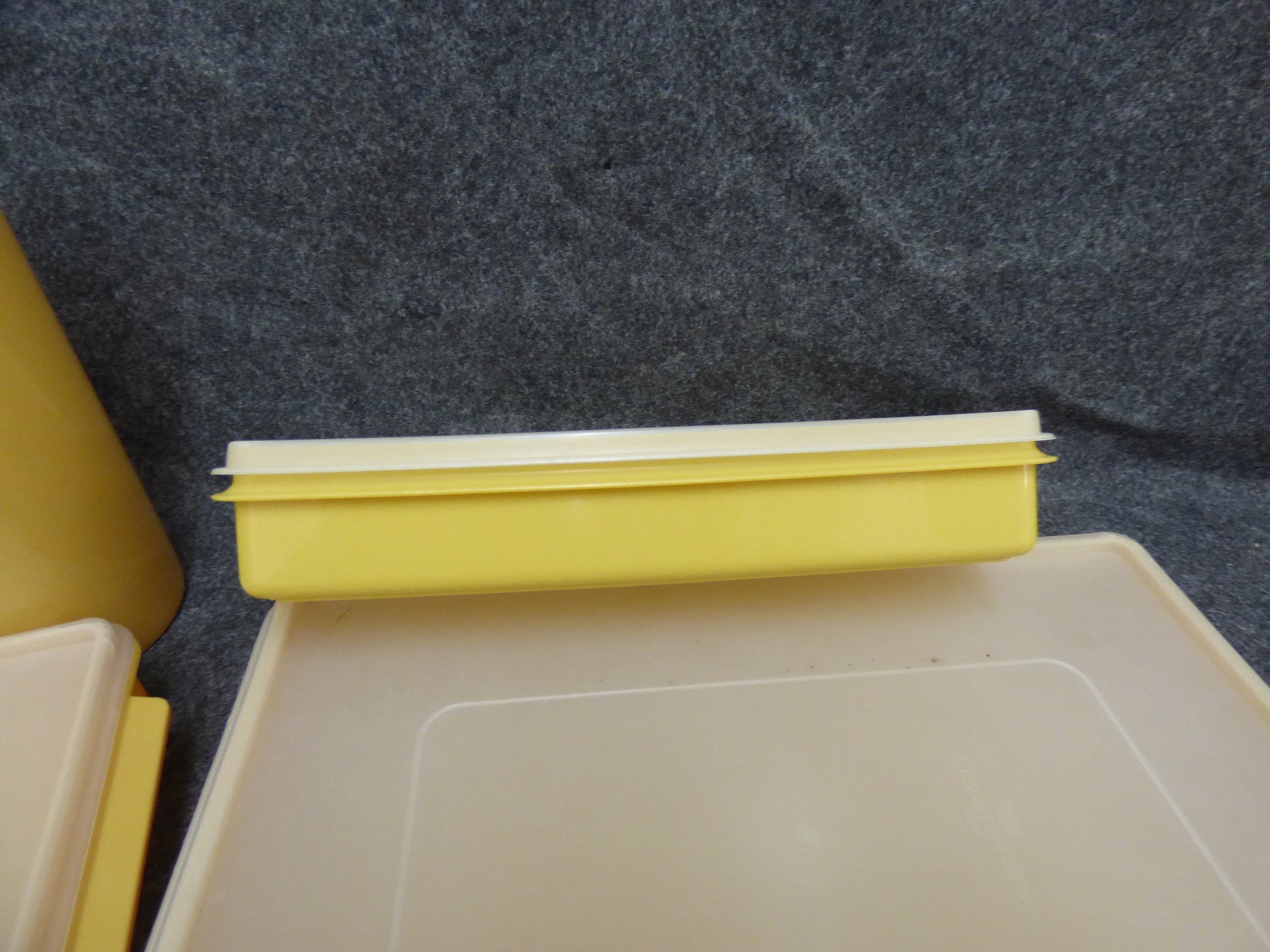 A collection of yellow plastic food storage containers including rectangular cake keepers, a tall canister, and small cups with translucent lids. Largest box 34.5×23.5cm