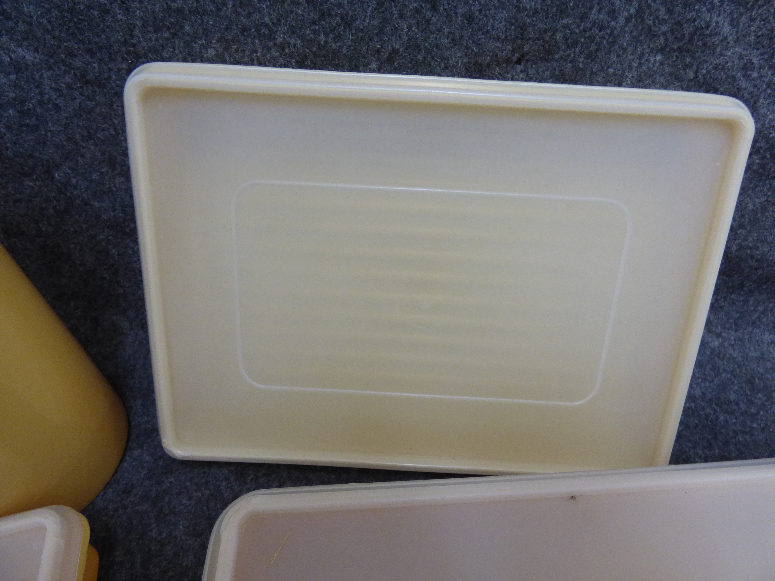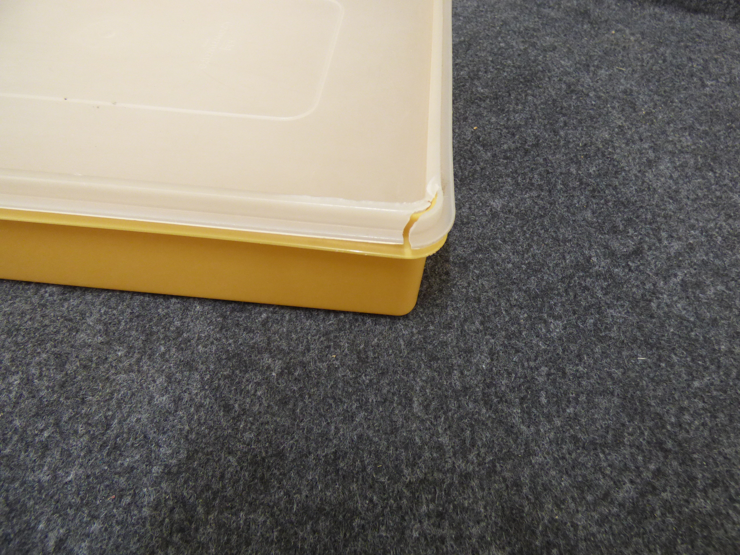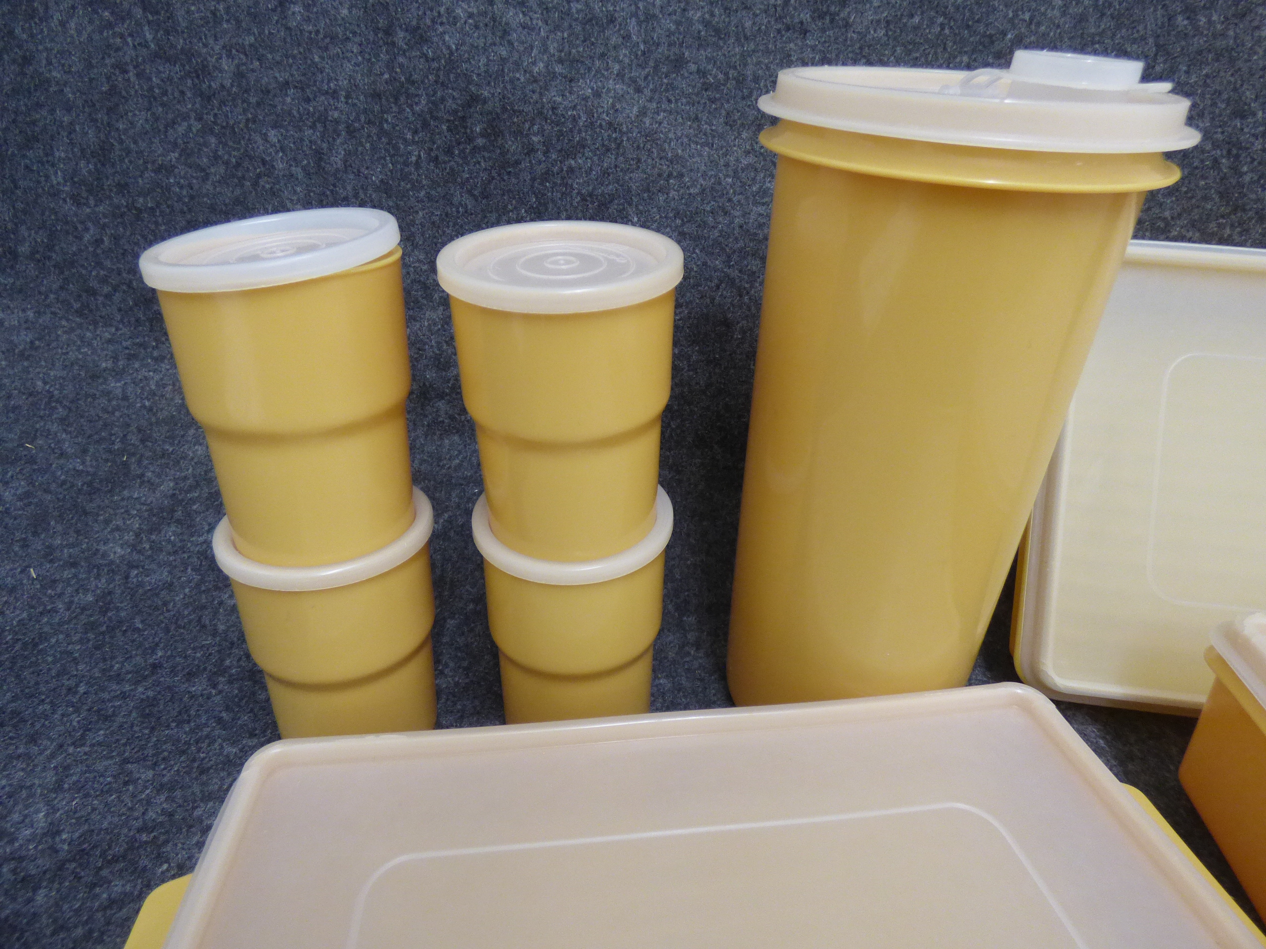 A collection of yellow plastic food storage containers including rectangular cake keepers, a tall canister, and small cups with translucent lids. Largest box 34.5×23.5cm