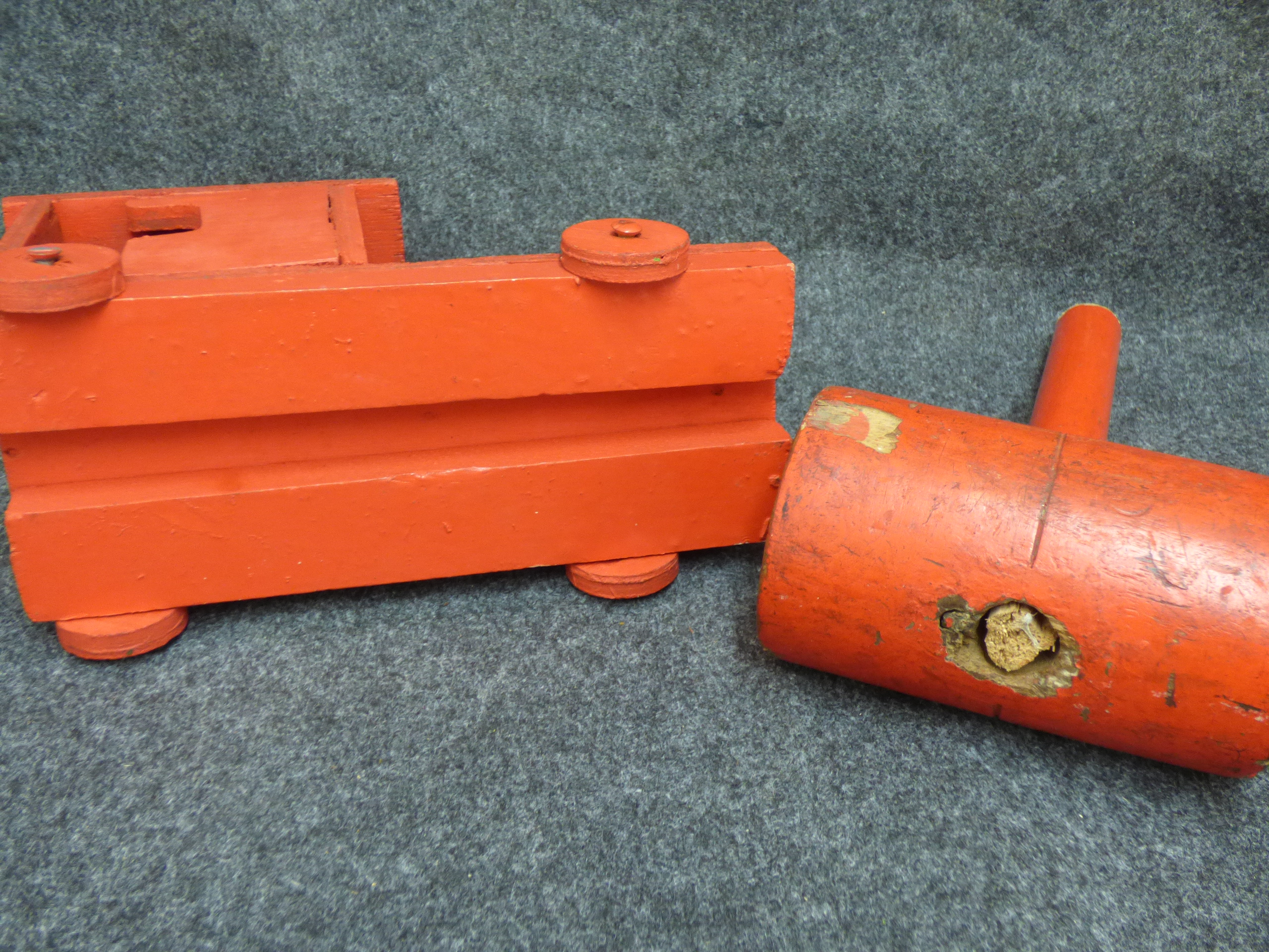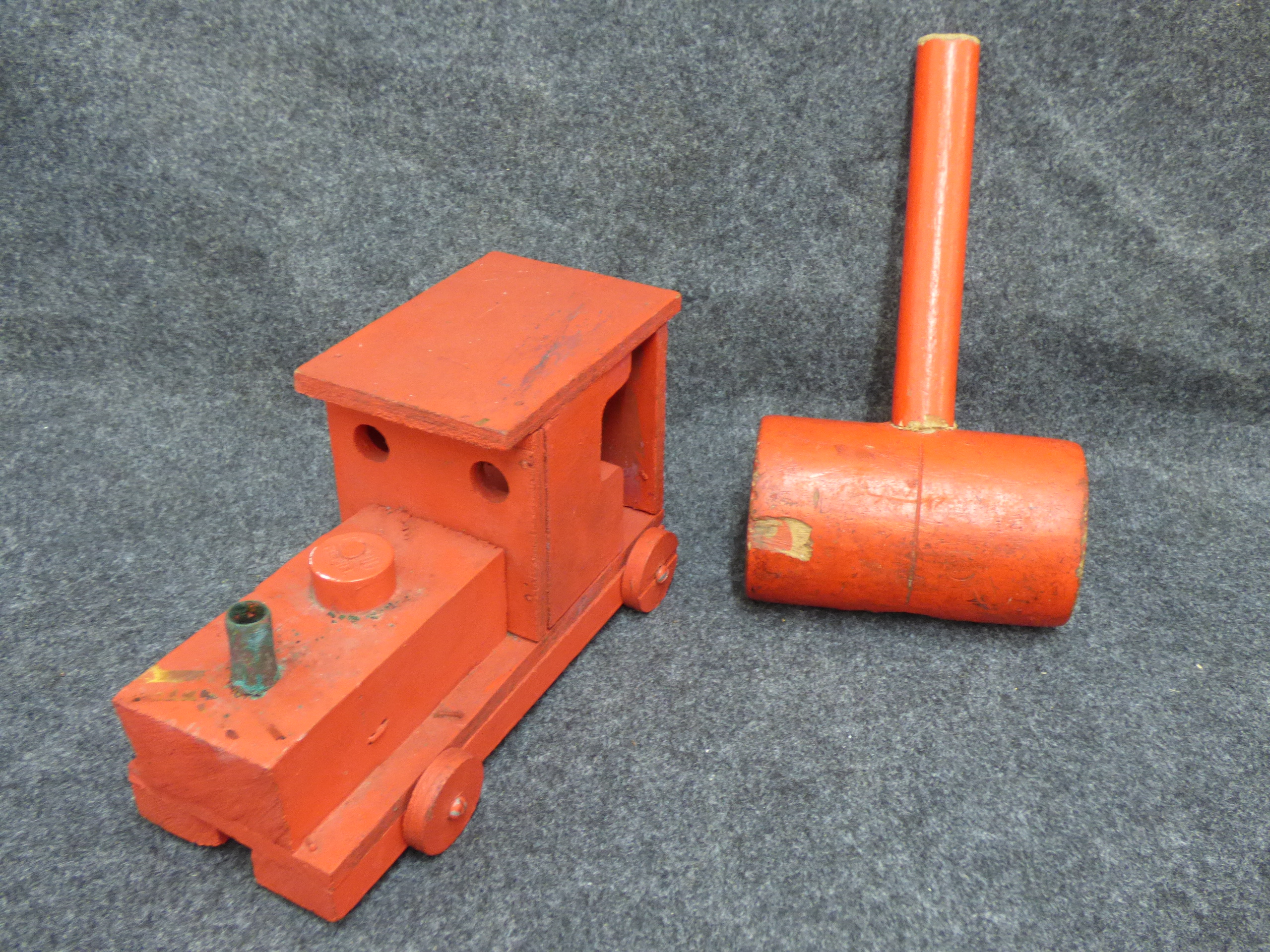 Two red wooden toys featuring a train engine and a matching mallet. Train 26cm long