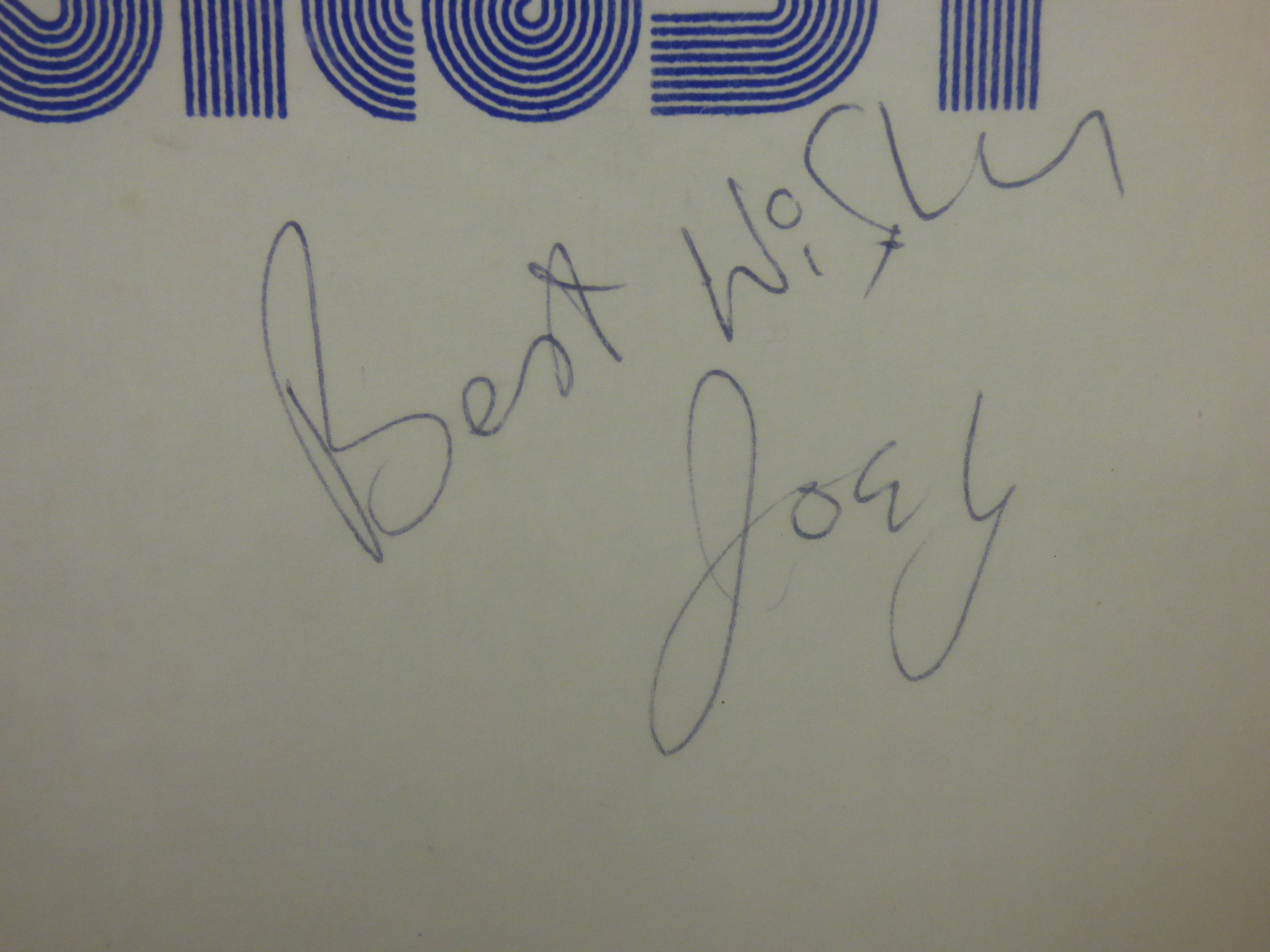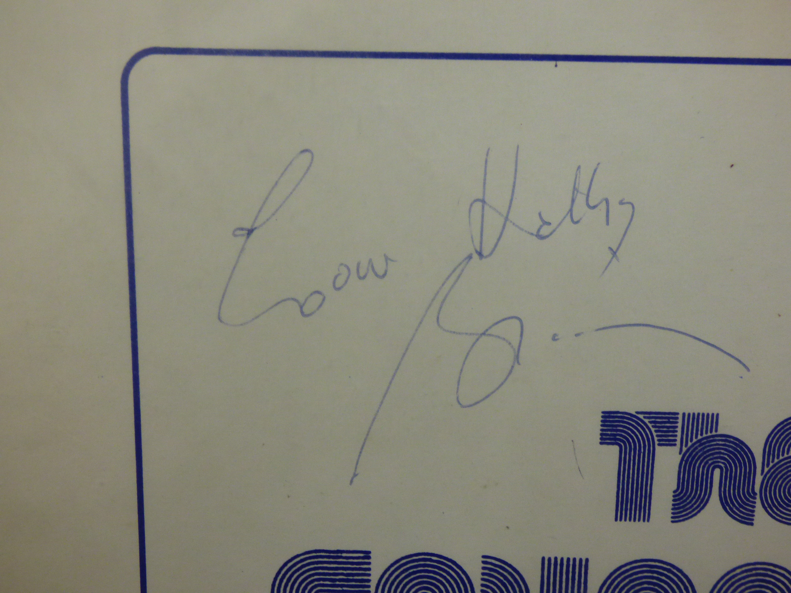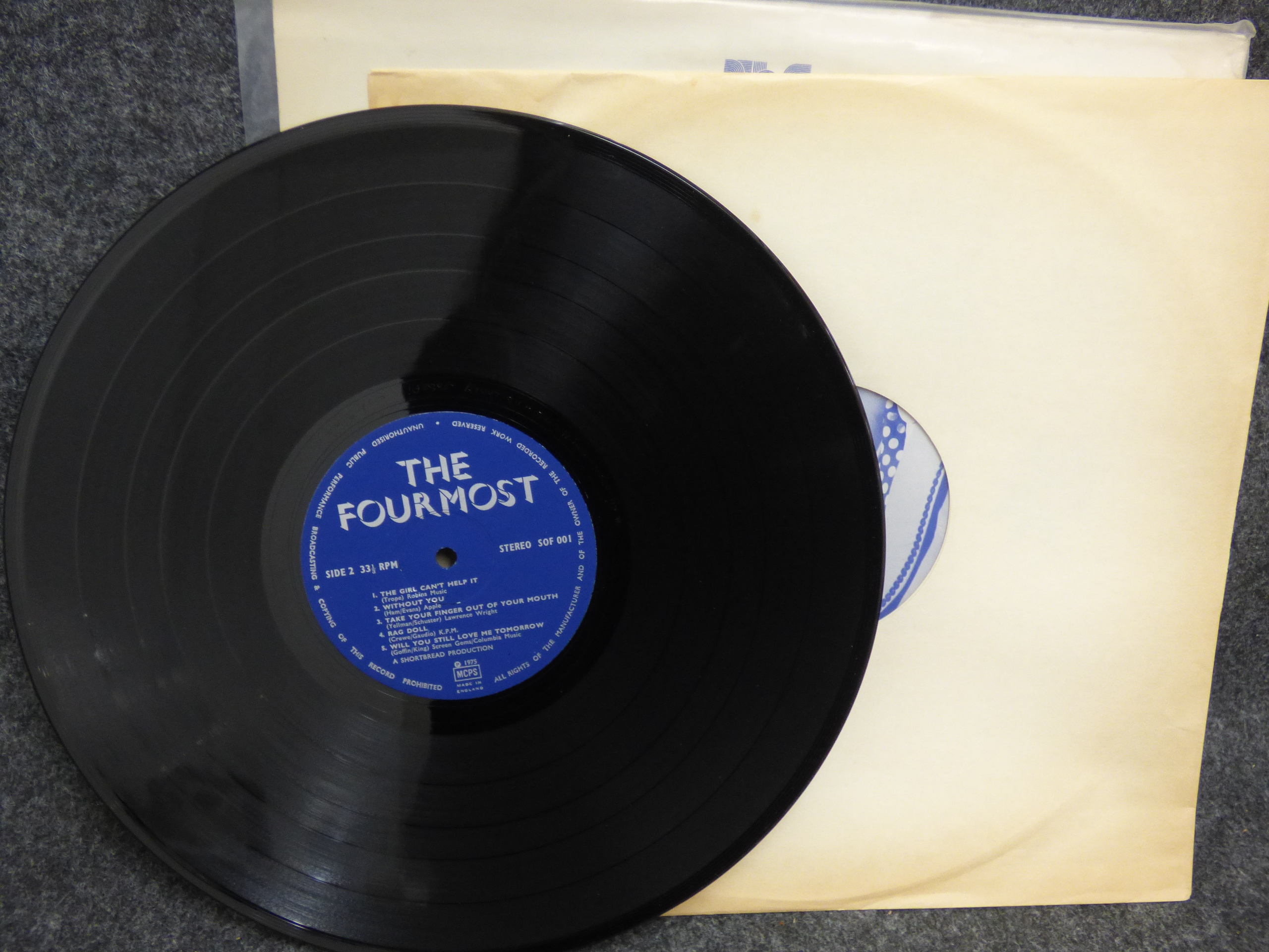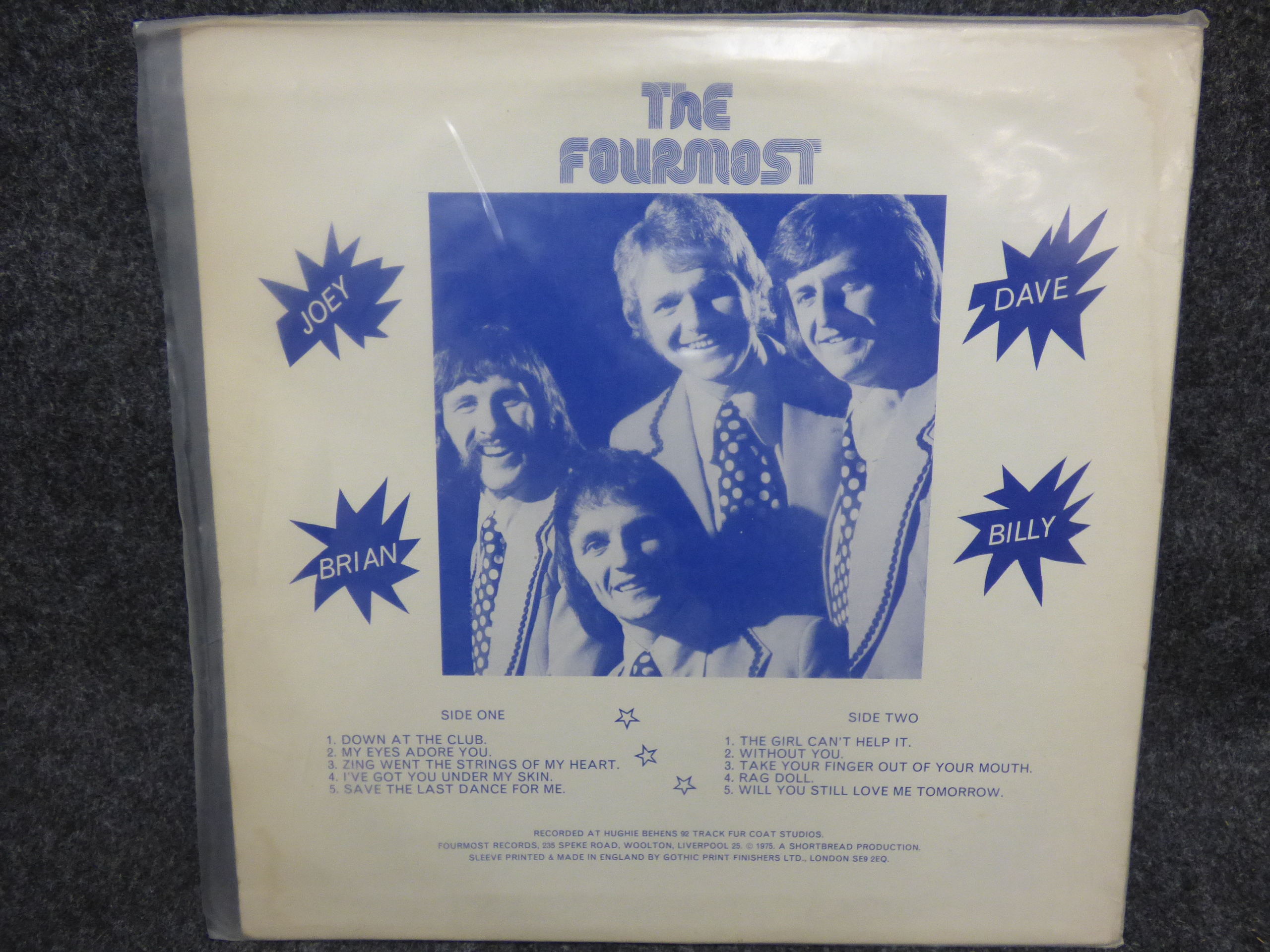 A 1975 vinyl record and sleeve for The Fourmost (Stereo SOF 001) in cream, black, and blue, featuring signatures on the front cover from Brian, Dave, Joey, and Billy.