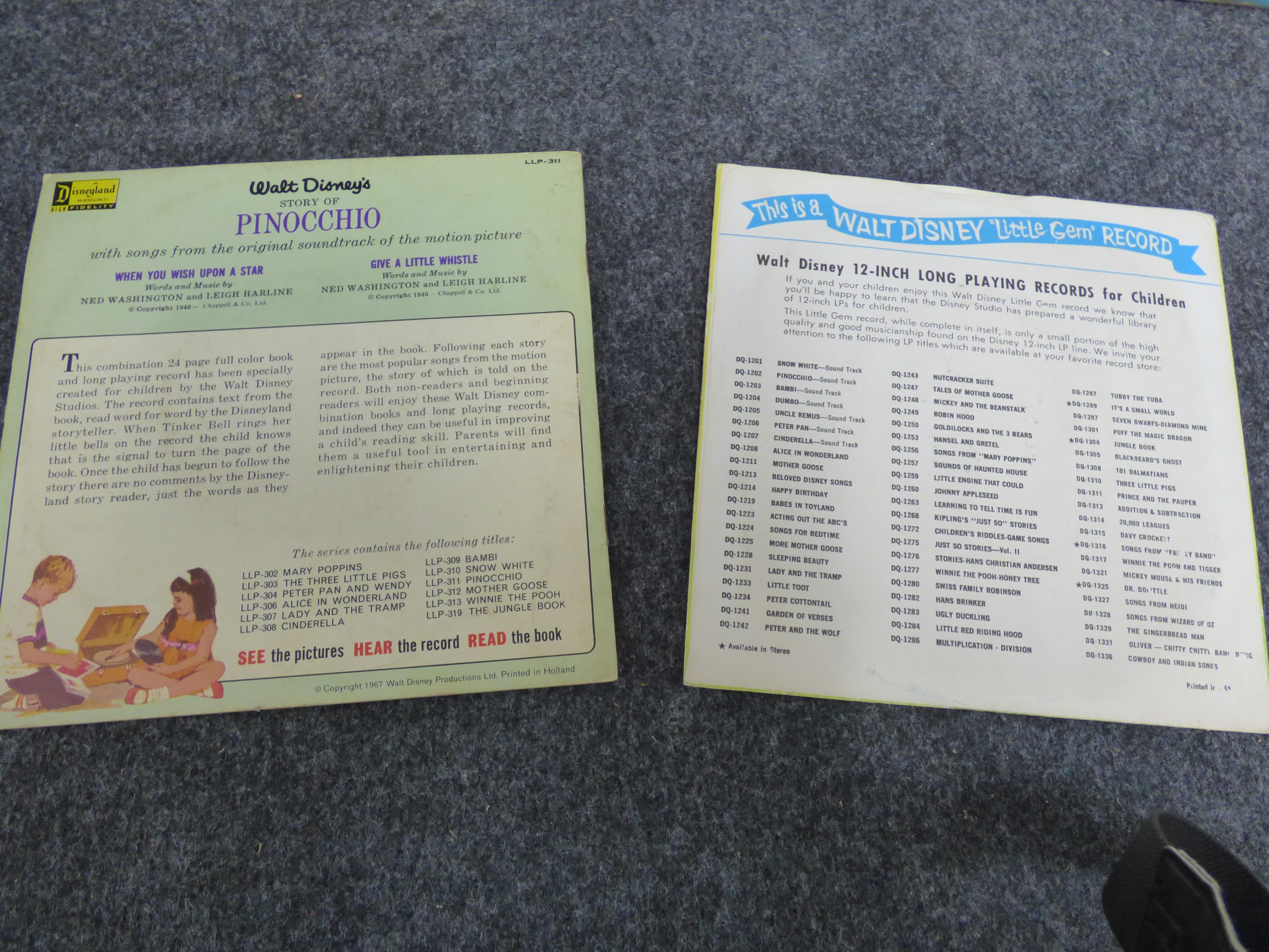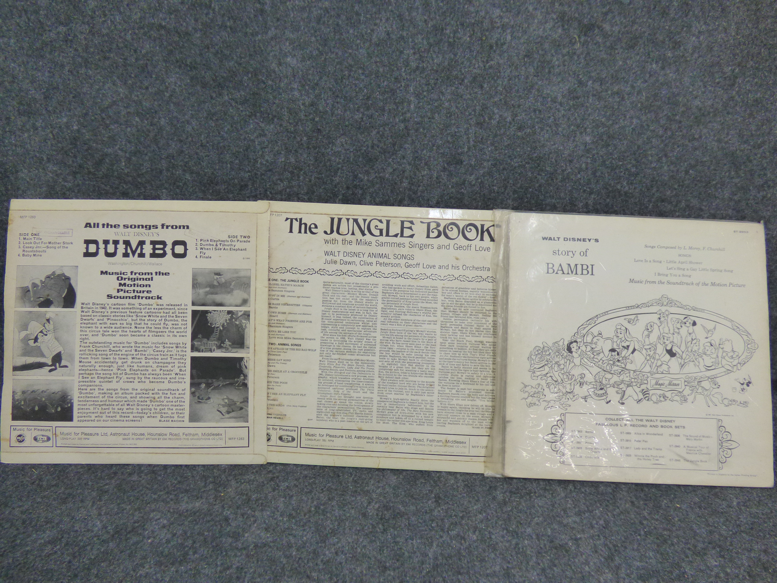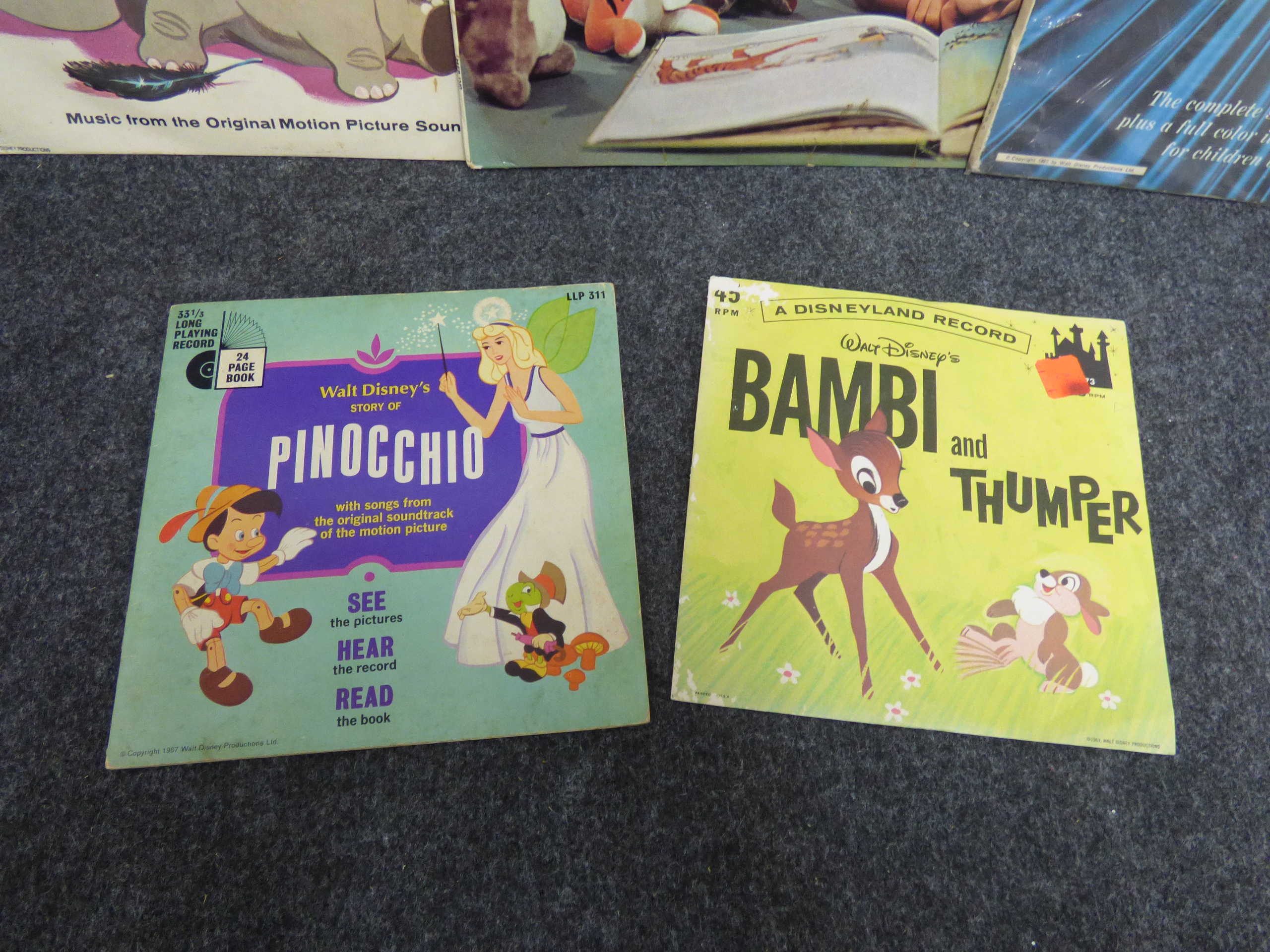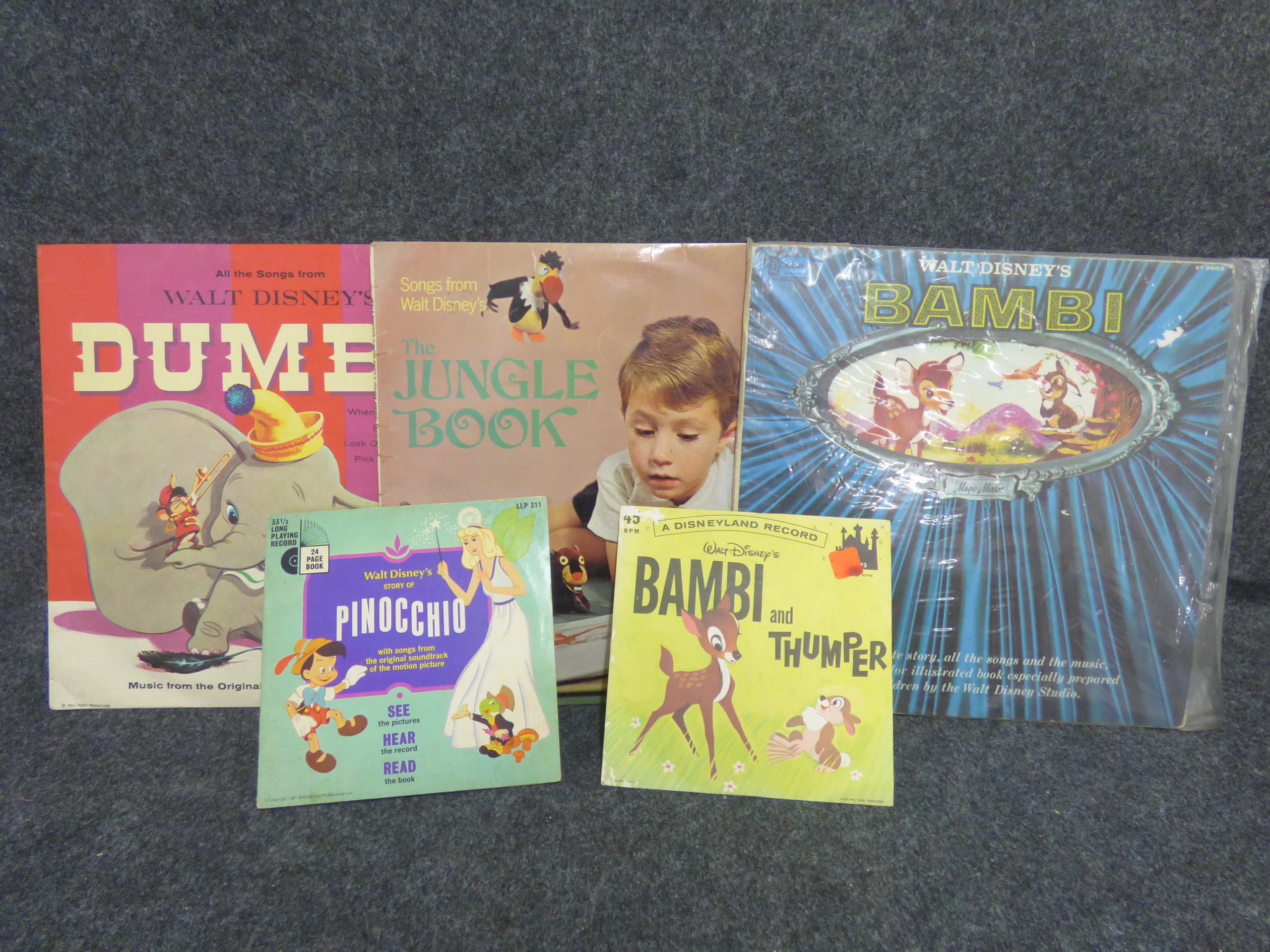 A collection of five multicoloured Walt Disney vinyl record and storybook sets including titles such as Dumbo, The Jungle Book, Bambi, Pinocchio, and Bambi and Thumper, featuring Disneyland Record and Music for Pleasure labels.