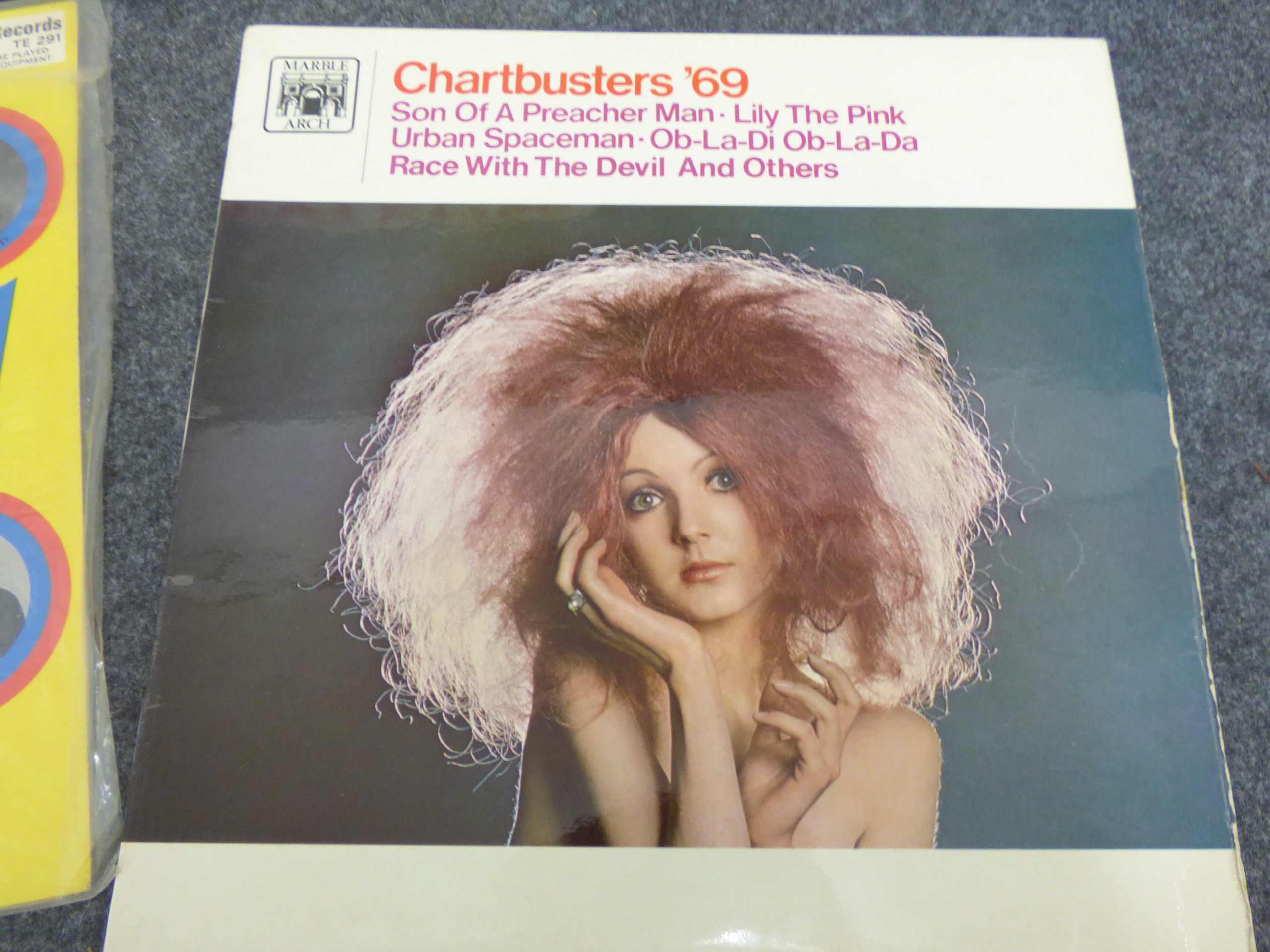 A collection of several vinyl record albums featuring compilation titles such as K-tel Goofy Greats, Seventy Five No. 1 Chart Hits, and Chartbusters ’69.