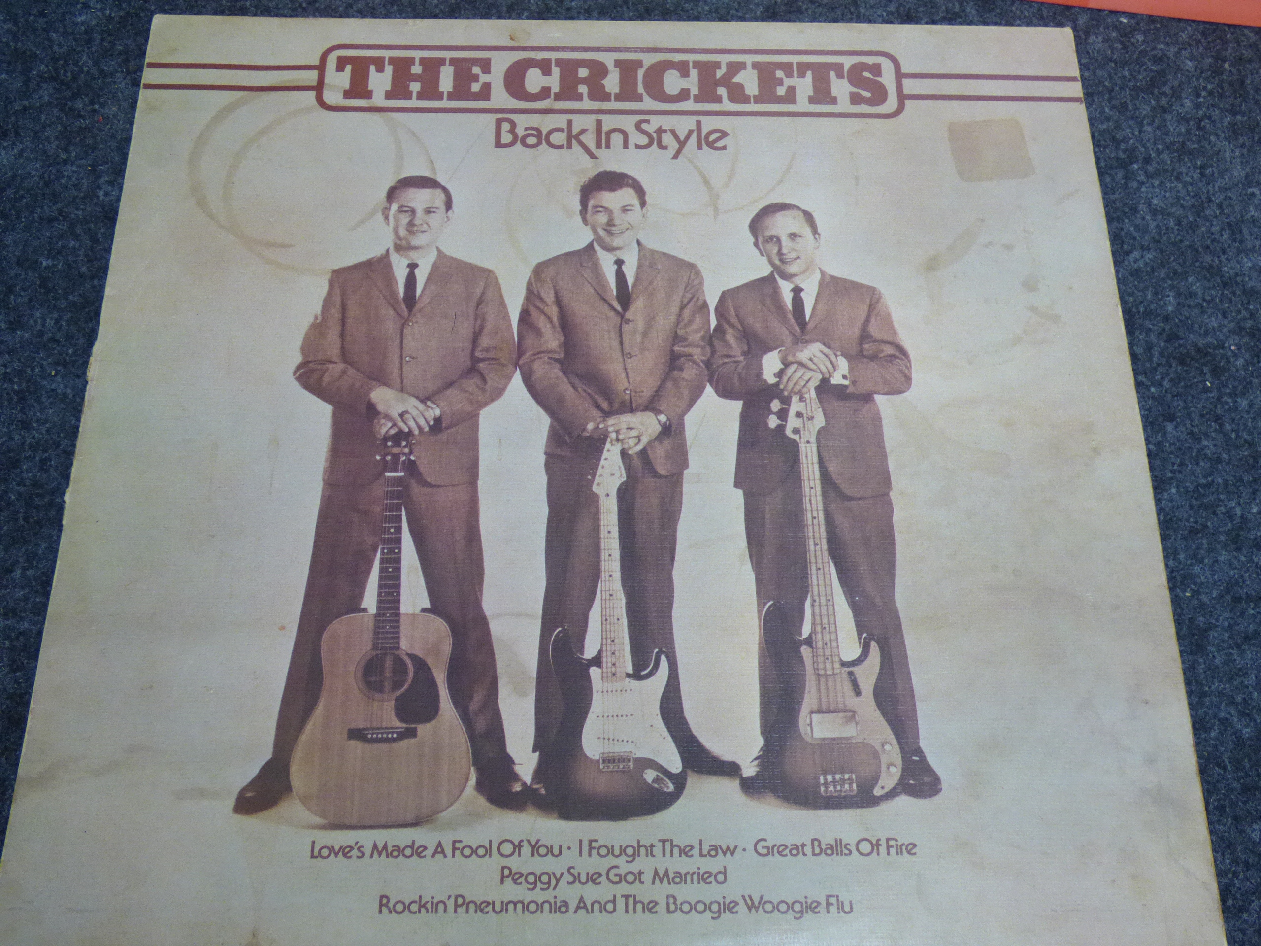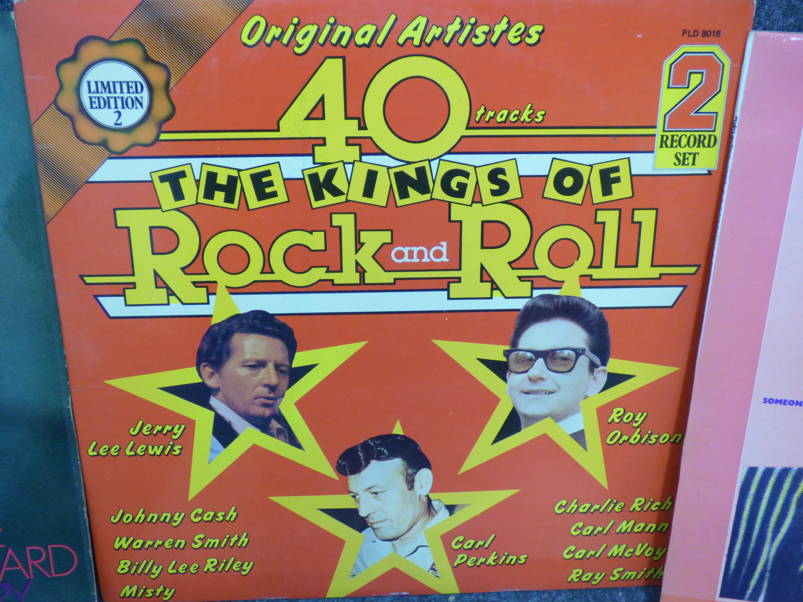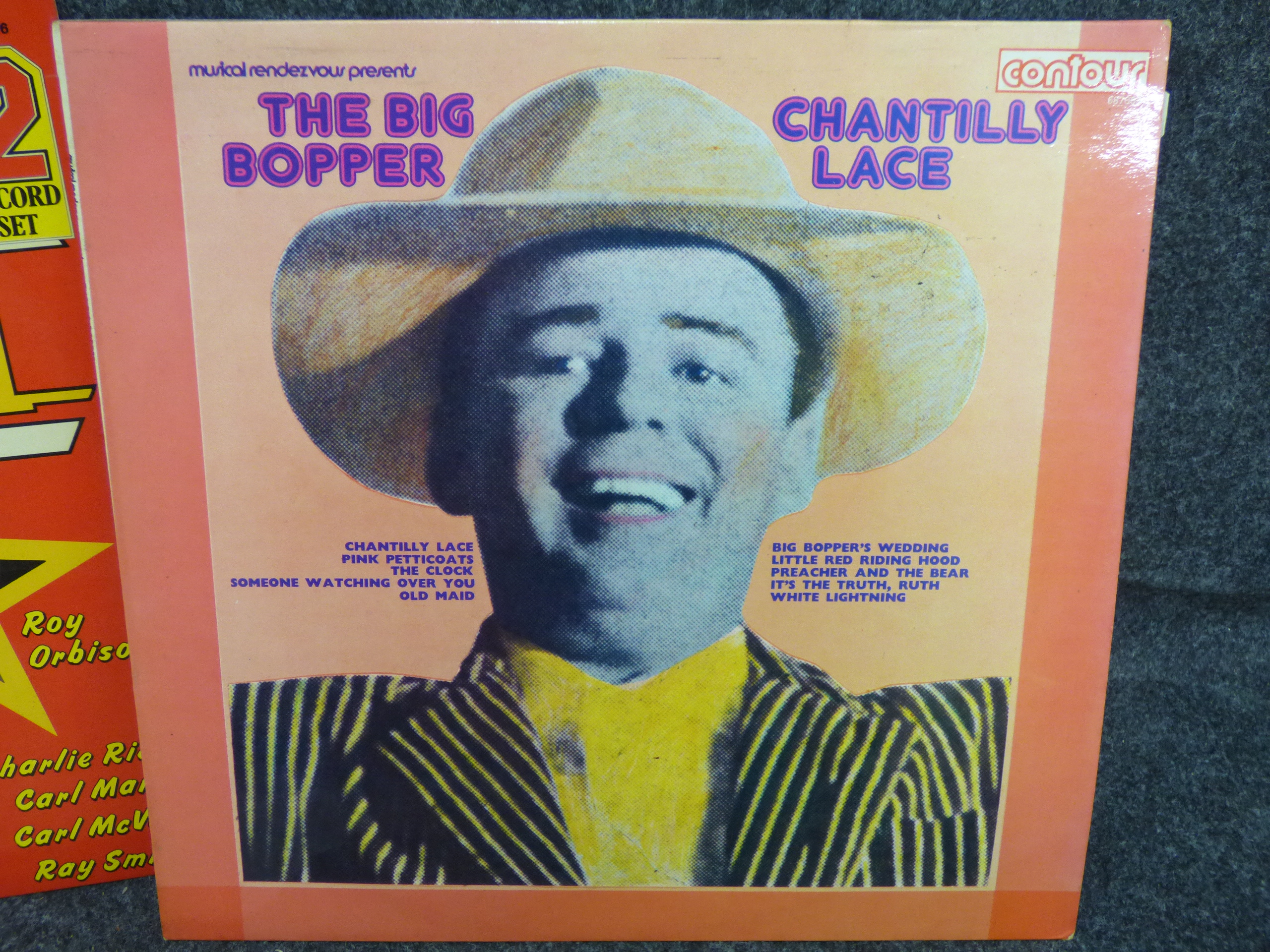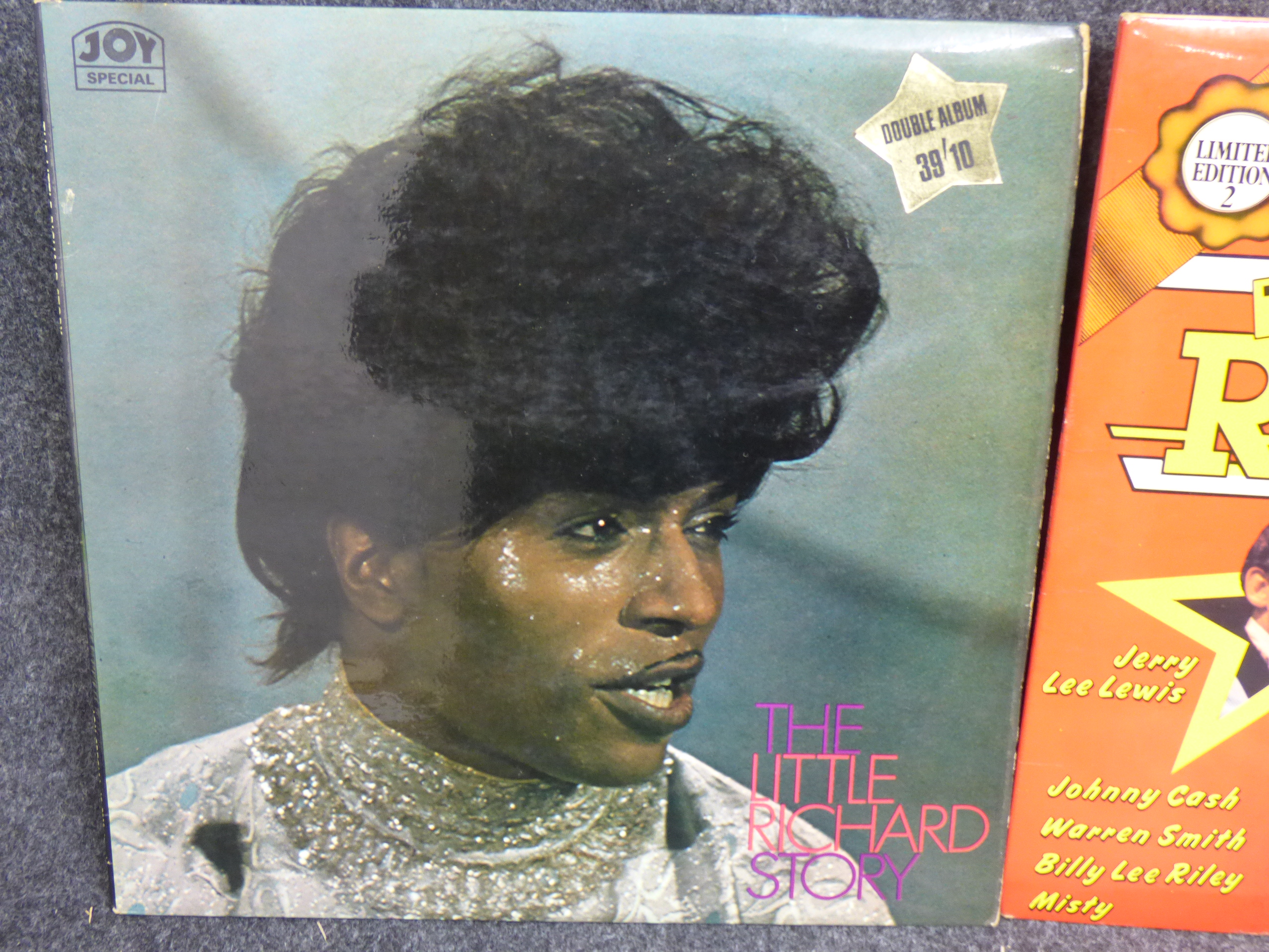 A collection of vintage vinyl records including The Little Richard Story, The Kings of Rock and Roll double album, The Big Bopper Chantilly Lace, and The Crickets Back In Style.