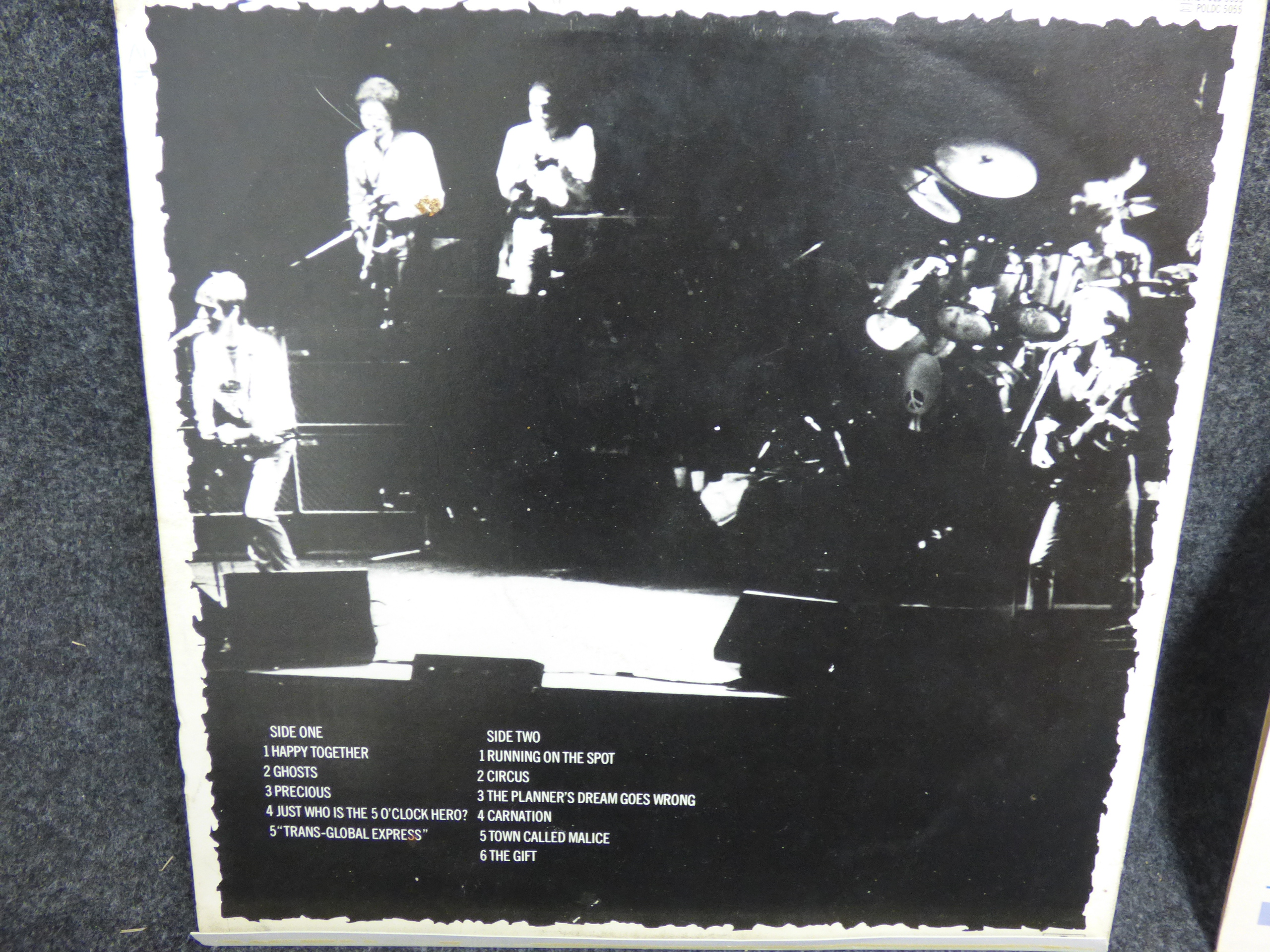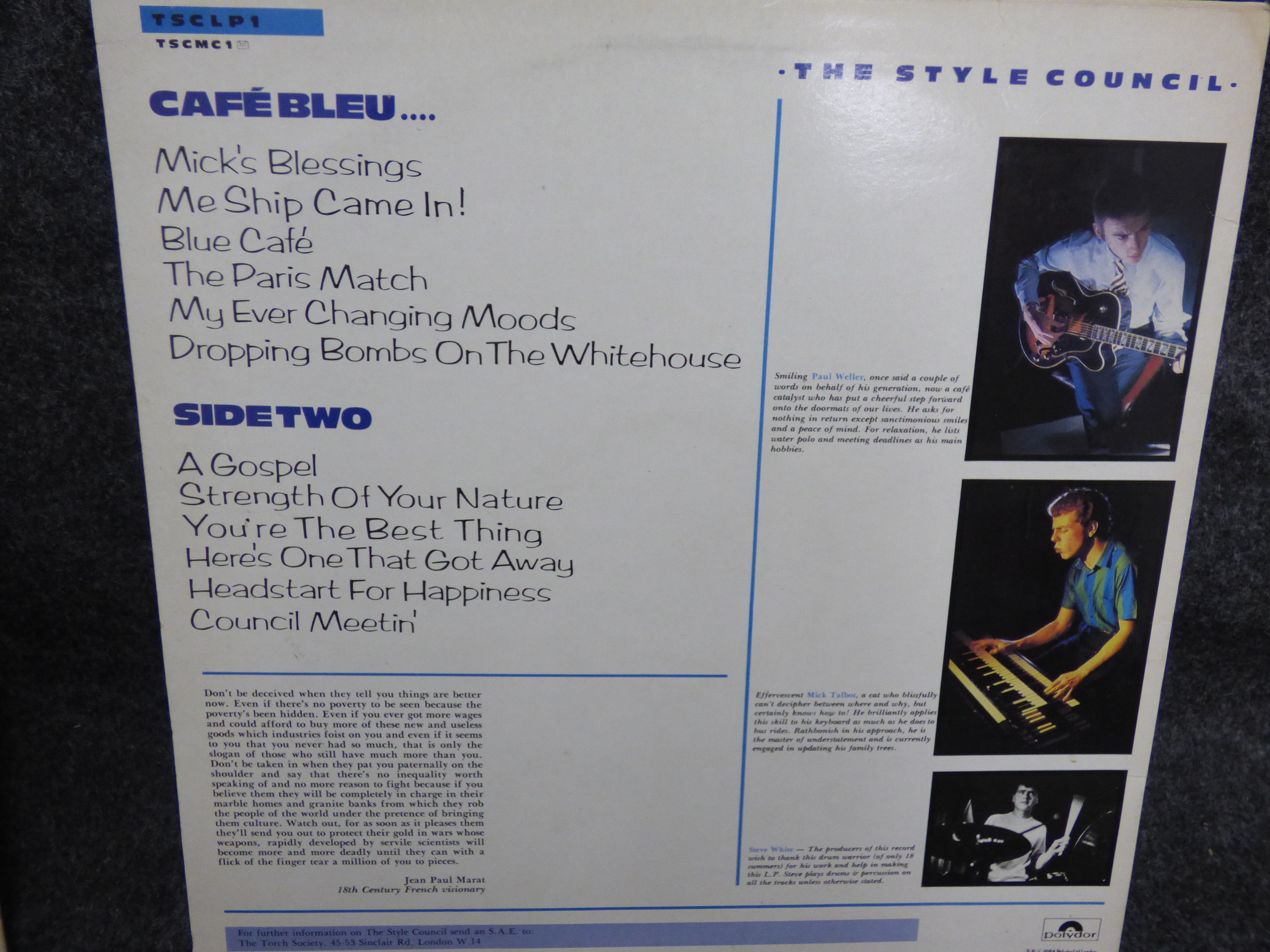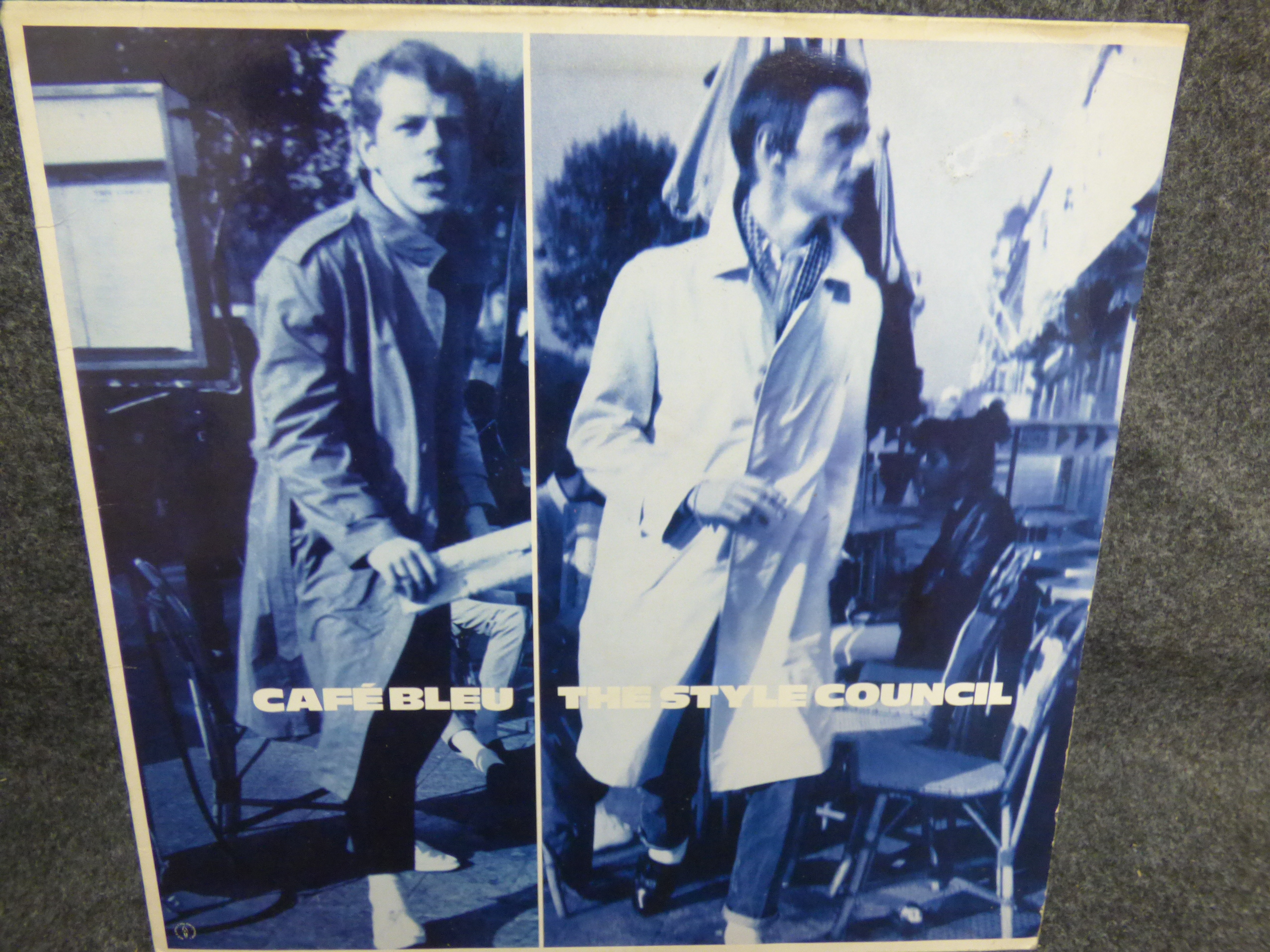 Two multi-coloured vinyl record albums including The Gift by The Jam and Cafe Bleu by The Style Council featuring Polydor labels and original cover art.