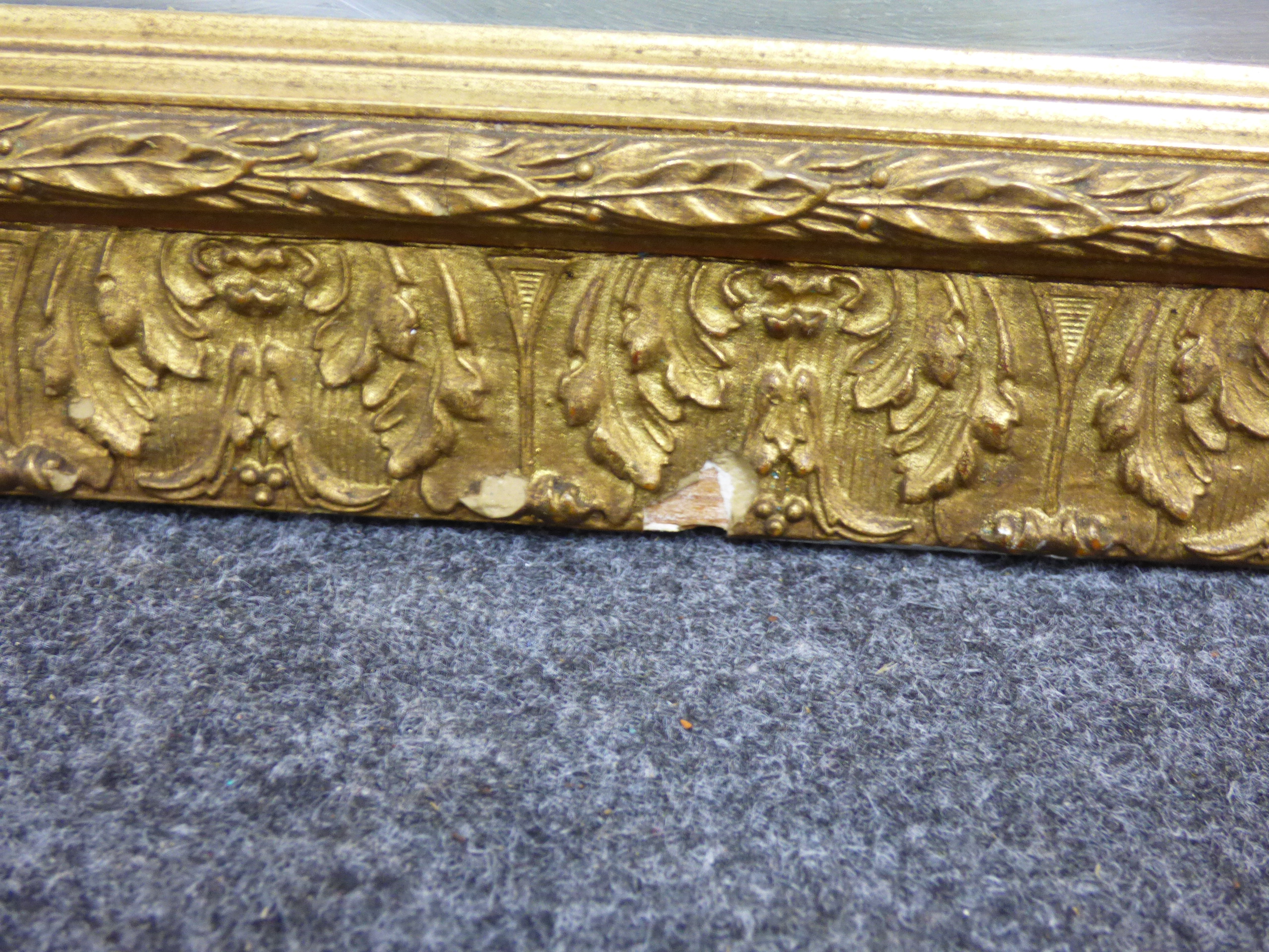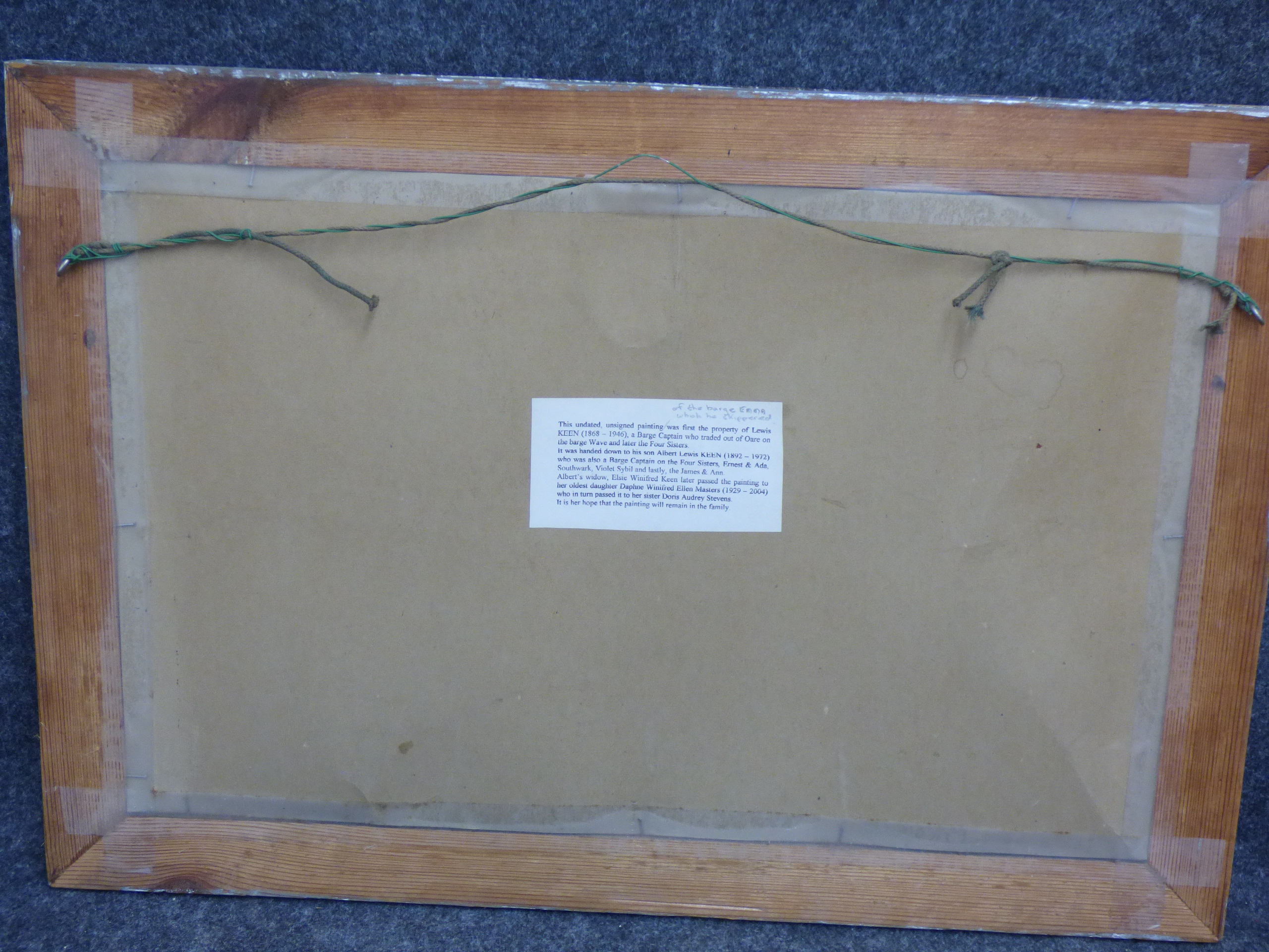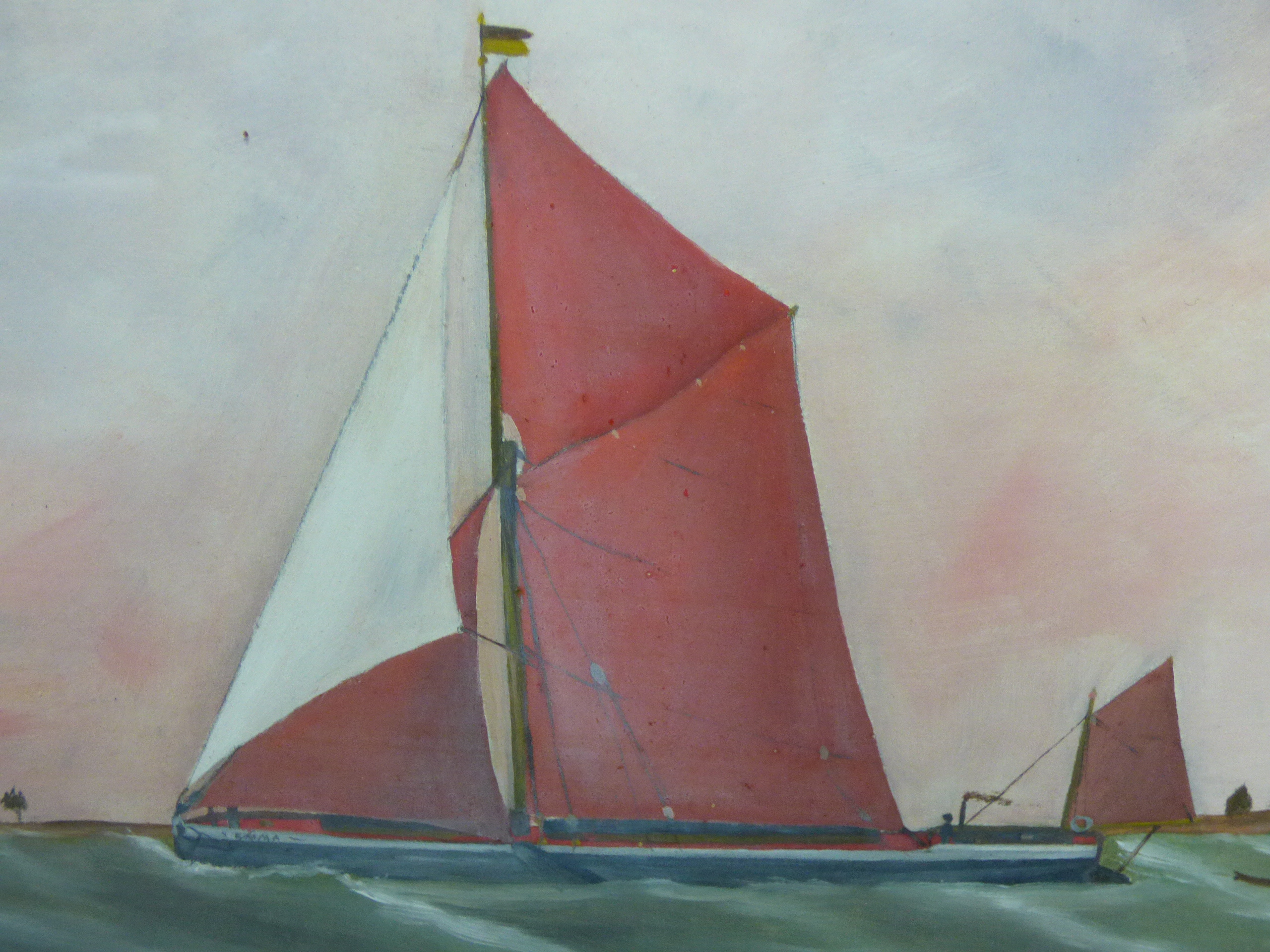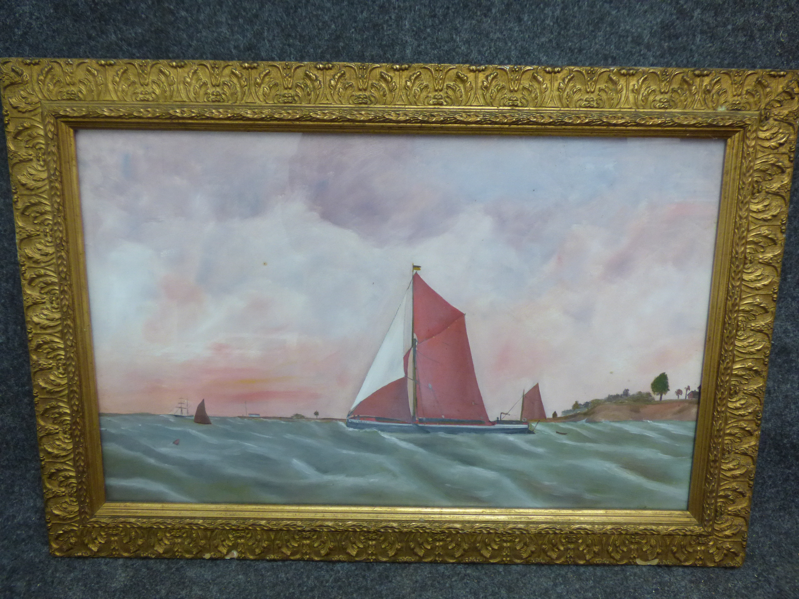 A framed painting of the sailing barge EMMA featuring red and white sails on a gray-green sea, housed in an ornate gilt frame with a provenance label on the reverse documenting its history through the family of barge captain Lewis Keen. 57x40cm