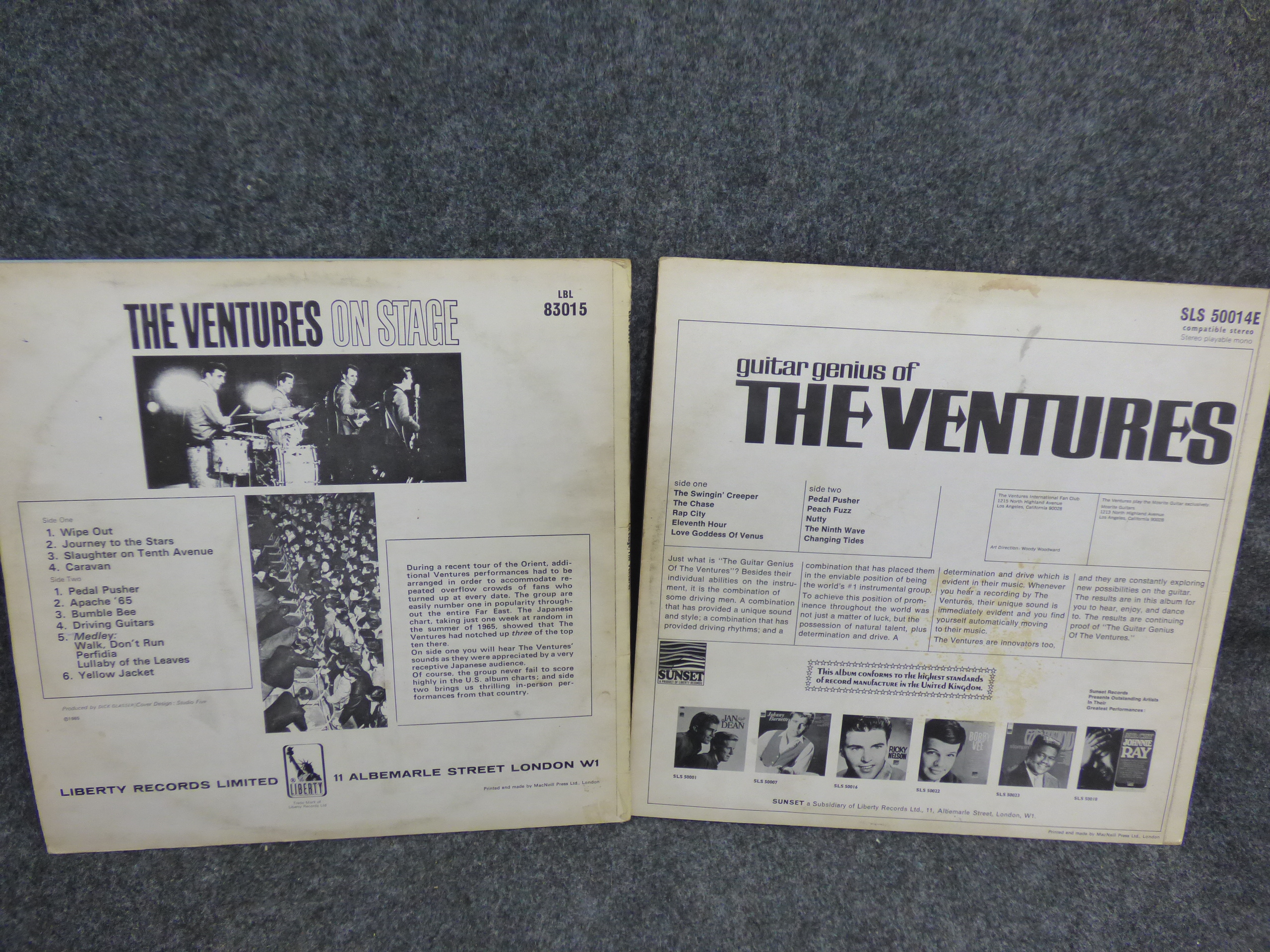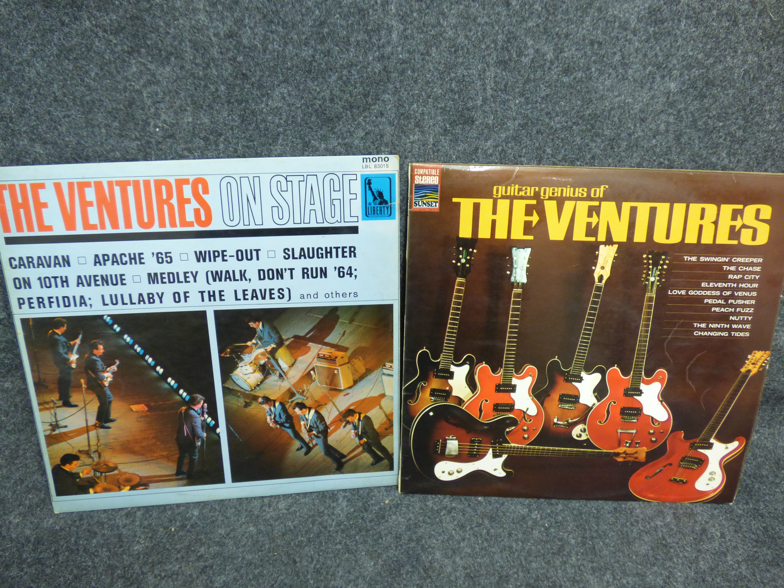 Two The Ventures vinyl record albums including The Ventures On Stage on Liberty Records and Guitar Genius of The Ventures on Sunset Records.