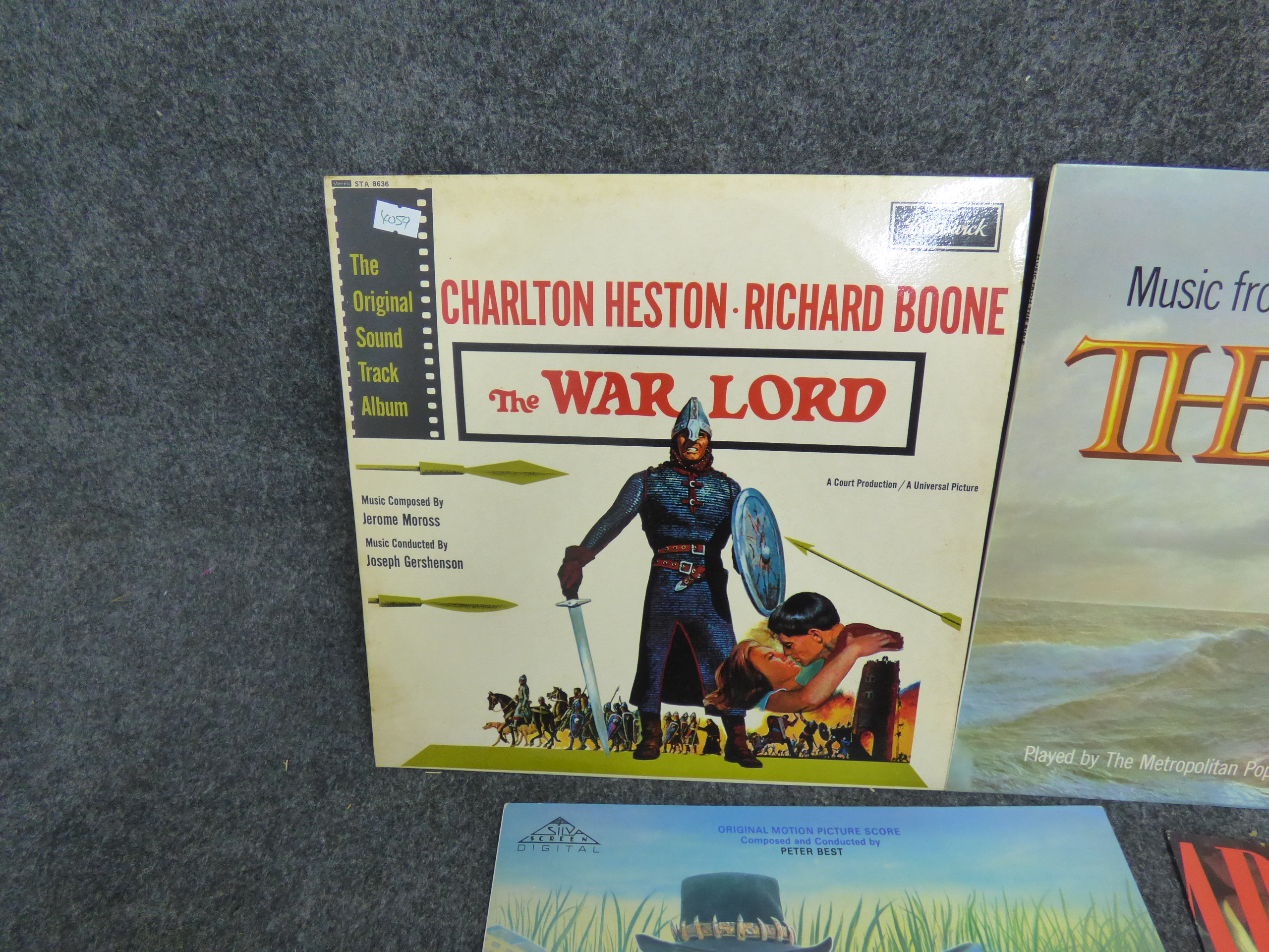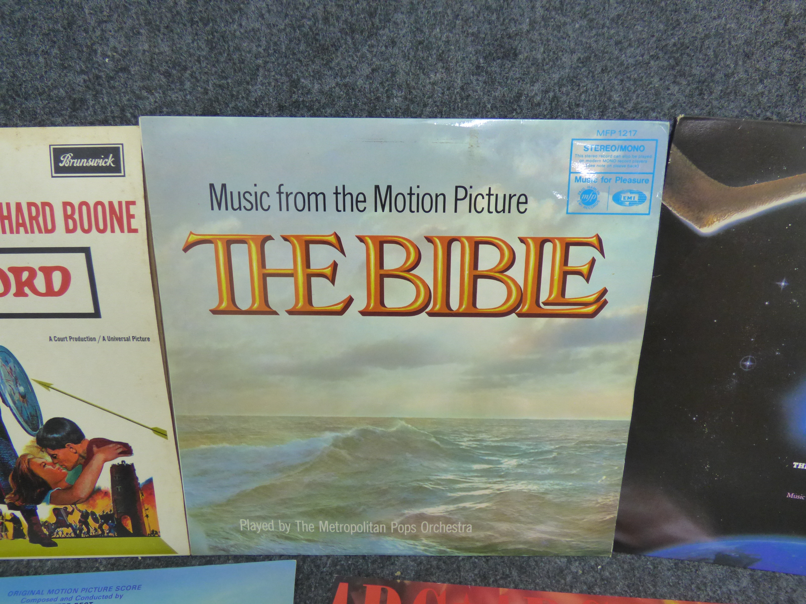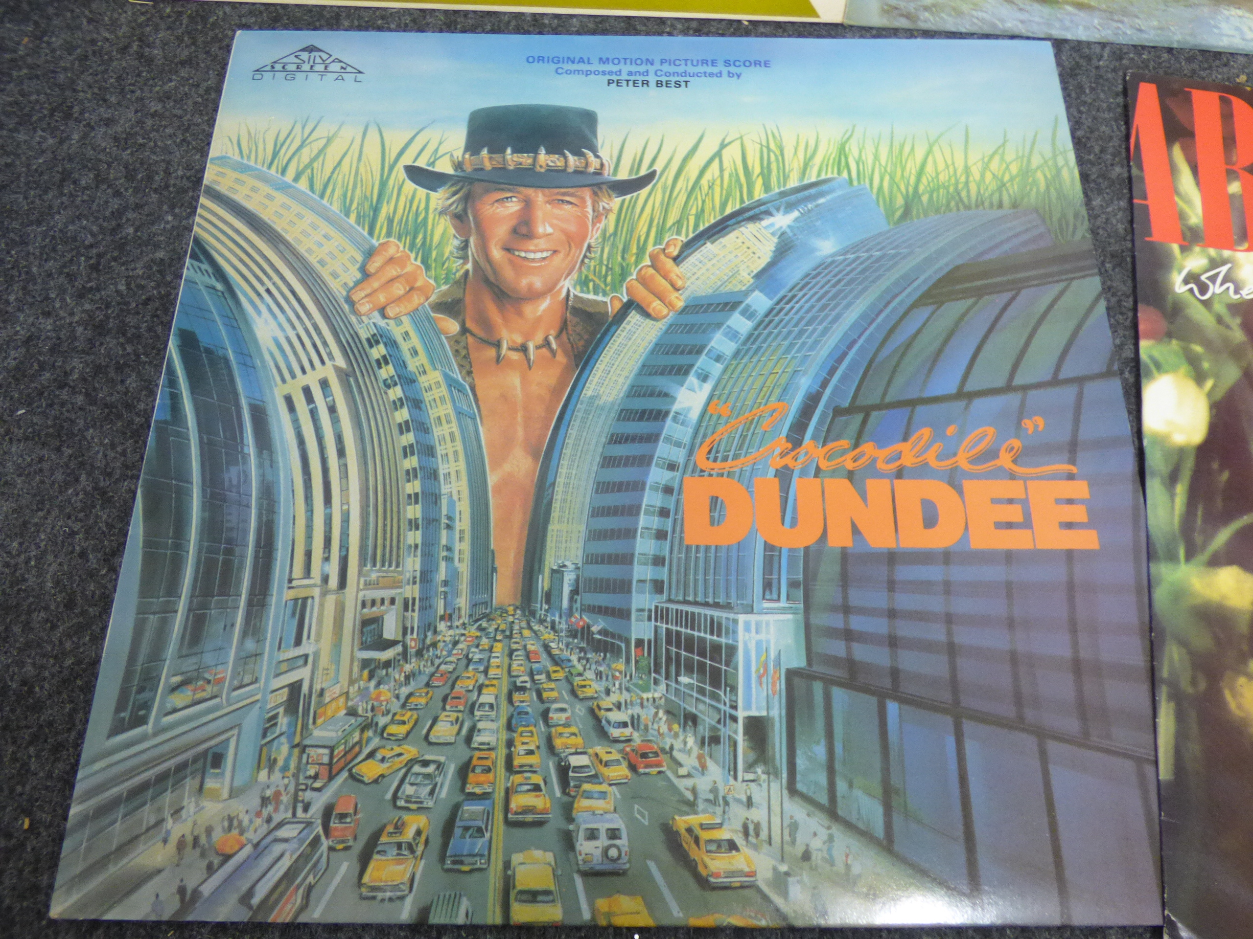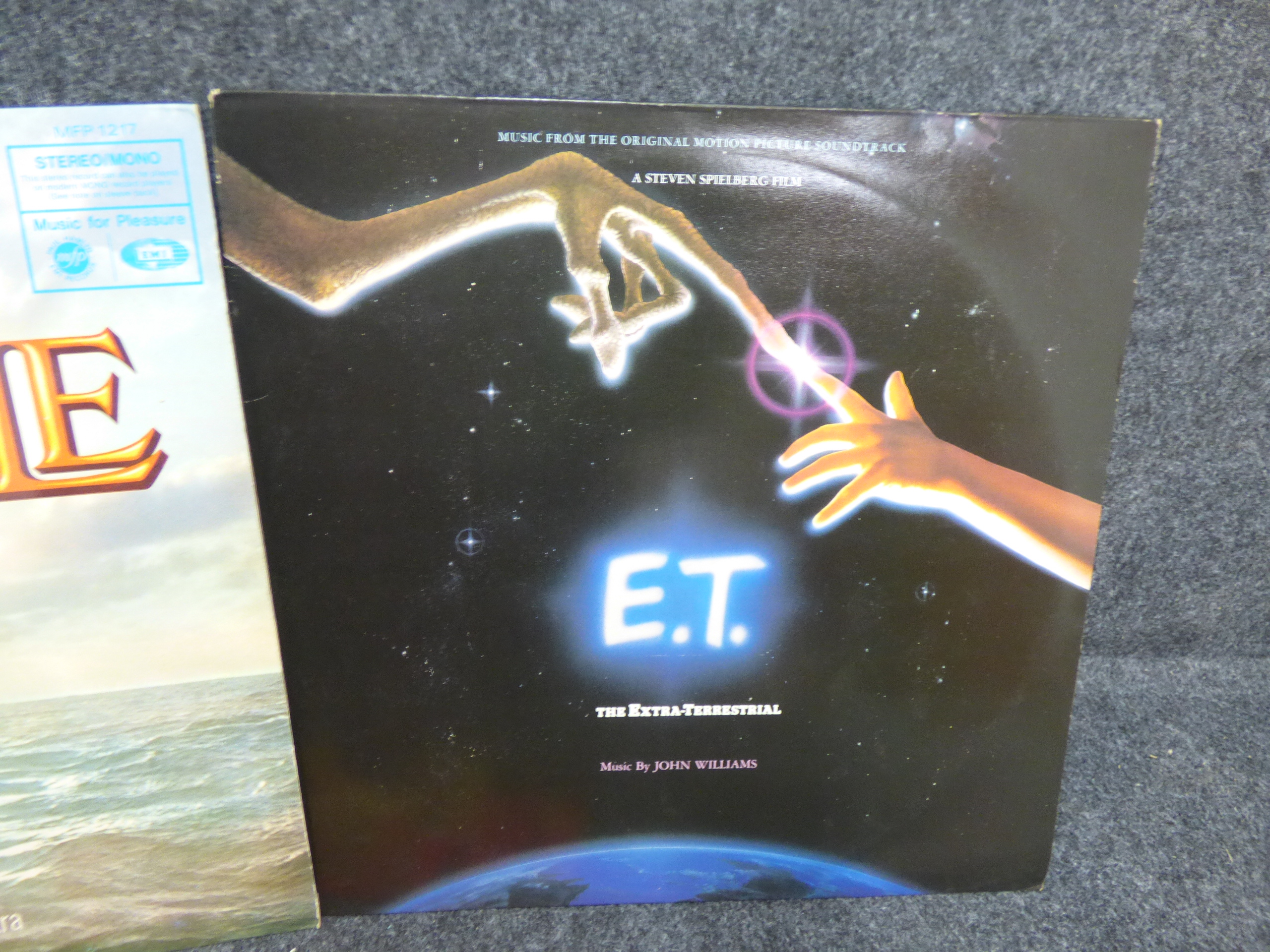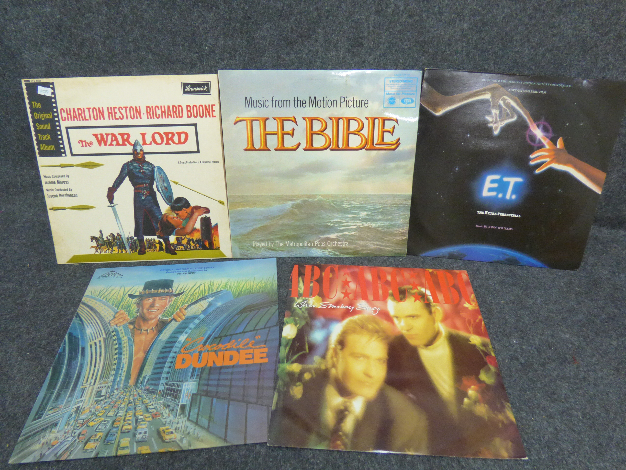 A collection of vinyl record albums featuring movie soundtracks for E.T. The Extra-Terrestrial, Crocodile Dundee, The War Lord, and The Bible, alongside ABC’s When Smokey Sings.