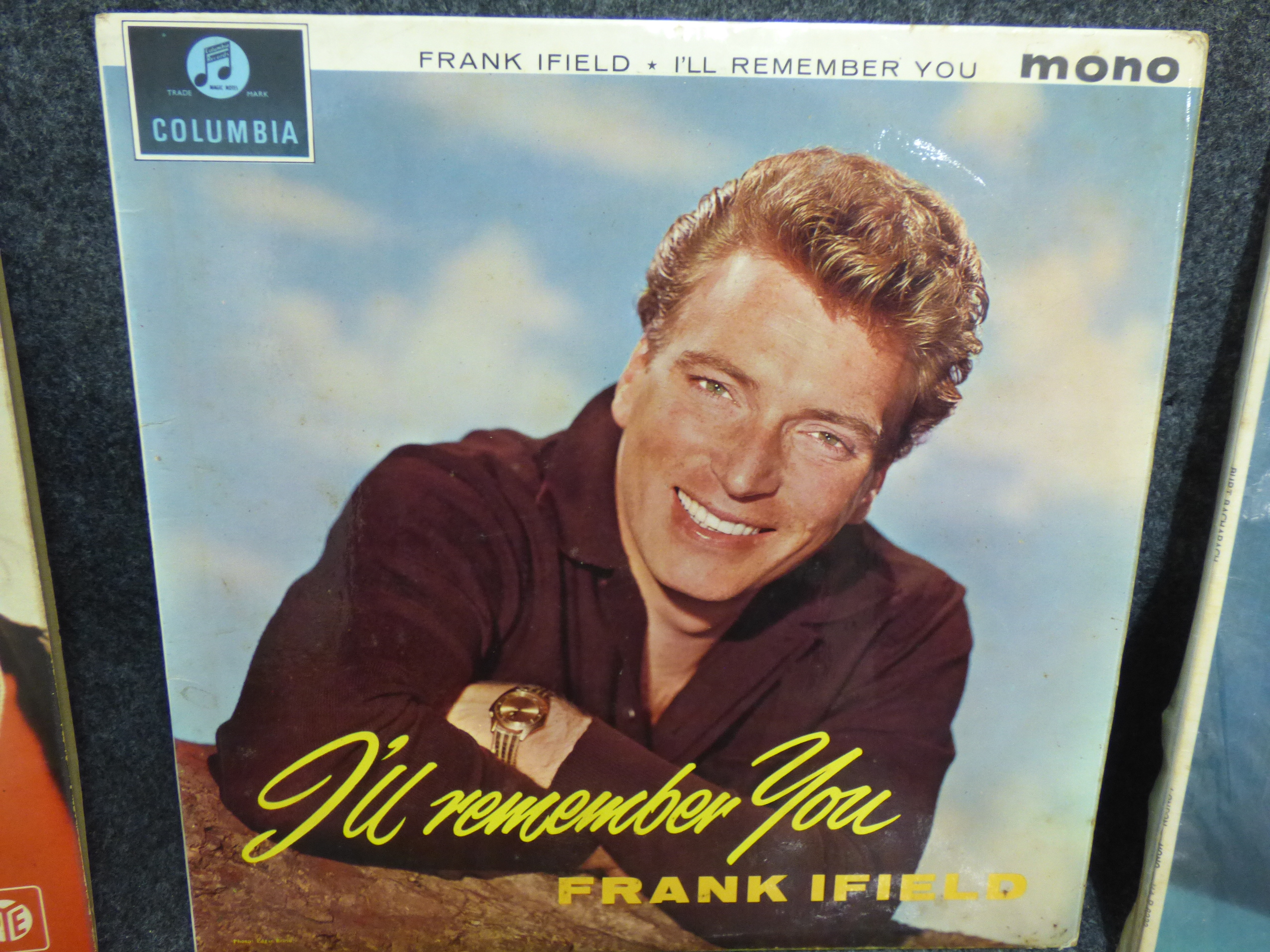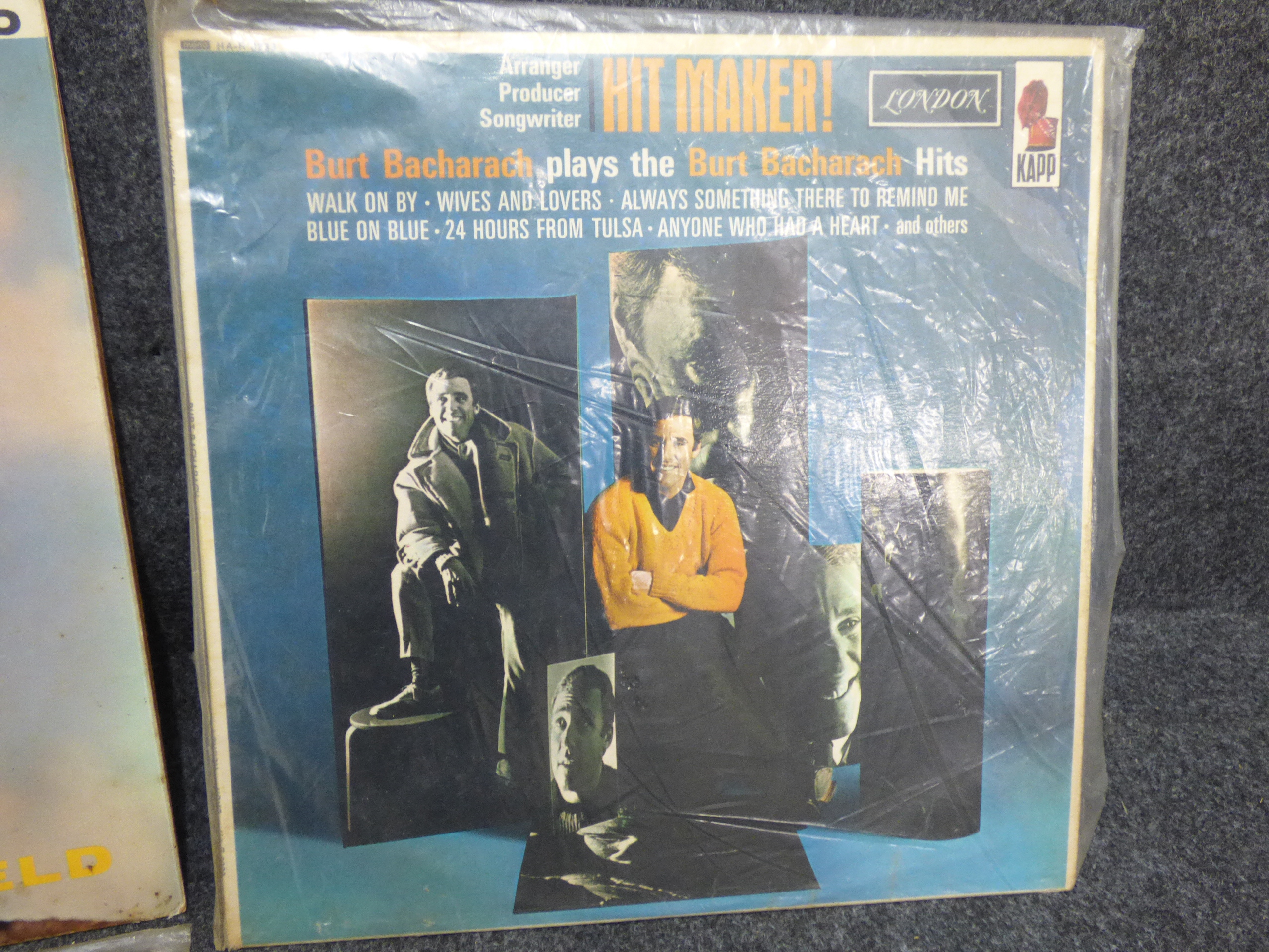 A collection of multi-colored vinyl record albums featuring Petula Clark’s Greatest Hits, Frank Ifield’s I’ll Remember You, Burt Bacharach’s Hit Maker!, and Gene Pitney’s Golden Greats.
