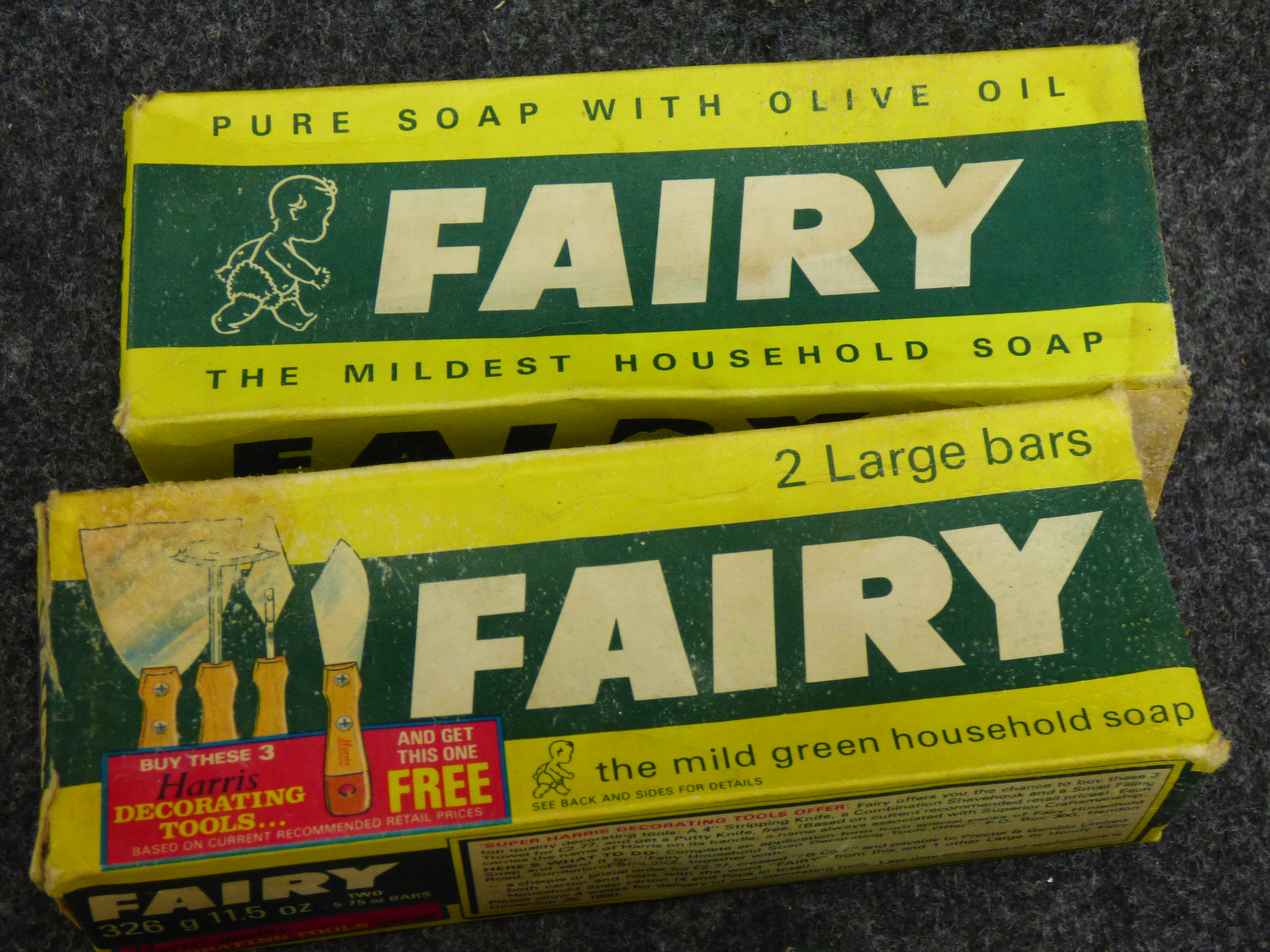 A collection of vintage household cleaning products including two boxes of Fairy household soap weighing 326g each, three bars of Fairy toilet soap, a Shield deodorant soap bar, and a Vanish pre-wash stain bar.
