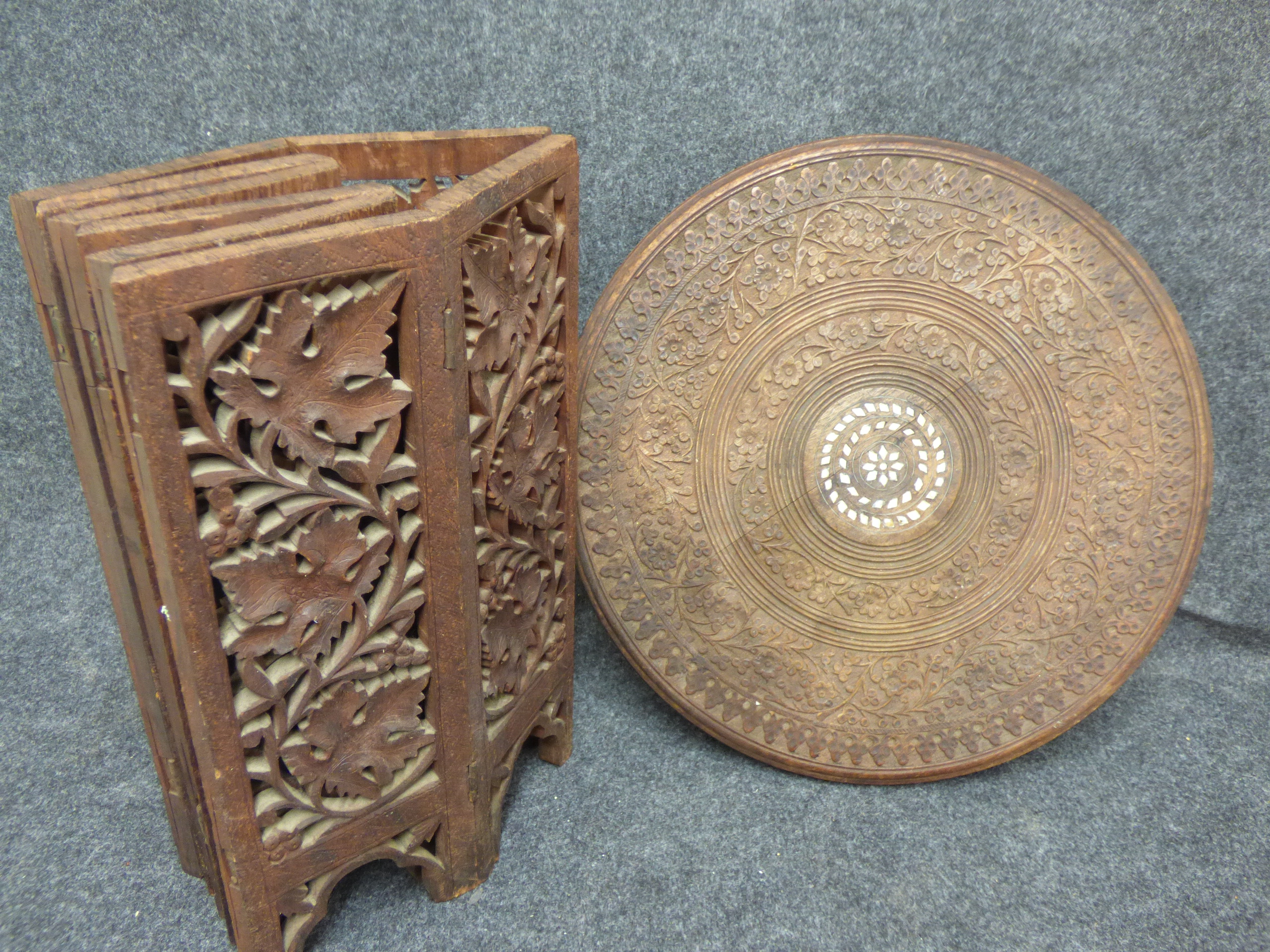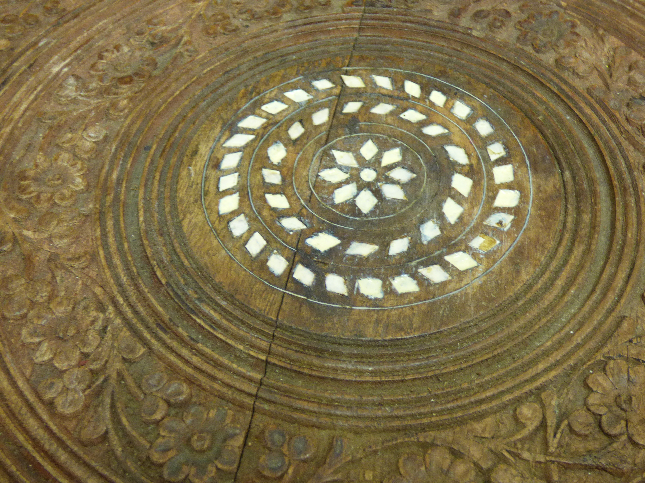 A brown carved wooden folding side table featuring a circular top with a central mother of pearl geometric inlay and an octagonal base decorated with elaborate floral patterns. 40cm tall, 39cm Dia