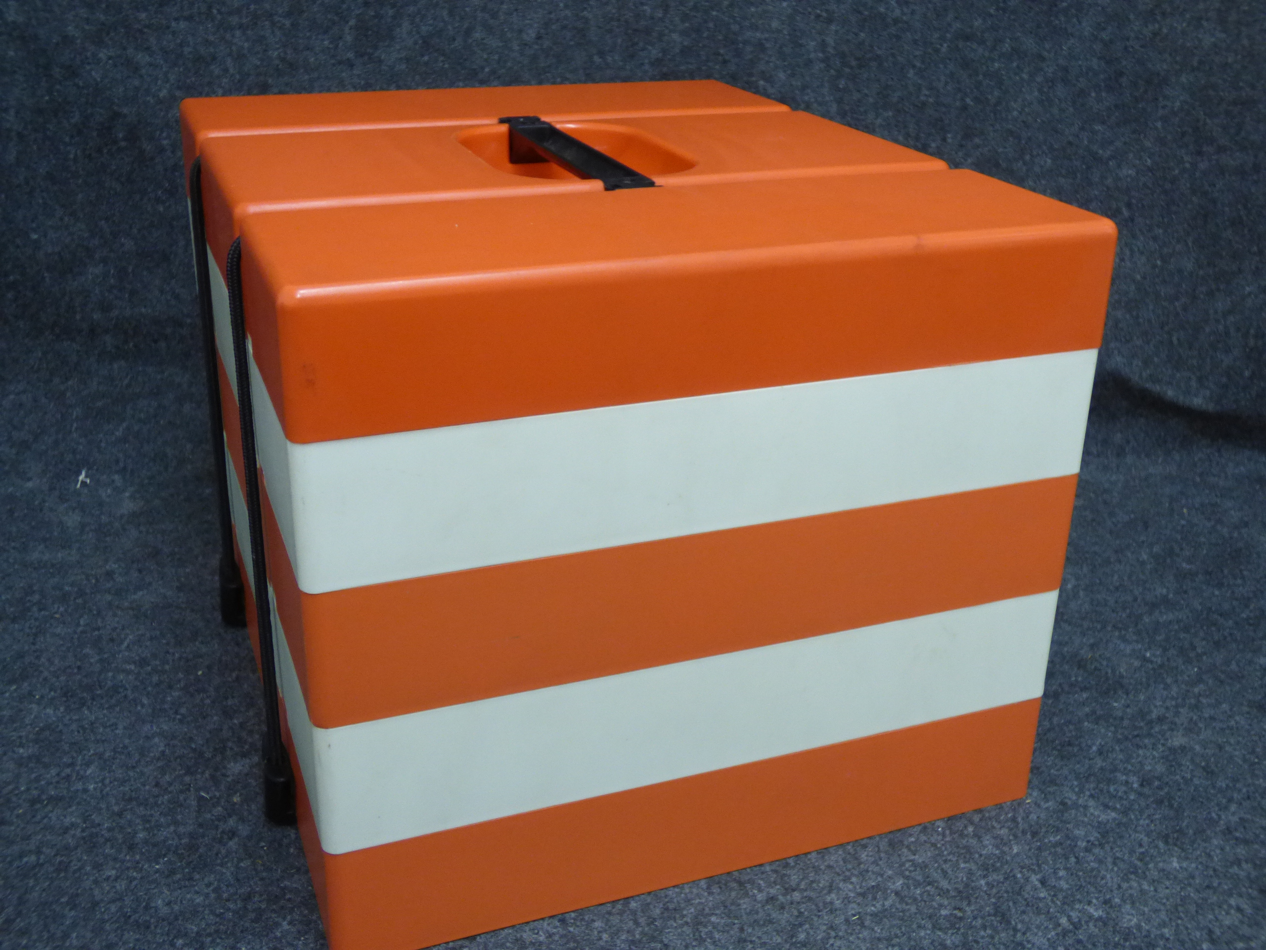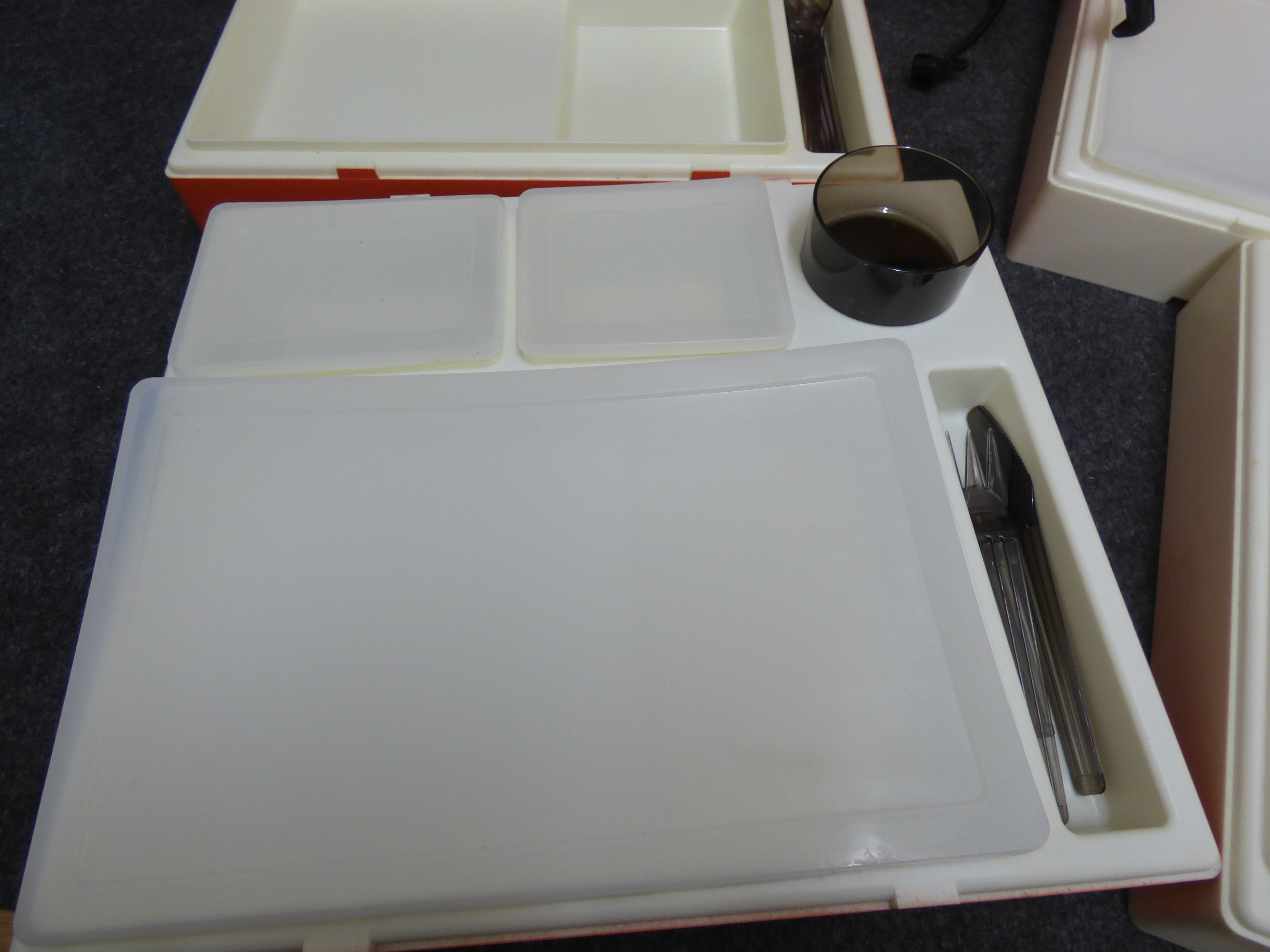A collection of vintage orange and off-white stackable plastic picnic trays featuring integrated lids, small containers, tumblers, and smoky-coloured utensils secured by a carrying handle.