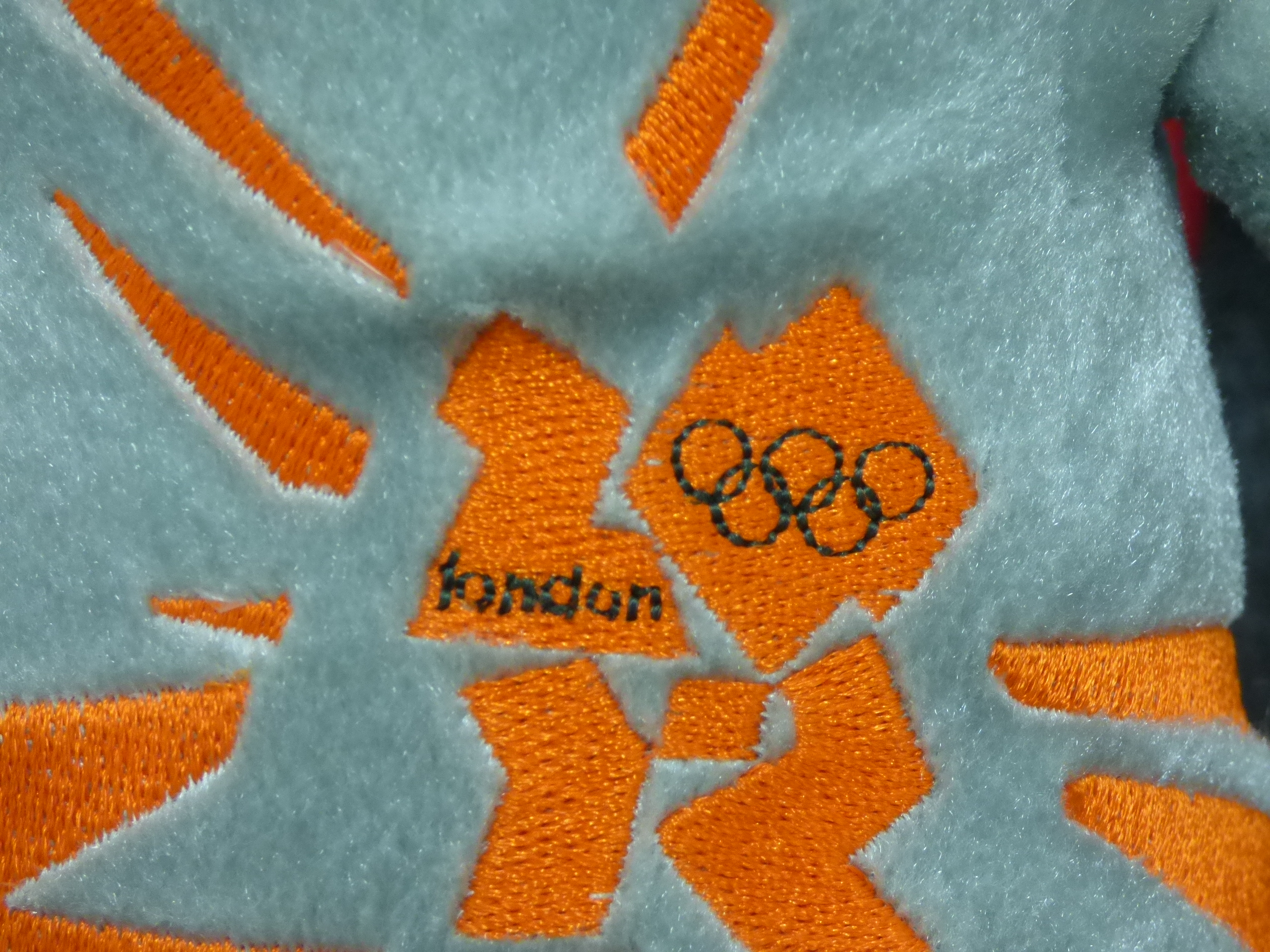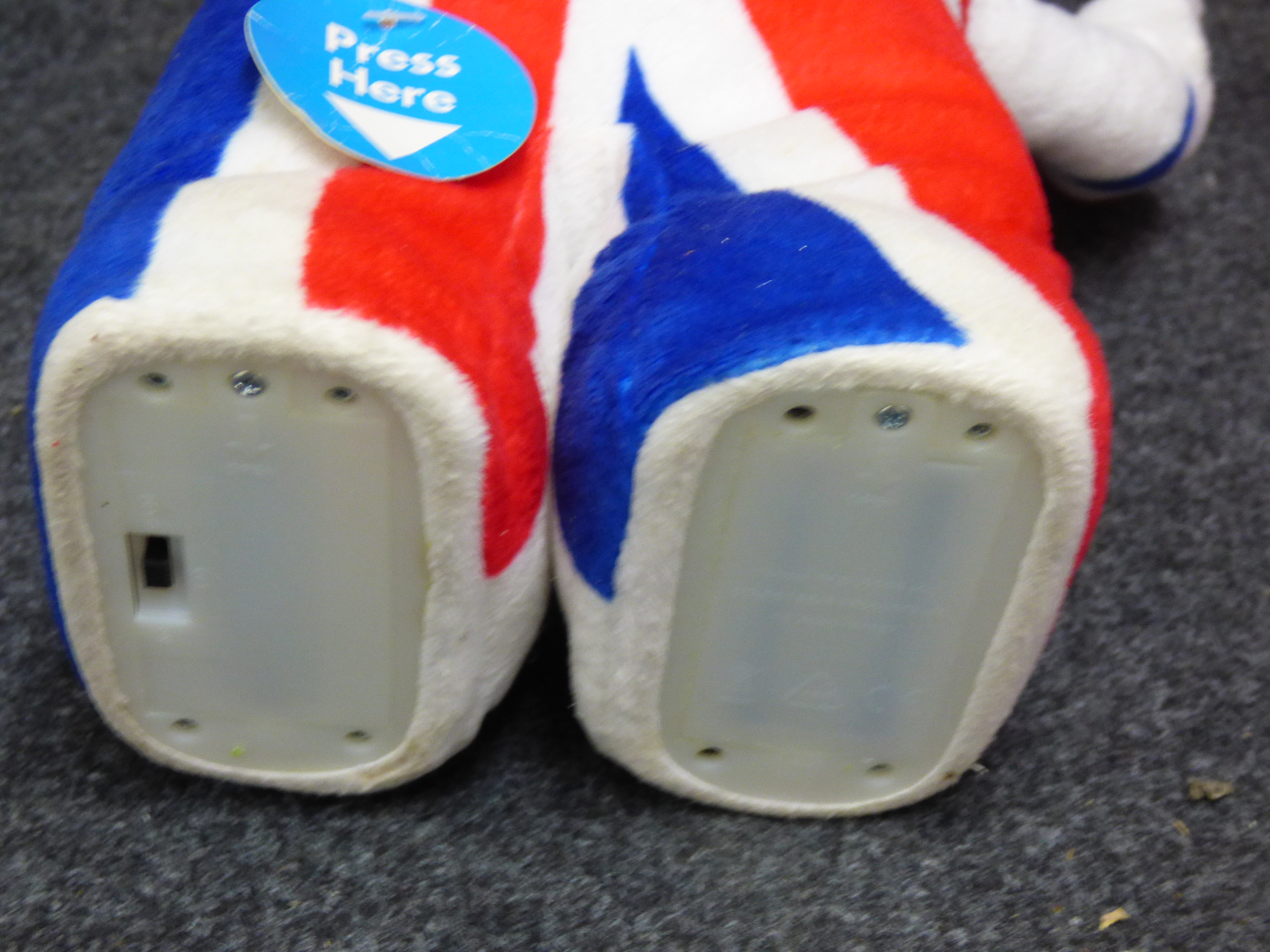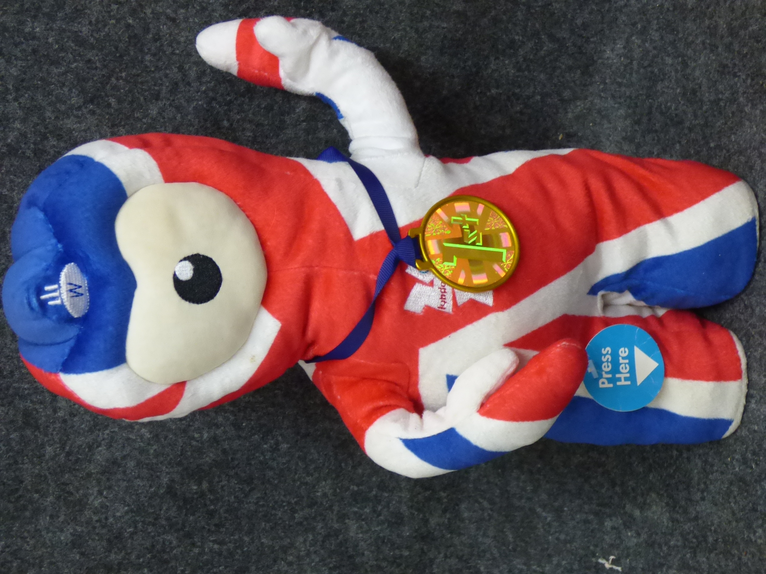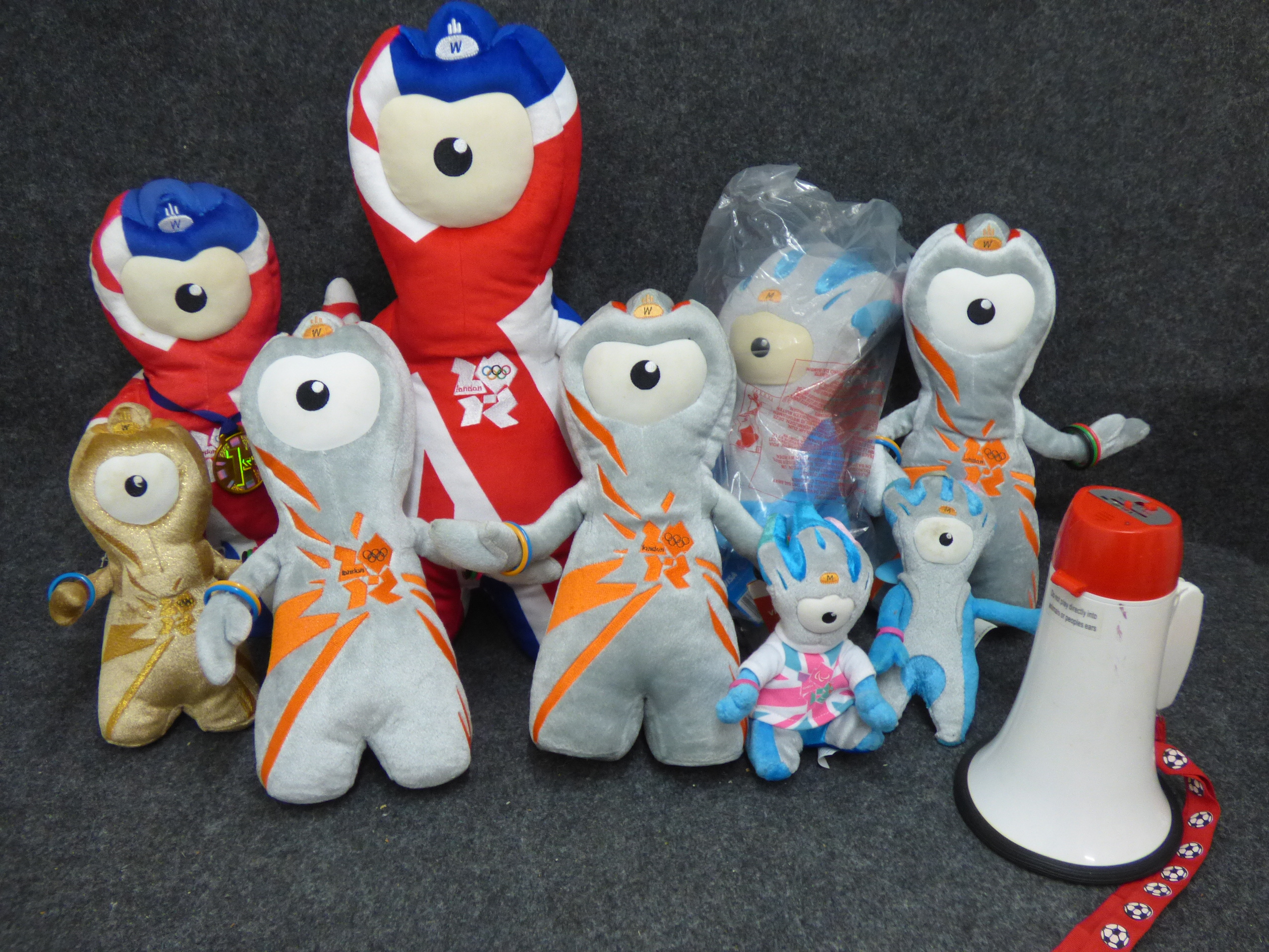 A collection of Wenlock and Mandeville plush mascot toys in various sizes and designs including Union Jack and metallic finishes, accompanied by a red and white megaphone. Tallest 45cm