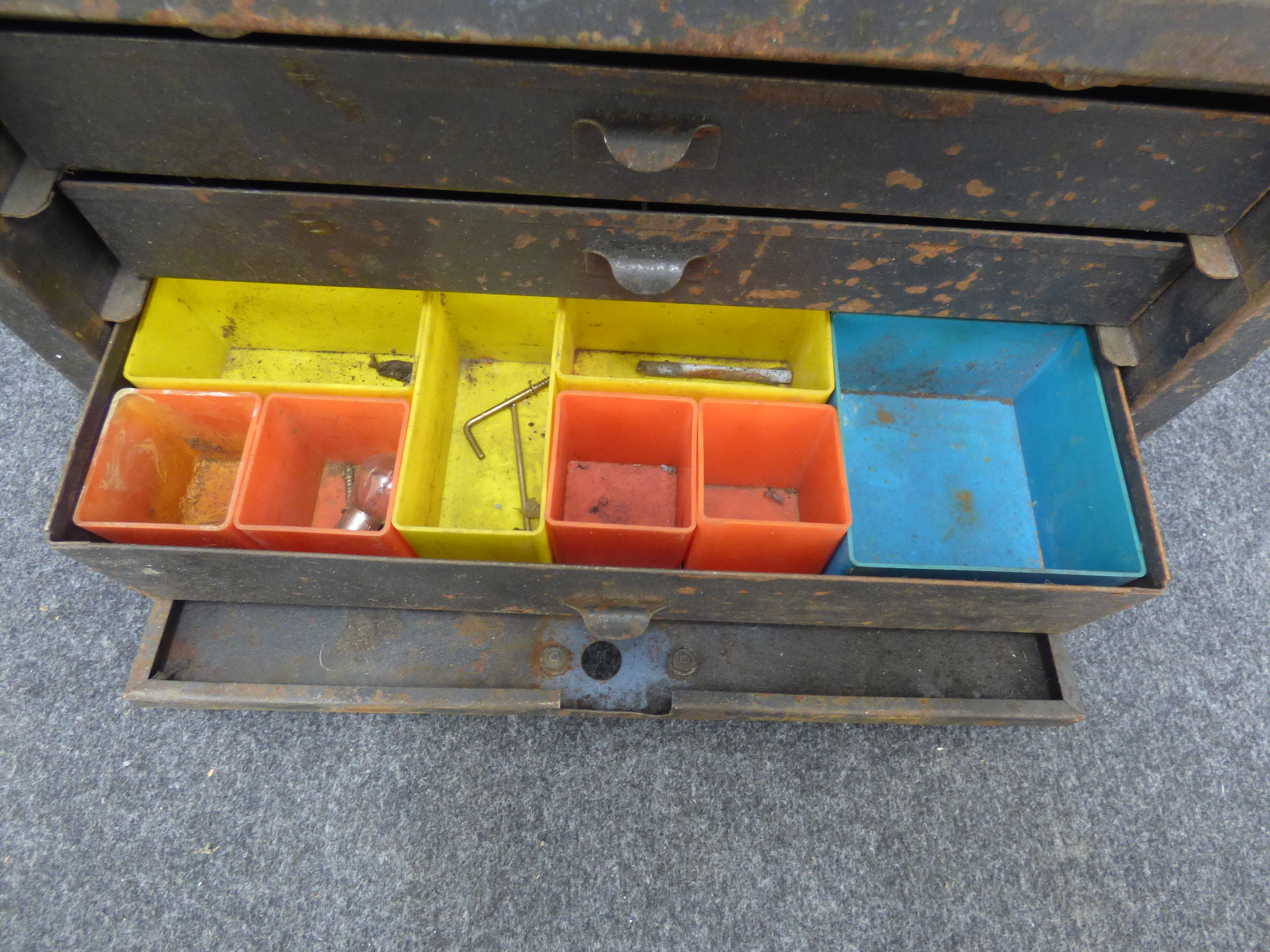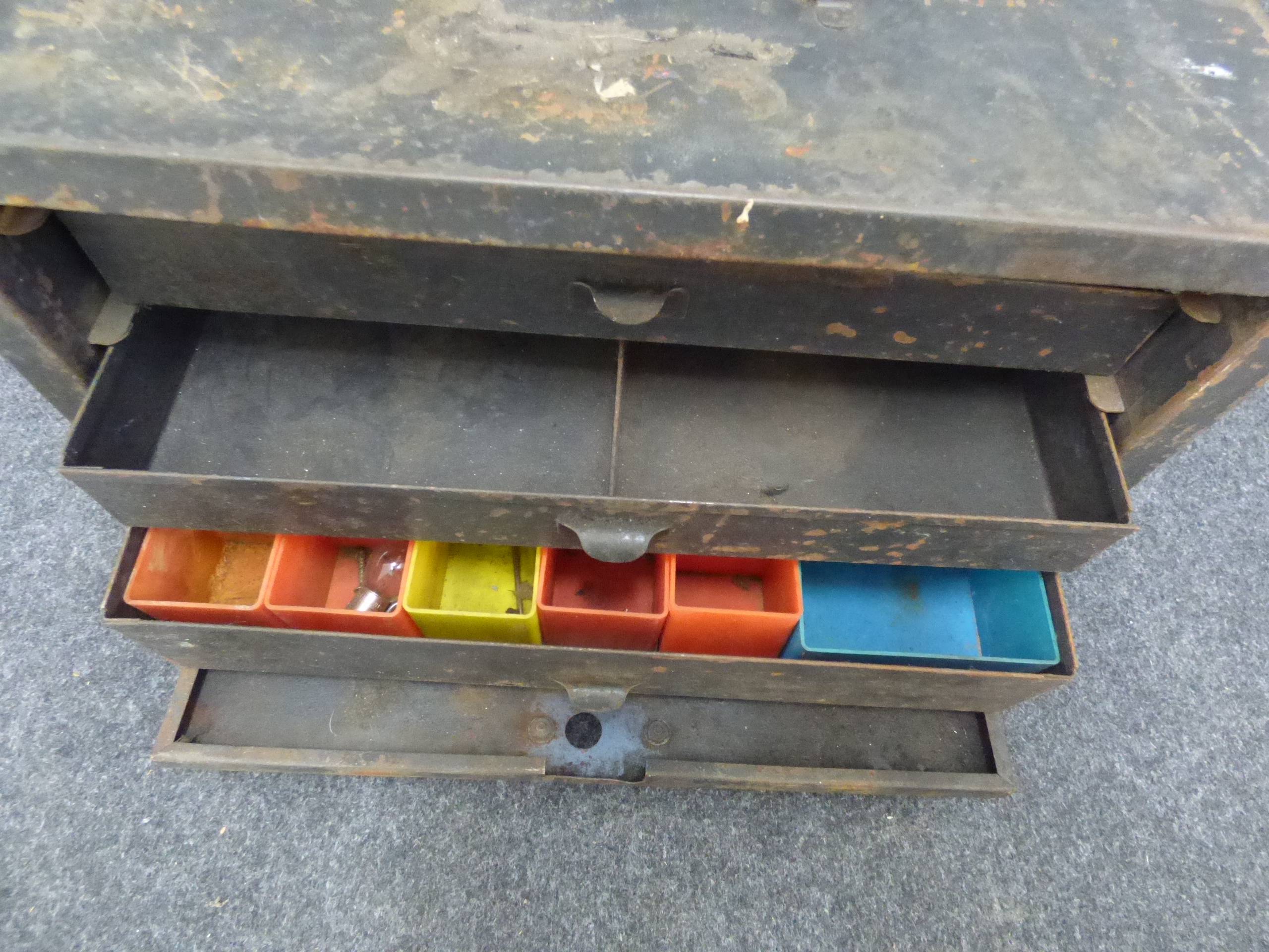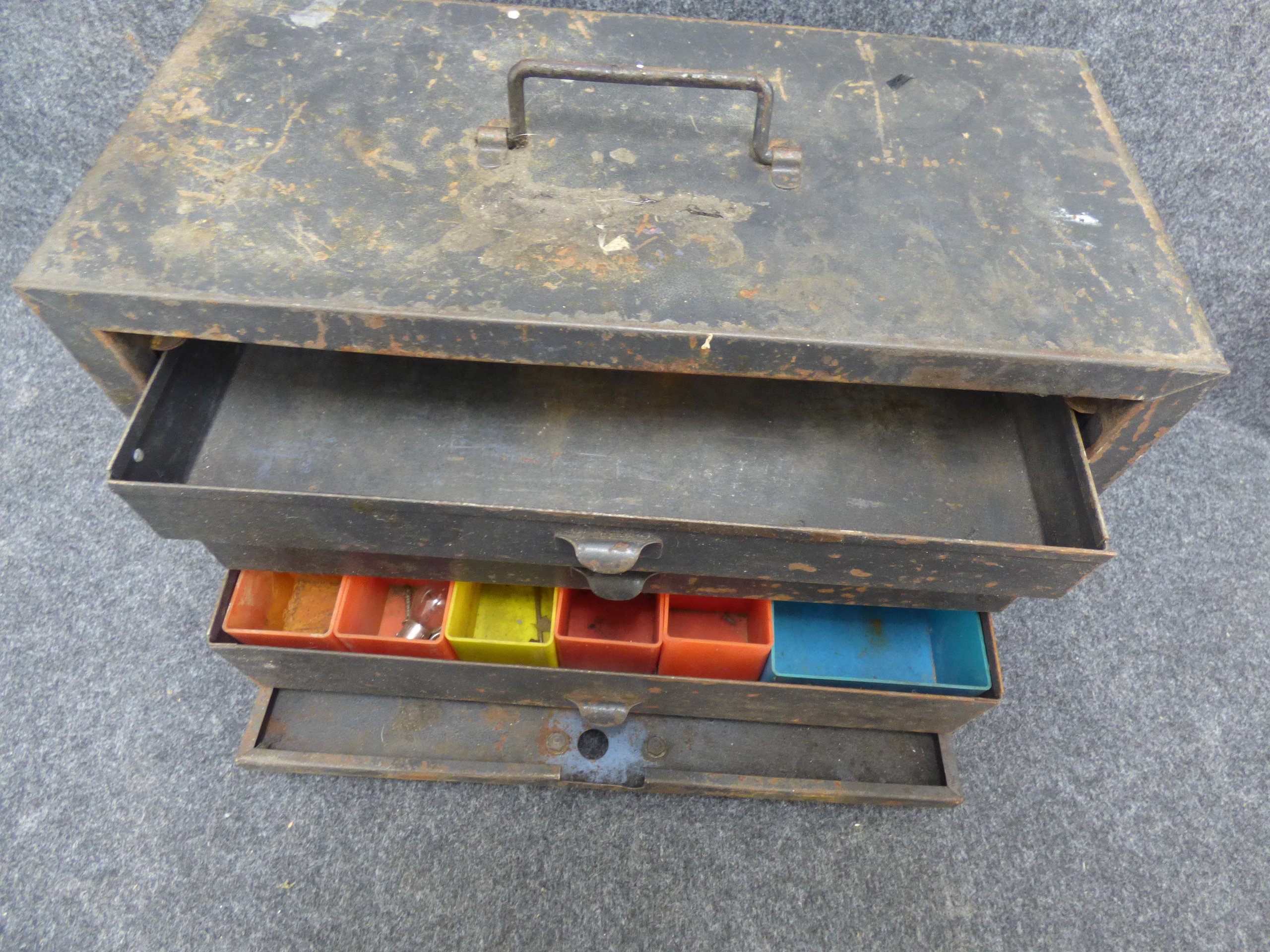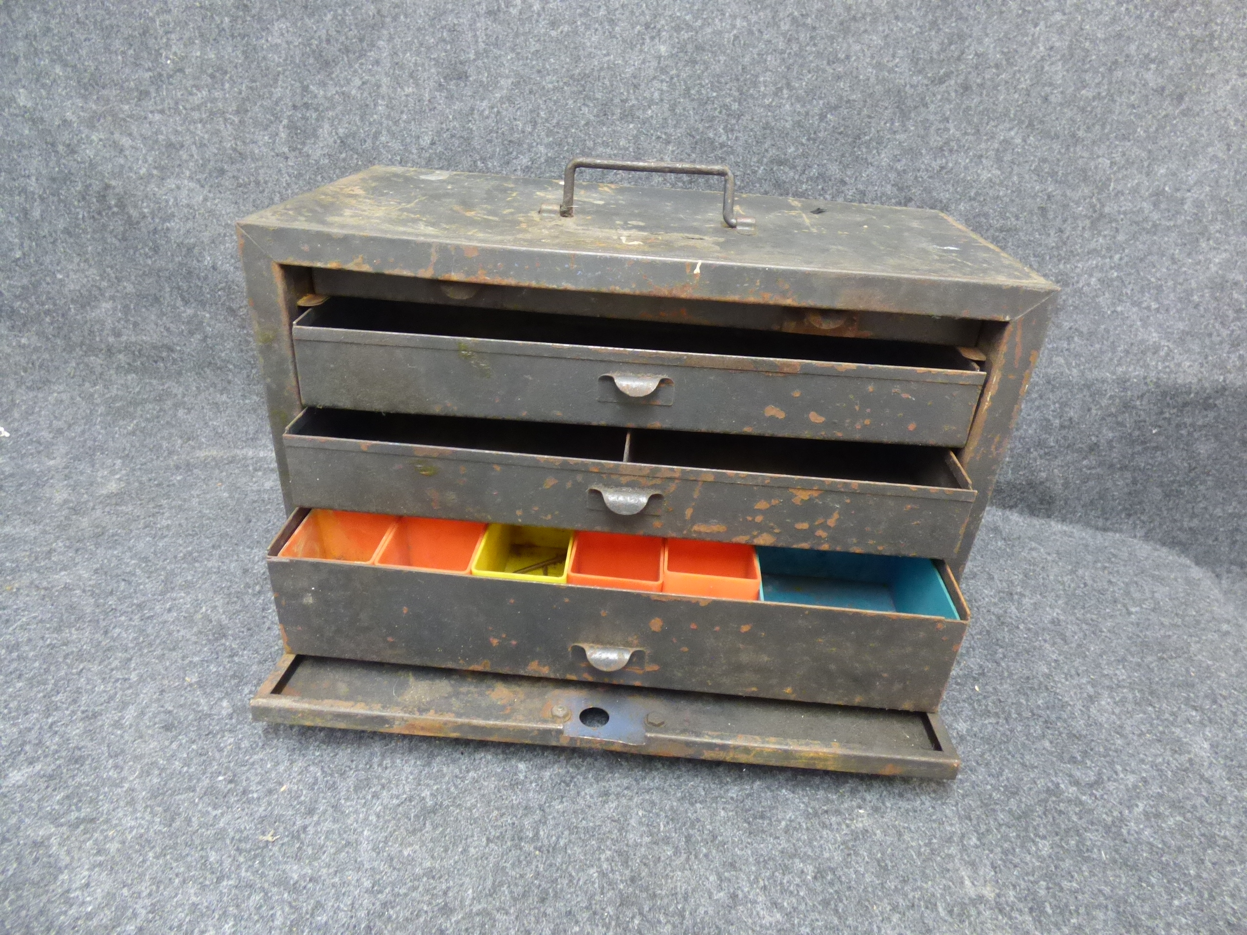 A vintage three-drawer metal organizer cabinet in dark grey with a top carry handle, featuring significant surface rust and containing a collection of orange, yellow, and blue plastic interior bins.