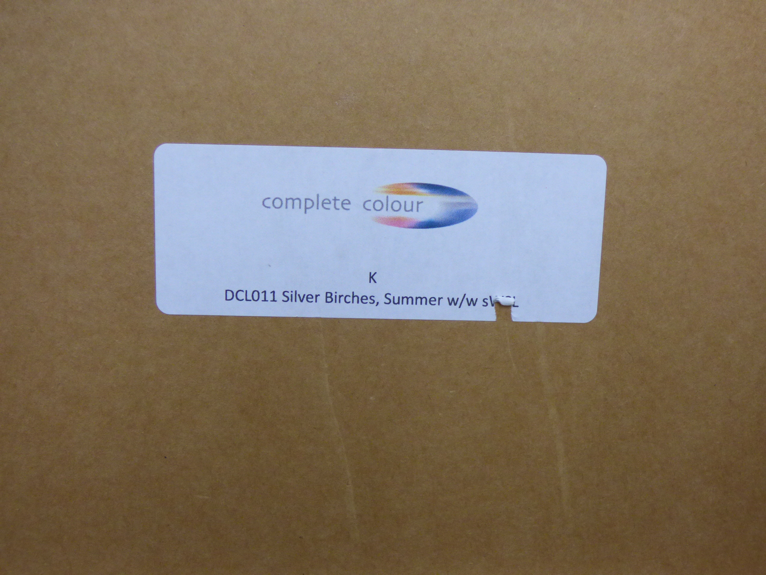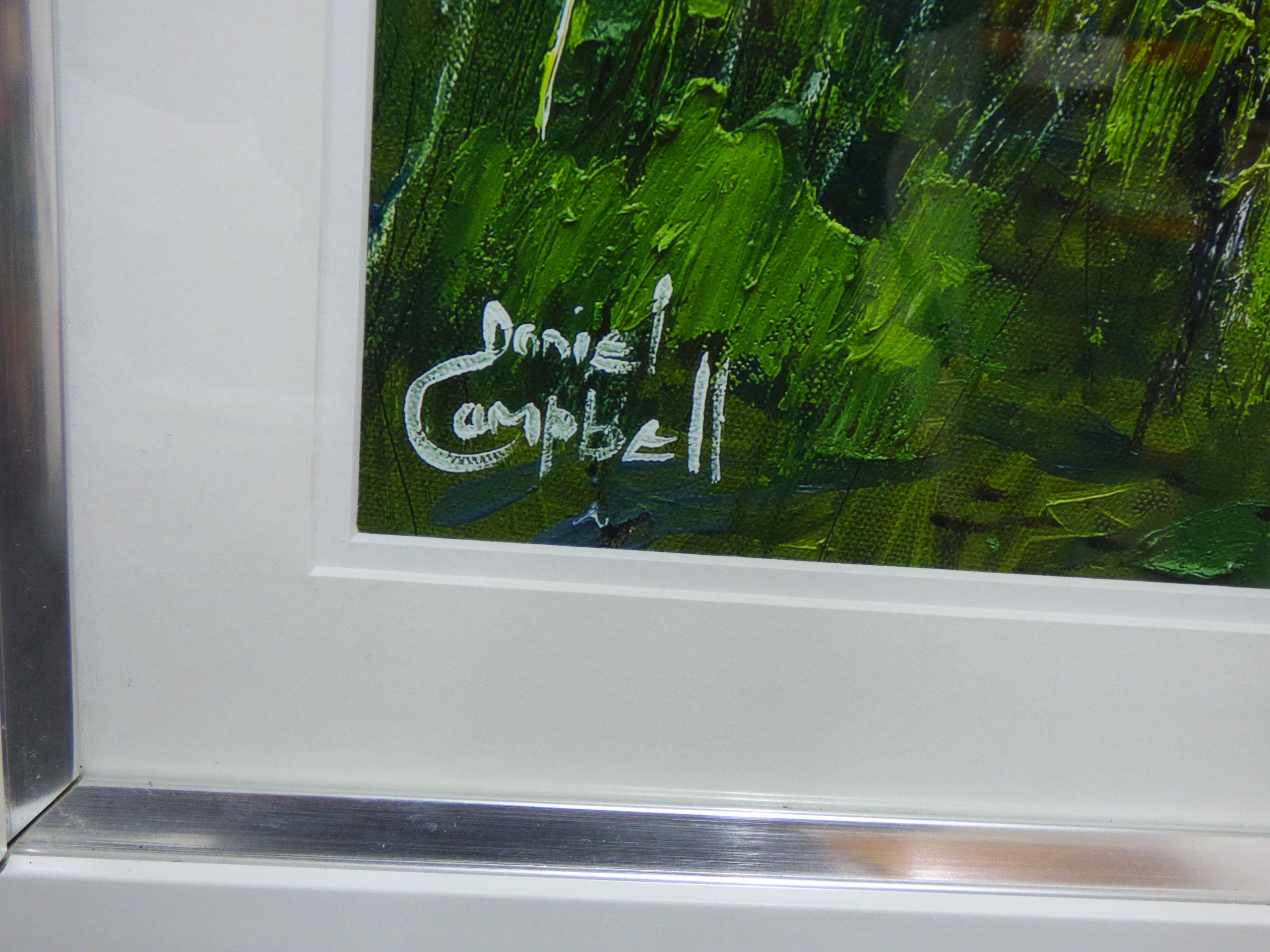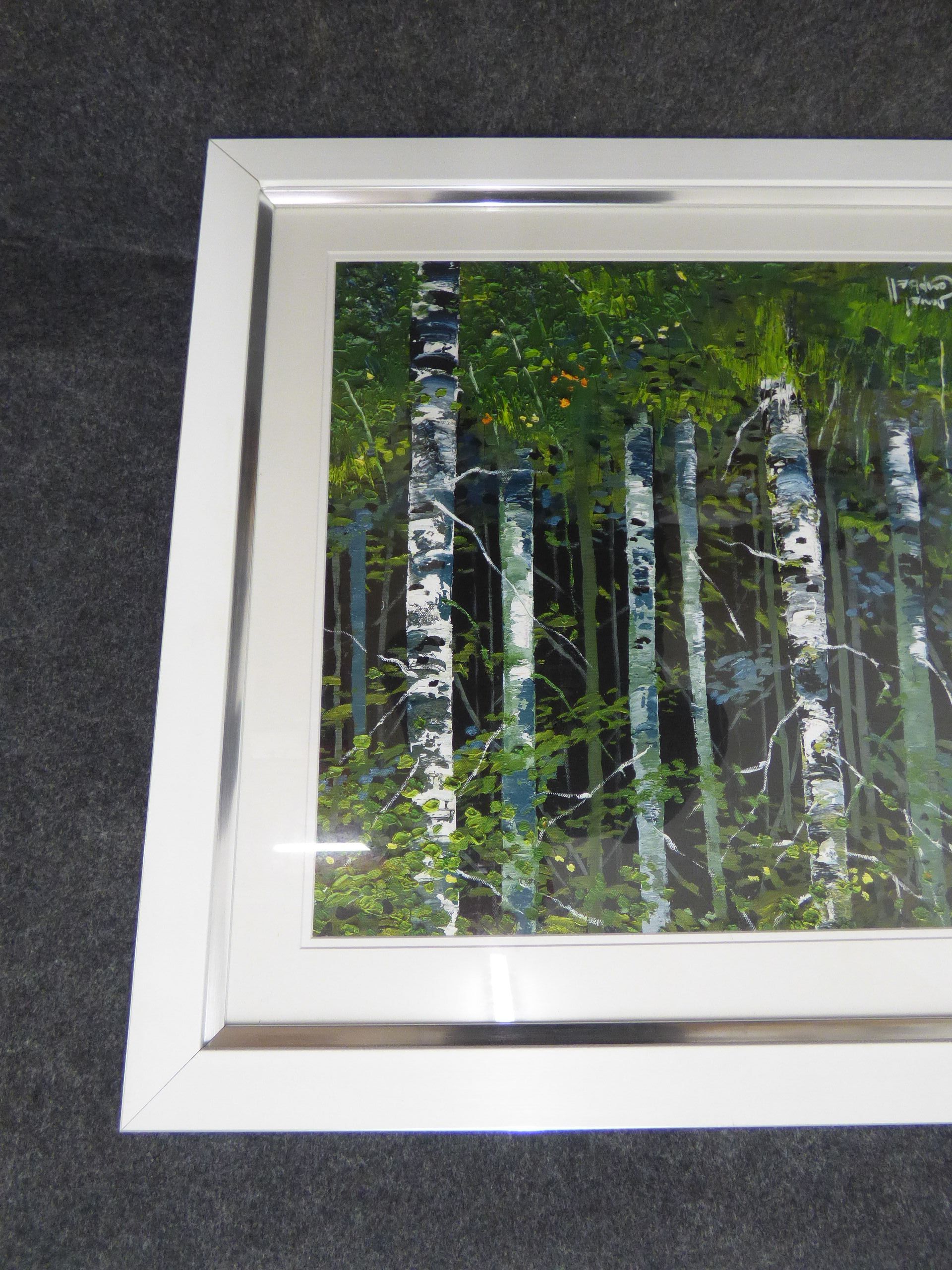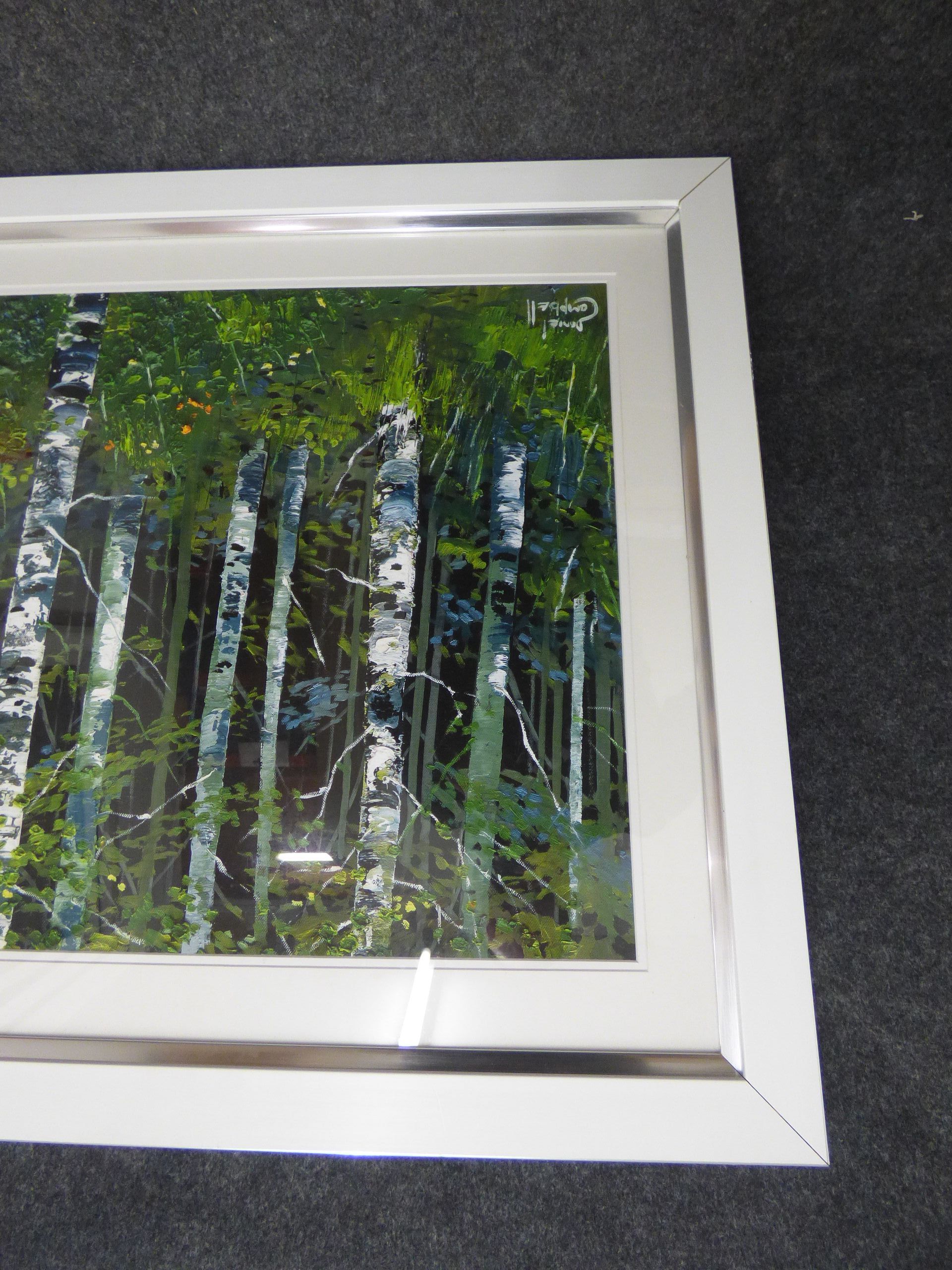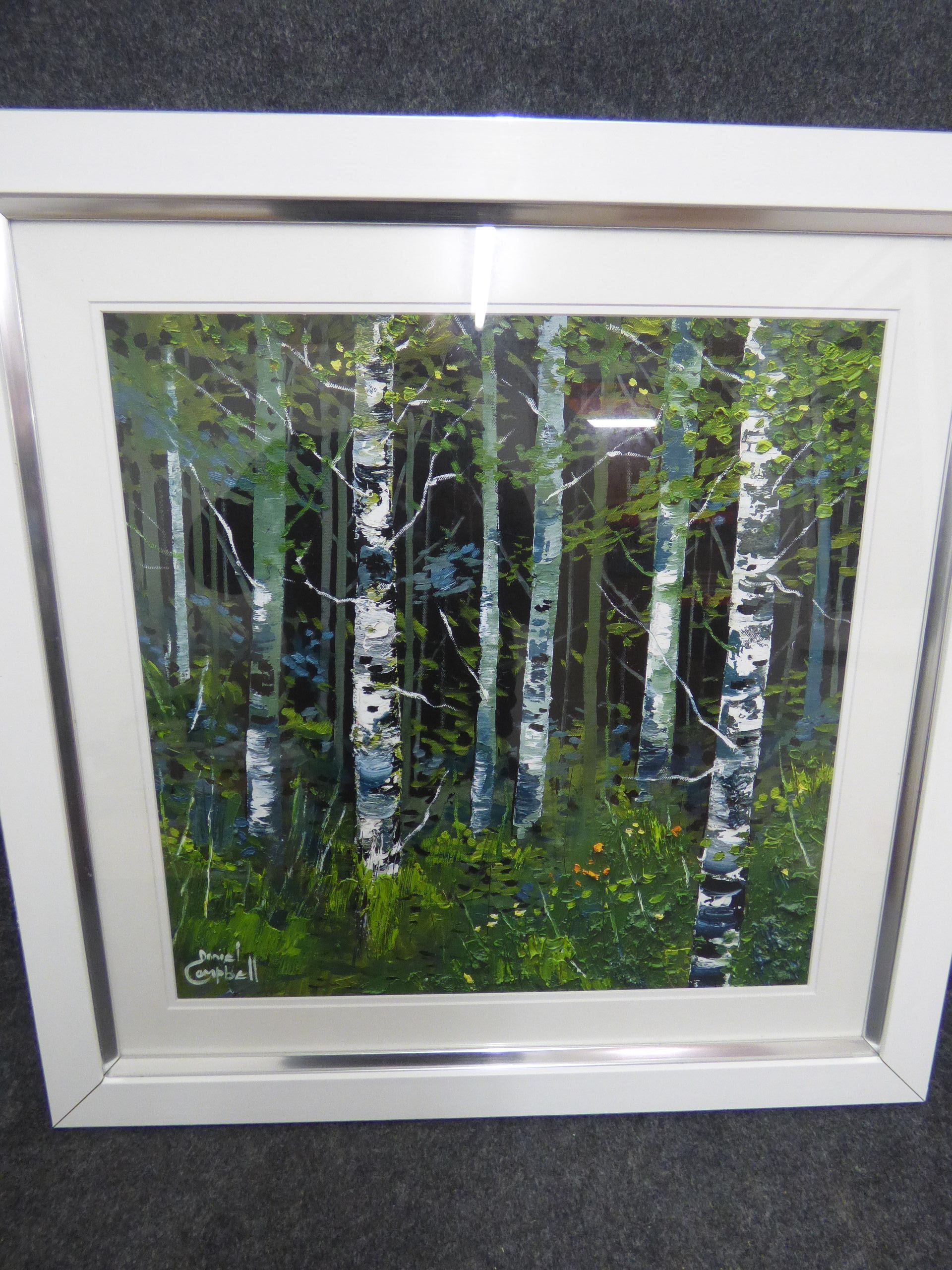 A framed piece of art depicting a grove of silver birch trees in shades of green and white, signed by Daniel Campbell and titled Silver Birches, Summer on the reverse label. 69x69cm