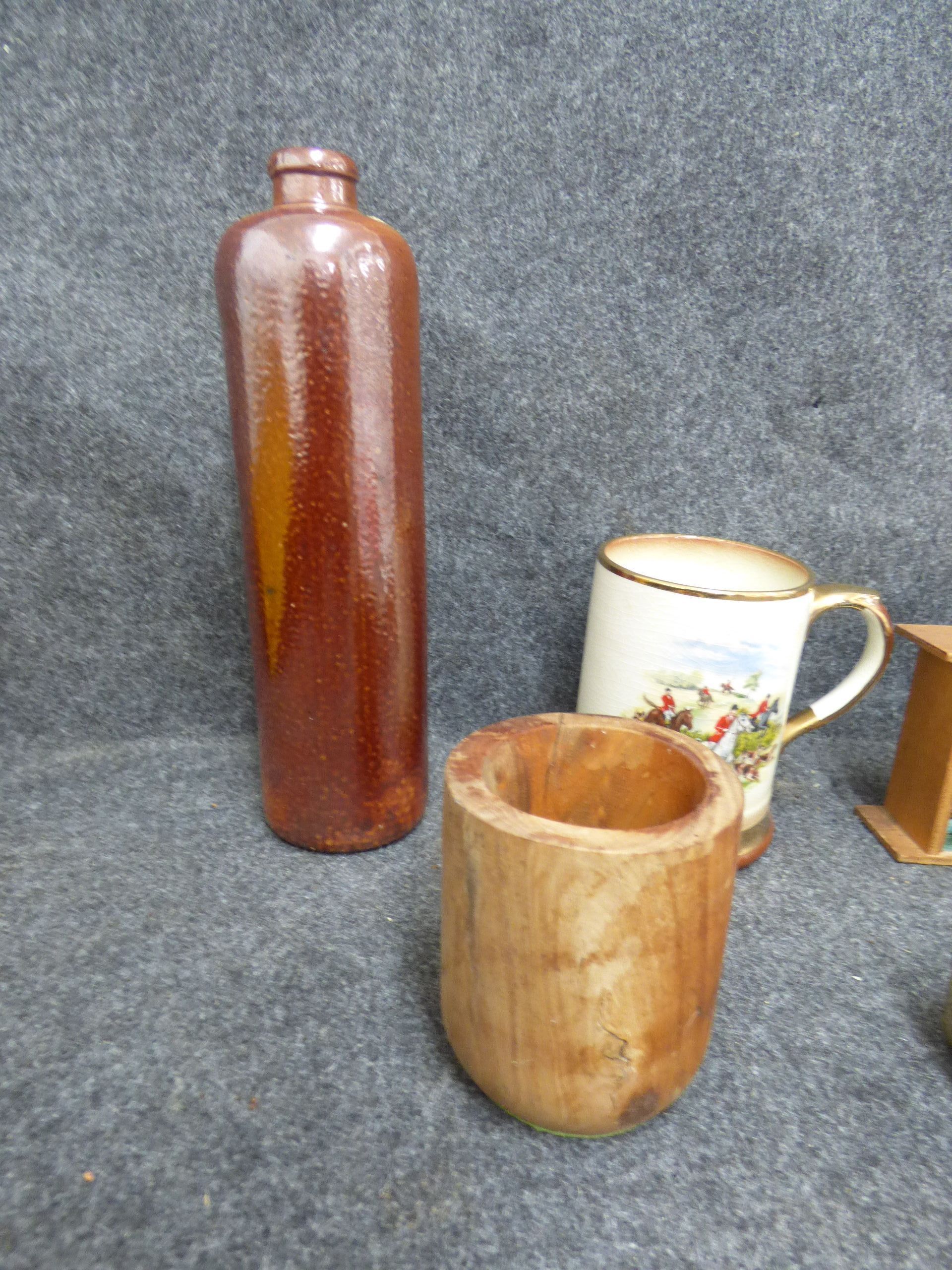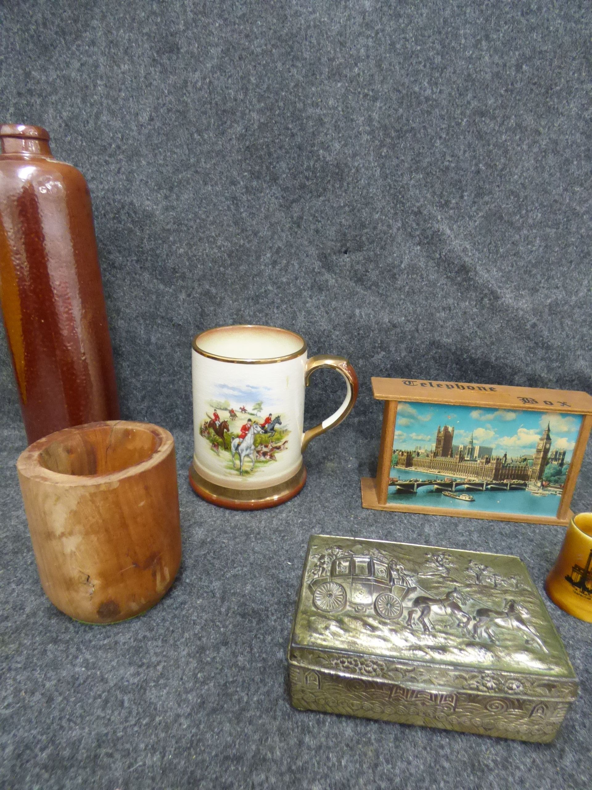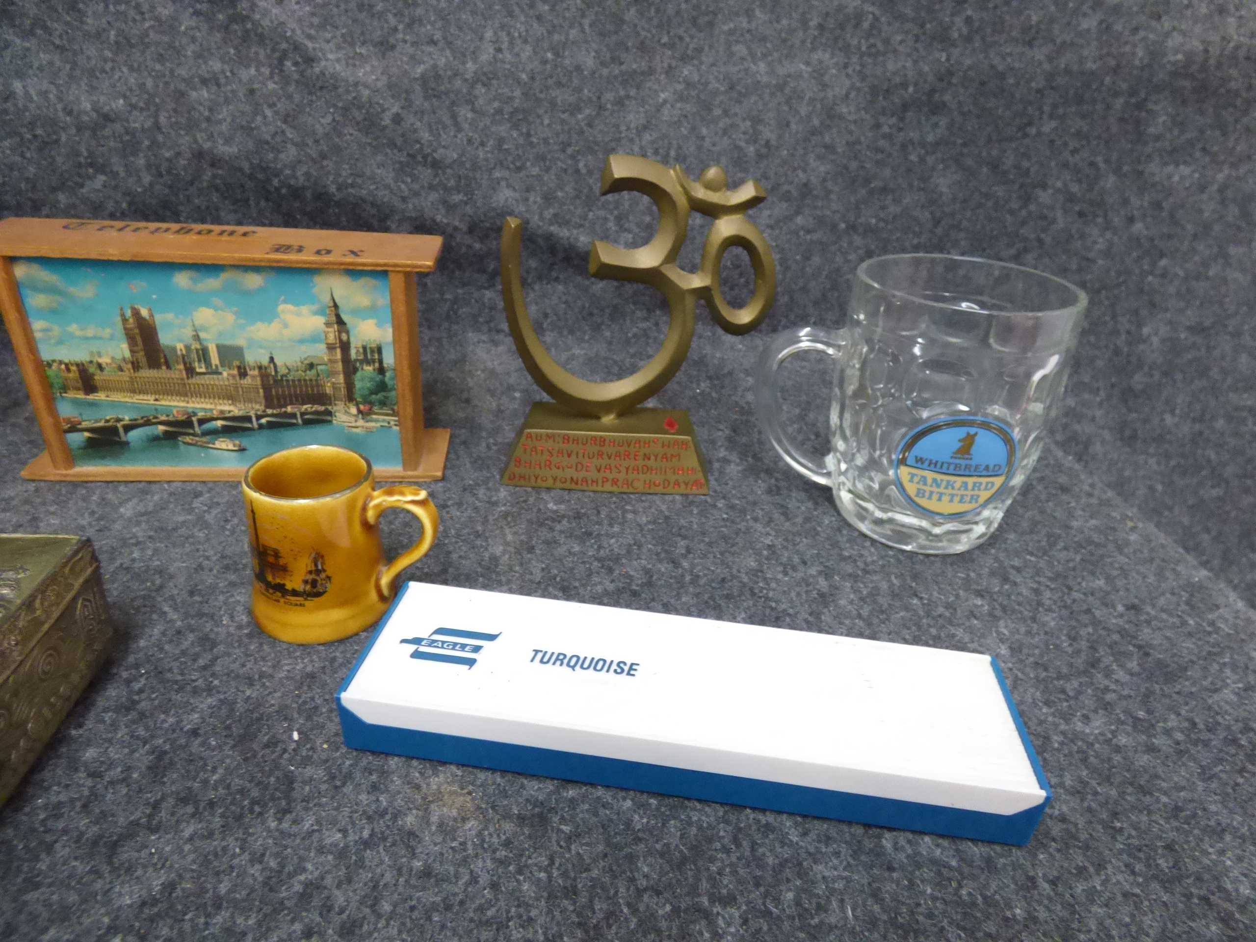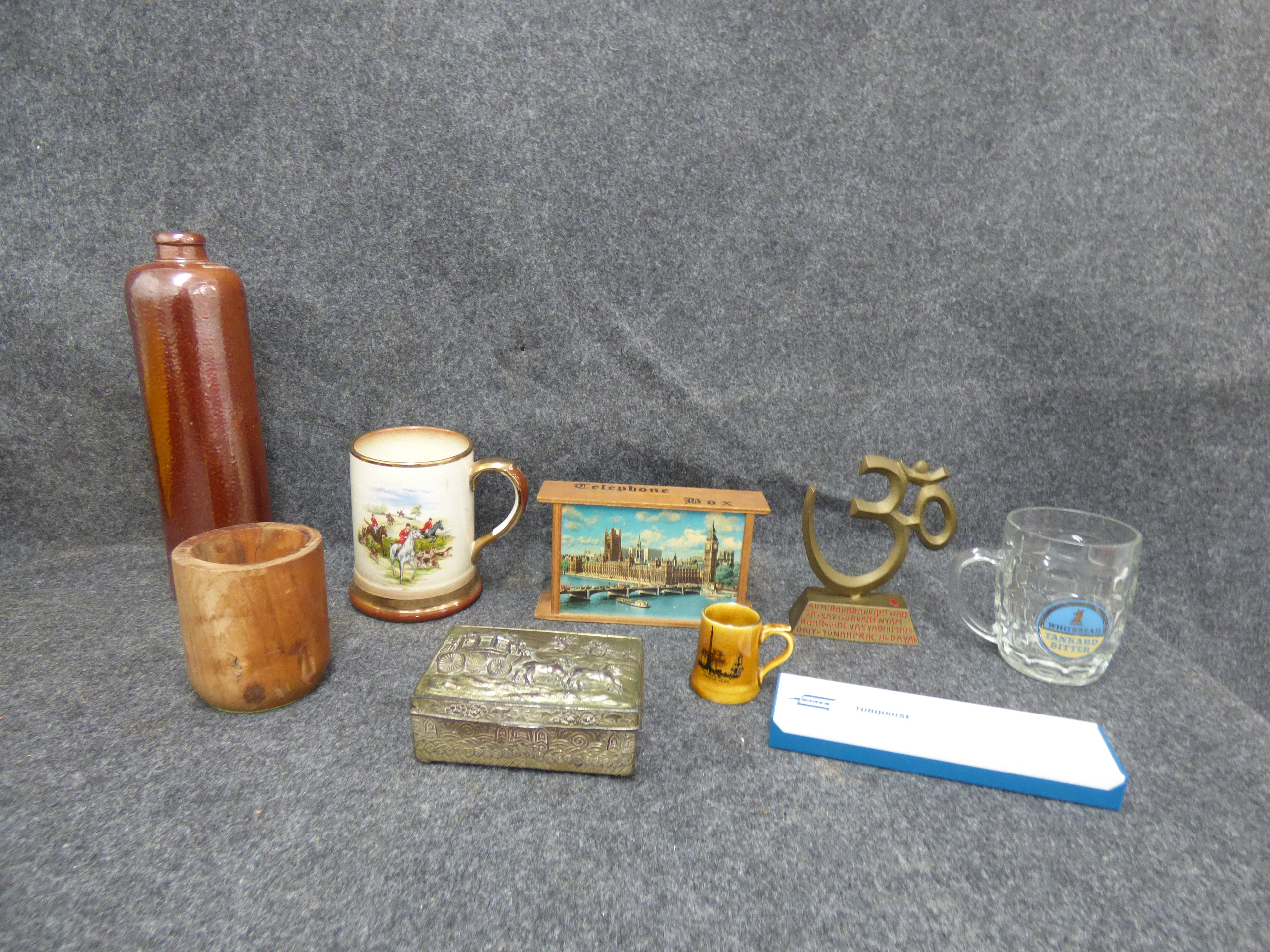 A collection of items including a brown ceramic bottle, a wooden vessel, a hunt-themed mug, an embossed metal carriage box, a London souvenir telephone box, a miniature yellow mug, a brass Om symbol statue, a Whitbread Tankard Bitter glass mug, and an Eagle Turquoise box.