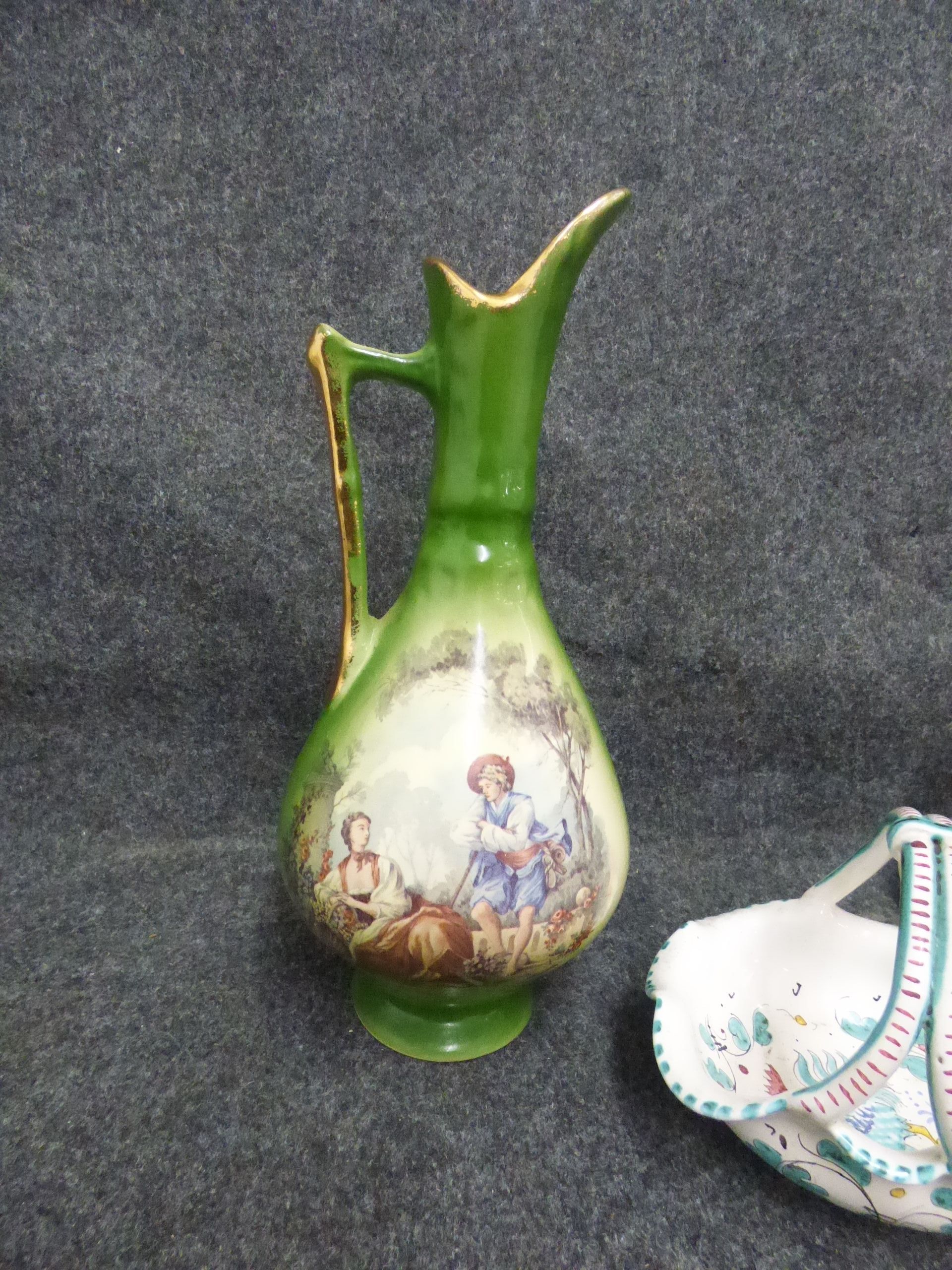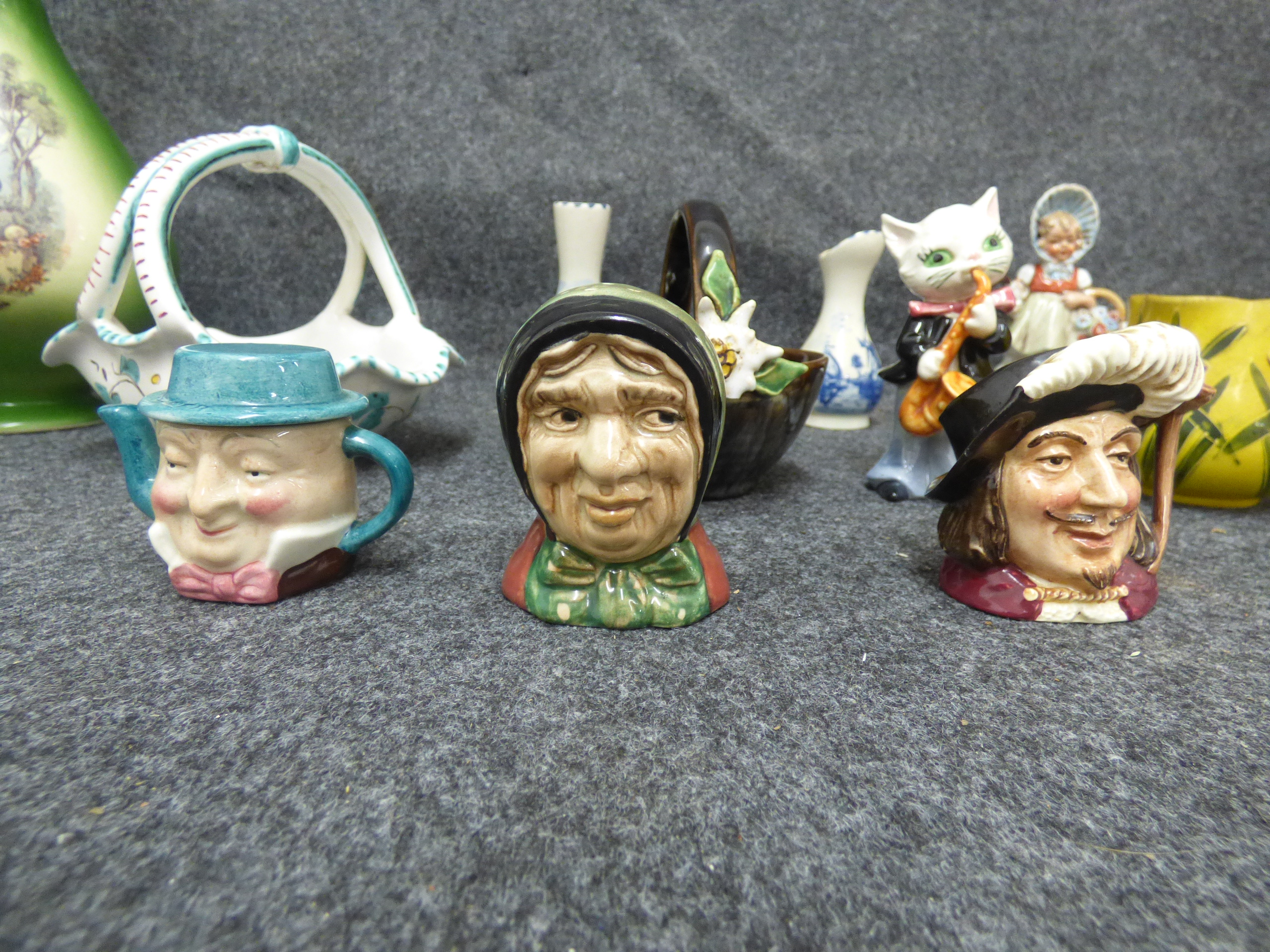 A collection of miscellaneous ceramic and porcelain items including a tall green ewer with a pastoral scene, three character jugs, figurines, and several small decorative vases in various colours.