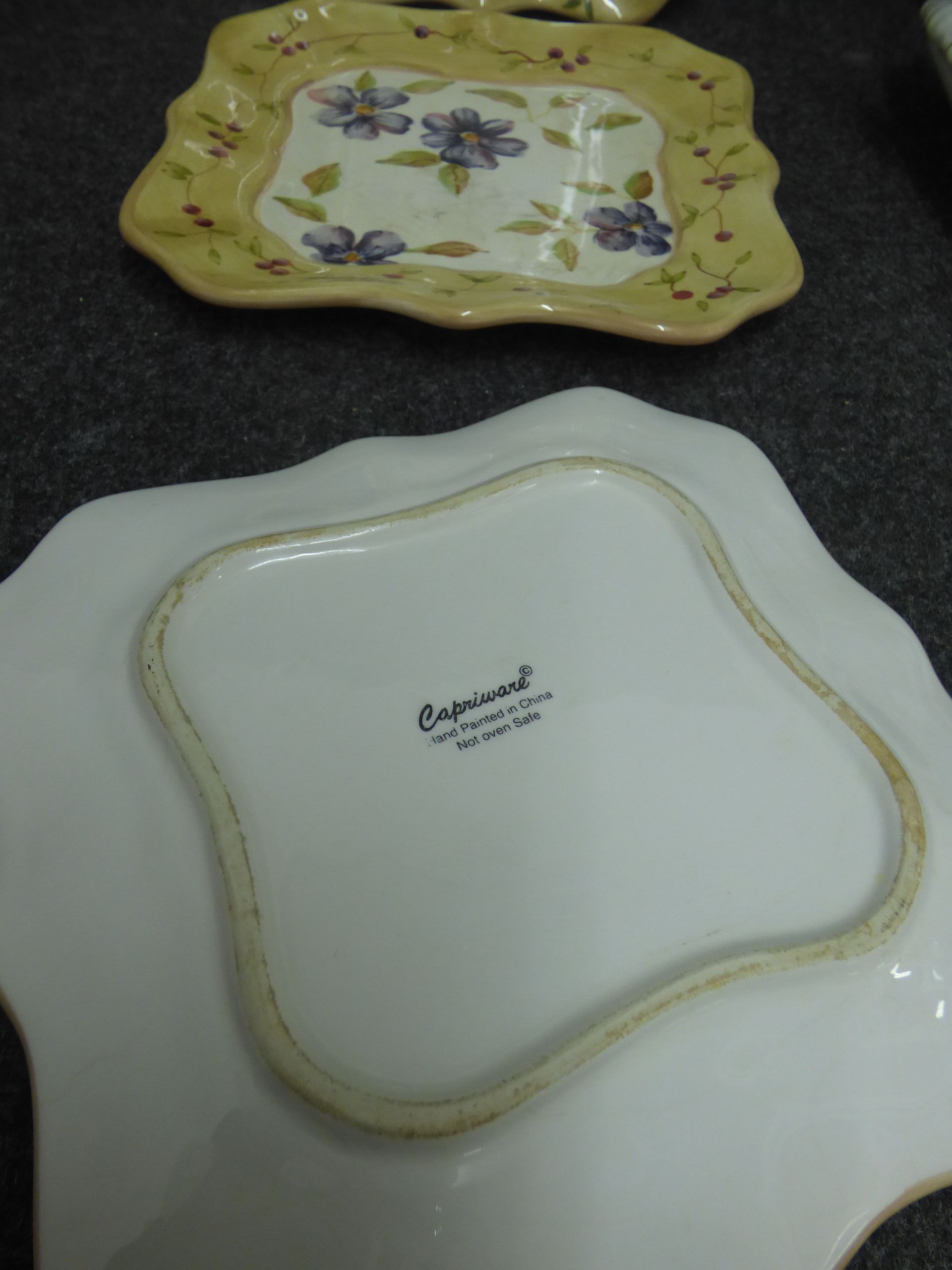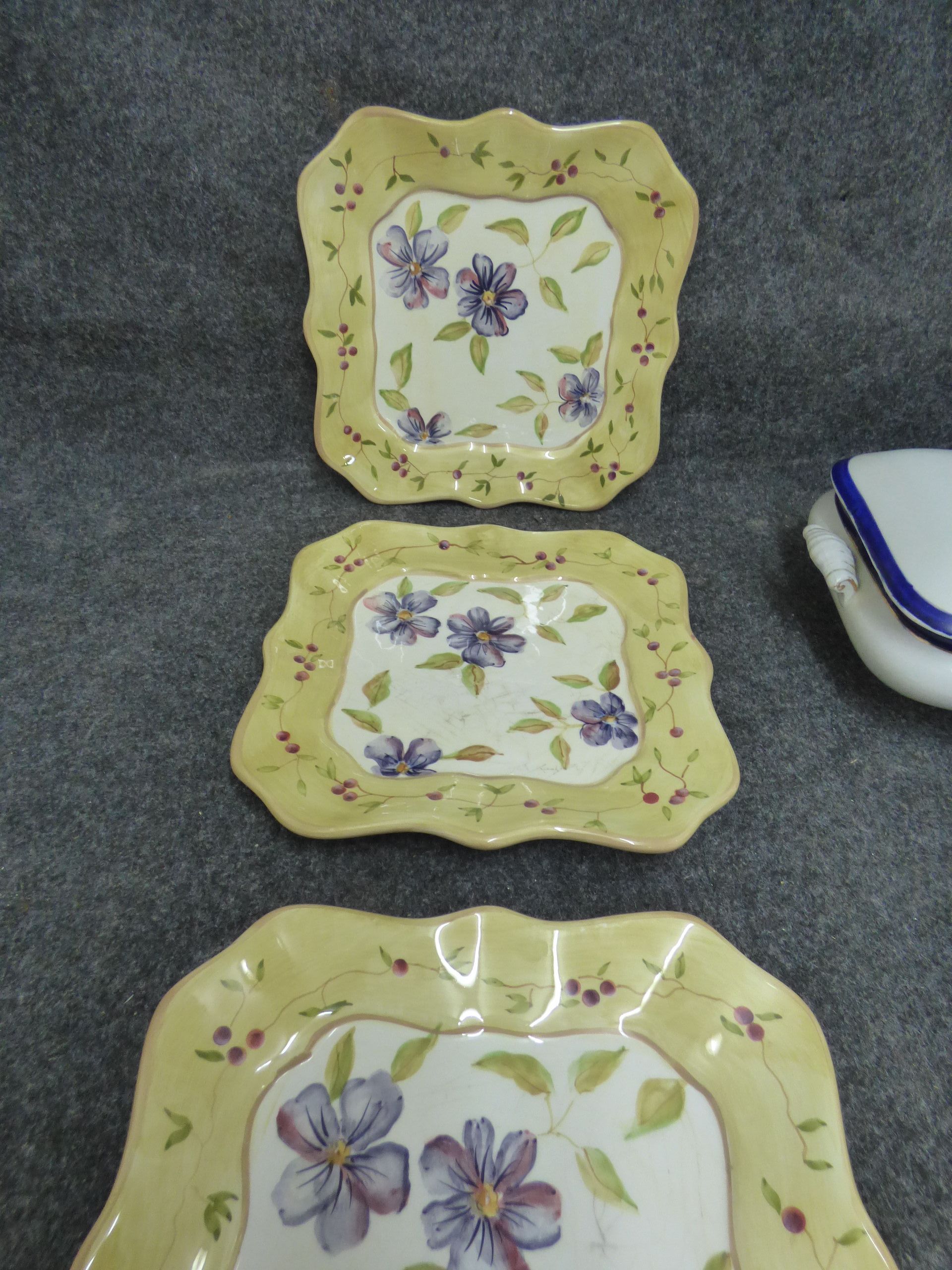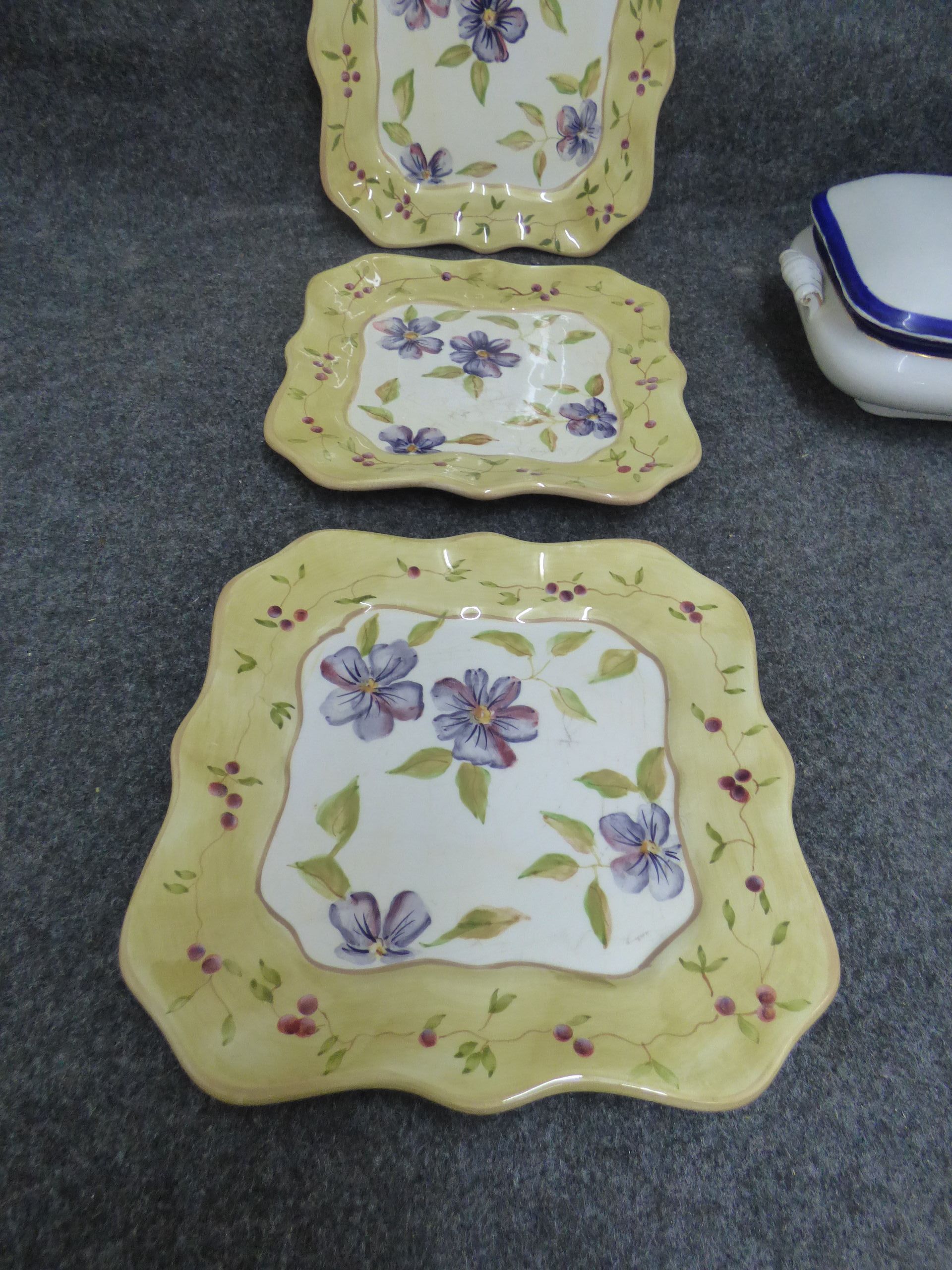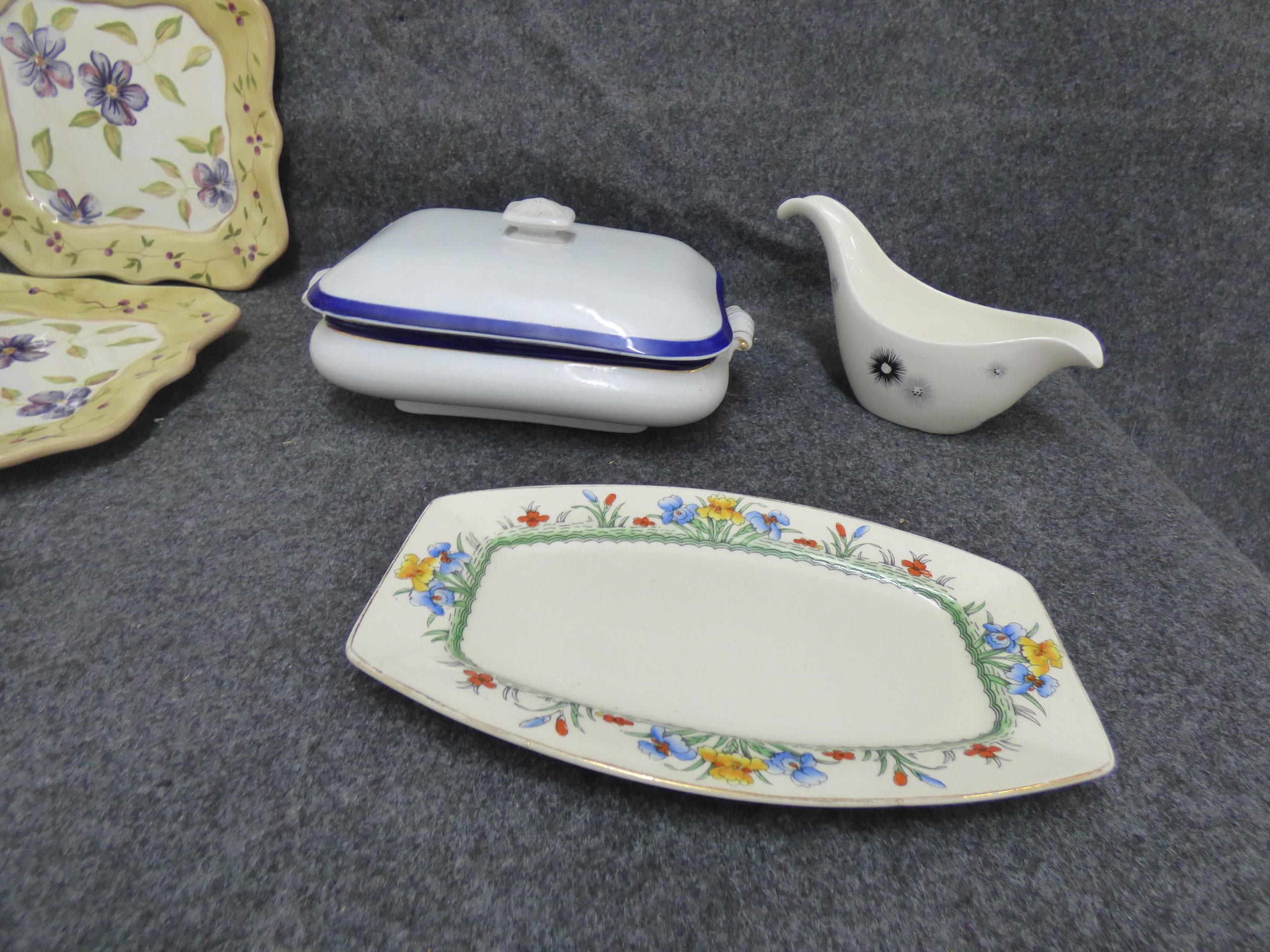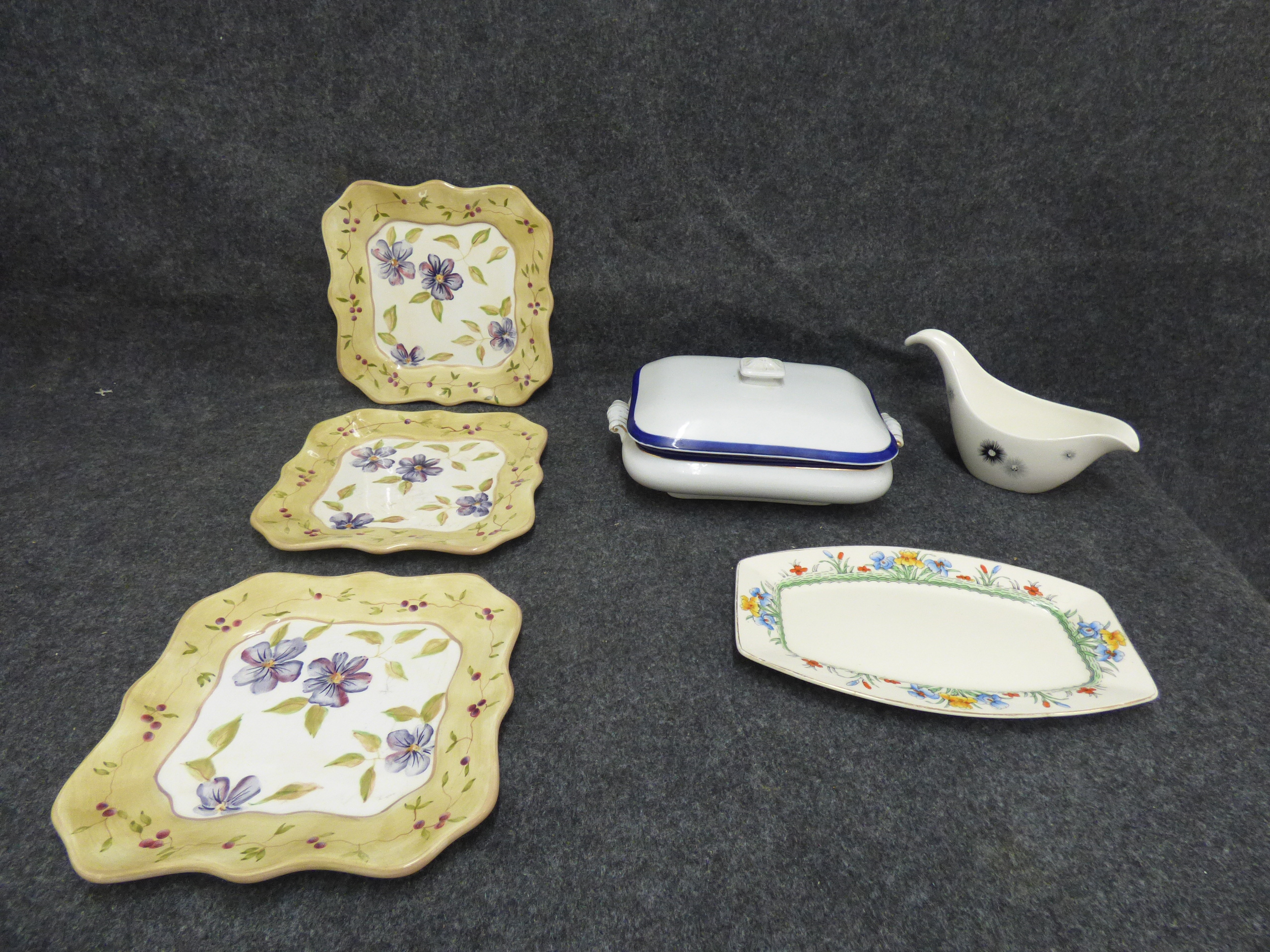 A collection of ceramic tableware including hand painted Capriware floral plates, a Fielding’s Devon Ware platter, a Midwinter Stylecraft gravy boat, and a lidded tureen.