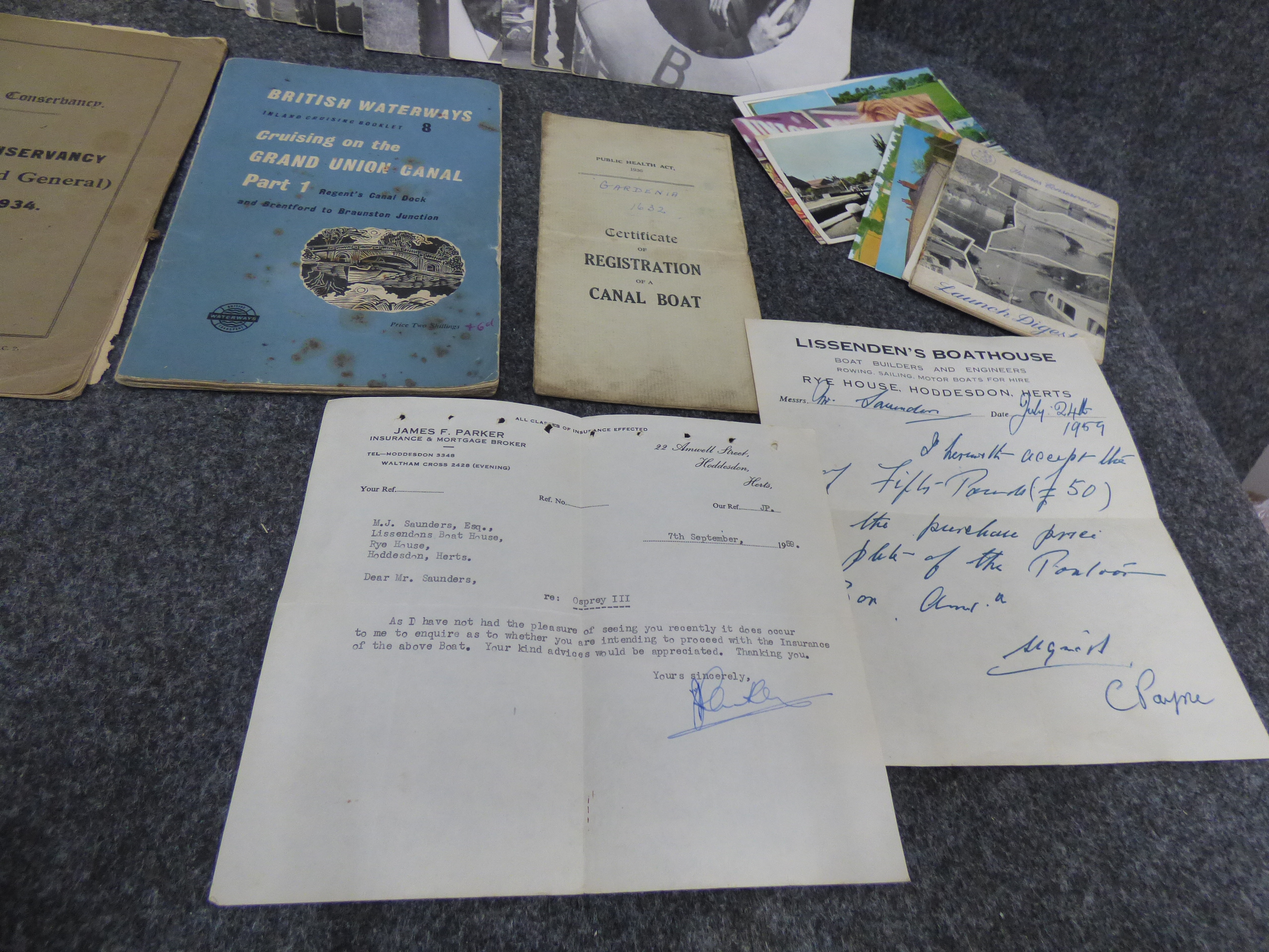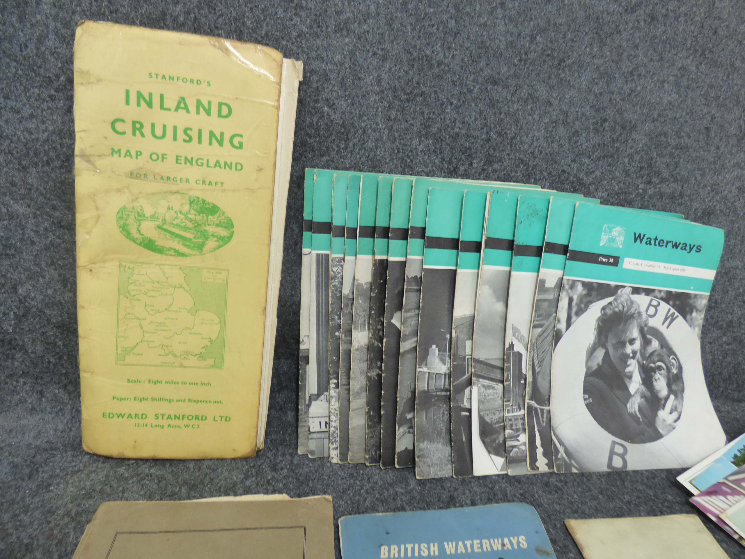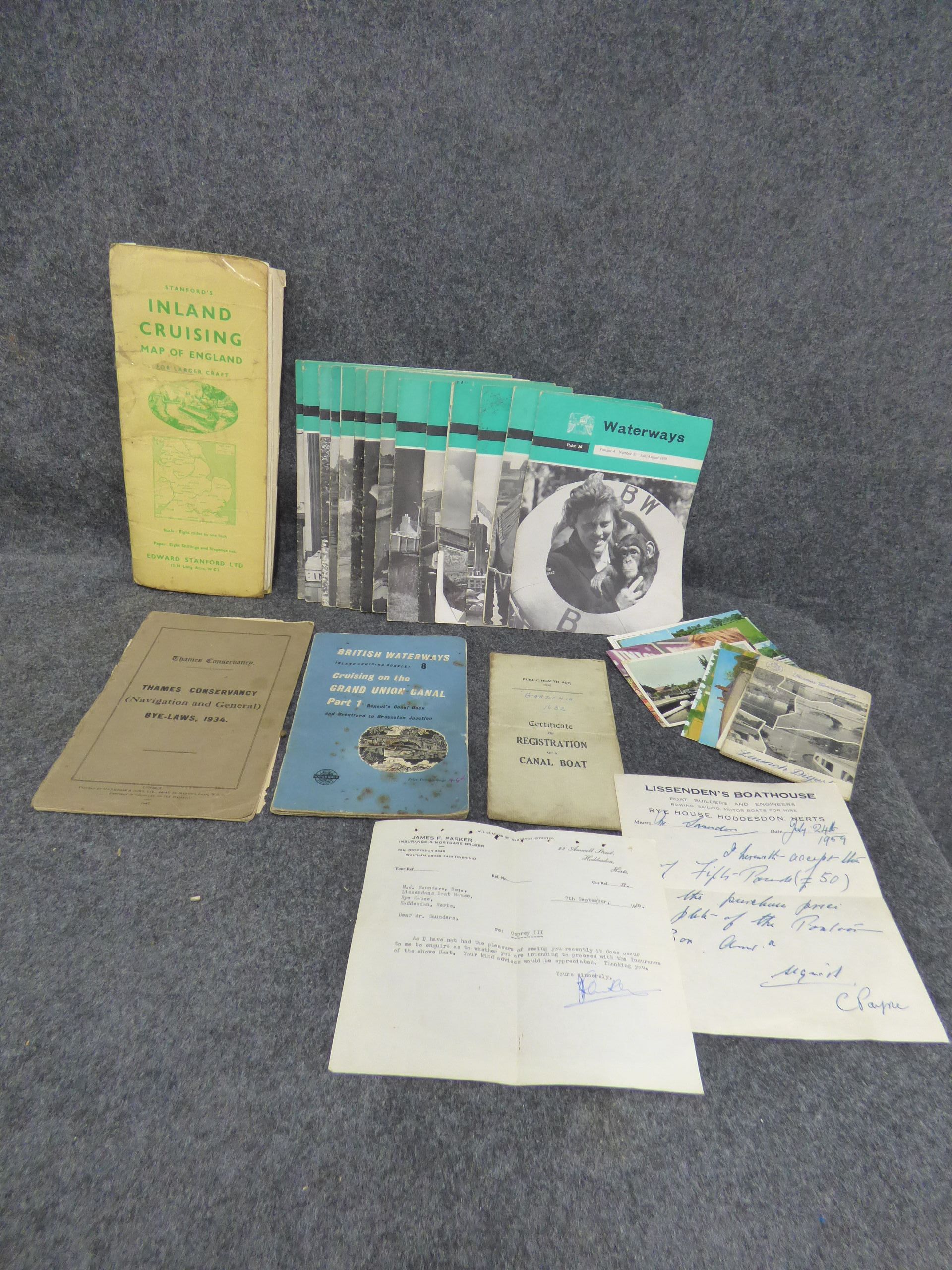 A collection of vintage paper ephemera including a Stanfords Inland Cruising Map of England, Thames Conservancy Bye-Laws 1934, British Waterways cruising guides, Waterways magazines, a canal boat registration certificate for Gardenia, and various 1950s correspondence and postcards.