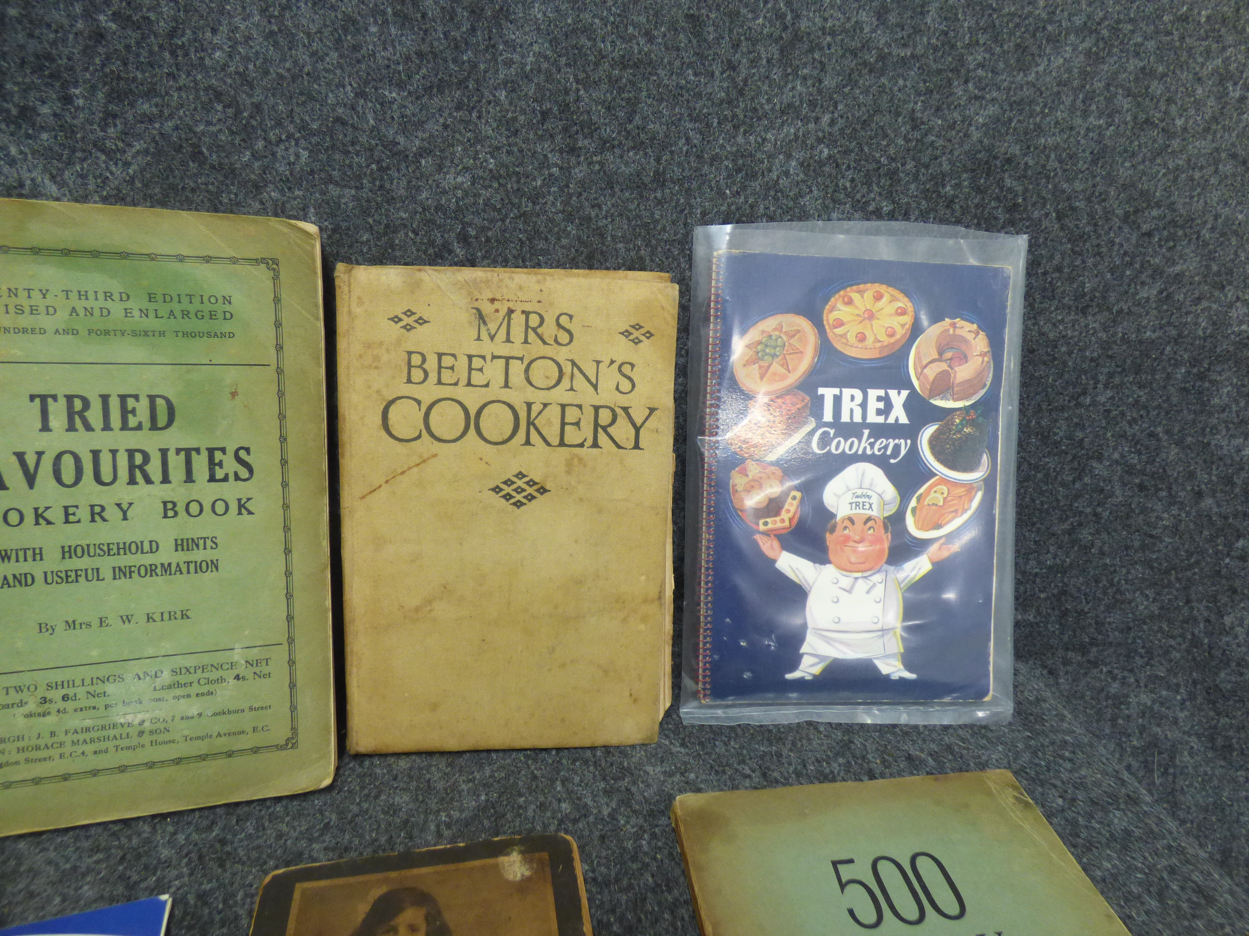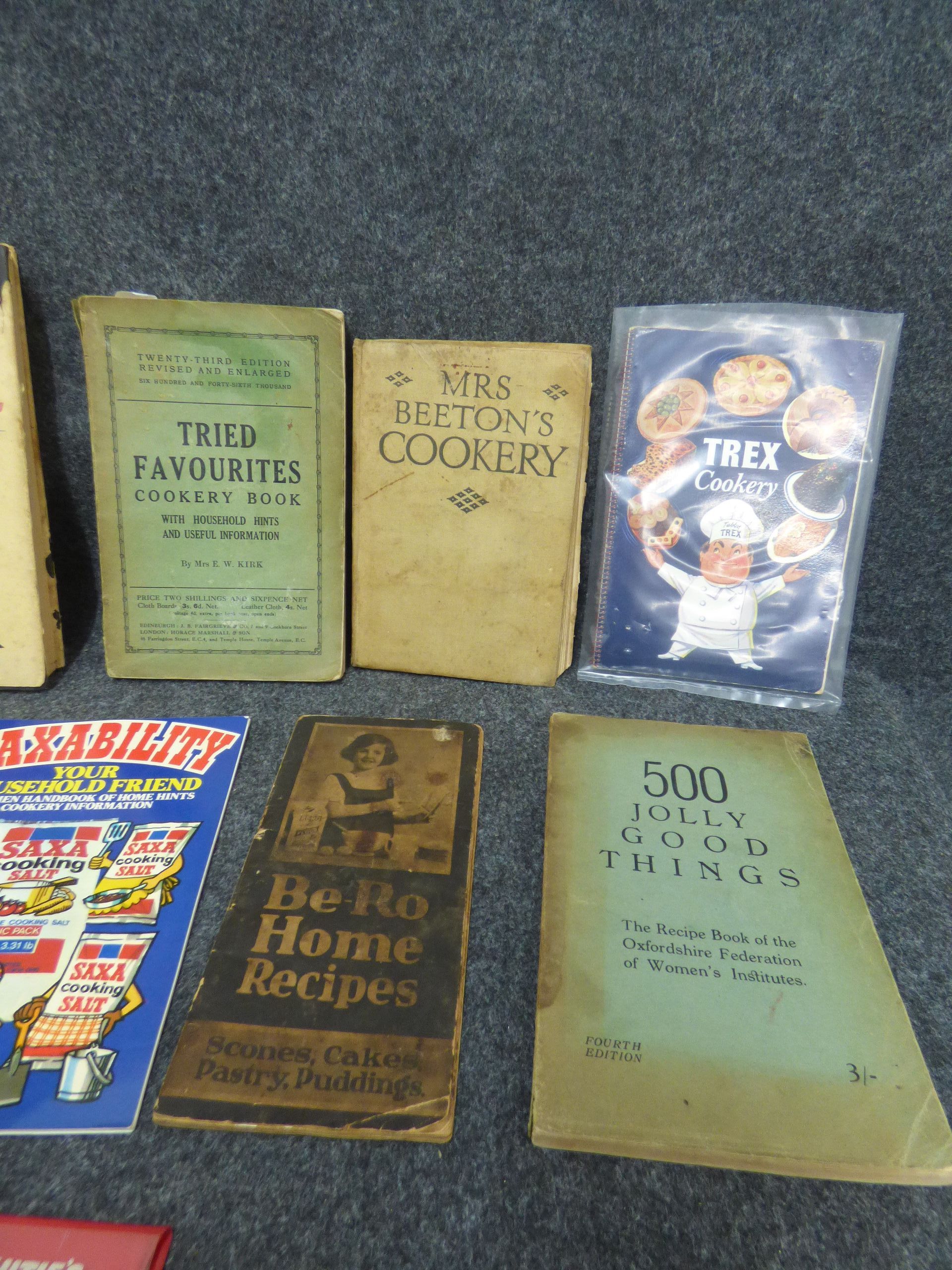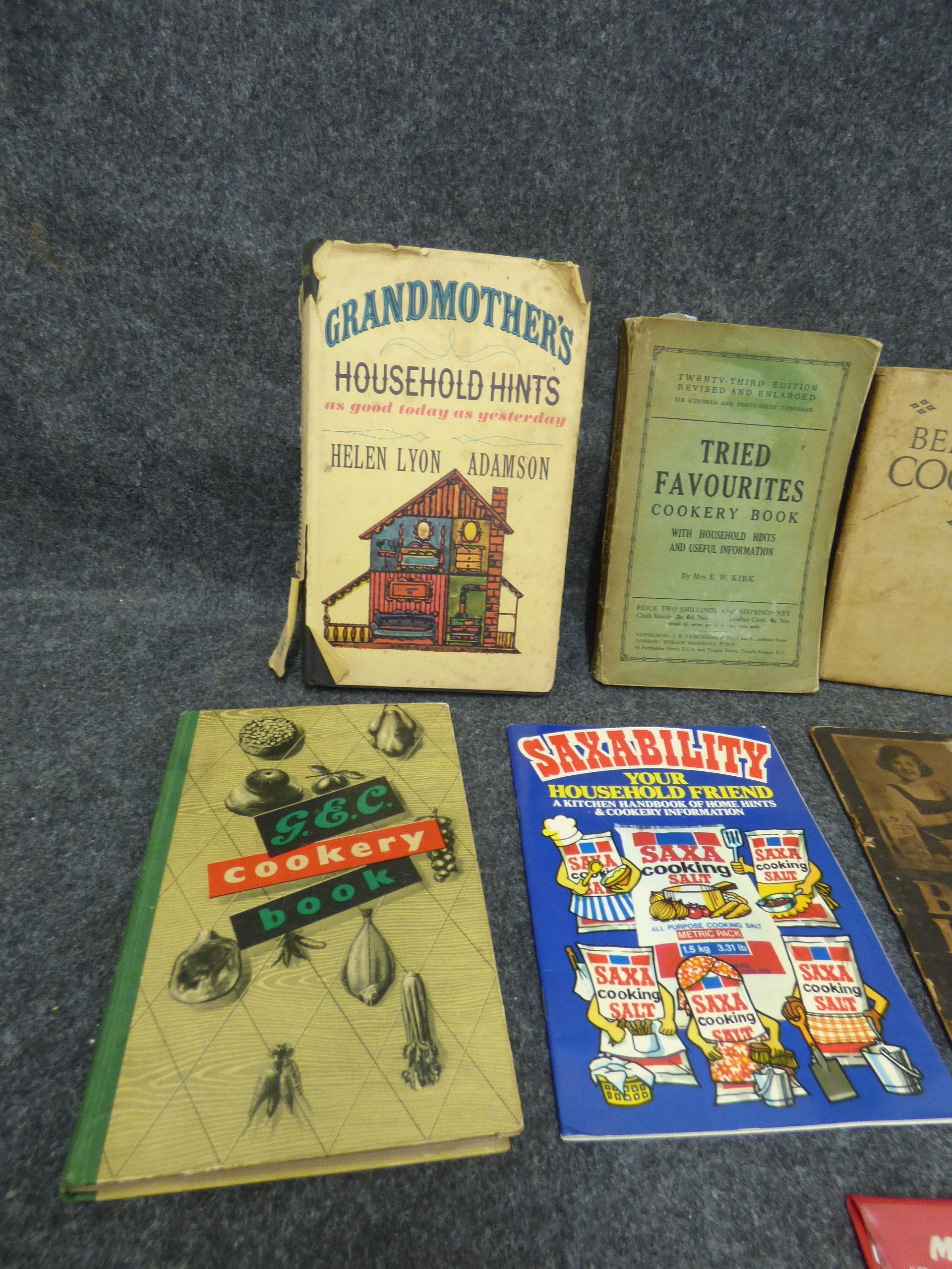 A collection of vintage cookbooks and recipe booklets featuring titles such as Mrs. Beeton’s Cookery, Grandmother’s Household Hints, and McVitie’s Recipe Cards.