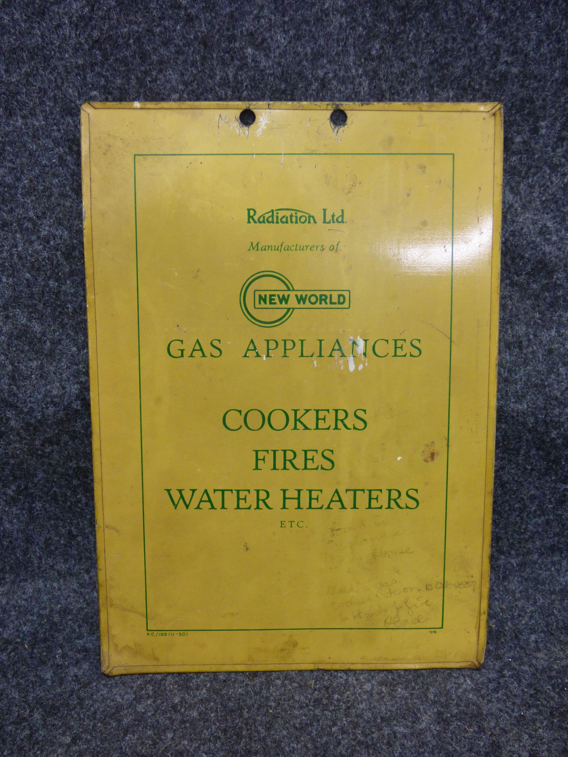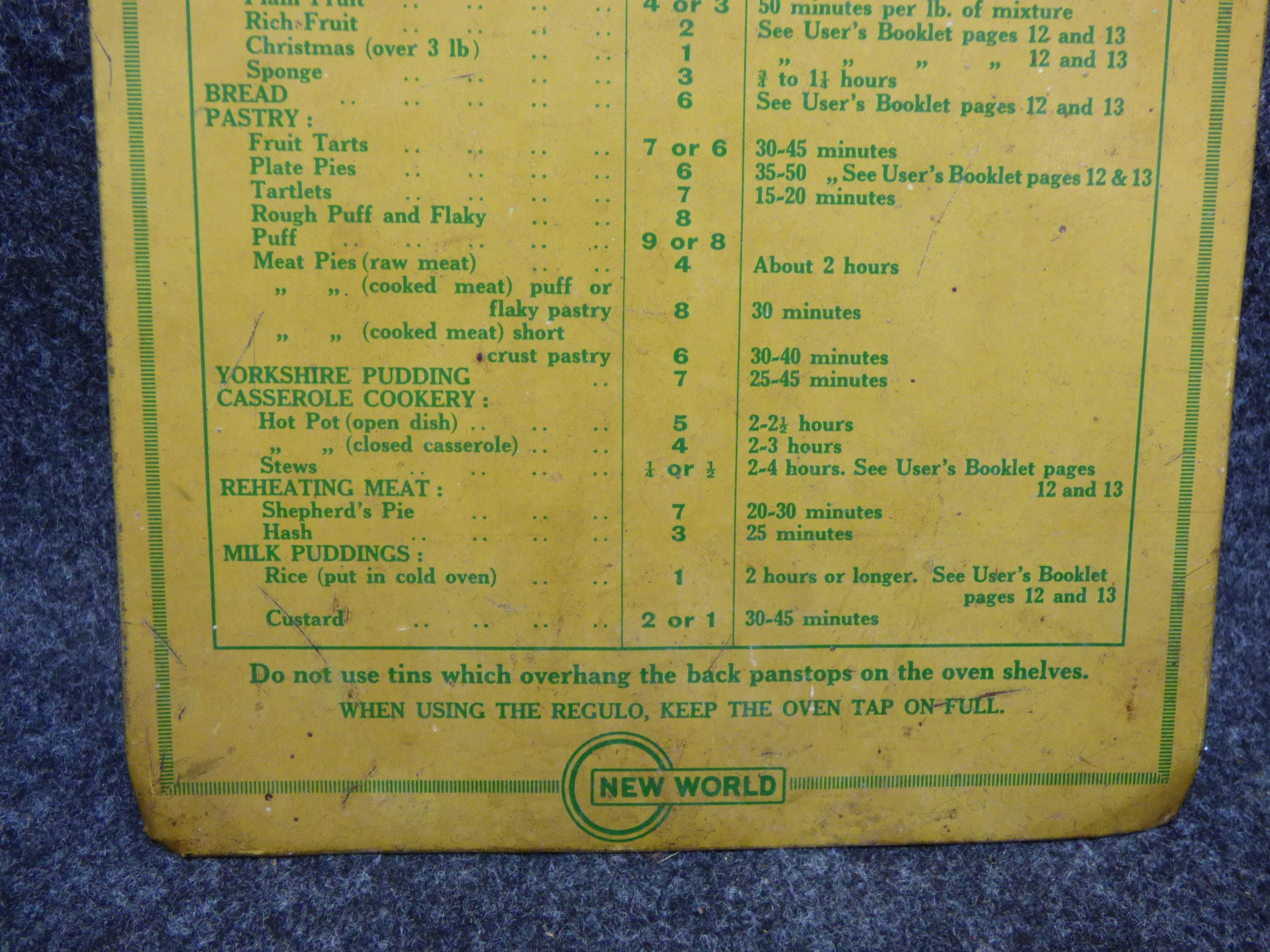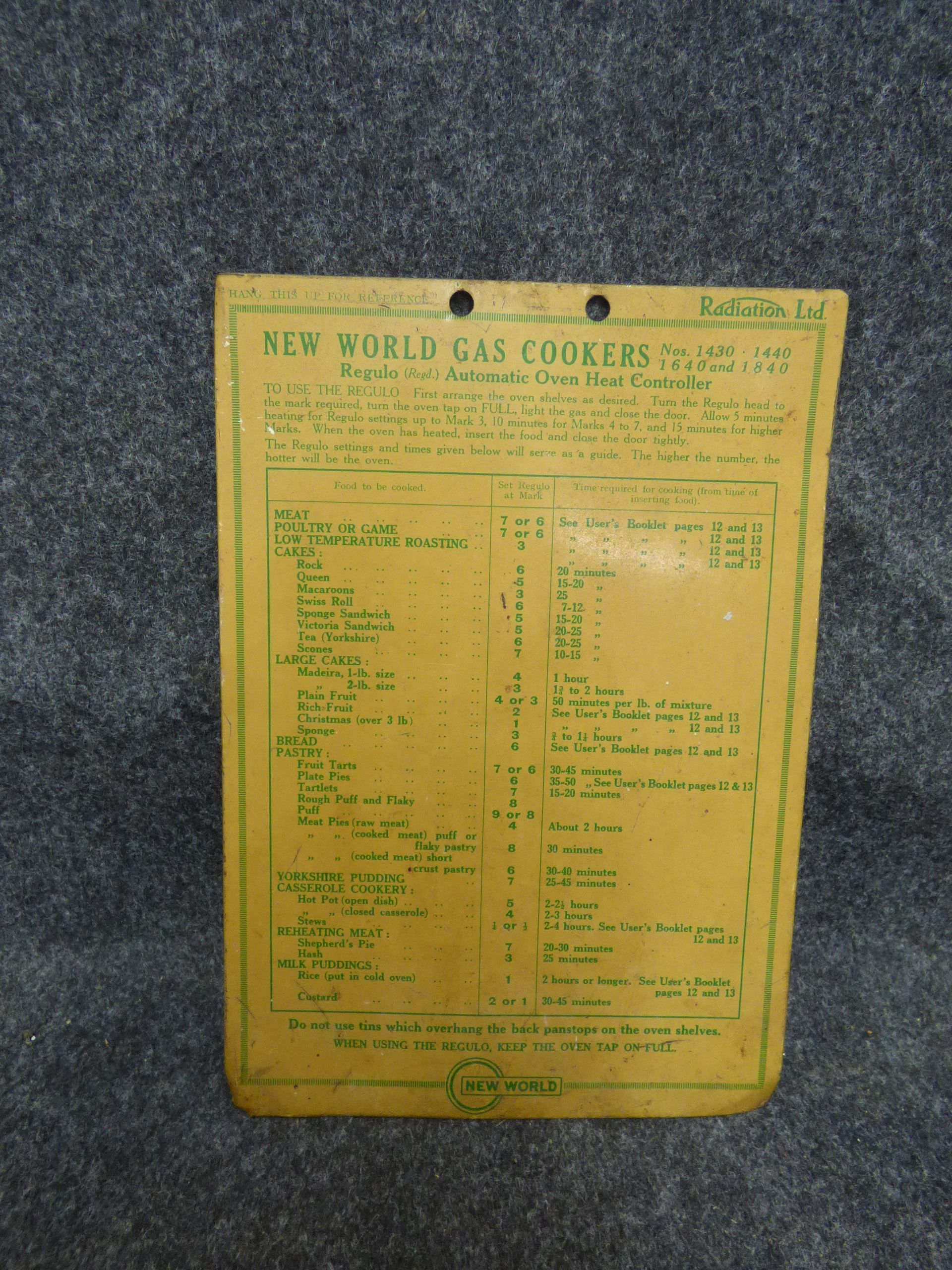 A double-sided yellow and green metal instruction plate for New World Gas Cookers models 1430, 1440, 1640, and 1840, featuring a Regulo automatic oven heat controller cooking chart and appliance advertising.