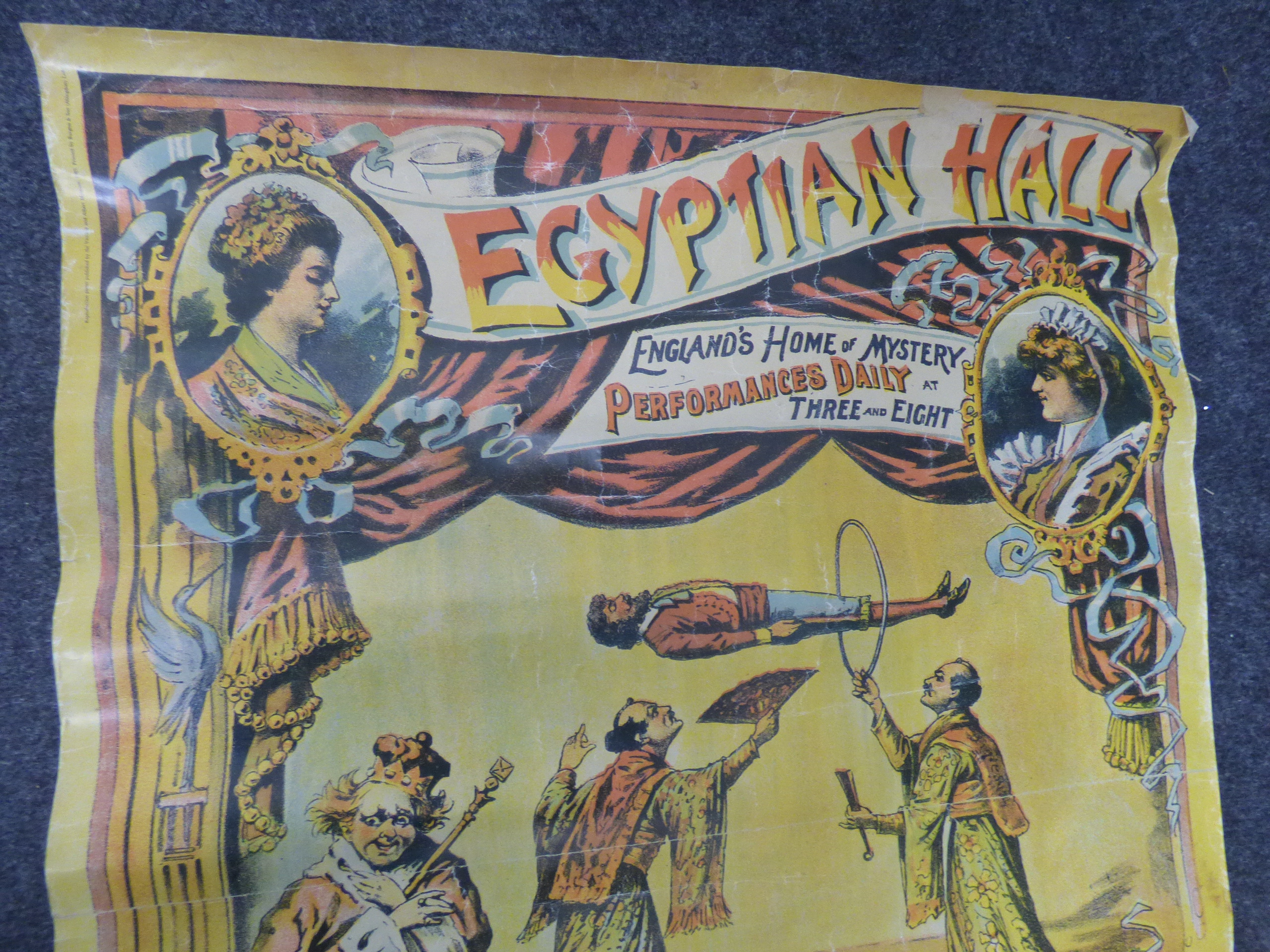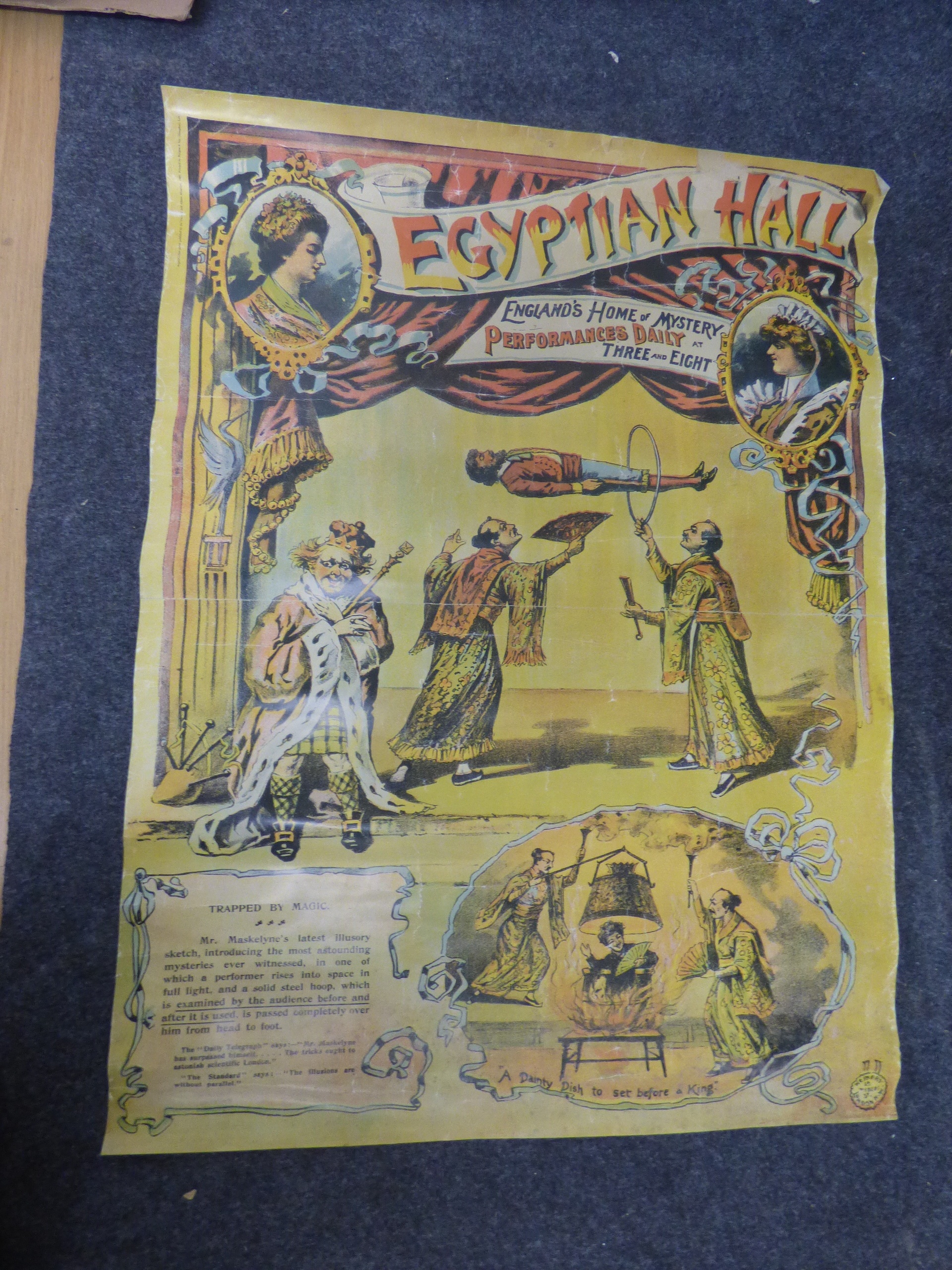 A vintage colour poster for the Egyptian Hall advertising Mr. Maskelyne’s magic illusions including Trapped by Magic, featuring various figures and levitation scenes in yellow and red hues. 75x56cm